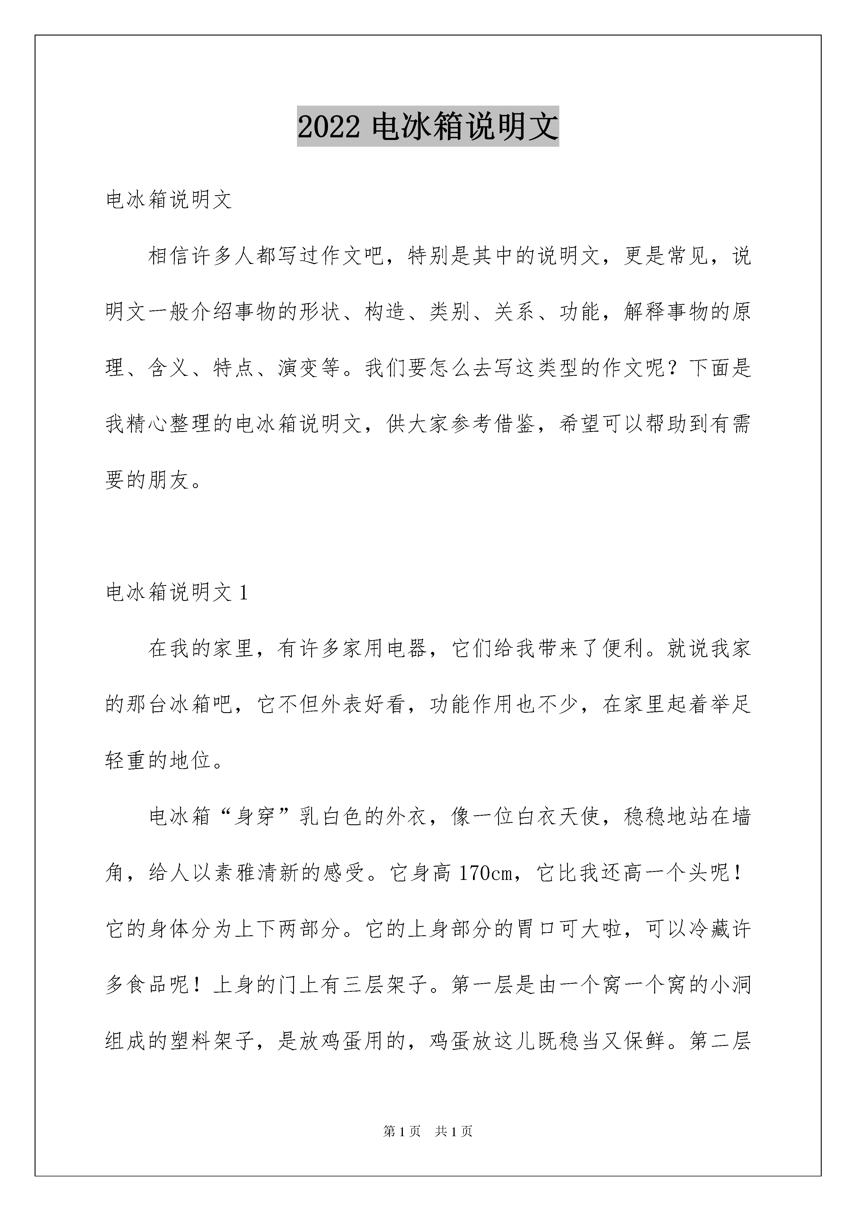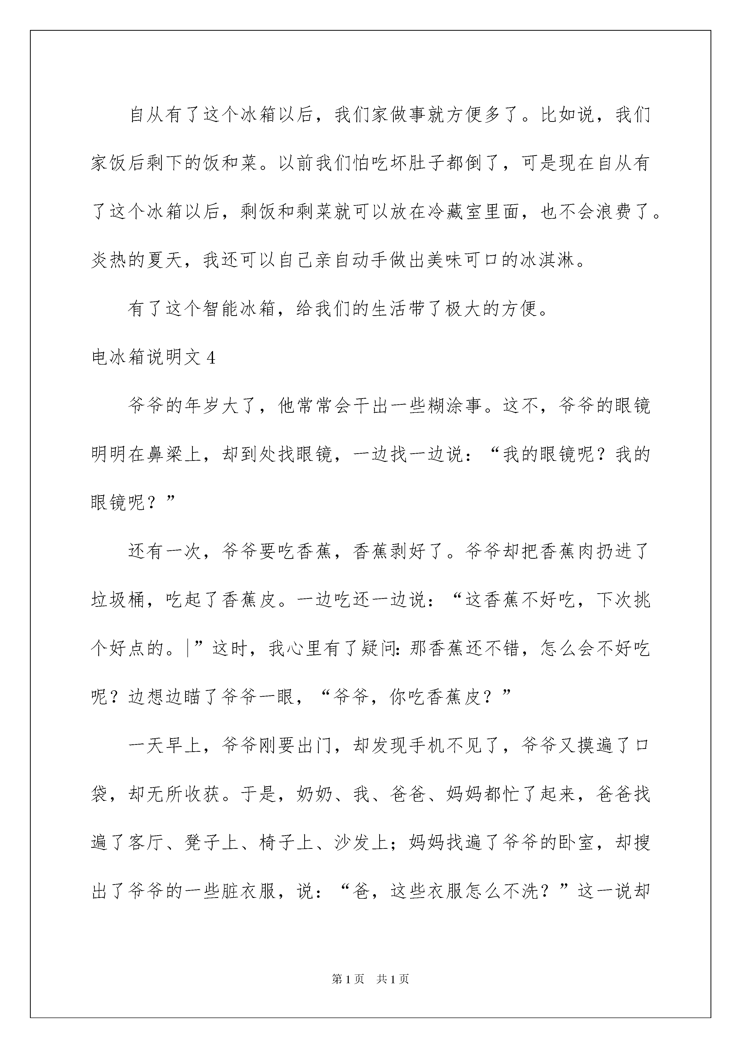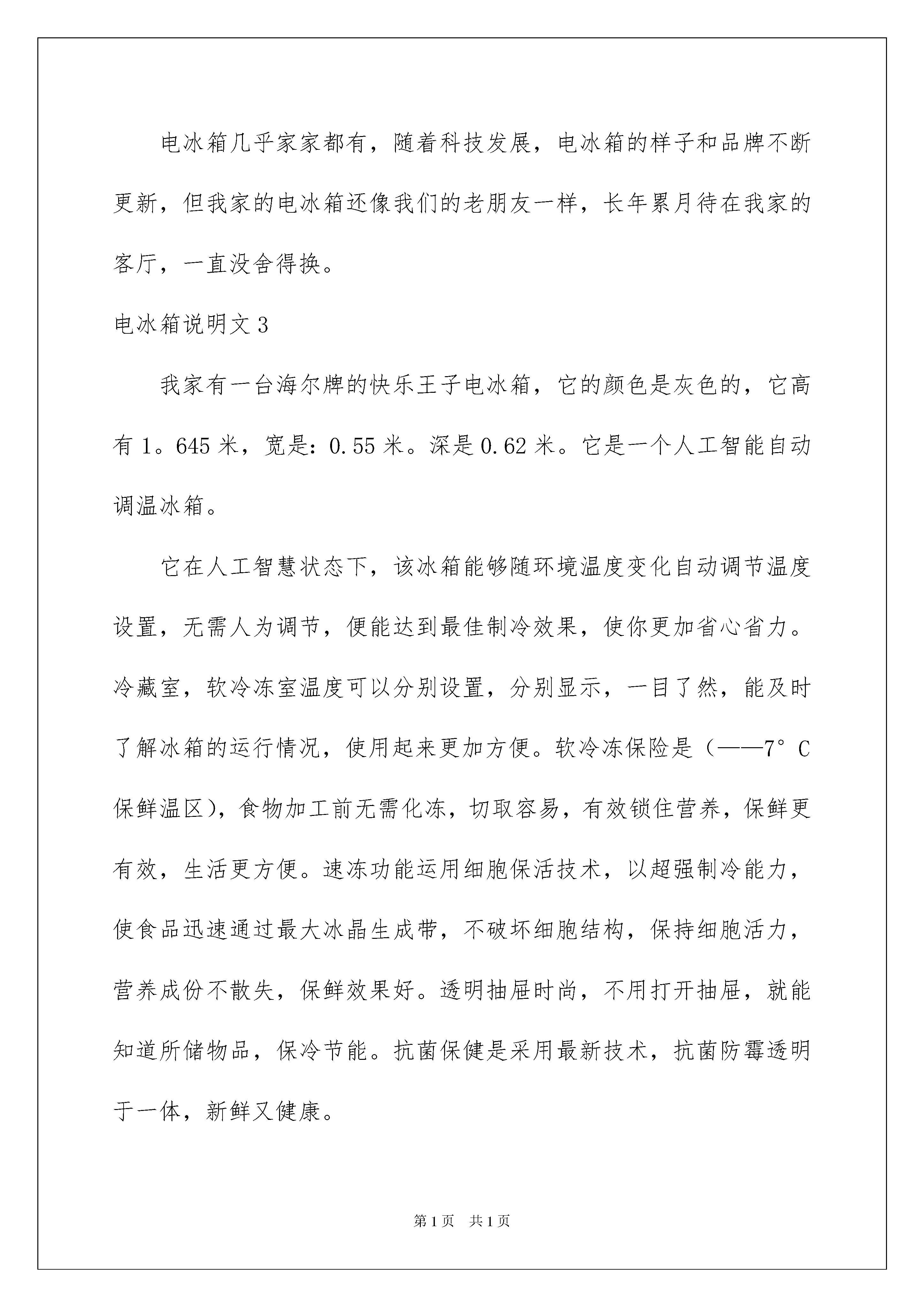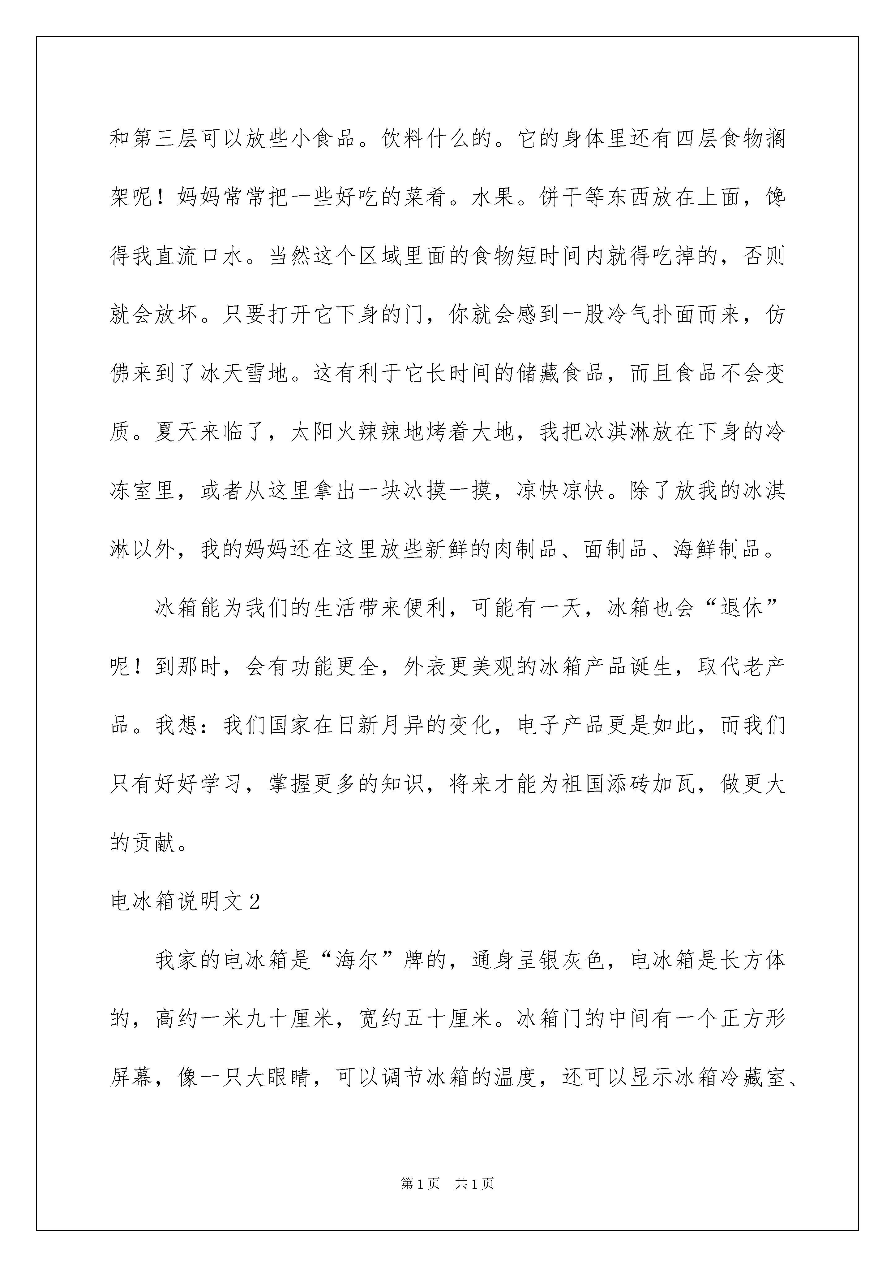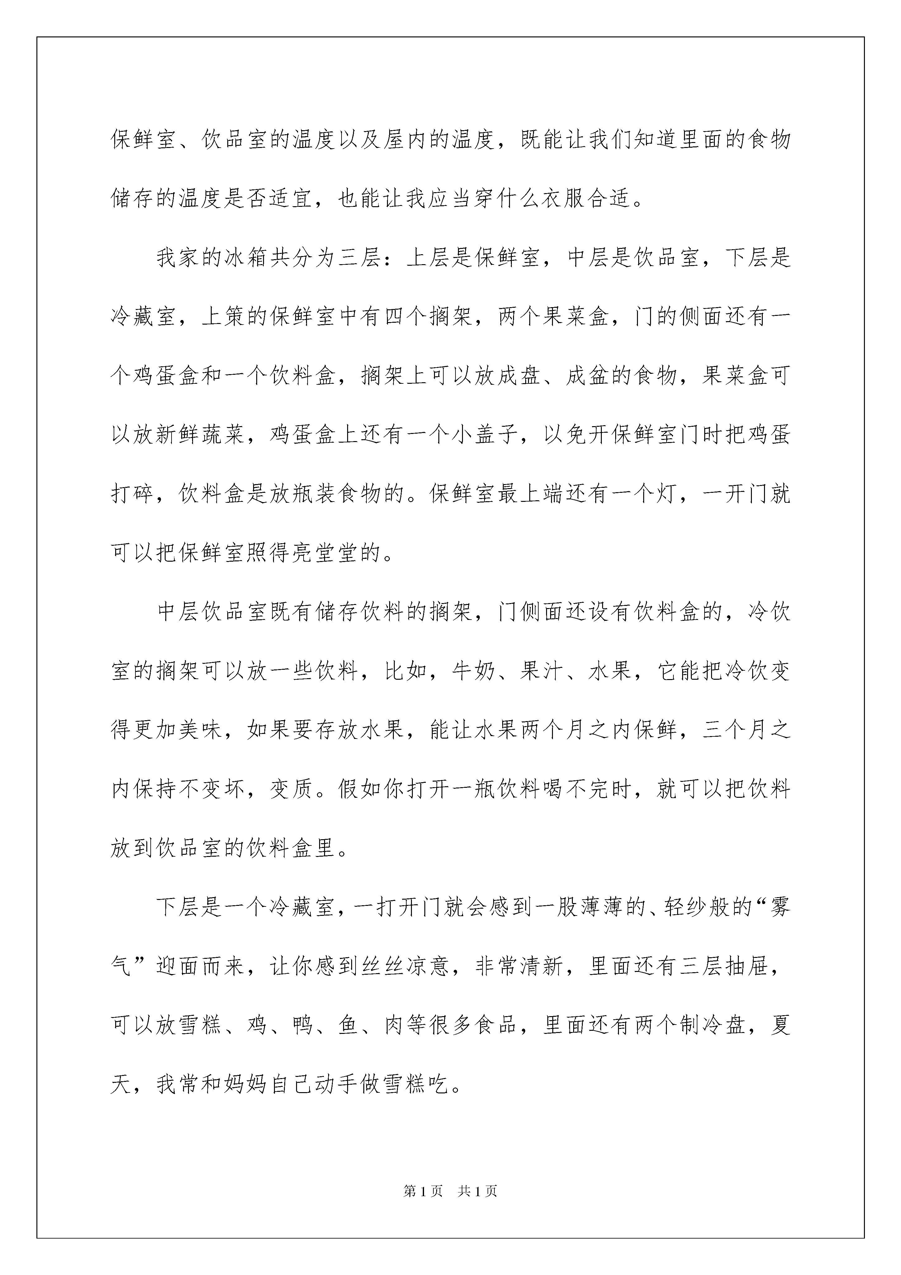 2022电冰箱说明文电冰箱说明文相信许多人都写过作文吧,特别是其中的说明文,更是常见,说明文一般介绍事物的形状、构造、类别、关系、功能,解释事物的原理、含义、特点、演变等。我们要怎么去写这类型的作文呢?下面是我精心整理的电冰箱说明文,供大家参考借鉴,希望可以帮助到有需要的朋友。电冰箱说明文1在我的家里,有许多家用电器,它们给我带来了便利。就说我家的那台冰箱吧,它不但外表好看,功能作用也不少,在家里起着举足轻重的地位。电冰箱“身穿”乳白色的外衣,像一位白衣天使,稳稳地站在墙角,给人以素雅清新的感受。它身高170cm,它比我还高一个头呢!它的身体分为上下两部分。它的上身部分的胃口可大啦,可以冷藏许多食品呢!上身的门上有三层架子。第一层是由一个窝一个窝的小洞组成的塑料架子,是放鸡蛋用的,鸡蛋放这儿既稳当又保鲜。第二层和第三层可以放些小食品。饮料什么的。它的身体里还有四层食物搁架呢!妈妈常常把一些好吃的菜肴。水果。饼干等东西放在上面,馋得我直流口水。当然这个区域里面的食物短时间内就得吃掉的,否则就会放坏。只要打开它下身的门,你就会感到一股冷气扑面而来,仿佛来到了冰天雪地。这有利于它长时间的储藏食品,而且食品不会变质。夏天来临了,太阳火辣辣地烤着大地,我把冰淇淋放在下身的冷冻室里,或者从这里拿出一块冰摸一摸,凉快凉快。除了放我的冰淇淋以外,我的妈妈还在这里放些新鲜的肉制品、面制品、海鲜制品。冰箱能为我们的生活带来便利,可能有一天,冰箱也会“退休”呢!到那时,会有功能更全,外表更美观的冰箱产品诞生,取代老产品。我想:我们国家在日新月异的变化,电子产品更是如此,而我们只有好好学习,掌握更多的知识,将来才能为祖国添砖加瓦,做更大的贡献。电冰箱说明文2我家的电冰箱是“海尔”牌的,通身呈银灰色,电冰箱是长方体的,高约一米九十厘米,宽约五十厘米。冰箱门的中间有一个正方形屏幕,像一只大眼睛,可以调节冰箱的温度,还可以显示冰箱冷藏室、保鲜室、饮品室的温度以及屋内的温度,既能让我们知道里面的食物储存的温度是否适宜,也能让我应当穿什么衣服合适。我家的冰箱共分为三层:上层是保鲜室,中层是饮品室,下层是冷藏室,上策的保鲜室中有四个搁架,两个果菜盒,门的侧面还有一个鸡蛋盒和一个饮料盒,搁架上可以放成盘、成盆的食物,果菜盒可以放新鲜蔬菜,鸡蛋盒上还有一个小盖子,以免开保鲜室门时把鸡蛋打碎,饮料盒是放瓶装食物的。保鲜室最上端还有一个灯,一开门就可以把保鲜室照得亮堂堂的。中层饮品室既有储存饮料的搁架,门侧面还设有饮料盒的,冷饮室的搁架可以放一些饮料,比如,牛奶、果汁、水果,它能把冷饮变得更加美味,如果要存放水果,能让水果两个月之内保鲜,三个月之内保持不变坏,变质。假如你打开一瓶饮料喝不完时,就可以把饮料放到饮品室的饮料盒里。下层是一个冷藏室,一打开门就会感到一股薄薄的、轻纱般的“雾气”迎面而来,让你感到丝丝凉意,非常清新,里面还有三层抽屉,可以放雪糕、鸡、鸭、鱼、肉等很多食品,里面还有两个制冷盘,夏天,我常和妈妈自己动手做雪糕吃。电冰箱几乎家家都有,随着科技发展,电冰箱的样子和品牌不断更新,但我家的电冰箱还像我们的老朋友一样,长年累月待在我家的客厅,一直没舍得换。电冰箱说明文3我家有一台海尔牌的快乐王子电冰箱,它的颜色是灰色的,它高有1。645米,宽是:0.55米。深是0.62米。它是一个人工智能自动调温冰箱。它在人工智慧状态下,该冰箱能够随环境温度变化自动调节温度设置,无需人为调节,便能达到最佳制冷效果,使你更加省心省力。冷藏室,软冷冻室温度可以分别设置,分别显示,一目了然,能及时了解冰箱的运行情况,使用起来更加方便。软冷冻保险是(——7°C保鲜温区),食物加工前无需化冻,切取容易,有效锁住营养,保鲜更有效,生活更方便。速冻功能运用细胞保活技术,以超强制冷能力,使食品迅速通过最大冰晶生成带,不破坏细胞结构,保持细胞活力,营养成份不散失,保鲜效果好。透明抽屉时尚,不用打开抽屉,就能知道所储物品,保冷节能。抗菌保健是采用最新技术,抗菌防霉透明于一体,新鲜又健康。自从有了这个冰箱以后,我们家做事就方便多了。比如说,我们家饭后剩下的饭和菜。以前我们怕吃坏肚子都倒了,可是现在自从有了这个冰箱以后,剩饭和剩菜就可以放在冷藏室里面,也不会浪费了。炎热的夏天,我还可以自己亲自动手做出美味可口的冰淇淋。有了这个智能冰箱,给我们的生活带了极大的方便。电冰箱说明文4爷爷的年岁大了,他常常会干出一些糊涂事。这不,爷爷的眼镜明明在鼻梁上,却到处找眼镜,一边找一边说:“我的眼镜呢?我的眼镜呢?”还有一次,爷爷要吃香蕉,香蕉剥好了。爷爷却把