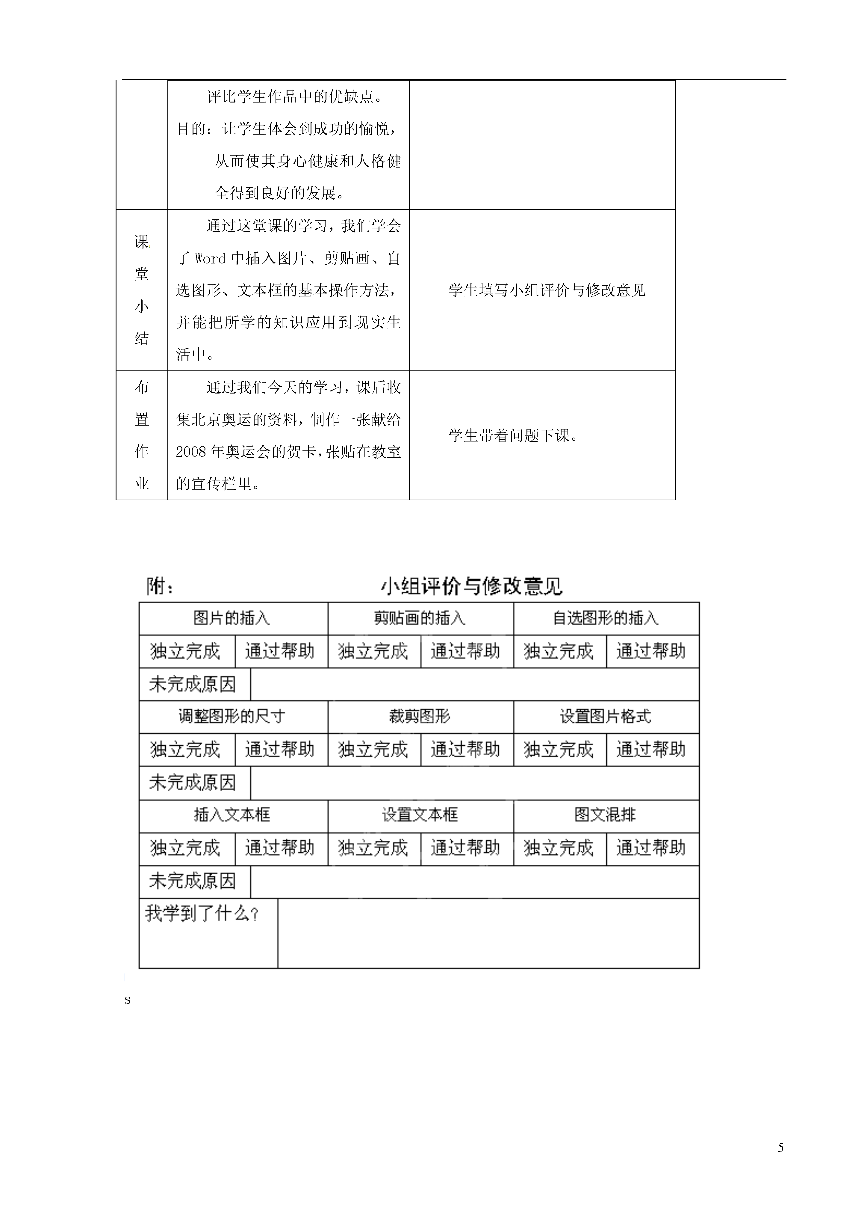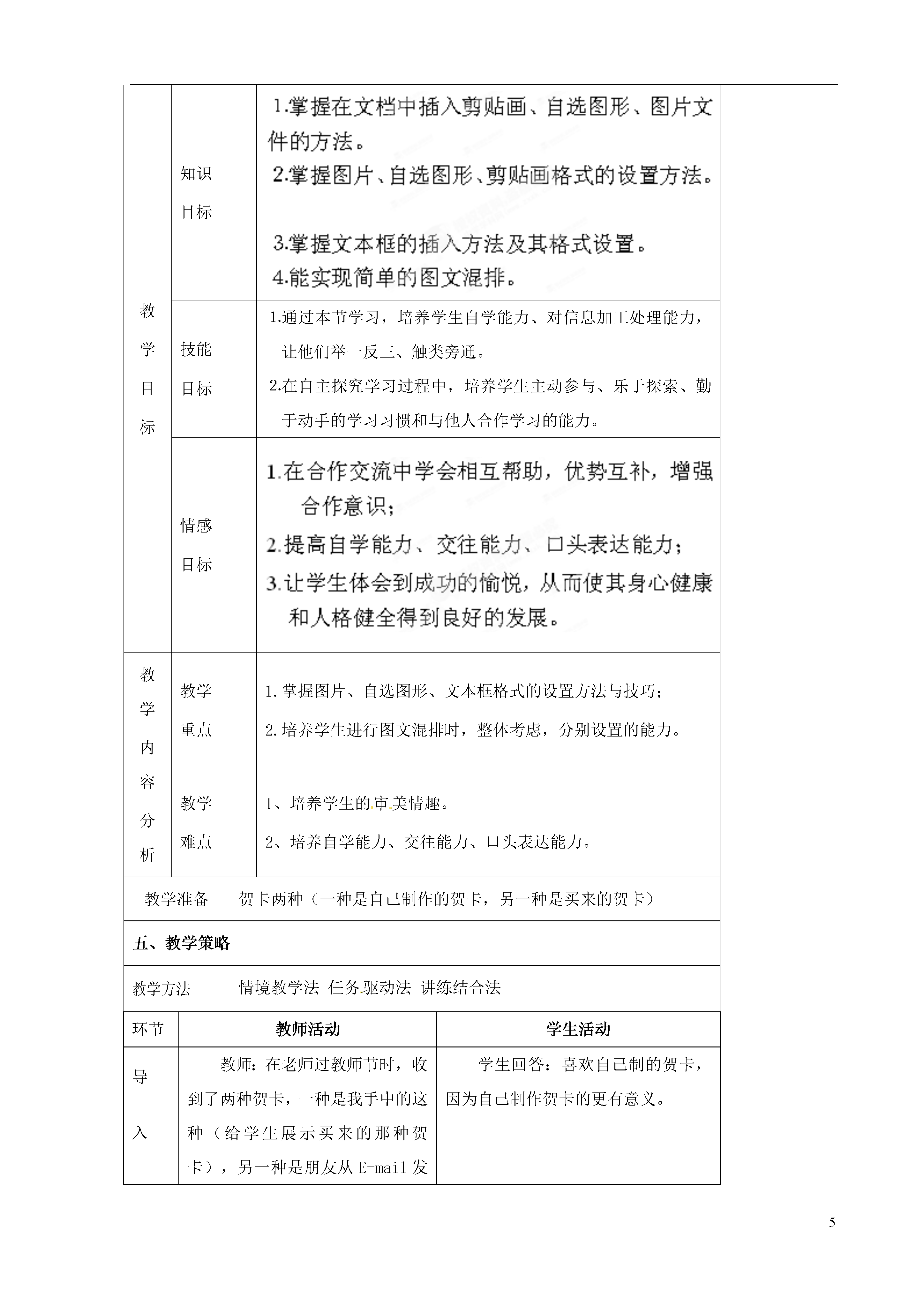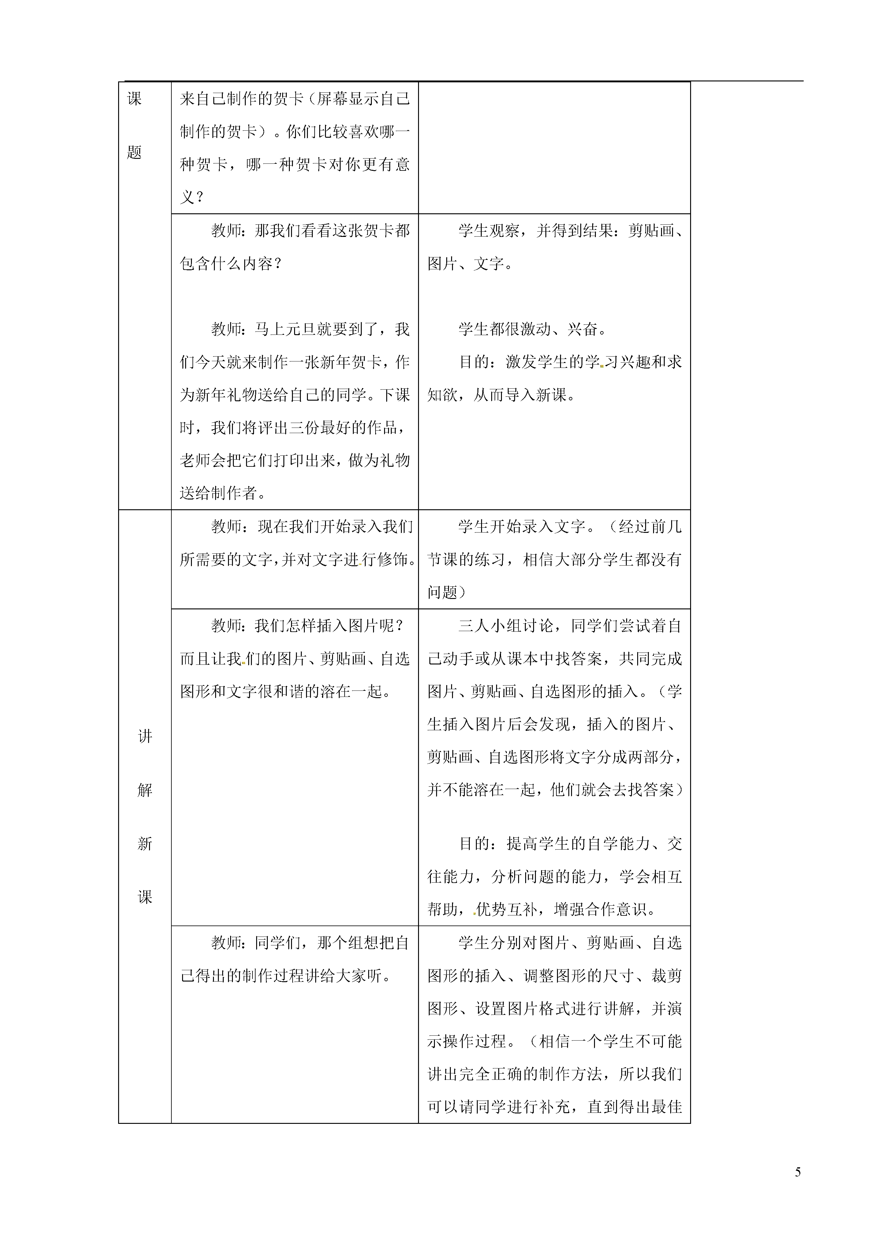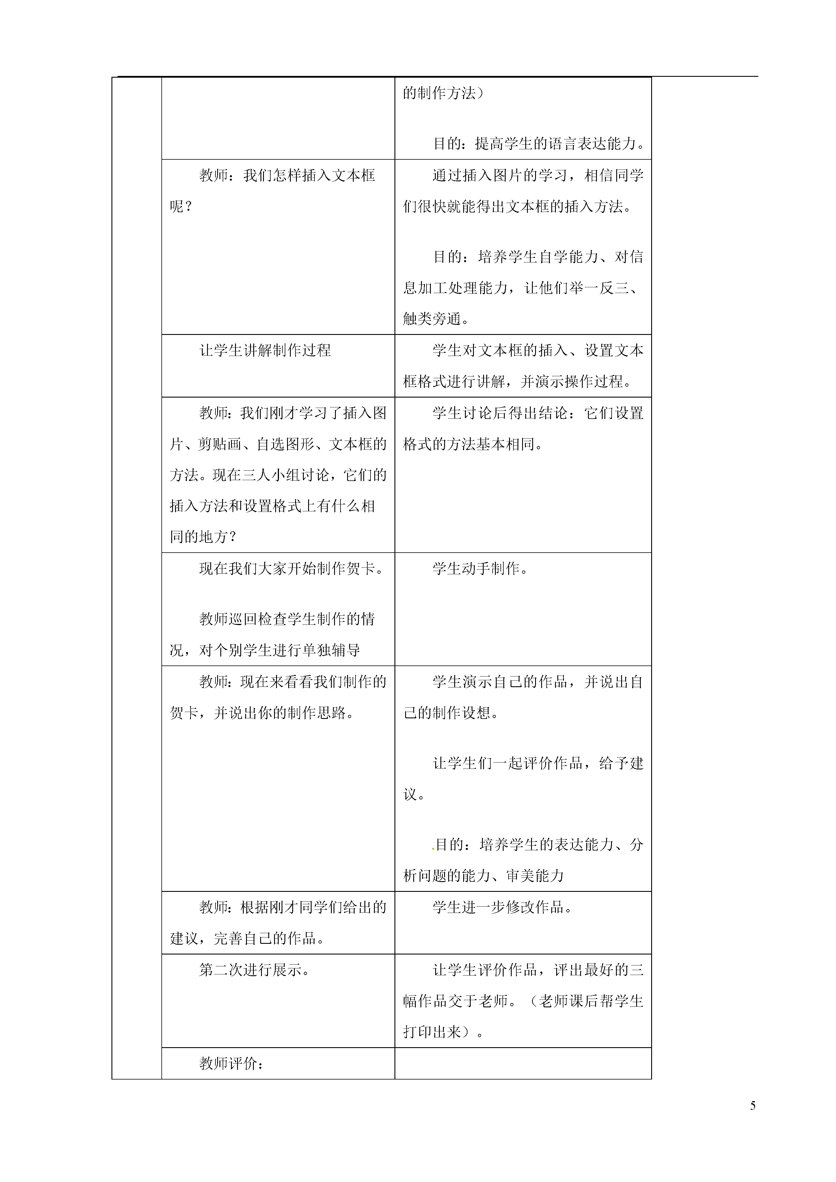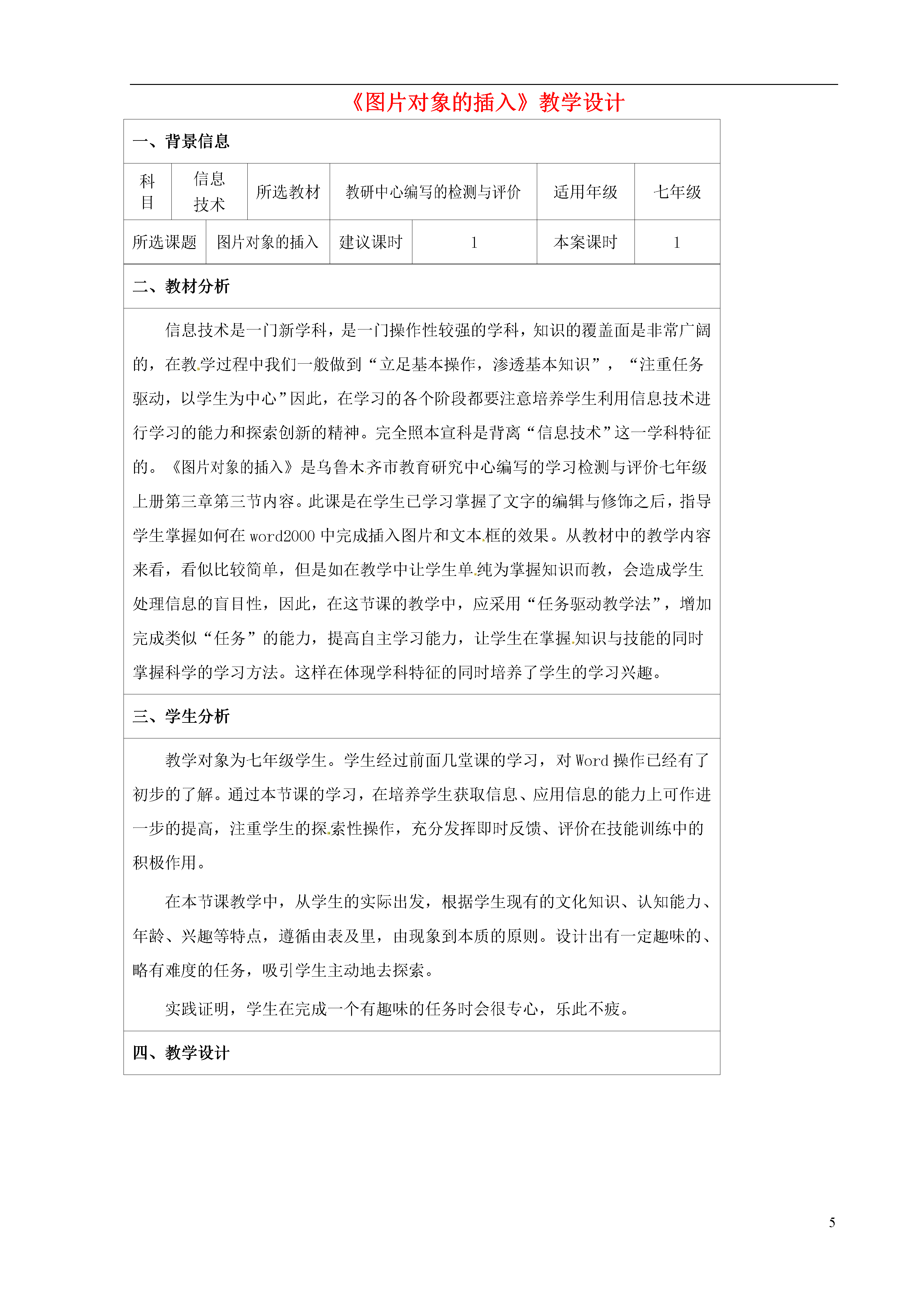5《图片对象的插入》教学设计一、背景信息科目信息技术所选教材教研中心编写的检测与评价适用年级七年级所选课题图片对象的插入建议课时1本案课时1二、教材分析信息技术是一门新学科,是一门操作性较强的学科,知识的覆盖面是非常广阔的,在教学过程中我们一般做到“立足基本操作,渗透基本知识”,“注重任务驱动,以学生为中心”因此,在学习的各个阶段都要注意培养学生利用信息技术进行学习的能力和探索创新的精神。完全照本宣科是背离“信息技术”这一学科特征的。《图片对象的插入》是乌鲁木齐市教育研究中心编写的学习检测与评价七年级上册第三章第三节内容。此课是在学生已学习掌握了文字的编辑与修饰之后,指导学生掌握如何在word2000中完成插入图片和文本框的效果。从教材中的教学内容来看,看似比较简单,但是如在教学中让学生单纯为掌握知识而教,会造成学生处理信息的盲目性,因此,在这节课的教学中,应采用“任务驱动教学法”,增加完成类似“任务”的能力,提高自主学习能力,让学生在掌握知识与技能的同时掌握科学的学习方法。这样在体现学科特征的同时培养了学生的学习兴趣。三、学生分析教学对象为七年级学生。学生经过前面几堂课的学习,对Word操作已经有了初步的了解。通过本节课的学习,在培养学生获取信息、应用信息的能力上可作进一步的提高,注重学生的探索性操作,充分发挥即时反馈、评价在技能训练中的积极作用。在本节课教学中,从学生的实际出发,根据学生现有的文化知识、认知能力、年龄、兴趣等特点,遵循由表及里,由现象到本质的原则。设计出有一定趣味的、略有难度的任务,吸引学生主动地去探索。实践证明,学生在完成一个有趣味的任务时会很专心,乐此不疲。四、教学设计教学目标知识目标技能目标⒈通过本节学习,培养学生自学能力、对信息加工处理能力,让他们举一反三、触类旁通。⒉在自主探究学习过程中,培养学生主动参与、乐于探索、勤于动手的学习习惯和与他人合作学习的能力。情感目标教学内容分析教学重点1.掌握图片、自选图形、文本框格式的设置方法与技巧;2.培养学生进行图文混排时,整体考虑,分别设置的能力。教学难点1、培养学生的审美情趣。2、培养自学能力、交往能力、口头表达能力。教学准备贺卡两种(一种是自己制作的贺卡,另一种是买来的贺卡)五、教学策略教学方法情境教学法任务驱动法讲练结合法环节教师活动学生活动导入课题教师:在老师过教师节时,收到了两种贺卡,一种是我手中的这种(给学生展示买来的那种贺卡),另一种是朋友从E-mail发来自己制作的贺卡(屏幕显示自己制作的贺卡)。你们比较喜欢哪一种贺卡,哪一种贺卡对你更有意义?学生回答:喜欢自己制的贺卡,因为自己制作贺卡的更有意义。教师:那我们看看这张贺卡都包含什么内容?教师:马上元旦就要到了,我们今天就来制作一张新年贺卡,作为新年礼物送给自己的同学。下课时,我们将评出三份最好的作品,老师会把它们打印出来,做为礼物送给制作者。学生观察,并得到结果:剪贴画、图片、文字。学生都很激动、兴奋。目的:激发学生的学习兴趣和求知欲,从而导入新课。讲解新课教师:现在我们开始录入我们所需要的文字,并对文字进行修饰。学生开始录入文字。(经过前几节课的练习,相信大部分学生都没有问题)教师:我们怎样插入图片呢?而且让我们的图片、剪贴画、自选图形和文字很和谐的溶在一起。三人小组讨论,同学们尝试着自己动手或从课本中找答案,共同完成图片、剪贴画、自选图形的插入。(学生插入图片后会发现,插入的图片、剪贴画、自选图形将文字分成两部分,并不能溶在一起,他们就会去找答案)目的:提高学生的自学能力、交往能力,分析问题的能力,学会相互帮助,优势互补,增强合作意识。教师:同学们,那个组想把自己得出的制作过程讲给大家听。学生分别对图片、剪贴画、自选图形的插入、调整图形的尺寸、裁剪图形、设置图片格式进行讲解,并演示操作过程。(相信一个学生不可能讲出完全正确的制作方法,所以我们可以请同学进行补充,直到得出最佳的制作方法)目的:提高学生的语言表达能力。教师:我们怎样插入文本框呢?通过插入图片的学习,相信同学们很快就能得出文本框的插入方法。目的:培养学生自学能力、对信息加工处理能力,让他们举一反三、触类旁通。让学生讲解制作过程学生对文本框的插入、设置文本框格式进行讲解,并演示操作过程。教师:我们刚才学习了插入图片、剪贴画、自选图形、文本框的方法。现在三人小组讨论,它们的插入方法和设置格式上有什么相同的地方?学生讨论后得出结论:它们设置格式的方法基本相同。现在我们大家开始制作贺卡。教师巡回检查学生制作的情况,对个别学生进行单独辅导学生动手制作。教师:现在来看看我们制作的贺卡,并说出你的制作思路。学生演示自己的作品,并说出自己的制作设想。让学生