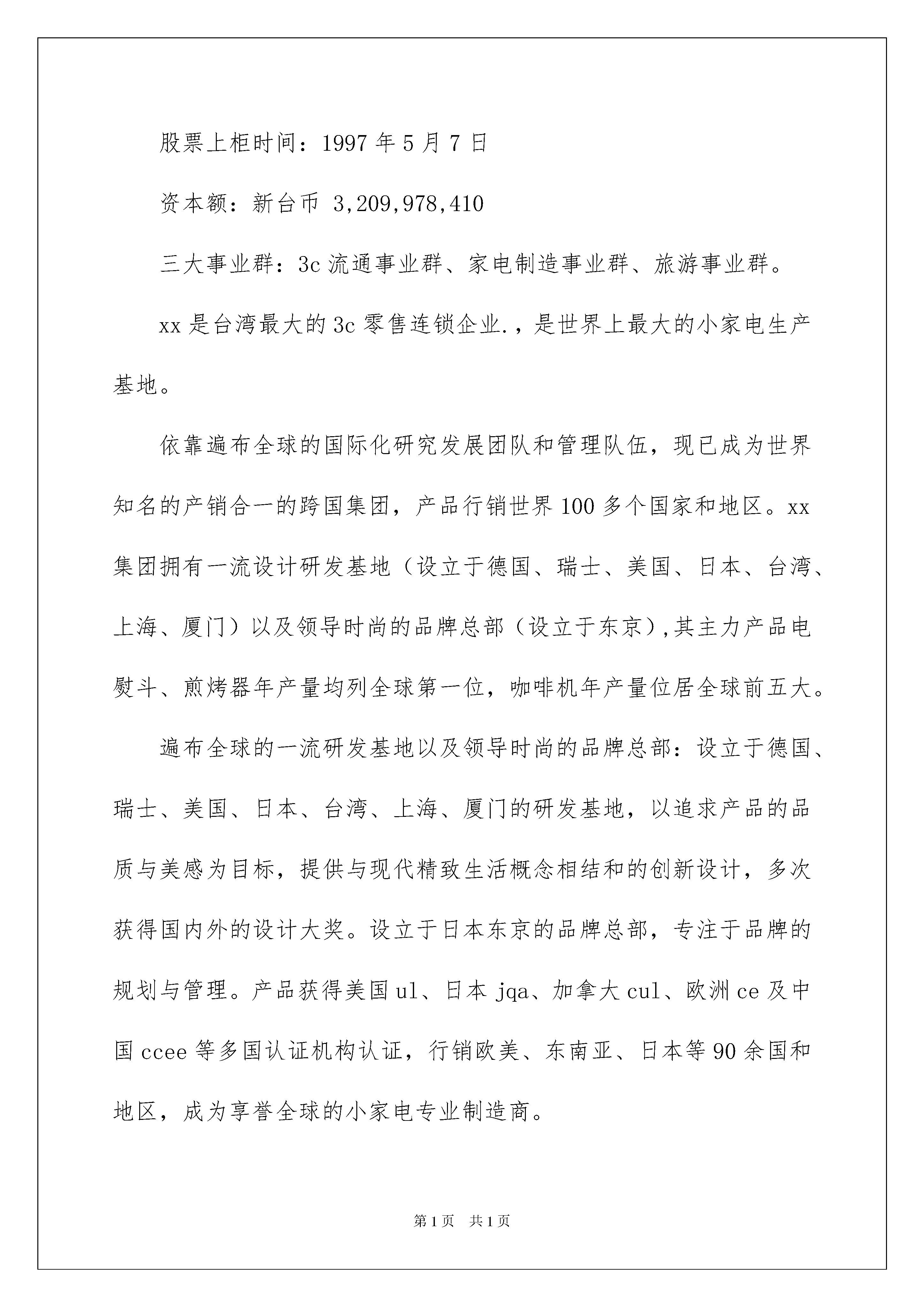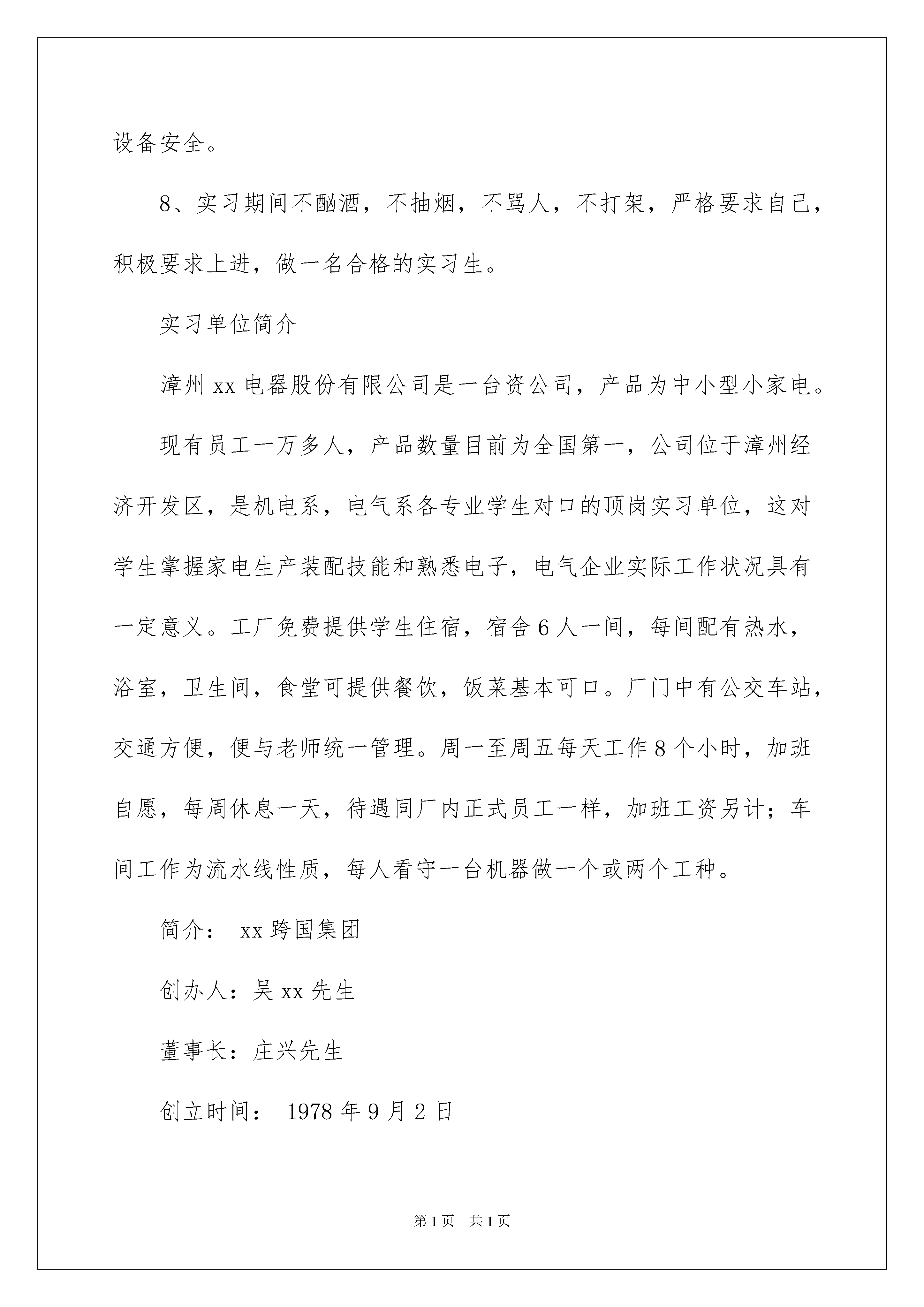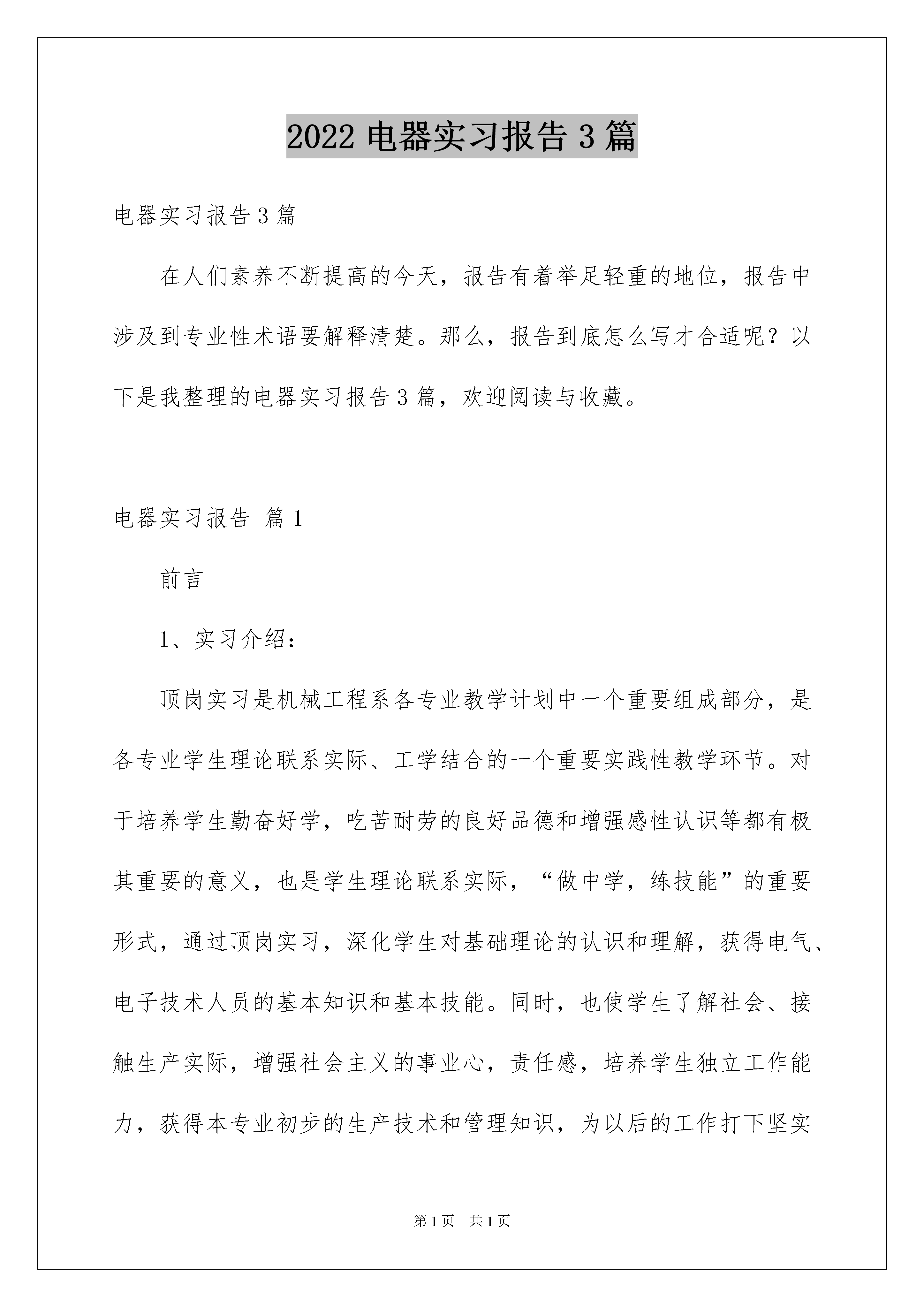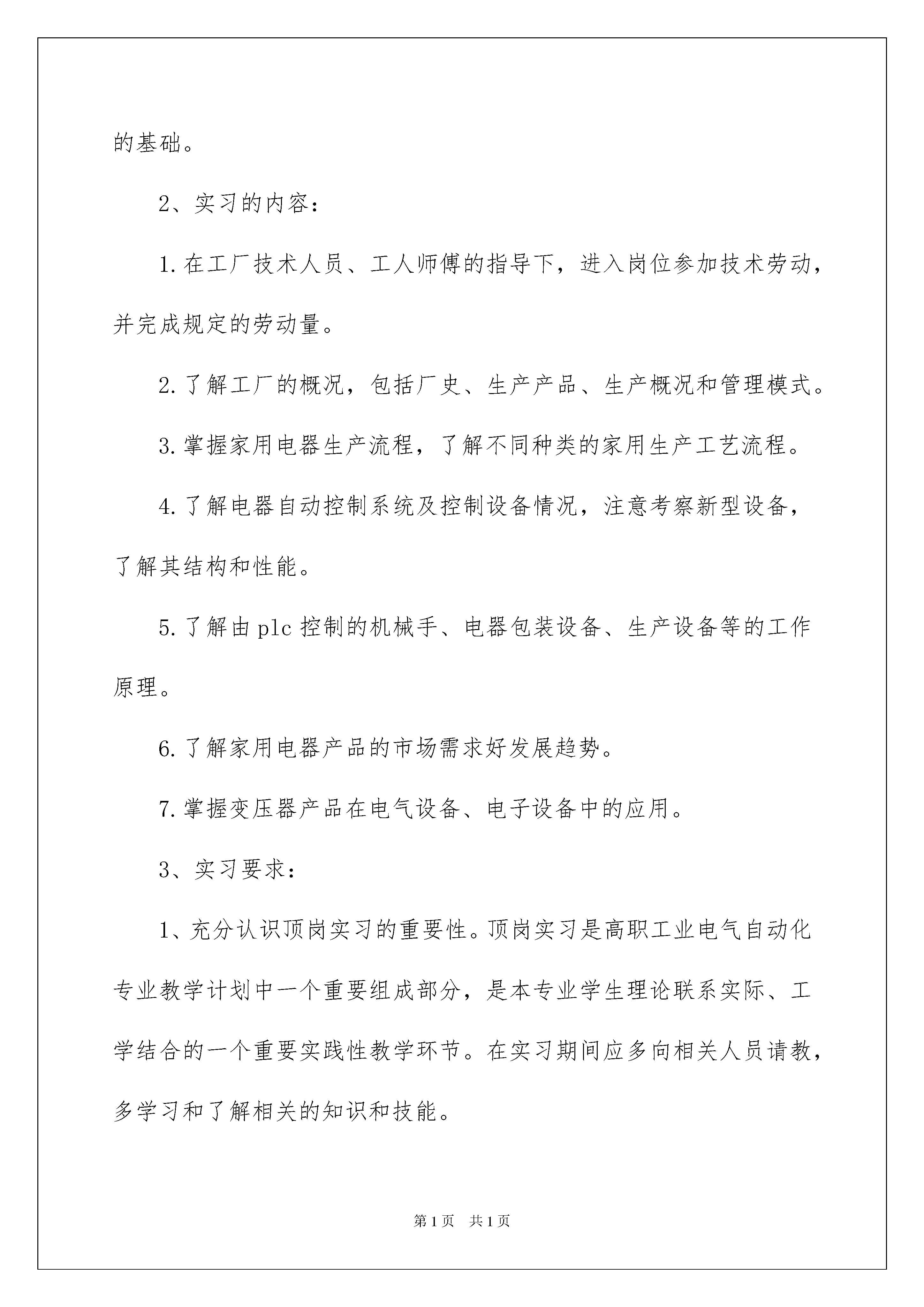 2022电器实习报告3篇电器实习报告3篇在人们素养不断提高的今天,报告有着举足轻重的地位,报告中涉及到专业性术语要解释清楚。那么,报告到底怎么写才合适呢?以下是我整理的电器实习报告3篇,欢迎阅读与收藏。电器实习报告篇1前言1、实习介绍:顶岗实习是机械工程系各专业教学计划中一个重要组成部分,是各专业学生理论联系实际、工学结合的一个重要实践性教学环节。对于培养学生勤奋好学,吃苦耐劳的良好品德和增强感性认识等都有极其重要的意义,也是学生理论联系实际,“做中学,练技能”的重要形式,通过顶岗实习,深化学生对基础理论的认识和理解,获得电气、电子技术人员的基本知识和基本技能。同时,也使学生了解社会、接触生产实际,增强社会主义的事业心,责任感,培养学生独立工作能力,获得本专业初步的生产技术和管理知识,为以后的工作打下坚实的基础。2、实习的内容:1.在工厂技术人员、工人师傅的指导下,进入岗位参加技术劳动,并完成规定的劳动量。2.了解工厂的概况,包括厂史、生产产品、生产概况和管理模式。3.掌握家用电器生产流程,了解不同种类的家用生产工艺流程。4.了解电器自动控制系统及控制设备情况,注意考察新型设备,了解其结构和性能。5.了解由plc控制的机械手、电器包装设备、生产设备等的工作原理。6.了解家用电器产品的市场需求好发展趋势。7.掌握变压器产品在电气设备、电子设备中的应用。3、实习要求:1、充分认识顶岗实习的重要性。顶岗实习是高职工业电气自动化专业教学计划中一个重要组成部分,是本专业学生理论联系实际、工学结合的一个重要实践性教学环节。在实习期间应多向相关人员请教,多学习和了解相关的知识和技能。2、要做到踏实、谦虚、认真、勤奋。实习中要主动、独立、热情地完成实习任务,注重理论与实际的紧密结合,利用所学知识为社会,为企业创造财富。3、实习期间要体现出大学生的精神文明风貌。要自尊、自爱、自强,关心集体,爱护公物,不得做有损学校、系部和个人荣誉的事。4、实习期间要有吃苦在前,享受在后的革命精神,吃苦耐劳,勇挑重担,保质保量出色地完成生产任务。5、在实习期间必须尊敬实习单位的领导和员工,主动搞好关系,按时上下班,不迟到,不早退,不得无故旷工,或擅自改变实习时间,服从安排,听从指挥,团结同事,遵守劳动纪律,遵守学校和实习单位的规章制度,注意人身及财产安全。未经实习指导老师和实习单位同意不得擅自离开实习岗位,如有违纪情况发生,将依企业及学校的有关规定严肃处理。6、实习过程中,应认真做好实习记录,每周写一篇实习周记,实习结束写一份实习总结、填写实习鉴定表,由实习单位给出实习评语并加盖实习单位公章,并由实习指导老师给出实习成绩。7、严格遵守安全操作规程,严禁违章操作;保证人身安全和财产、设备安全。8、实习期间不酗酒,不抽烟,不骂人,不打架,严格要求自己,积极要求上进,做一名合格的实习生。实习单位简介漳州xx电器股份有限公司是一台资公司,产品为中小型小家电。现有员工一万多人,产品数量目前为全国第一,公司位于漳州经济开发区,是机电系,电气系各专业学生对口的顶岗实习单位,这对学生掌握家电生产装配技能和熟悉电子,电气企业实际工作状况具有一定意义。工厂免费提供学生住宿,宿舍6人一间,每间配有热水,浴室,卫生间,食堂可提供餐饮,饭菜基本可口。厂门中有公交车站,交通方便,便与老师统一管理。周一至周五每天工作8个小时,加班自愿,每周休息一天,待遇同厂内正式员工一样,加班工资另计;车间工作为流水线性质,每人看守一台机器做一个或两个工种。简介:xx跨国集团创办人:吴xx先生董事长:庄兴先生创立时间:1978年9月2日股票上柜时间:1997年5月7日资本额:新台币3,209,978,410三大事业群:3c流通事业群、家电制造事业群、旅游事业群。xx是台湾最大的3c零售连锁企业.,是世界上最大的小家电生产基地。依靠遍布全球的国际化研究发展团队和管理队伍,现已成为世界知名的产销合一的跨国集团,产品行销世界100多个国家和地区。xx集团拥有一流设计研发基地(设立于德国、瑞士、美国、日本、台湾、上海、厦门)以及领导时尚的品牌总部(设立于东京),其主力产品电熨斗、煎烤器年产量均列全球第一位,咖啡机年产量位居全球前五大。遍布全球的一流研发基地以及领导时尚的品牌总部:设立于德国、瑞士、美国、日本、台湾、上海、厦门的研发基地,以追求产品的品质与美感为目标,提供与现代精致生活概念相结和的创新设计,多次获得国内外的设计大奖。设立于日本东京的品牌总部,专注于品牌的规划与管理。产品获得美国ul、日本jqa、加拿大cul、欧洲ce及中国ccee等多国认证机构认