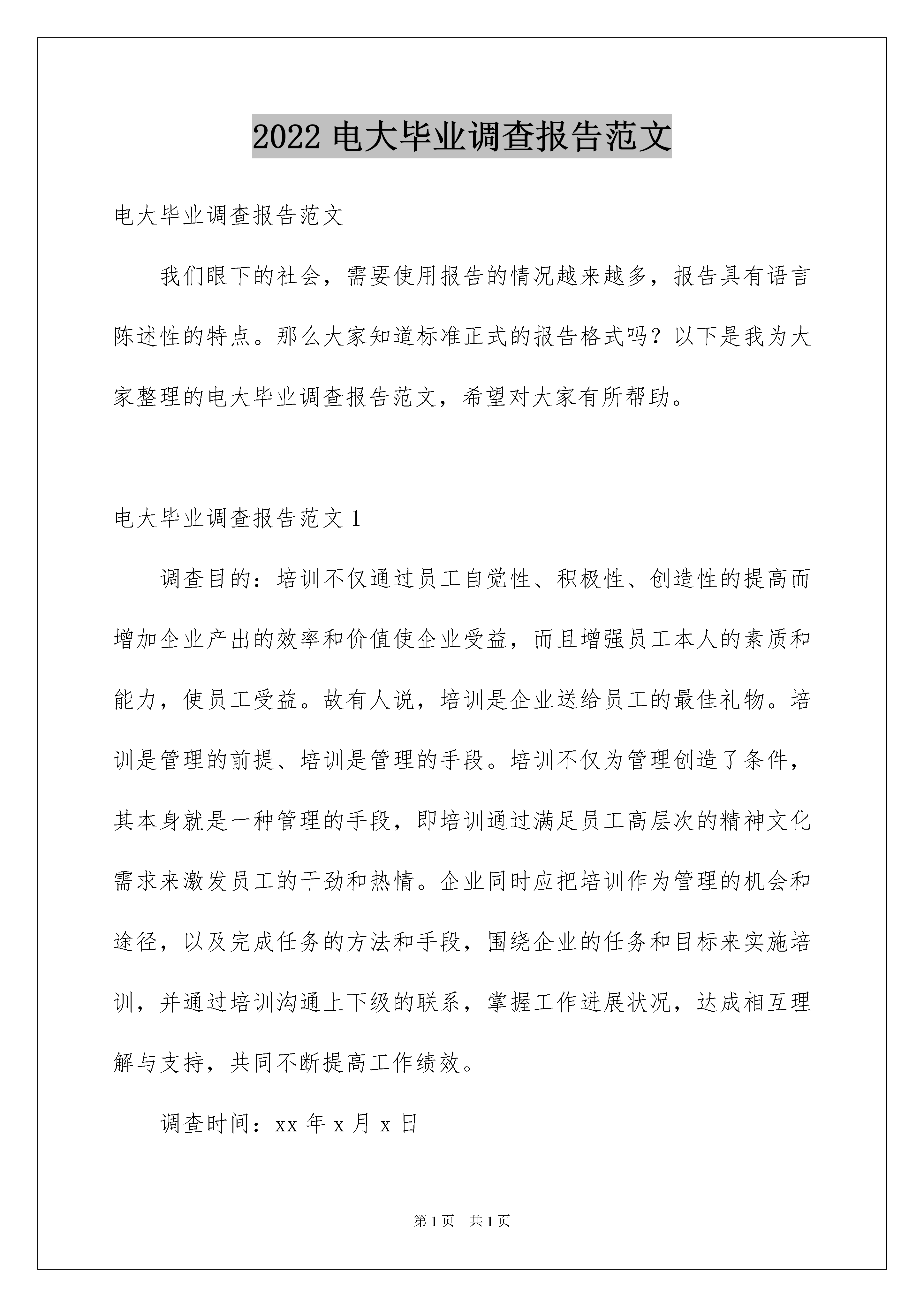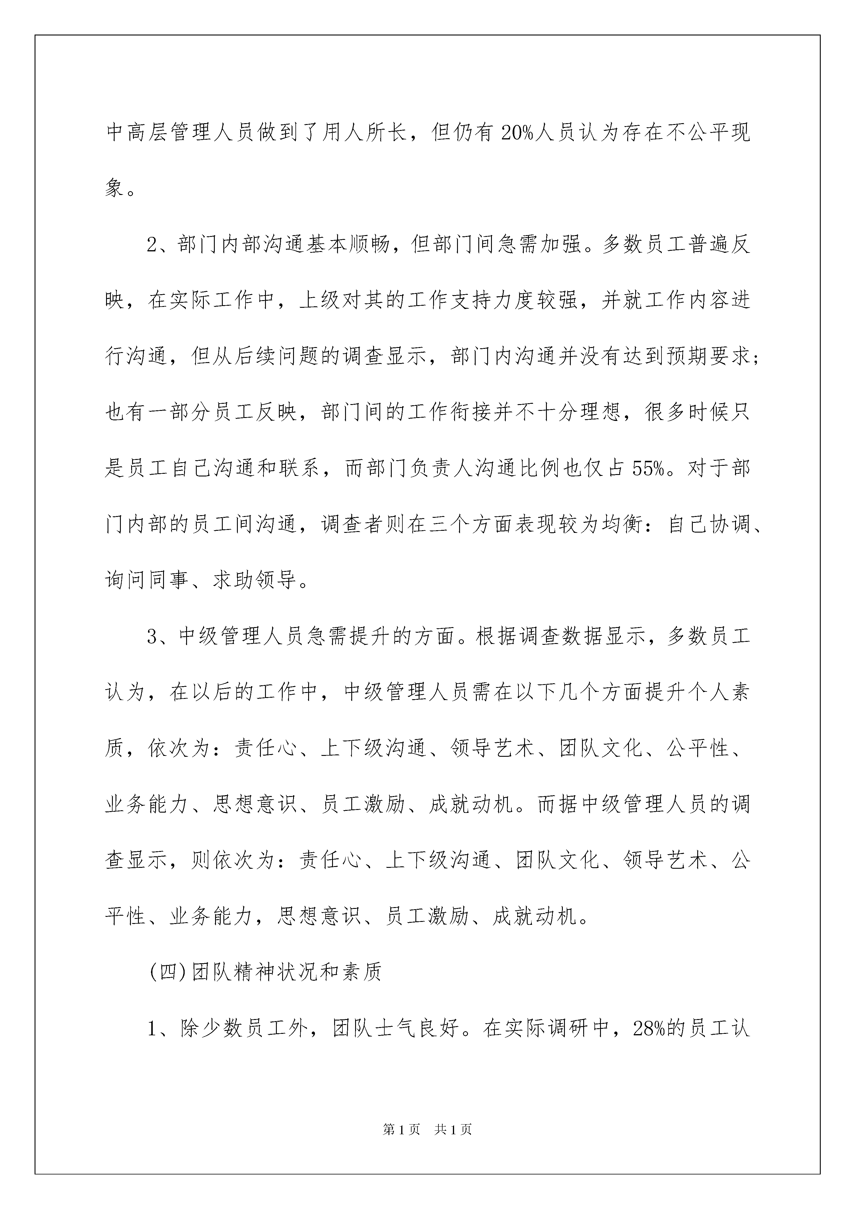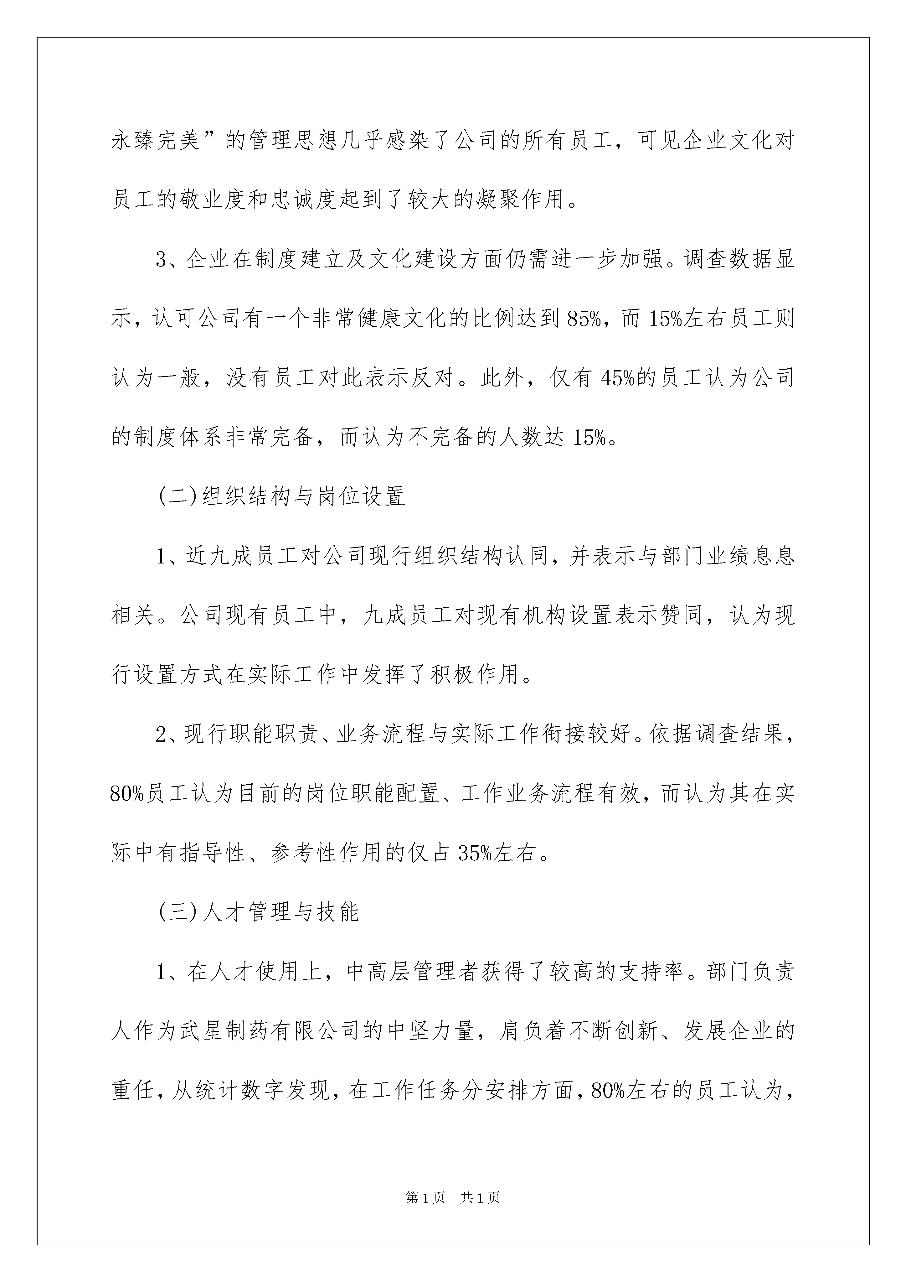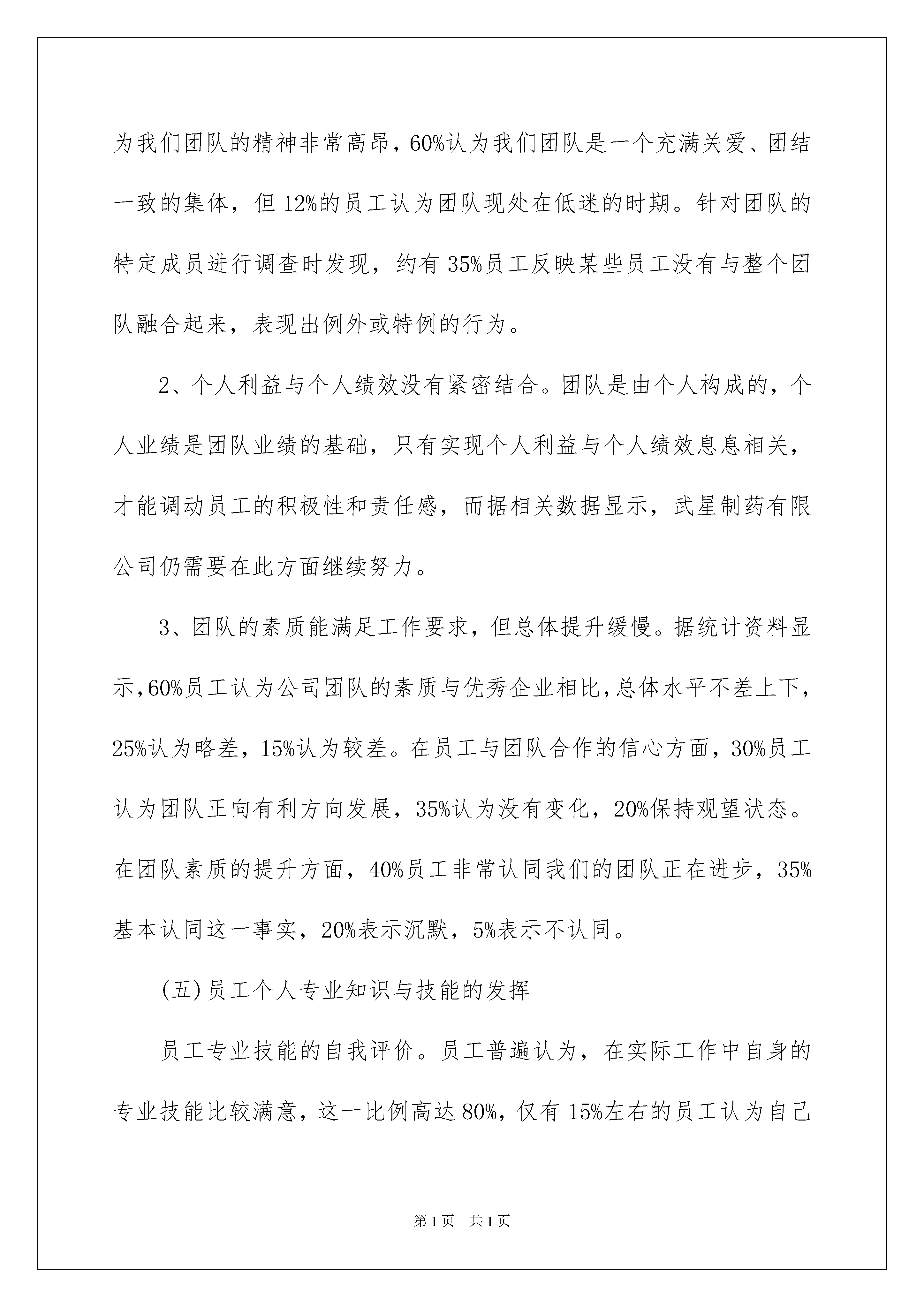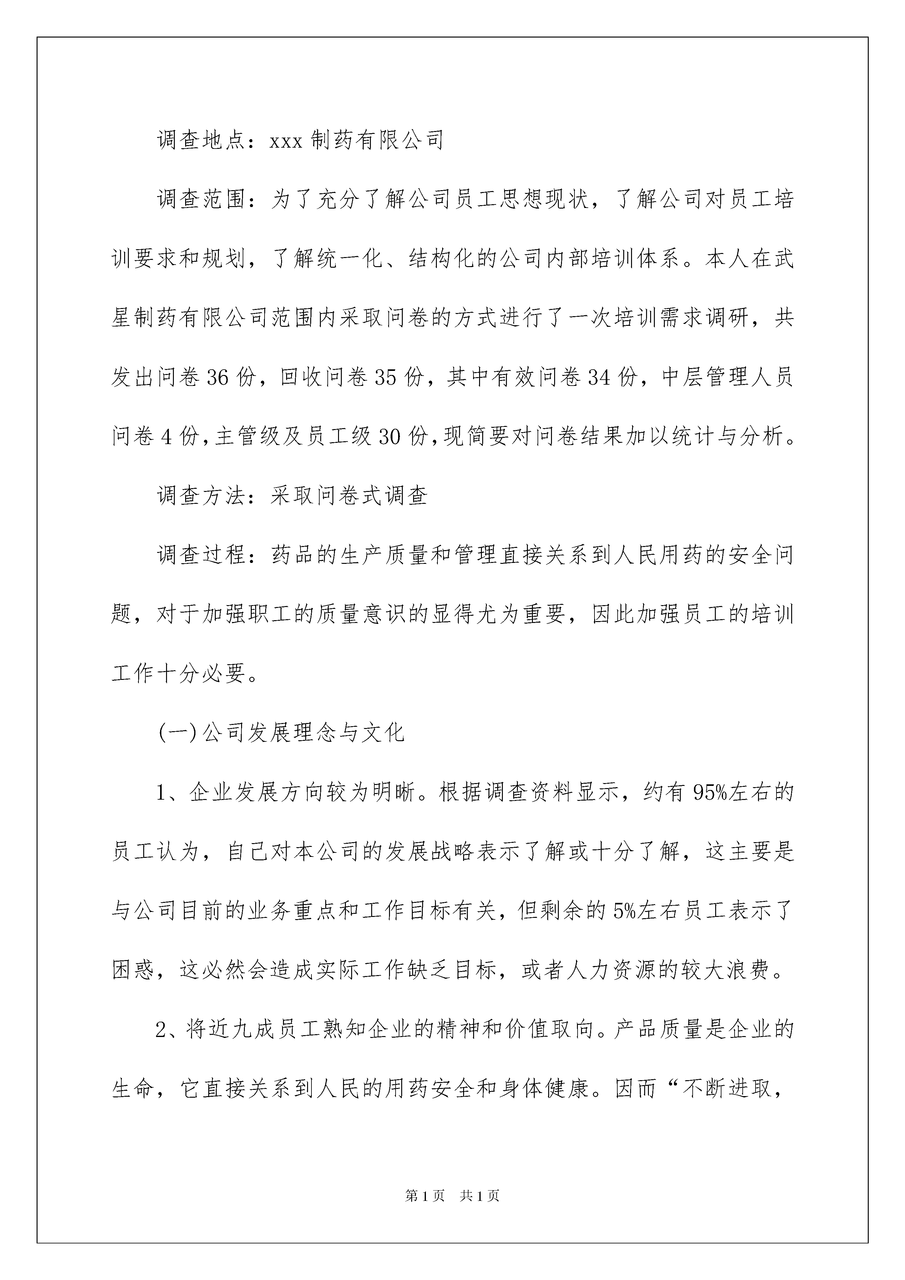 2022电大毕业调查报告范文电大毕业调查报告范文我们眼下的社会,需要使用报告的情况越来越多,报告具有语言陈述性的特点。那么大家知道标准正式的报告格式吗?以下是我为大家整理的电大毕业调查报告范文,希望对大家有所帮助。电大毕业调查报告范文1调查目的:培训不仅通过员工自觉性、积极性、创造性的提高而增加企业产出的效率和价值使企业受益,而且增强员工本人的素质和能力,使员工受益。故有人说,培训是企业送给员工的最佳礼物。培训是管理的前提、培训是管理的手段。培训不仅为管理创造了条件,其本身就是一种管理的手段,即培训通过满足员工高层次的精神文化需求来激发员工的干劲和热情。企业同时应把培训作为管理的机会和途径,以及完成任务的方法和手段,围绕企业的任务和目标来实施培训,并通过培训沟通上下级的联系,掌握工作进展状况,达成相互理解与支持,共同不断提高工作绩效。调查时间:xx年x月x日调查地点:xxx制药有限公司调查范围:为了充分了解公司员工思想现状,了解公司对员工培训要求和规划,了解统一化、结构化的公司内部培训体系。本人在武星制药有限公司范围内采取问卷的方式进行了一次培训需求调研,共发出问卷36份,回收问卷35份,其中有效问卷34份,中层管理人员问卷4份,主管级及员工级30份,现简要对问卷结果加以统计与分析。调查方法:采取问卷式调查调查过程:药品的生产质量和管理直接关系到人民用药的安全问题,对于加强职工的质量意识的显得尤为重要,因此加强员工的培训工作十分必要。(一)公司发展理念与文化1、企业发展方向较为明晰。根据调查资料显示,约有95%左右的员工认为,自己对本公司的发展战略表示了解或十分了解,这主要是与公司目前的业务重点和工作目标有关,但剩余的5%左右员工表示了困惑,这必然会造成实际工作缺乏目标,或者人力资源的较大浪费。2、将近九成员工熟知企业的精神和价值取向。产品质量是企业的生命,它直接关系到人民的用药安全和身体健康。因而“不断进取,永臻完美”的管理思想几乎感染了公司的所有员工,可见企业文化对员工的敬业度和忠诚度起到了较大的凝聚作用。3、企业在制度建立及文化建设方面仍需进一步加强。调查数据显示,认可公司有一个非常健康文化的比例达到85%,而15%左右员工则认为一般,没有员工对此表示反对。此外,仅有45%的员工认为公司的制度体系非常完备,而认为不完备的人数达15%。(二)组织结构与岗位设置1、近九成员工对公司现行组织结构认同,并表示与部门业绩息息相关。公司现有员工中,九成员工对现有机构设置表示赞同,认为现行设置方式在实际工作中发挥了积极作用。2、现行职能职责、业务流程与实际工作衔接较好。依据调查结果,80%员工认为目前的岗位职能配置、工作业务流程有效,而认为其在实际中有指导性、参考性作用的仅占35%左右。(三)人才管理与技能1、在人才使用上,中高层管理者获得了较高的支持率。部门负责人作为武星制药有限公司的中坚力量,肩负着不断创新、发展企业的重任,从统计数字发现,在工作任务分安排方面,80%左右的员工认为,中高层管理人员做到了用人所长,但仍有20%人员认为存在不公平现象。2、部门内部沟通基本顺畅,但部门间急需加强。多数员工普遍反映,在实际工作中,上级对其的工作支持力度较强,并就工作内容进行沟通,但从后续问题的调查显示,部门内沟通并没有达到预期要求;也有一部分员工反映,部门间的工作衔接并不十分理想,很多时候只是员工自己沟通和联系,而部门负责人沟通比例也仅占55%。对于部门内部的员工间沟通,调查者则在三个方面表现较为均衡:自己协调、询问同事、求助领导。3、中级管理人员急需提升的方面。根据调查数据显示,多数员工认为,在以后的工作中,中级管理人员需在以下几个方面提升个人素质,依次为:责任心、上下级沟通、领导艺术、团队文化、公平性、业务能力、思想意识、员工激励、成就动机。而据中级管理人员的调查显示,则依次为:责任心、上下级沟通、团队文化、领导艺术、公平性、业务能力,思想意识、员工激励、成就动机。(四)团队精神状况和素质1、除少数员工外,团队士气良好。在实际调研中,28%的员工认为我们团队的精神非常高昂,60%认为我们团队是一个充满关爱、团结一致的集体,但12%的员工认为团队现处在低迷的时期。针对团队的特定成员进行调查时发现,约有35%员工反映某些员工没有与整个团队融合起来,表现出例外或特例的行为。2、个人利益与个人绩效没有紧密结合。团队是由个人构成的,个人业绩是团队业绩的基础,只有实现个人利益与个人绩效息息相关,才能调动员工的积极性和责任感,而据相关数据显示,武星制药有限公司仍需要在此方面继续努力。3、团队的