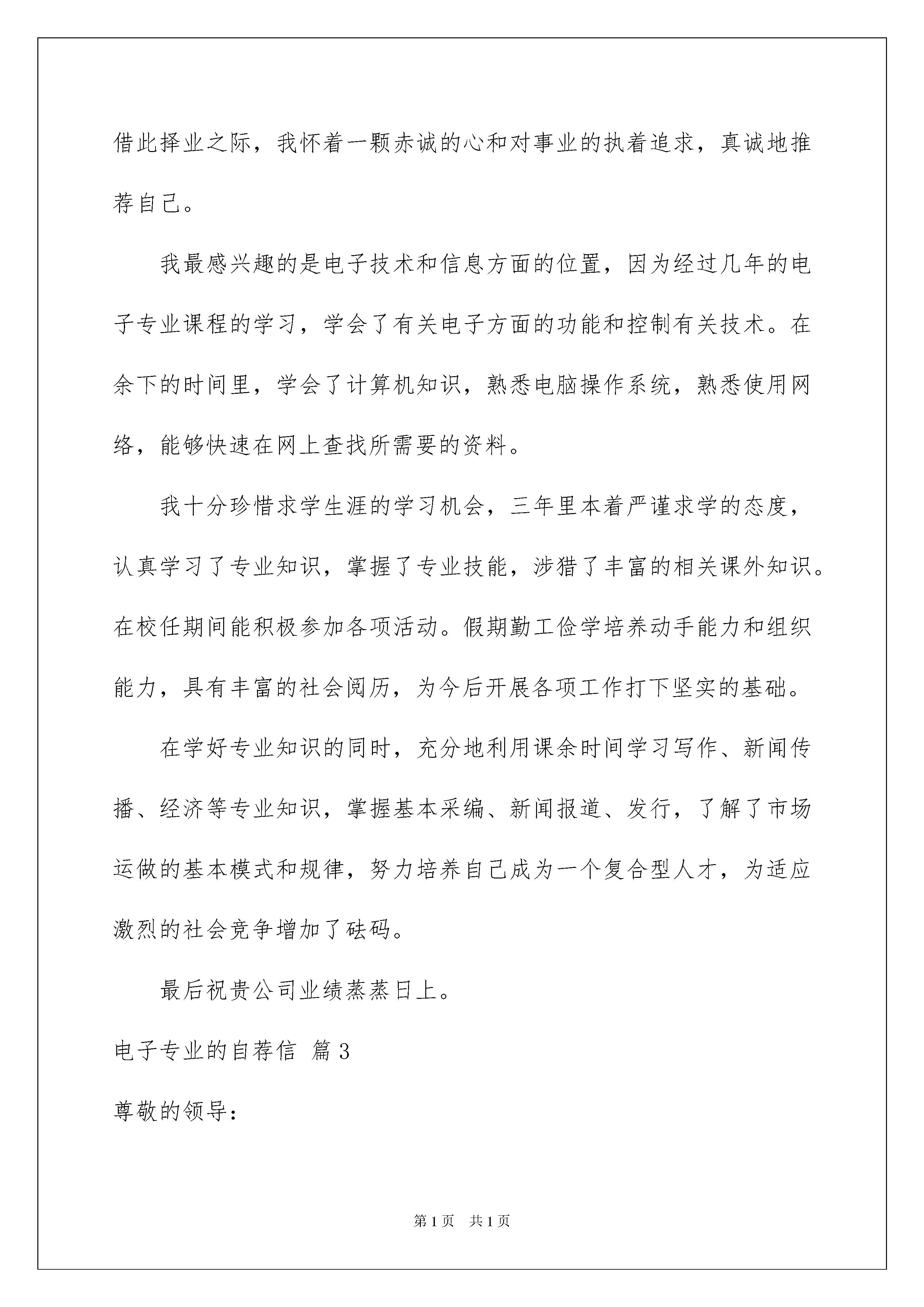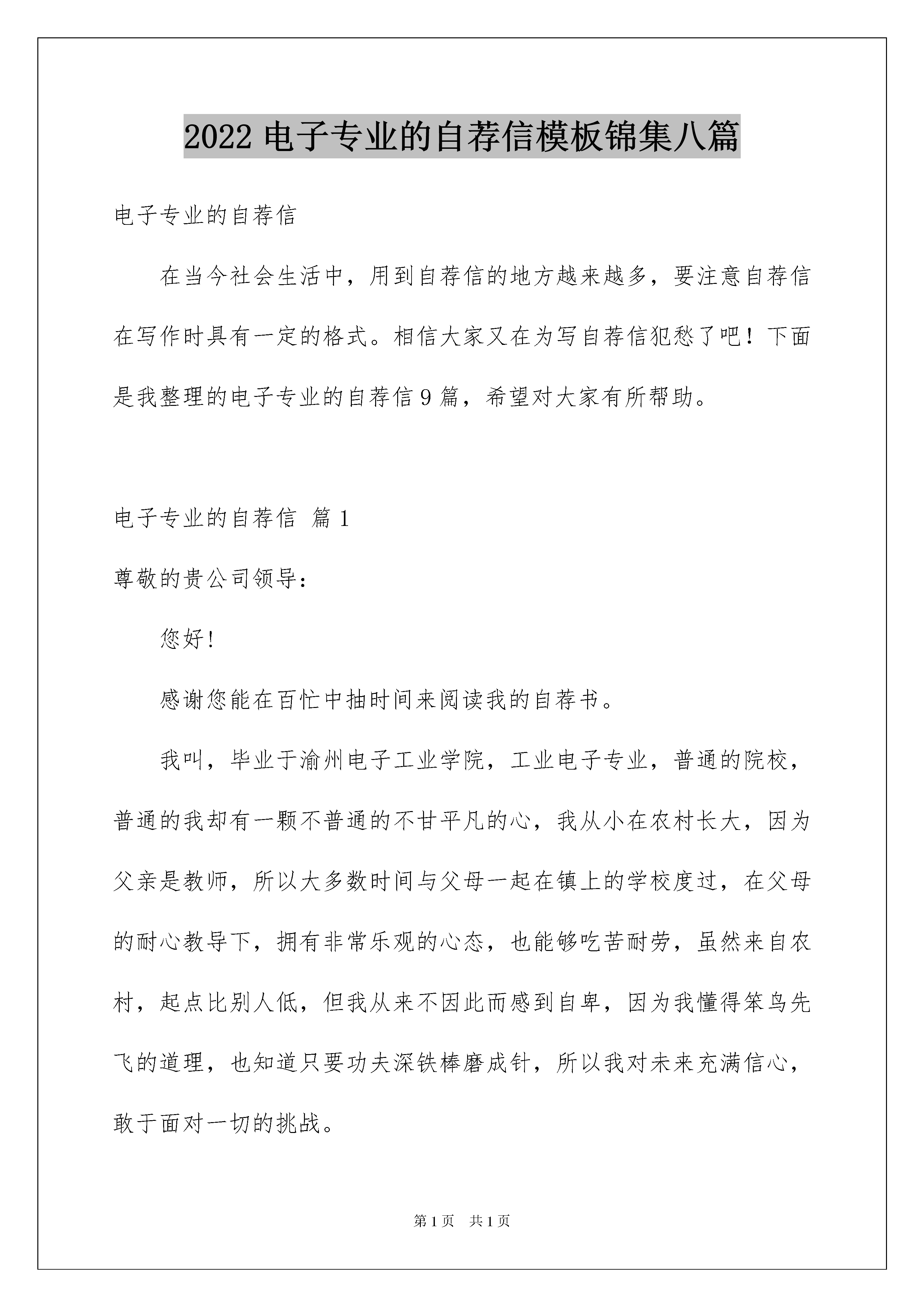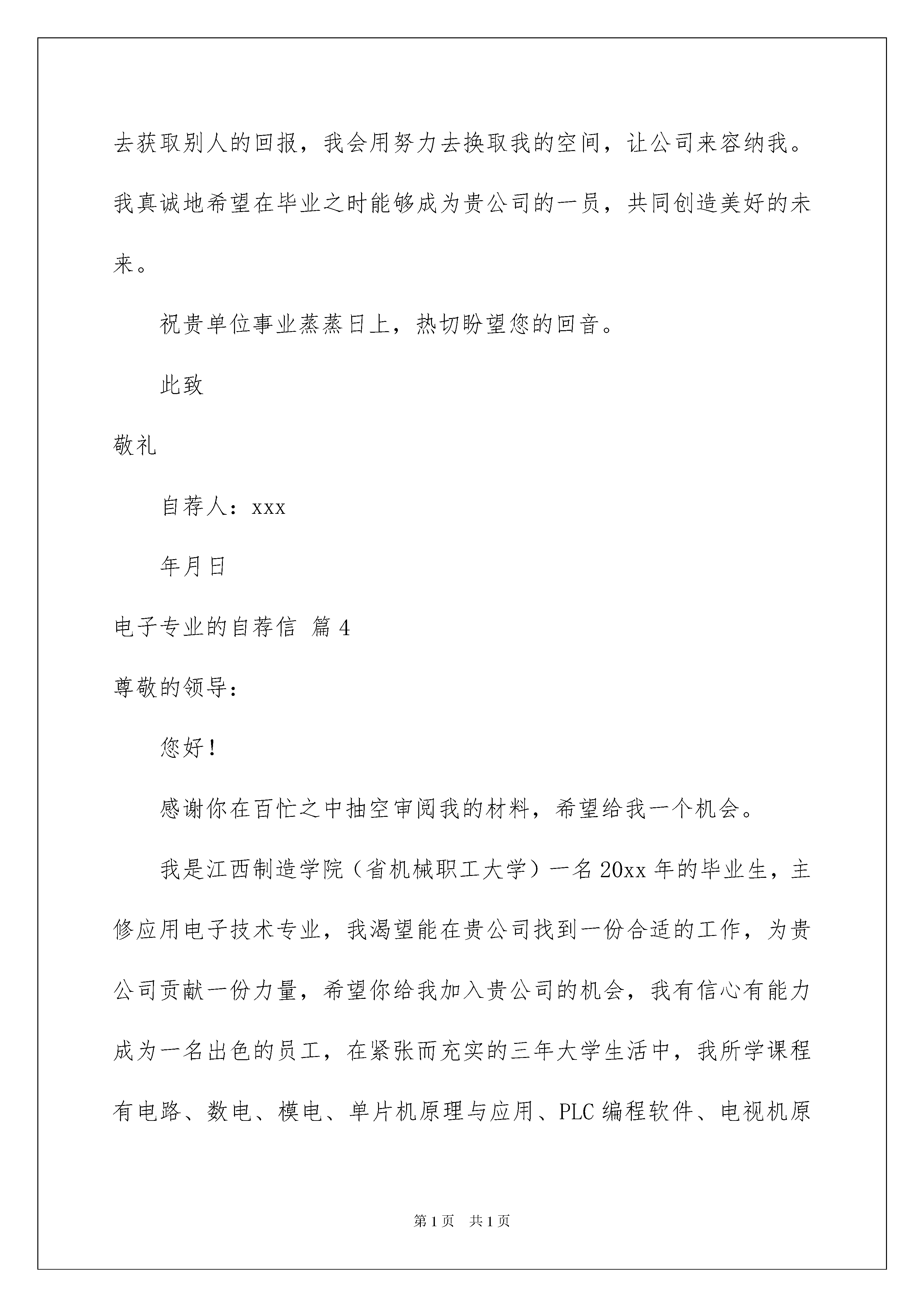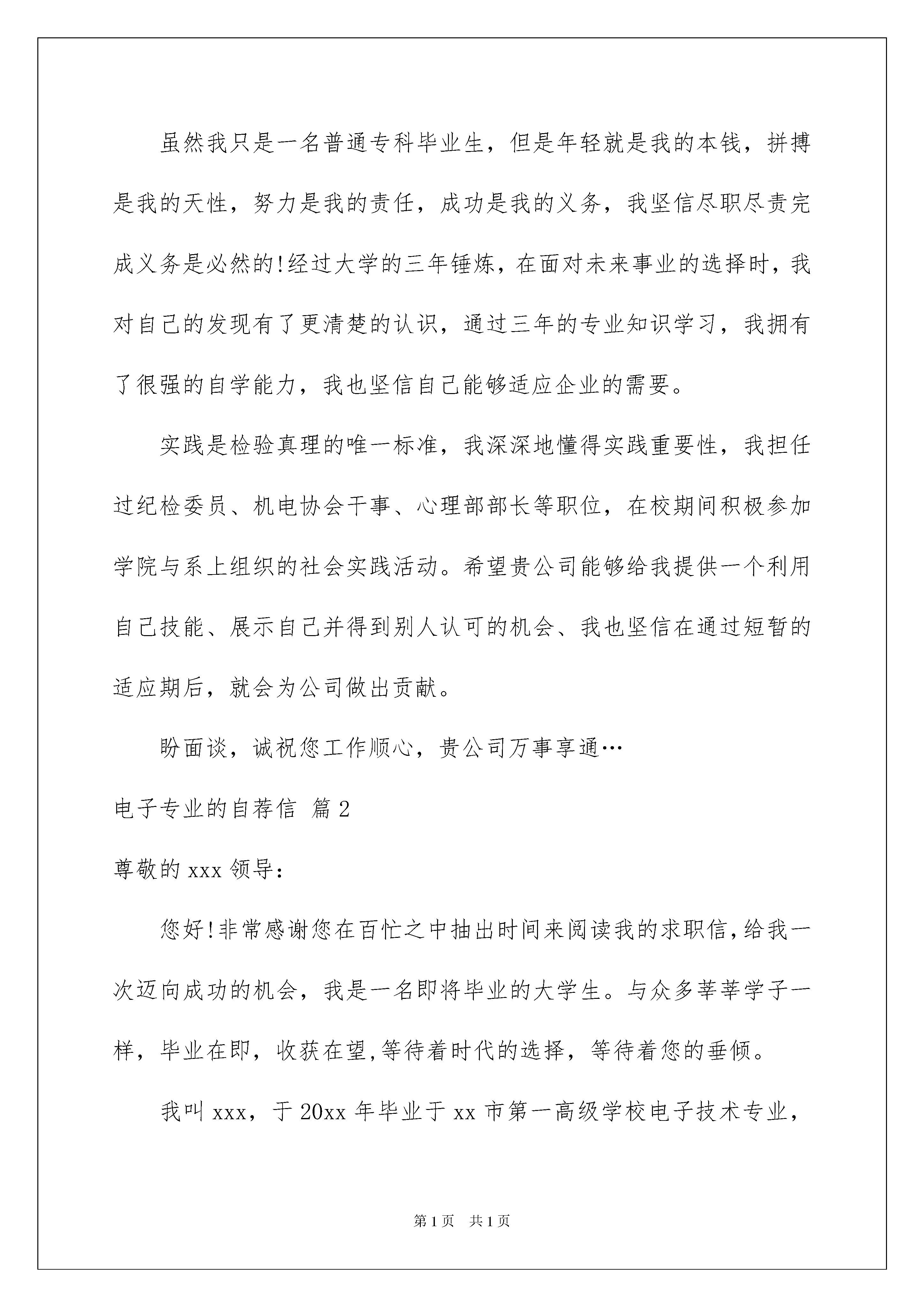 2022电子专业的自荐信模板锦集八篇电子专业的自荐信在当今社会生活中,用到自荐信的地方越来越多,要注意自荐信在写作时具有一定的格式。相信大家又在为写自荐信犯愁了吧!下面是我整理的电子专业的自荐信9篇,希望对大家有所帮助。电子专业的自荐信篇1尊敬的贵公司领导:您好!感谢您能在百忙中抽时间来阅读我的自荐书。我叫,毕业于渝州电子工业学院,工业电子专业,普通的院校,普通的我却有一颗不普通的不甘平凡的心,我从小在农村长大,因为父亲是教师,所以大多数时间与父母一起在镇上的学校度过,在父母的耐心教导下,拥有非常乐观的心态,也能够吃苦耐劳,虽然来自农村,起点比别人低,但我从来不因此而感到自卑,因为我懂得笨鸟先飞的道理,也知道只要功夫深铁棒磨成针,所以我对未来充满信心,敢于面对一切的挑战。虽然我只是一名普通专科毕业生,但是年轻就是我的本钱,拼搏是我的天性,努力是我的责任,成功是我的义务,我坚信尽职尽责完成义务是必然的!经过大学的三年锤炼,在面对未来事业的选择时,我对自己的发现有了更清楚的认识,通过三年的专业知识学习,我拥有了很强的自学能力,我也坚信自己能够适应企业的需要。实践是检验真理的唯一标准,我深深地懂得实践重要性,我担任过纪检委员、机电协会干事、心理部部长等职位,在校期间积极参加学院与系上组织的社会实践活动。希望贵公司能够给我提供一个利用自己技能、展示自己并得到别人认可的机会、我也坚信在通过短暂的适应期后,就会为公司做出贡献。盼面谈,诚祝您工作顺心,贵公司万事享通…电子专业的自荐信篇2尊敬的xxx领导:您好!非常感谢您在百忙之中抽出时间来阅读我的求职信,给我一次迈向成功的机会,我是一名即将毕业的大学生。与众多莘莘学子一样,毕业在即,收获在望,等待着时代的选择,等待着您的垂倾。我叫xxx,于20xx年毕业于xx市第一高级学校电子技术专业,借此择业之际,我怀着一颗赤诚的心和对事业的执着追求,真诚地推荐自己。我最感兴趣的是电子技术和信息方面的位置,因为经过几年的电子专业课程的学习,学会了有关电子方面的功能和控制有关技术。在余下的时间里,学会了计算机知识,熟悉电脑操作系统,熟悉使用网络,能够快速在网上查找所需要的资料。我十分珍惜求学生涯的学习机会,三年里本着严谨求学的态度,认真学习了专业知识,掌握了专业技能,涉猎了丰富的相关课外知识。在校任期间能积极参加各项活动。假期勤工俭学培养动手能力和组织能力,具有丰富的社会阅历,为今后开展各项工作打下坚实的基础。在学好专业知识的同时,充分地利用课余时间学习写作、新闻传播、经济等专业知识,掌握基本采编、新闻报道、发行,了解了市场运做的基本模式和规律,努力培养自己成为一个复合型人才,为适应激烈的社会竞争增加了砝码。最后祝贵公司业绩蒸蒸日上。电子专业的自荐信篇3尊敬的领导:您好!首先感谢您在百忙中能够阅读我的自荐信,给我打开了一扇希望之门。我叫xx,是一名来自xx农业大学经济与管理学院电子商务专业的一名大三学生,虽然现在我还不必面临找工作的困境,但由于对工作和实践的向往,所以推荐自己。我是一个严于律己、个性率真、热情开朗、乐观向上、诚实守信、易于沟通的人,喜欢挑战自我,不断提升完善自我。做经过两年多的学习,对所学专业有了一个系统的认识,在学校期间对所学课程掌握比较扎实、学习成绩优异,连年获得奖学金并以优异的成绩通过英语四、六级。大学的学习不仅让我发散了思维,对自己有了新的定位也让我开拓了视野。在学校期间主要学习了市场营销、电子商务概论、企业管理、财务管理、国际贸易等课程,在学好这些课程的同时我也注重自己综合素质和能力的提高,涉猎一些专业之外和自己感兴趣的知识。深知人际关系也是衡量一个人的重要指标,所以平时很注意与同学之间的关系维护,并参加学校组织的活动,做人宽容、大度,不为小事计较,增强了集体主义责任感和荣誉感,懂得如何用真心与付出去获取别人的回报,我会用努力去换取我的空间,让公司来容纳我。我真诚地希望在毕业之时能够成为贵公司的一员,共同创造美好的未来。祝贵单位事业蒸蒸日上,热切盼望您的回音。此致敬礼自荐人:xxx年月日电子专业的自荐信篇4尊敬的领导:您好!感谢你在百忙之中抽空审阅我的材料,希望给我一个机会。我是江西制造学院(省机械职工大学)一名20xx年的毕业生,主修应用电子技术专业,我渴望能在贵公司找到一份合适的工作,为贵公司贡献一份力量,希望你给我加入贵公司的机会,我有信心有能力成为一名出色的员工,在紧张而充实的三年大学生活中,我所学课程有电路、数电、模电、单片机原理与应用、PLC编程软件、电视机原理、Protel软件、电子技术、自动控制原理与应用。物