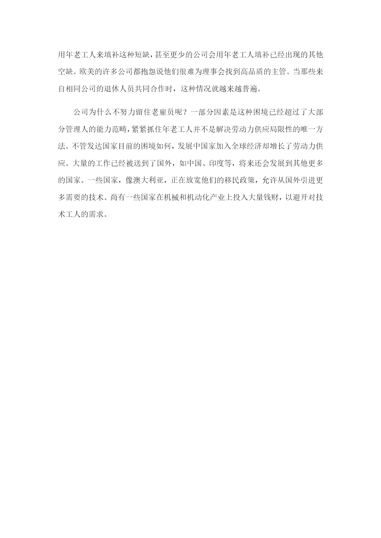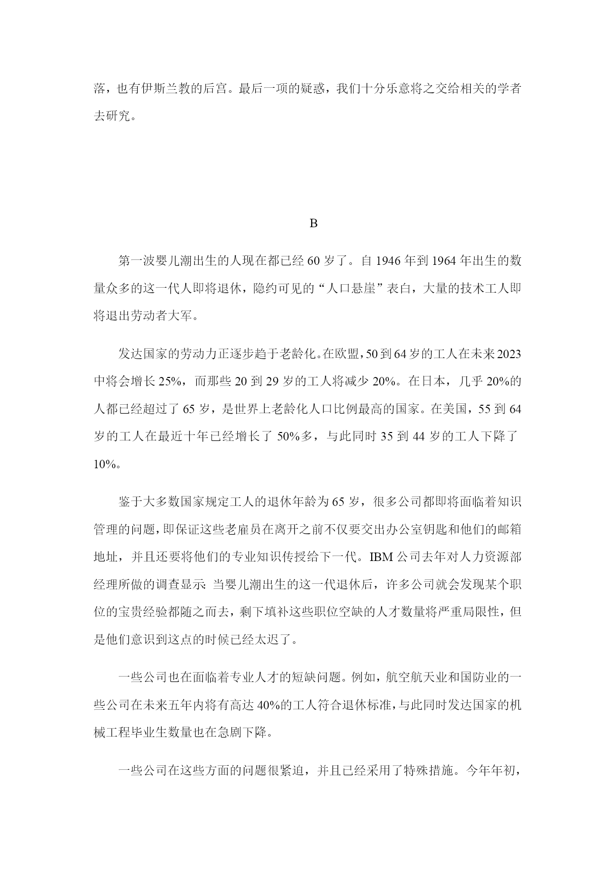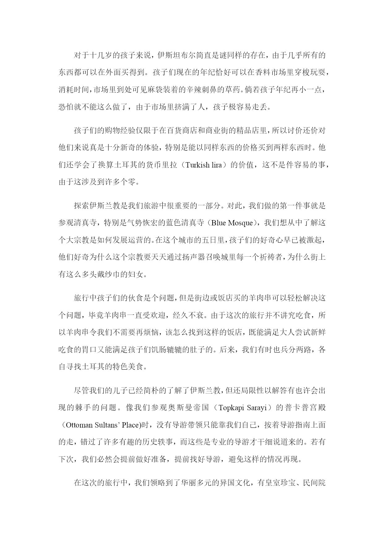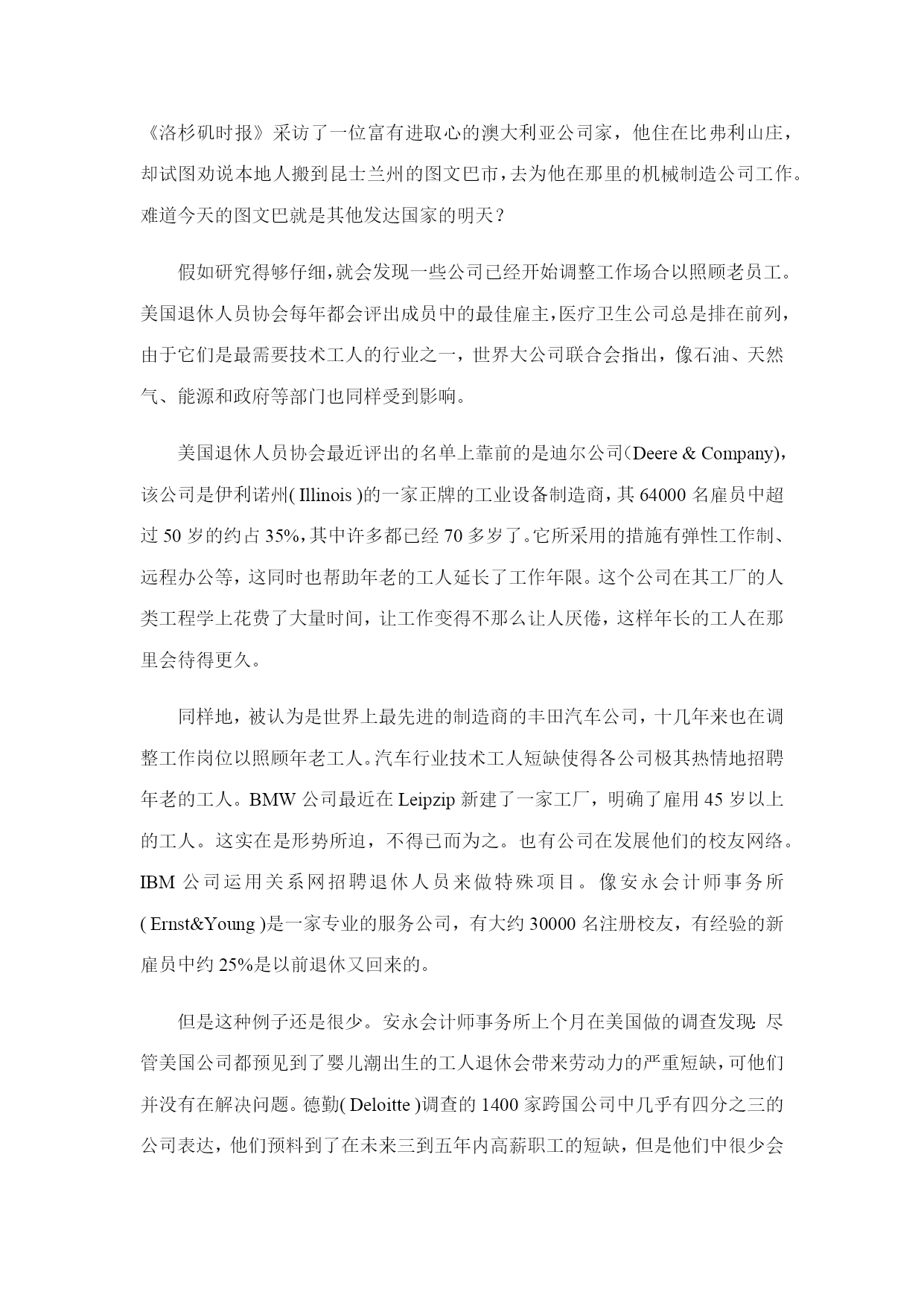 A 我们一直想要带孩子们,到他们从未去过的地方去拓展视野,而欧洲和美国已经去过就不做考虑了。所以几经思考,我们决定从我们居住的日内瓦去伊斯坦布尔(Istanbul),而从苏黎世(Zurich)到美国要飞两个小时。 我们将这次的旅行当做是异国情调之旅的一个开端,今年也许还会去新德里(NewDelhi)和曼谷(Bangkok)之类的地方。但现在我们11岁和13岁的孩子,需要迈出成长的第一步,离开父母萌荫的康庄大道和纯洁无暇的世界。 让我们意想不到的是朋友们的反映,他们恐吓我们这样做是把孩子们“置于险地”。他们说的危险,比如疾病、恐怖袭击和一些不可预知的潜在威胁等,大都模糊不清,没有依据,所以绝大部分都是错误的想法。离开家出门旅行前,为了了解新德里是个如何的城市和让孩子们选择他们感爱好的地方游玩,我们购买并详尽阅读了新德里的最佳导游指南。 朋友们的温馨提醒并没有改变我们的计划,尽管我们早就应当谨慎的了解一番美国政府提到的动荡地区。在新德里呆了六天,我们并没有看见很多像我们同样带着孩子来旅游的游客,但是我们发现旅游区域真的很安全,并且奇趣纷呈,甚至连我们挑剔的儿子也乐在其中。儿子曾再三规定旅途中绝不看教堂和博物馆。 为了去新德里而做接种没有必要,但考虑到我们停留期间也许要饮用本地的水,所以我们决定在那期间饮水和刷牙一律使用瓶装水。虽然这样做仿佛有点夸张,但好在我们一直都健健康康的。 我们还听从了一个朋友的意见,在重要的旅游景点聚集区域周边20分钟路程内预定了一个旅馆。这样一来,我们不仅有了晨练的机会,闲逛着穿过卡拉克桥(KarakoyBridge),还能领略到本地丰富多彩的生活原貌,像渔民、摊贩、擦鞋匠等。 对于十几岁的孩子来说,伊斯坦布尔简直是谜同样的存在,由于几乎所有的东西都可以在外面买得到。孩子们现在的年纪恰好可以在香料市场里穿梭玩耍,消耗时间,市场里到处可见麻袋装着的辛辣刺鼻的草药。倘若孩子年纪再小一点,恐怕就不能这么做了,由于市场里挤满了人,孩子极容易走丢。 孩子们的购物经验仅限于在百货商店和商业街的精品店里,所以讨价还价对他们来说真是十分新奇的体验,特别是能以同样东西的价格买到两样东西时。他们还学会了换算土耳其的货币里拉(Turkishlira)的价值,这不是件容易的事,由于这涉及到许多个零。 探索伊斯兰教是我们旅游中很重要的一部分。对此,我们做的第一件事就是参观清真寺,特别是气势恢宏的蓝色清真寺(BlueMosque),我们想从中了解这个大宗教是如何发展运营的。在这个城市的五日里,孩子们的好奇心早已被激起,他们好奇为什么这个宗教要天天通过扬声器召唤城里每一个祈祷者,为什么街上有这么多头戴纱巾的妇女。 旅行中孩子们的伙食是个问题,但是街边或饭店买的羊肉串可以轻松解决这个问题,毕竟羊肉串一直受欢迎,经久不衰。由于这次的旅行并不讲究吃食,所以羊肉串令我们不需要再烦恼,该怎么找到这样的饭店,既能满足大人尝试新鲜吃食的胃口又能满足孩子们饥肠辘辘的肚子的。后来,我们有时也兵分两路,各自寻找土耳其的特色美食。 尽管我们的儿子已经简朴的了解了伊斯兰教,但还局限性以解答有也许会出现的棘手的问题。像我们参观奥斯曼帝国(TopkapiSarayi)的普卡普宫殿(OttomanSultans’Place)时,没有导游带领只能靠我们自己,按着导游指南上面的走,错过了许多有趣的历史轶事,而这些是专业的导游才干细说道来的。若有下次,我们必然会提前做好准备,提前找好导游,避免这样的情况再现。 在这次的旅行中,我们领略到了华丽多元的异国文化,有皇室珍宝、民间院落,也有伊斯兰教的后宫。最后一项的疑惑,我们十分乐意将之交给相关的学者去研究。 B 第一波婴儿潮出生的人现在都已经60岁了。自1946年到1964年出生的数量众多的这一代人即将退休,隐约可见的“人口悬崖”表白,大量的技术工人即将退出劳动者大军。 发达国家的劳动力正逐步趋于老龄化。在欧盟,50到64岁的工人在未来2023中将会增长25%,而那些20到29岁的工人将减少20%。在日本,几乎20%的人都已经超过了65岁,是世界上老龄化人口比例最高的国家。在美国,55到64岁的工人在最近十年已经增长了50%多,与此同时35到44岁的工人下降了10%。 鉴于大多数国家规定工人的退休年龄为65岁,很多公司都即将面临着知识管理的问题,即保证这些老雇员在离开之前不仅要交出办公室钥匙和他们的邮箱地址,并且还要将他们的专业知识传授给下一代。IBM公司去年对人力资源部经理所做的调查显示:当婴儿潮出生的这一代退休后,许多公司就会发现某个职位的宝贵经验都随之而去,剩下填补这些职位空缺的人才数量将严重局限性,但是他们意识到这点的时候已经太迟了。 一些公司也在面临着专业人才的短缺问题。例如,航空航天业和国防业的一些公司在未来