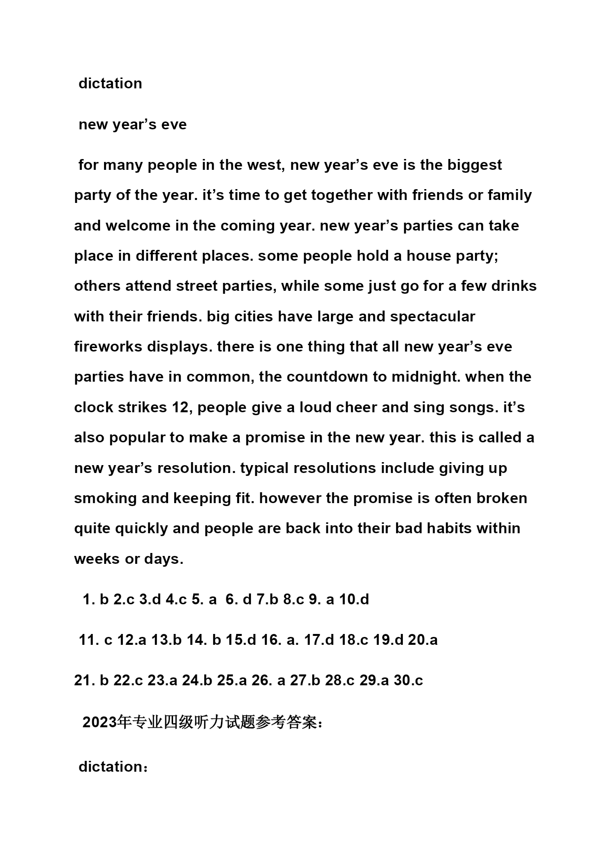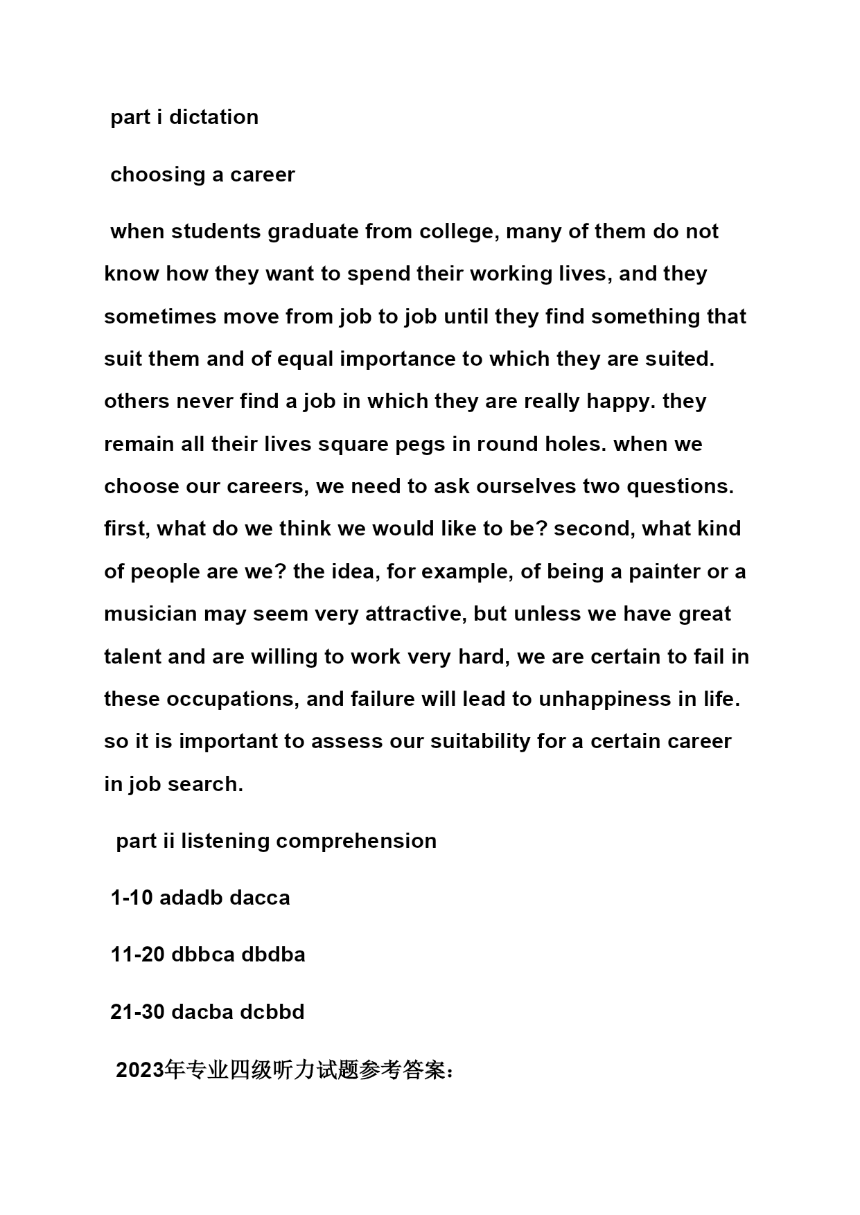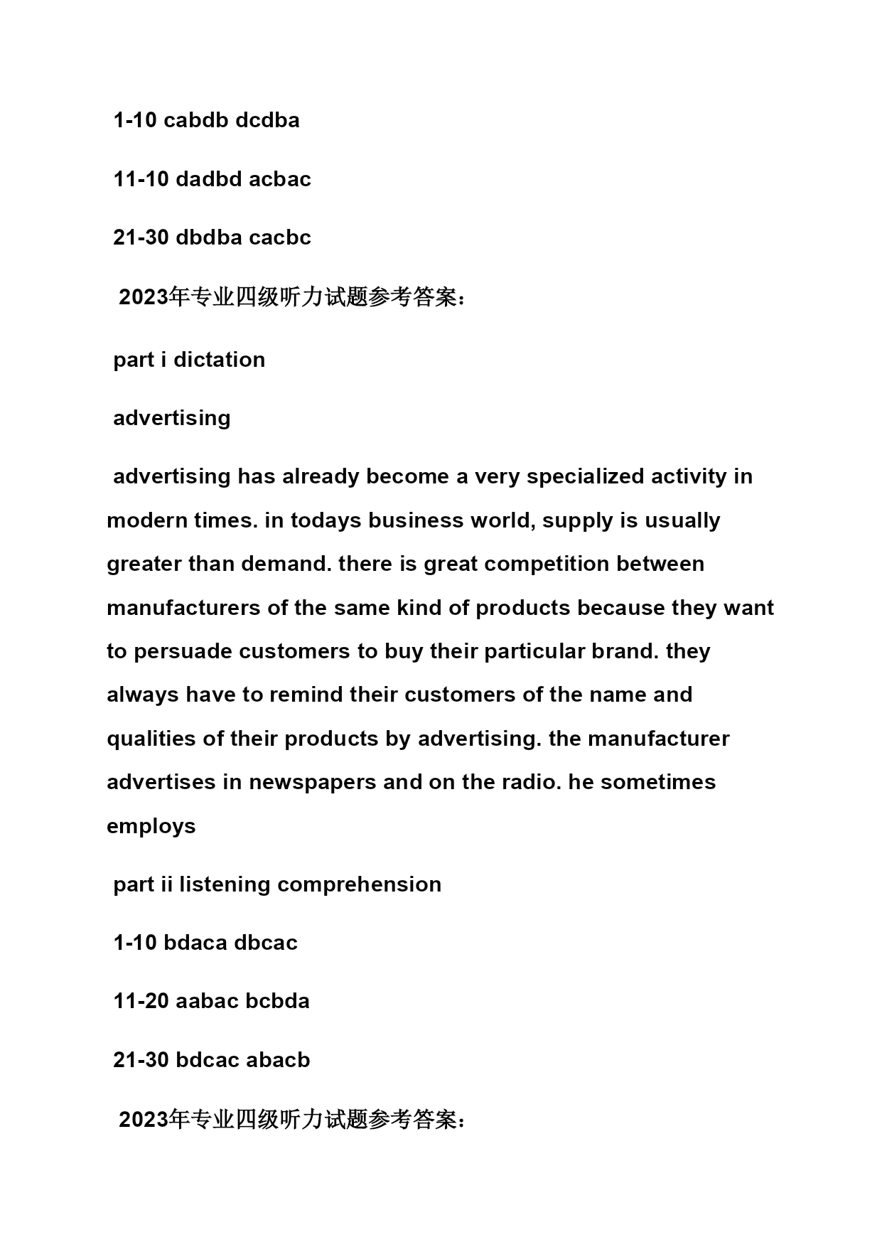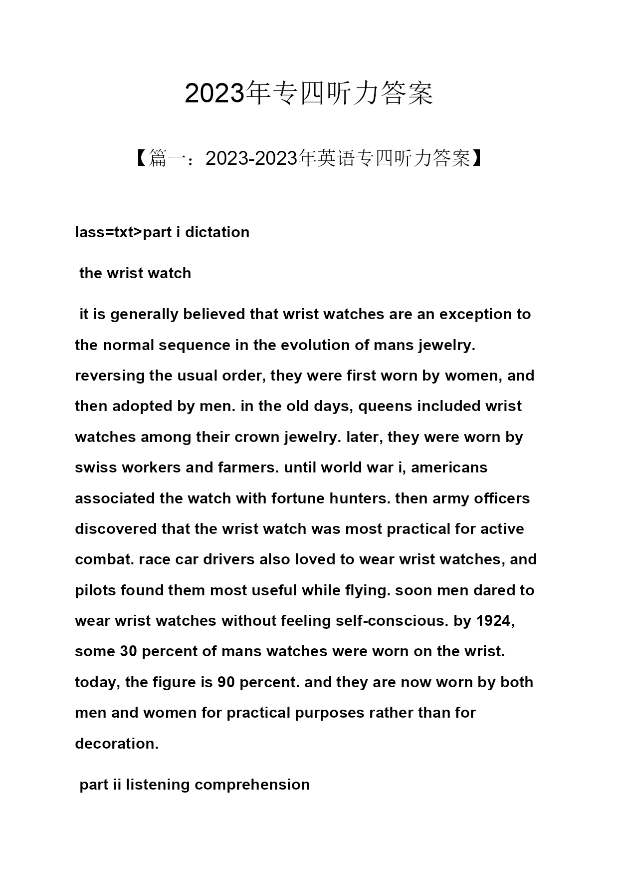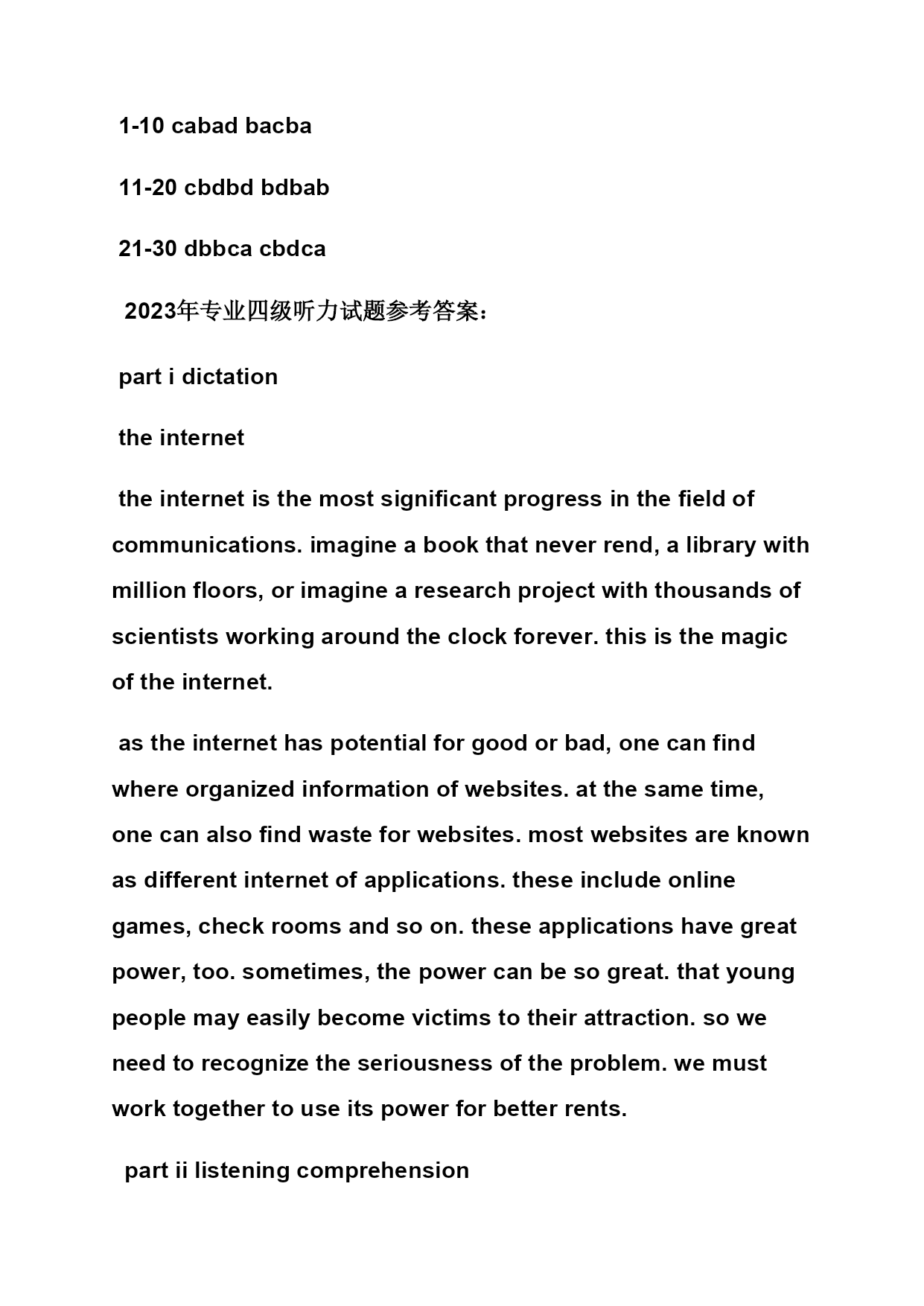 2023年专四听力答案 【篇一:2023-2023年英语专四听力答案】 lass=txt>partidictation thewristwatch itisgenerallybelievedthatwristwatchesareanexceptiontothenormalsequenceintheevolutionofmansjewelry.reversingtheusualorder,theywerefirstwornbywomen,andthenadoptedbymen.intheolddays,queensincludedwristwatchesamongtheircrownjewelry.later,theywerewornbyswissworkersandfarmers.untilworldwari,americansassociatedthewatchwithfortunehunters.thenarmyofficersdiscoveredthatthewristwatchwasmostpracticalforactivecombat.racecardriversalsolovedtowearwristwatches,andpilotsfoundthemmostusefulwhileflying.soonmendaredtowearwristwatcheswithoutfeelingself-conscious.by1924,some30percentofmanswatcheswerewornonthewrist.today,thefigureis90percent.andtheyarenowwornbybothmenandwomenforpracticalpurposesratherthanfordecoration. partiilisteningcomprehension 1-10cabadbacba 11-20cbdbdbdbab 21-30dbbcacbdca 2023年专业四级听力试题参考答案: partidictation theinternet theinternetisthemostsignificantprogressinthefieldofcommunications.imagineabookthatneverrend,alibrarywithmillionfloors,orimaginearesearchprojectwiththousandsofscientistsworkingaroundtheclockforever.thisisthemagicoftheinternet. astheinternethaspotentialforgoodorbad,onecanfindwhereorganizedinformationofwebsites.atthesametime,onecanalsofindwasteforwebsites.mostwebsitesareknownasdifferentinternetofapplications.theseincludeonlinegames,checkroomsandsoon.theseapplicationshavegreatpower,too.sometimes,thepowercanbesogreat.thatyoungpeoplemayeasilybecomevictimstotheirattraction.soweneedtorecognizetheseriousnessoftheproblem.wemustworktogethertouseitspowerforbetterrents. partiilisteningcomprehension 1-10cabdbdcdba 11-10dadbdacbac 21-30dbdbacacbc 2023年专业四级听力试题参考答案: partidictation advertising advertisinghasalreadybecomeaveryspecializedactivityinmoderntimes.intodaysbusinessworld,supplyisusuallygreaterthandemand.thereisgreatcompetitionbetweenmanufacturersofthesamekindofproductsbecausetheywanttopersuadecustomerstobuytheirparticularbrand.theyalwayshavetoremindtheircustomersofthenameandqualitiesofthei