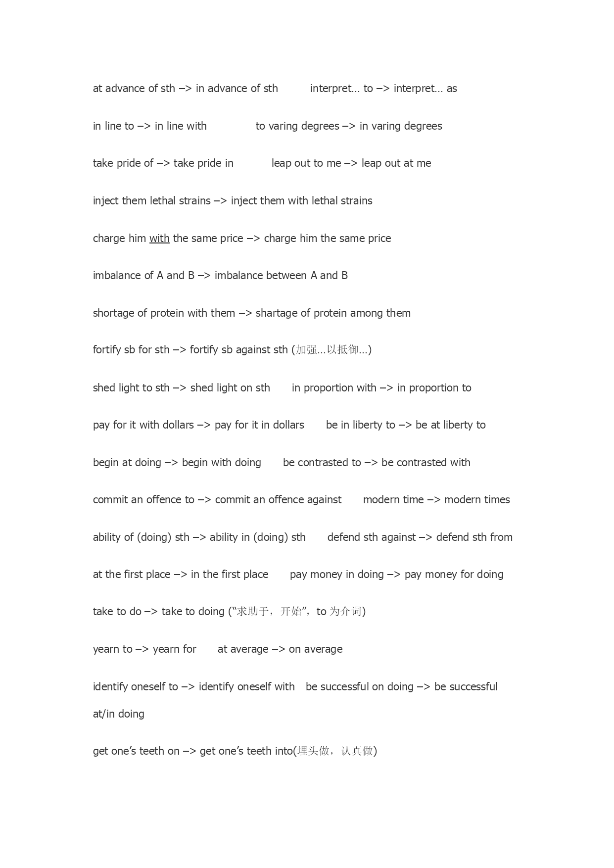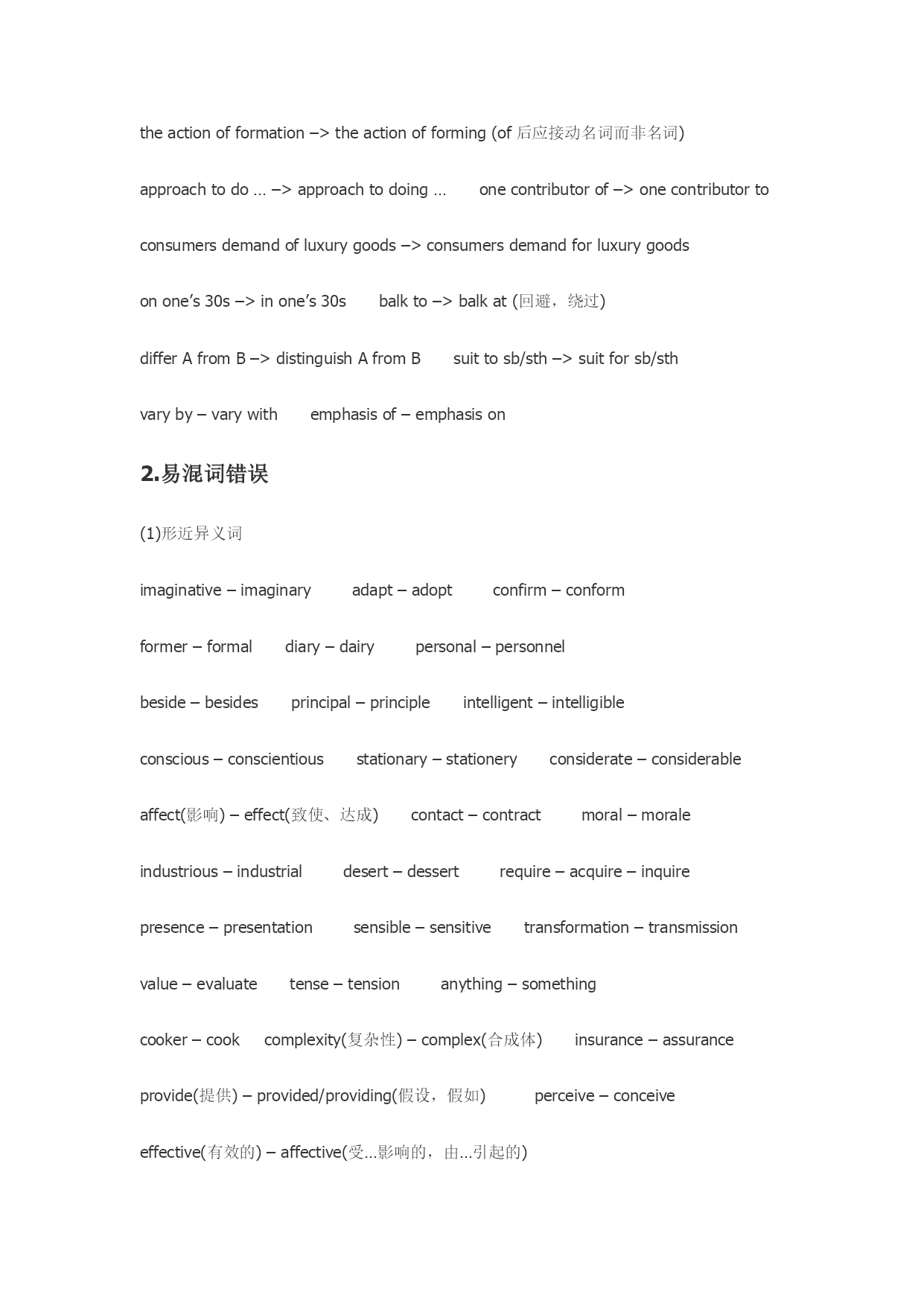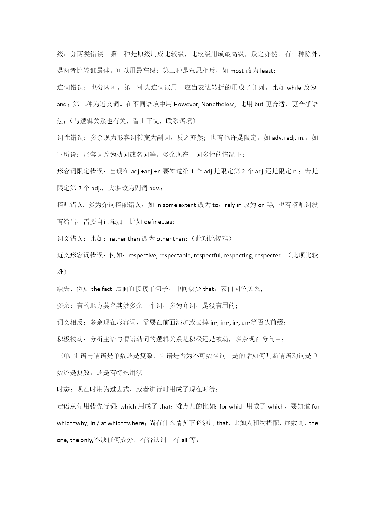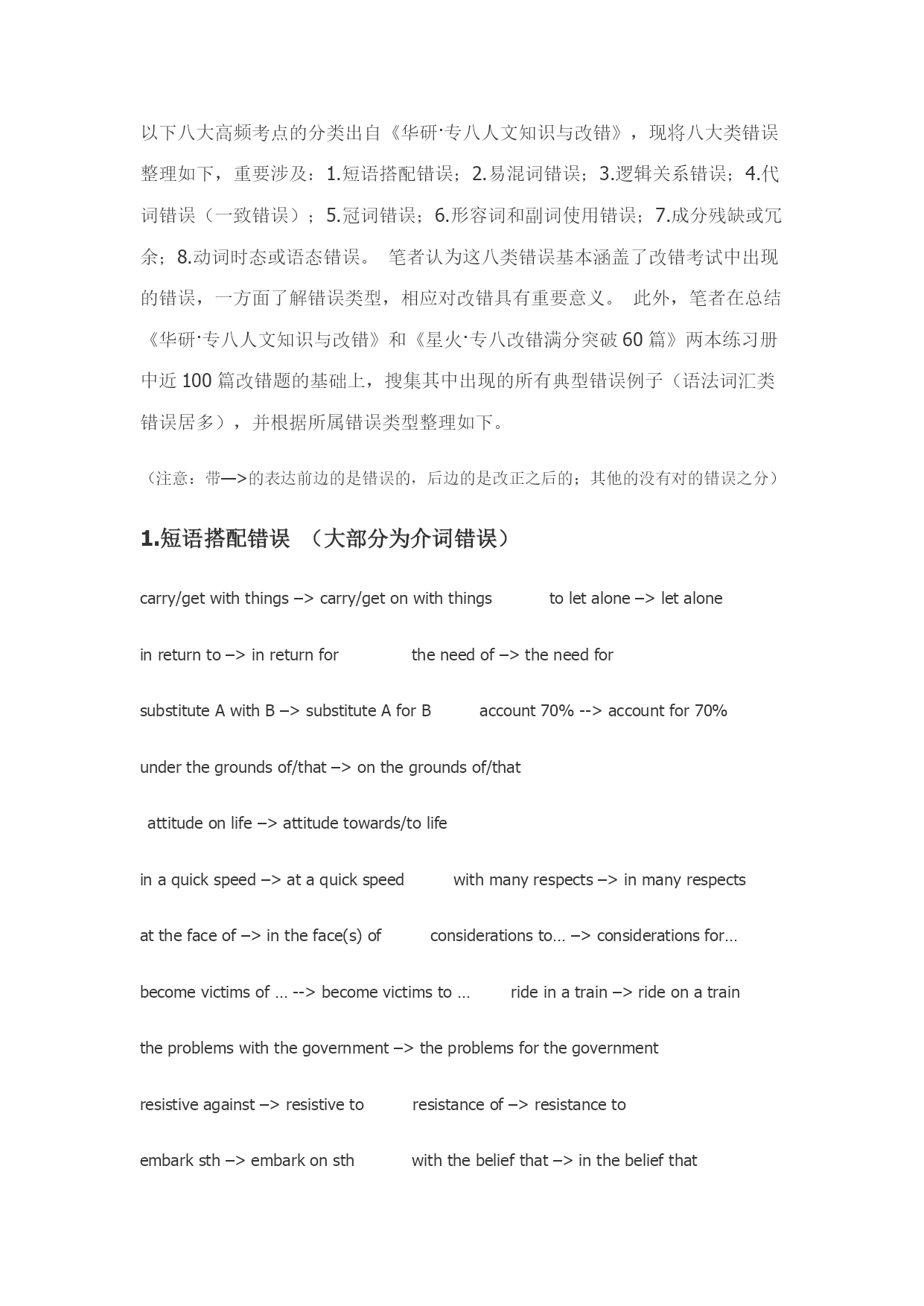 英语专八改错解题思绪1.宏观层面分析 (1)句子结构(理顺整个句子的结构,必要时检索上下文) (2)逻辑关系(关联词选择:并列、递进、因果、转折、假设、让步等) (3)时态和语态(完毕时和虚拟语气是考察重点)2.微观层面分析 (1)缺漏(介词、代词、引导词)(2)冗余(两个主语、同义反复) (3)误用(词性、分词、正反义、主被动、形容词和副词级别) (4)一致性(名词单复数、主谓一致、先行词)(5)词义与固定搭配3.注意事项 (1)即使按照语感不久找到了疑似错误,也要坚持读完全句再做判断,也许会有新的发现。过于相信第一感觉而带来的失分是划不来的。 (2)分两次改比较合理,由于毕竟只有少数人可以在第一遍看材料的时候就找出所有的错误,尽管这些错误不见得隐藏得多深。 (3)常考题型,高度警惕。冠词:the变a,a变the,补the补a,删a删the,每年都玩的把戏。 单复数:无非是his变their之类的,关键是细心。近义词:例如distinct和distinctive,move和movement,interest和interests… 反义词:特别看到dis,un,im,in,non之类的,更要琢磨一下。 关联词:几乎是保存节目,and,but,however,though,moreover,therefore… 非谓语动词:见了ing想ed,见了ed想ing,就是这么贱。 形容词比较级:多半是把原形改为比较级。考的频率也蛮高的。虚拟语气:注意一下还是比较容易看出来的,多长个心眼儿吧。 It:有时要加,有时要删,有时要变itself,总之多盯“它”几眼。动词词组:其实重要是介词的问题,这个没办法临时抱佛脚,要靠积累. 改错:1、改错虽然为主观题,但错误类型相对集中,可分为以下几种情况:定冠词:a,an,the误用,甚至多余来;解决办法:分析定冠词的主语及上下文有无指代;级:分两类错误,第一种是原级用成比较级,比较级用成最高级,反之亦然。有一种除外,是两者比较谁最佳,可以用最高级;第二种是意思相反,如most改为least;连词错误:也分两种,第一种为连词误用,应当表达转折的用成了并列,比如while改为and;第二种为近义词。在不同语境中用However,Nonetheless,比用but更合适,更合乎语法;(与逻辑关系也有关,看上下文,联系语境)词性错误:多余现为形容词转变为副词,反之亦然;也有也许是限定,如adv.+adj.+n.,如下所说;形容词改为动词或名词等,多余现在一词多性的情况下;形容词限定错误:出现在adj.+adj.+n.要知道第1个adj.是限定第2个adj.还是限定n.;若是限定第2个adj.,大多改为副词adv.;搭配错误:多为介词搭配错误,如insomeextent改为to,relyin改为on等;也有搭配词没有给出,需要自己添加,比如define...as;词义错误:比如:ratherthan改为otherthan;(此项比较难)近义形容词错误:例如:respective,respectable,respectful,respecting,respected;(此项比较难)缺失:例如thefact后面直接接了句子,中间缺少that,表白同位关系;多余:有的地方莫名其妙多余一个词,多为介词,是没有用的;词义相反:多余现在形容词,需要在前面添加或去掉in-,im-,ir-,un-等否认前缀;积极被动:分析主语与谓语动词的逻辑关系是积极还是被动,多余现在分句中;三单:主语与谓语是单数还是复数,主语是否为不可数名词,是的话如何判断谓语动词是单数还是复数,还是有特殊用法;时态:现在时用为过去式,或者进行时用成了现在时等;定语从句用错先行词:which用成了that;难点儿的比如:forwhich用成了which,要知道forwhich=why,in/atwhich=where;尚有什么情况下必须用that,比如人和物搭配,序数词,theone,theonly,不缺任何成分,有否认词,有all等; 以下八大高频考点的分类出自《华研·专八人文知识与改错》,现将八大类错误整理如下,重要涉及:1.短语搭配错误;2.易混词错误;3.逻辑关系错误;4.代词错误(一致错误);5.冠词错误;6.形容词和副词使用错误;7.成分残缺或冗余;8.动词时态或语态错误。笔者认为这八类错误基本涵盖了改错考试中出现的错误,一方面了解错误类型,相应对改错具有重要意义。此外,笔者在总结《华研·专八人文知识与改错》和《星火·专八改错满分突破60篇》两本练习册中近100篇改错题的基础上,搜集其中出现的所有典型错误例子(语法词汇类错误居多),并根据所属错误类型整理如下。 (注意:带—>的表达前边的是错误的,后边的是改正之后的;