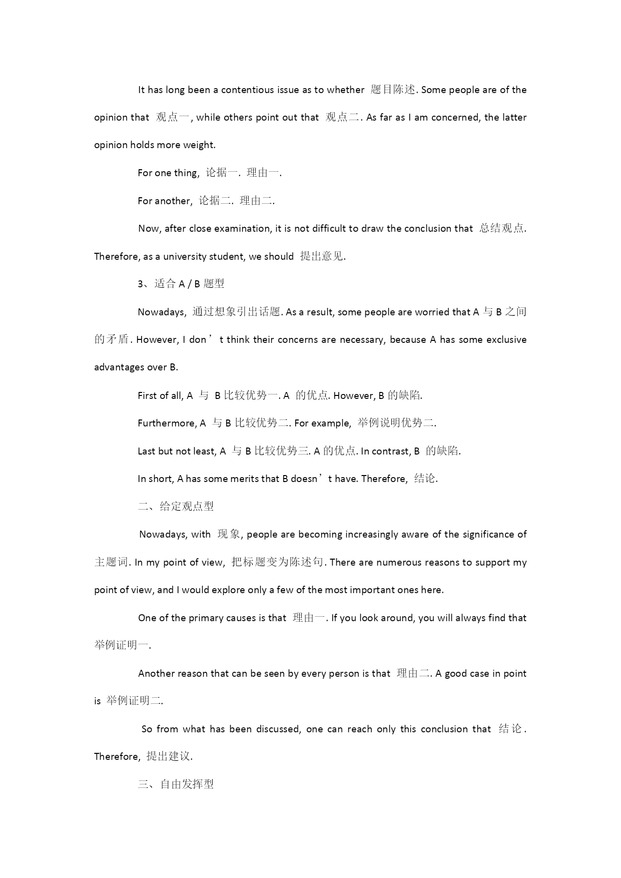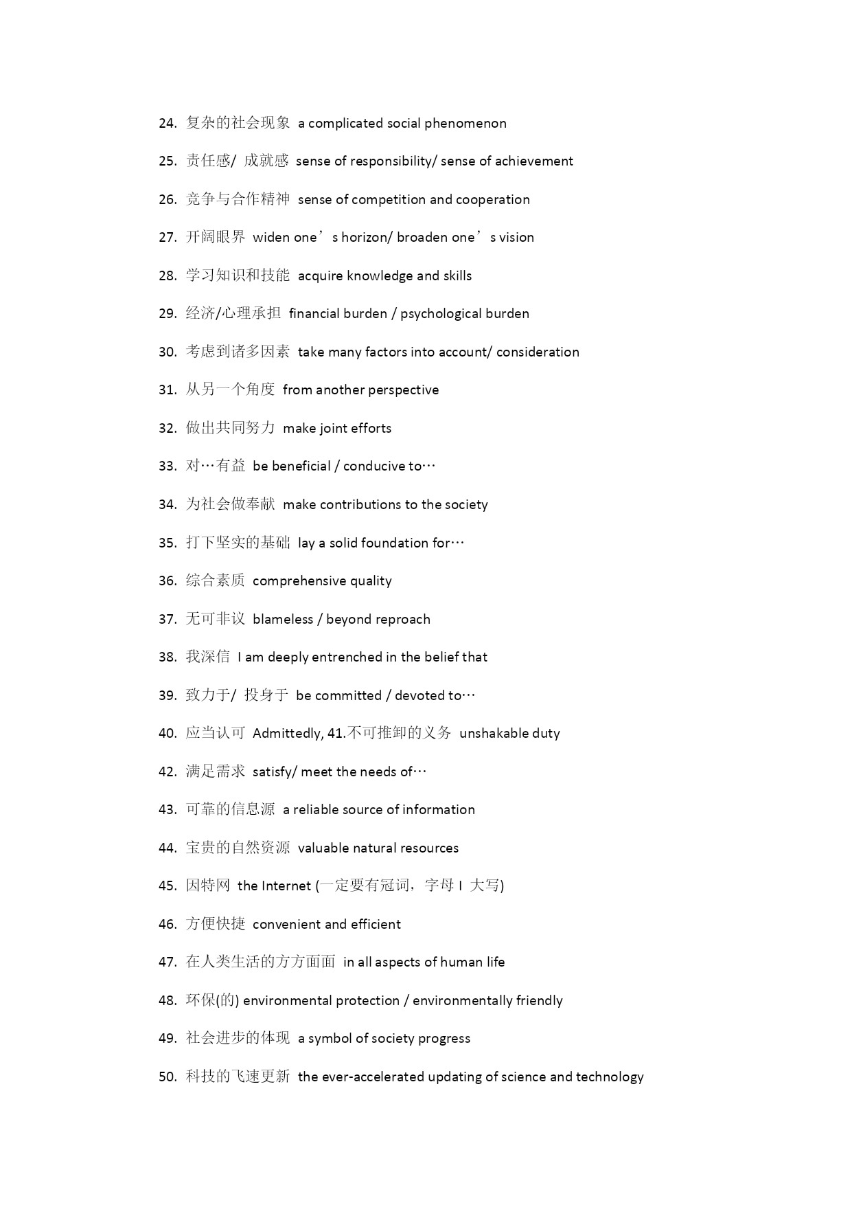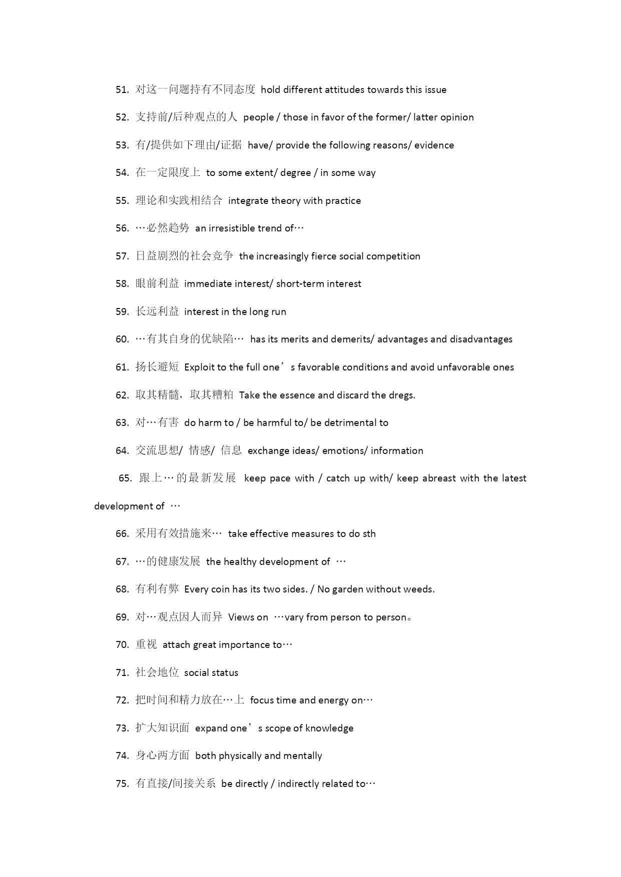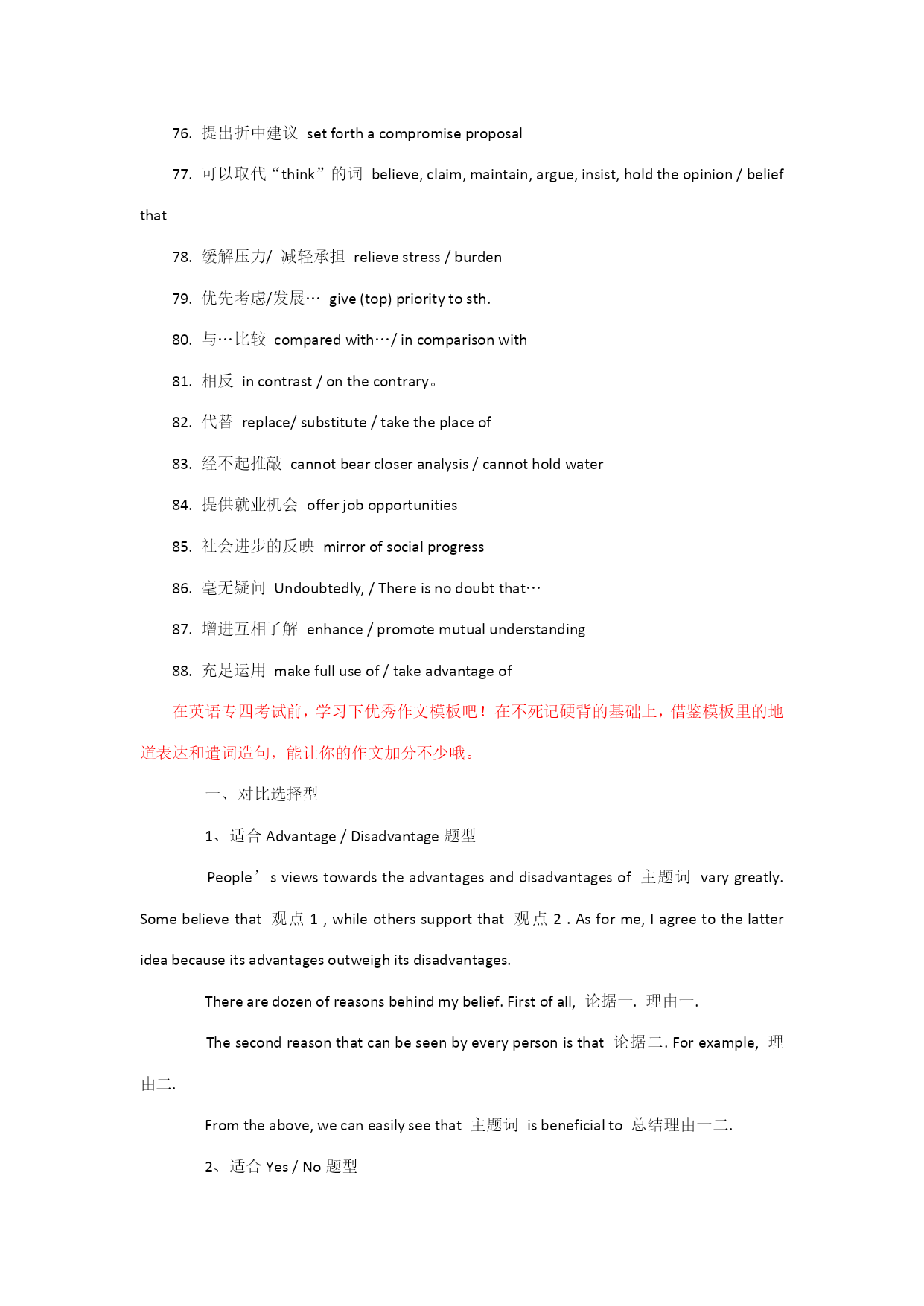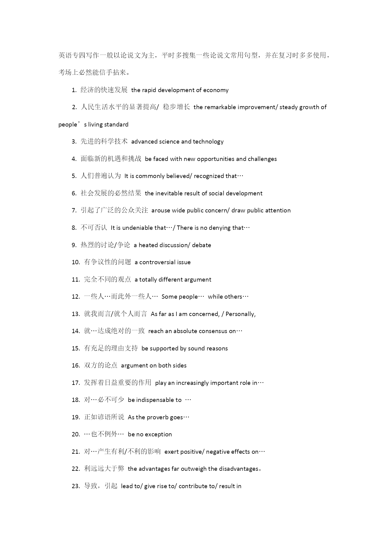 英语专四写作一般以论说文为主,平时多搜集一些论说文常用句型,并在复习时多多使用,考场上必然能信手拈来。 1.经济的快速发展therapiddevelopmentofeconomy 2.人民生活水平的显著提高/稳步增长theremarkableimprovement/steadygrowthofpeople’slivingstandard 3.先进的科学技术advancedscienceandtechnology 4.面临新的机遇和挑战befacedwithnewopportunitiesandchallenges 5.人们普遍认为Itiscommonlybelieved/recognizedthat… 6.社会发展的必然结果theinevitableresultofsocialdevelopment 7.引起了广泛的公众关注arousewidepublicconcern/drawpublicattention 8.不可否认Itisundeniablethat…/Thereisnodenyingthat… 9.热烈的讨论/争论aheateddiscussion/debate 10.有争议性的问题acontroversialissue 11.完全不同的观点atotallydifferentargument 12.一些人…而此外一些人…Somepeople…whileothers… 13.就我而言/就个人而言AsfarasIamconcerned,/Personally, 14.就…达成绝对的一致reachanabsoluteconsensuson… 15.有充足的理由支持besupportedbysoundreasons 16.双方的论点argumentonbothsides 17.发挥着日益重要的作用playanincreasinglyimportantrolein… 18.对…必不可少beindispensableto… 19.正如谚语所说Astheproverbgoes… 20.…也不例外…benoexception 21.对…产生有利/不利的影响exertpositive/negativeeffectson… 22.利远远大于弊theadvantagesfaroutweighthedisadvantages。 23.导致,引起leadto/giveriseto/contributeto/resultin 24.复杂的社会现象acomplicatedsocialphenomenon 25.责任感/成就感senseofresponsibility/senseofachievement 26.竞争与合作精神senseofcompetitionandcooperation 27.开阔眼界widenone’shorizon/broadenone’svision 28.学习知识和技能acquireknowledgeandskills 29.经济/心理承担financialburden/psychologicalburden 30.考虑到诸多因素takemanyfactorsintoaccount/consideration 31.从另一个角度fromanotherperspective 32.做出共同努力makejointefforts 33.对…有益bebeneficial/conduciveto… 34.为社会做奉献makecontributionstothesociety 35.打下坚实的基础layasolidfoundationfor… 36.综合素质comprehensivequality 37.无可非议blameless/beyondreproach 38.我深信Iamdeeplyentrenchedinthebeliefthat 39.致力于/投身于becommitted/devotedto… 40.应当认可Admittedly,41.不可推卸的义务unshakableduty 42.满足需求satisfy/meettheneedsof… 43.可靠的信息源areliablesourceofinformation 44.宝贵的自然资源valuablenaturalresources 45.因特网theInternet(一定要有冠词,字母I大写) 46.方便快捷convenientandefficient 47.在人类生活的方方面面inallaspectsofhumanlife 48.环保(的)environmentalprotection/environmentallyfriendly 49.社会进步的体现asymbolofsocietyprogress 50.科技的飞速更新theever-acceleratedupda