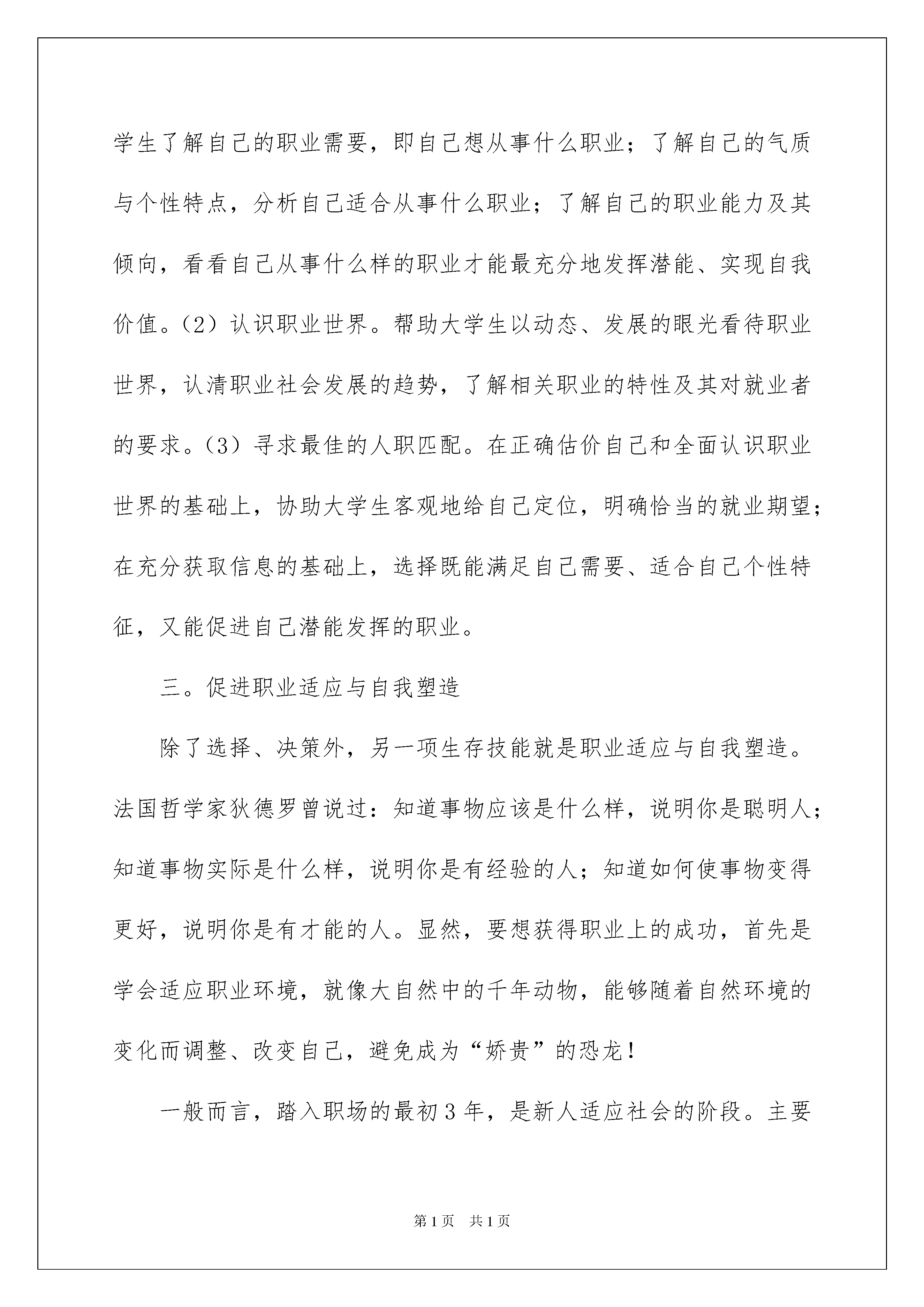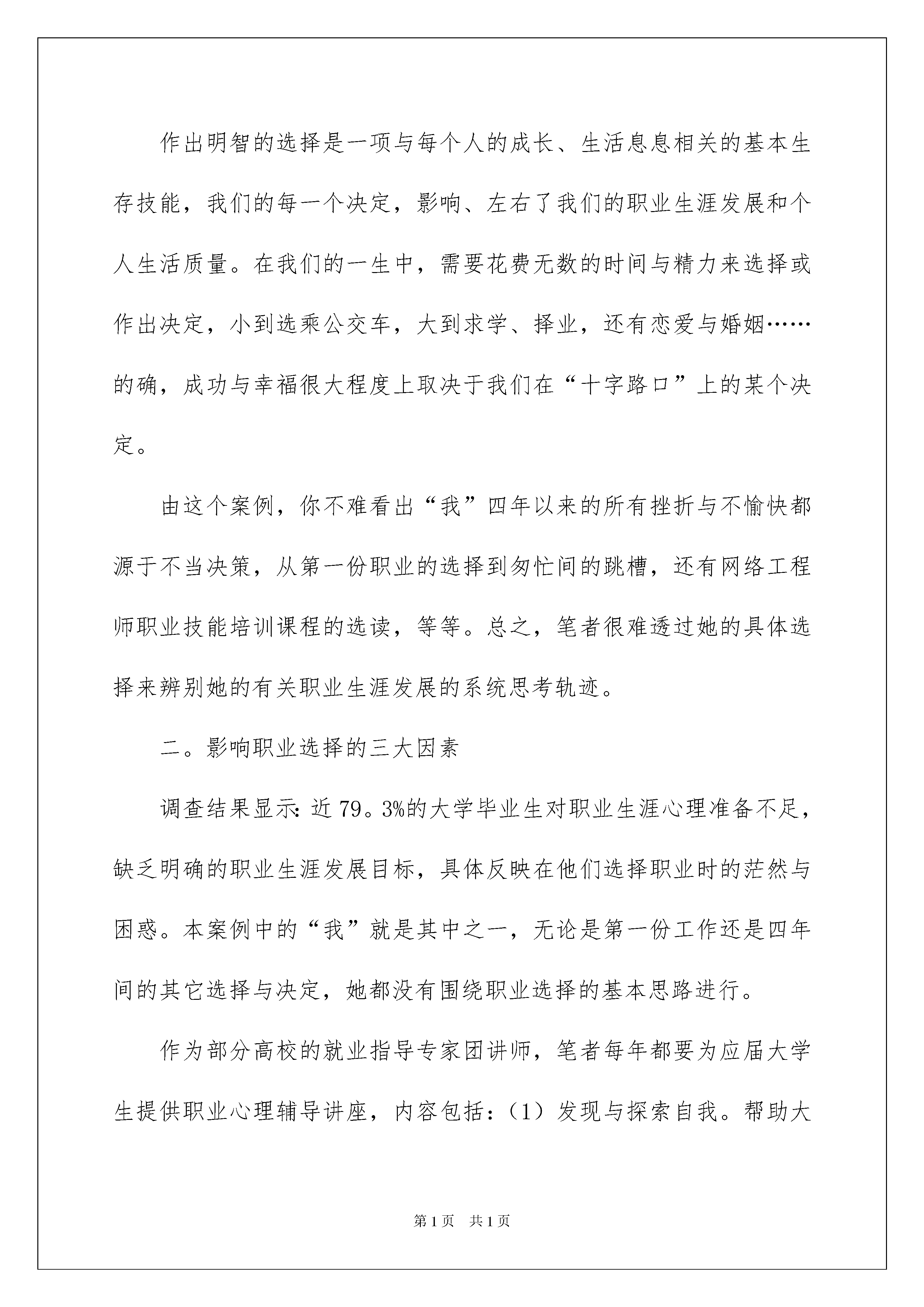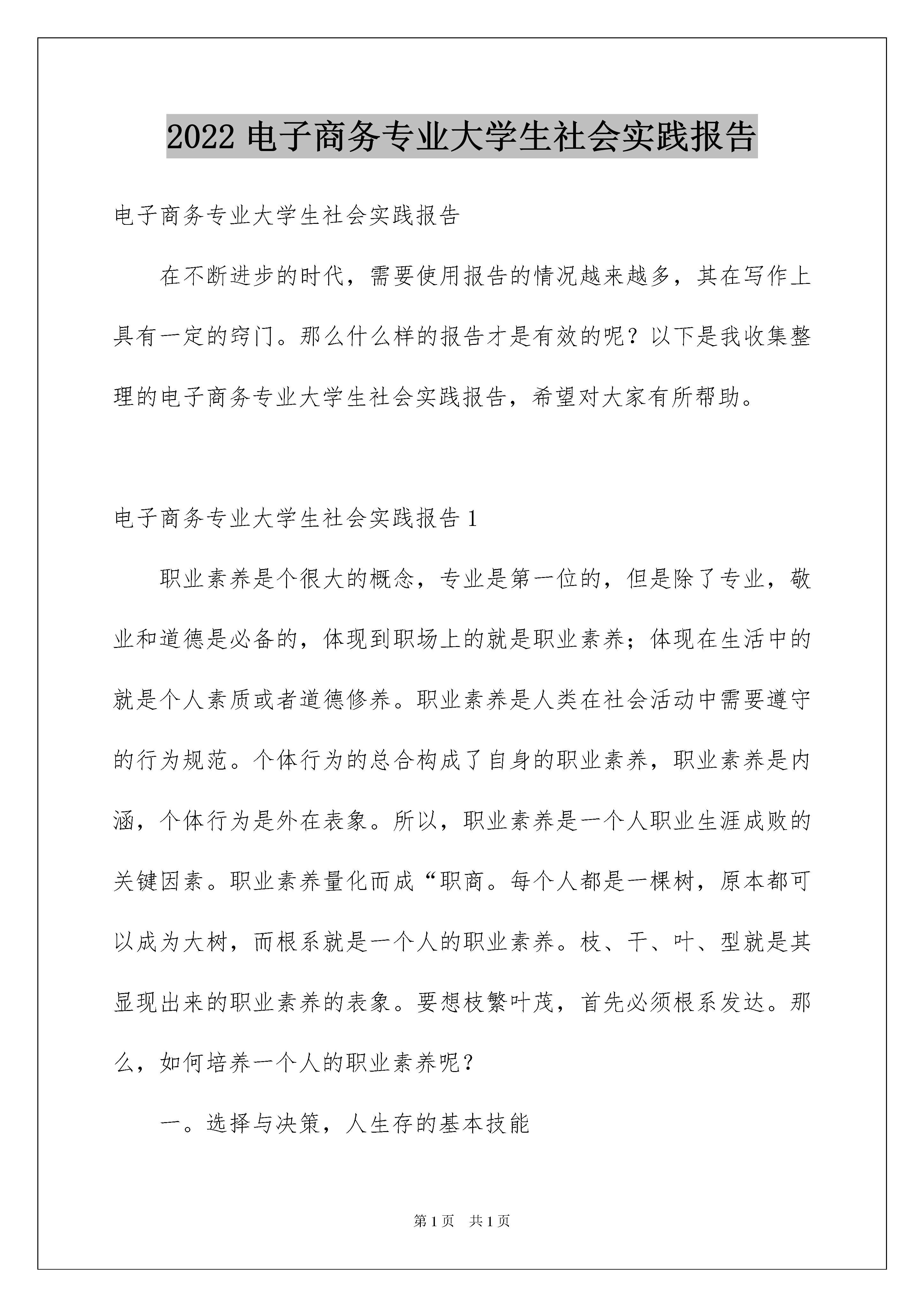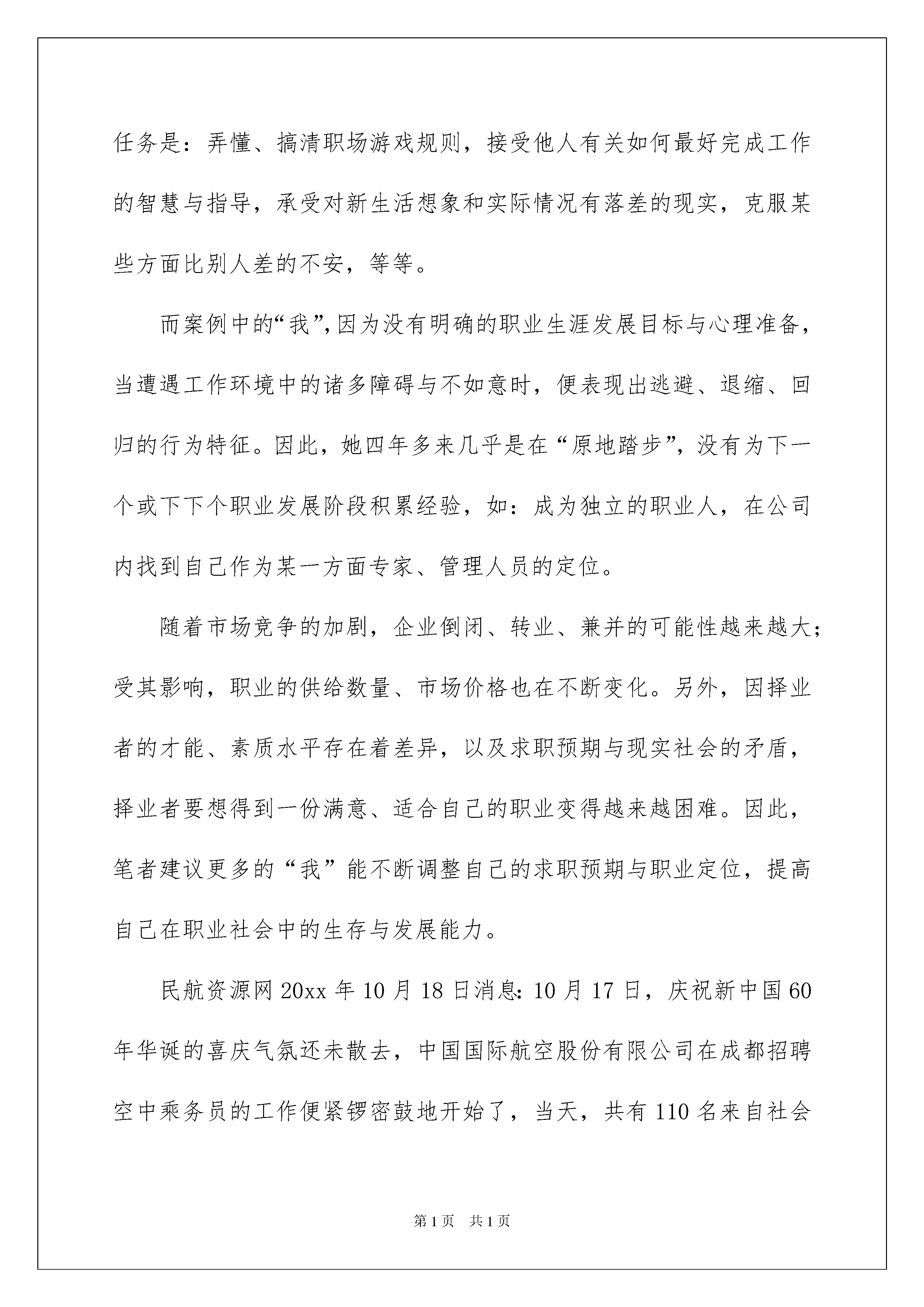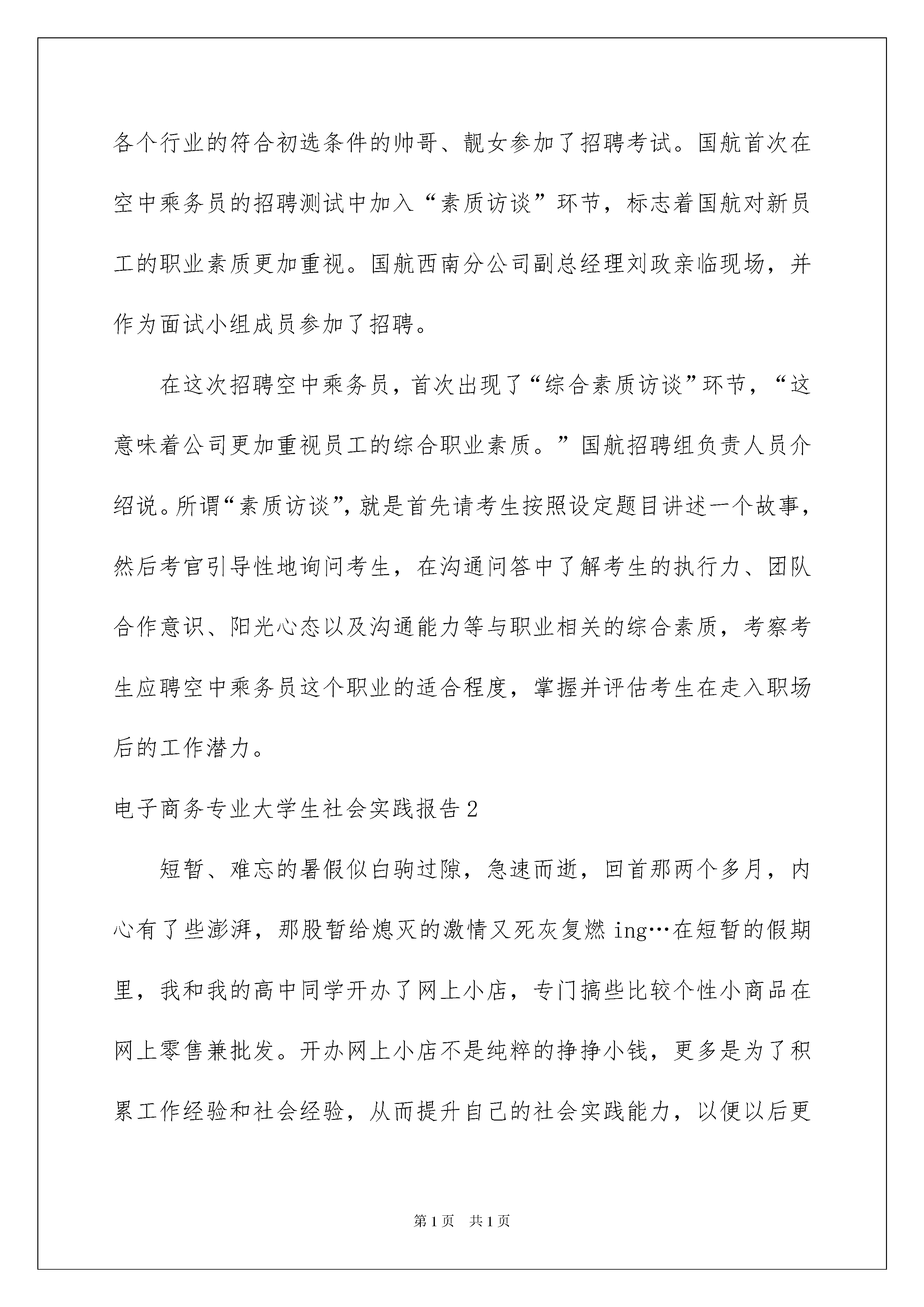 2022电子商务专业大学生社会实践报告电子商务专业大学生社会实践报告在不断进步的时代,需要使用报告的情况越来越多,其在写作上具有一定的窍门。那么什么样的报告才是有效的呢?以下是我收集整理的电子商务专业大学生社会实践报告,希望对大家有所帮助。电子商务专业大学生社会实践报告1职业素养是个很大的概念,专业是第一位的,但是除了专业,敬业和道德是必备的,体现到职场上的就是职业素养;体现在生活中的就是个人素质或者道德修养。职业素养是人类在社会活动中需要遵守的行为规范。个体行为的总合构成了自身的职业素养,职业素养是内涵,个体行为是外在表象。所以,职业素养是一个人职业生涯成败的关键因素。职业素养量化而成“职商。每个人都是一棵树,原本都可以成为大树,而根系就是一个人的职业素养。枝、干、叶、型就是其显现出来的职业素养的表象。要想枝繁叶茂,首先必须根系发达。那么,如何培养一个人的职业素养呢?一。选择与决策,人生存的基本技能作出明智的选择是一项与每个人的成长、生活息息相关的基本生存技能,我们的每一个决定,影响、左右了我们的职业生涯发展和个人生活质量。在我们的一生中,需要花费无数的时间与精力来选择或作出决定,小到选乘公交车,大到求学、择业,还有恋爱与婚姻……的确,成功与幸福很大程度上取决于我们在“十字路口”上的某个决定。由这个案例,你不难看出“我”四年以来的所有挫折与不愉快都源于不当决策,从第一份职业的选择到匆忙间的跳槽,还有网络工程师职业技能培训课程的选读,等等。总之,笔者很难透过她的具体选择来辨别她的有关职业生涯发展的系统思考轨迹。二。影响职业选择的三大因素调查结果显示:近79。3%的大学毕业生对职业生涯心理准备不足,缺乏明确的职业生涯发展目标,具体反映在他们选择职业时的茫然与困惑。本案例中的“我”就是其中之一,无论是第一份工作还是四年间的其它选择与决定,她都没有围绕职业选择的基本思路进行。作为部分高校的就业指导专家团讲师,笔者每年都要为应届大学生提供职业心理辅导讲座,内容包括:(1)发现与探索自我。帮助大学生了解自己的职业需要,即自己想从事什么职业;了解自己的气质与个性特点,分析自己适合从事什么职业;了解自己的职业能力及其倾向,看看自己从事什么样的职业才能最充分地发挥潜能、实现自我价值。(2)认识职业世界。帮助大学生以动态、发展的眼光看待职业世界,认清职业社会发展的趋势,了解相关职业的特性及其对就业者的要求。(3)寻求最佳的人职匹配。在正确估价自己和全面认识职业世界的基础上,协助大学生客观地给自己定位,明确恰当的就业期望;在充分获取信息的基础上,选择既能满足自己需要、适合自己个性特征,又能促进自己潜能发挥的职业。三。促进职业适应与自我塑造除了选择、决策外,另一项生存技能就是职业适应与自我塑造。法国哲学家狄德罗曾说过:知道事物应该是什么样,说明你是聪明人;知道事物实际是什么样,说明你是有经验的人;知道如何使事物变得更好,说明你是有才能的人。显然,要想获得职业上的成功,首先是学会适应职业环境,就像大自然中的千年动物,能够随着自然环境的变化而调整、改变自己,避免成为“娇贵”的恐龙!一般而言,踏入职场的最初3年,是新人适应社会的阶段。主要任务是:弄懂、搞清职场游戏规则,接受他人有关如何最好完成工作的智慧与指导,承受对新生活想象和实际情况有落差的现实,克服某些方面比别人差的不安,等等。而案例中的“我”,因为没有明确的职业生涯发展目标与心理准备,当遭遇工作环境中的诸多障碍与不如意时,便表现出逃避、退缩、回归的行为特征。因此,她四年多来几乎是在“原地踏步”,没有为下一个或下下个职业发展阶段积累经验,如:成为独立的职业人,在公司内找到自己作为某一方面专家、管理人员的定位。随着市场竞争的加剧,企业倒闭、转业、兼并的可能性越来越大;受其影响,职业的供给数量、市场价格也在不断变化。另外,因择业者的才能、素质水平存在着差异,以及求职预期与现实社会的矛盾,择业者要想得到一份满意、适合自己的职业变得越来越困难。因此,笔者建议更多的“我”能不断调整自己的求职预期与职业定位,提高自己在职业社会中的生存与发展能力。民航资源网20xx年10月18日消息:10月17日,庆祝新中国60年华诞的喜庆气氛还未散去,中国国际航空股份有限公司在成都招聘空中乘务员的工作便紧锣密鼓地开始了,当天,共有110名来自社会各个行业的符合初选条件的帅哥、靓女参加了招聘考试。国航首次在空中乘务员的招聘测试中加入“素质访谈”环节,标志着国航对新员工的职业素质更加重视。国航西南分公司副总经理刘政亲临现场,并作为面试小组成员参加了招聘。在这次招聘空中乘务员,