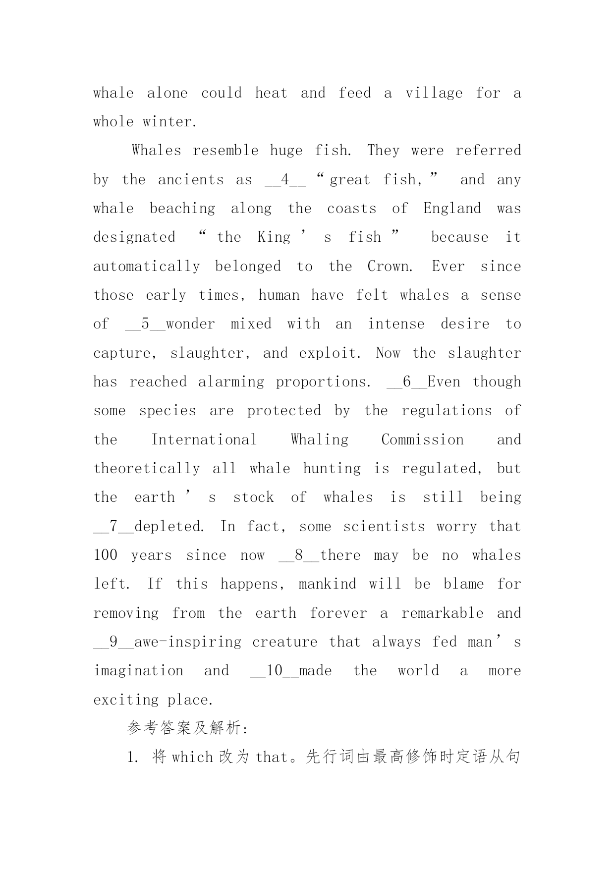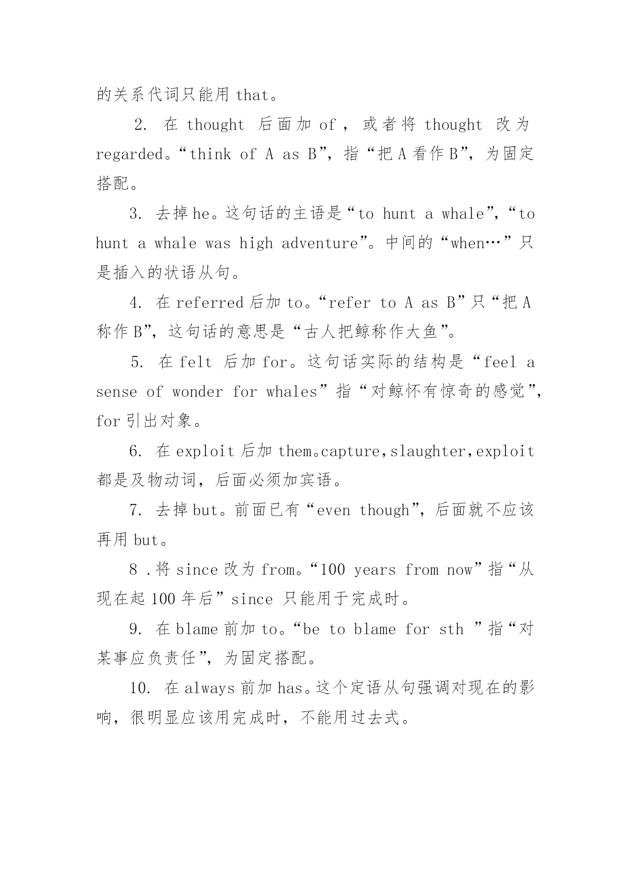 八级英语专业整理改错的练习题 八级英语专业整理改错的练习题改错题出现的错误经常包括:语法;词汇;语篇1.语法包括英语的时态,语态,倒装句,虚拟语气,主,谓,宾在数,格,人称上的一致。2.词汇方面,短文改错在用词上的错误主要集中在以下几个方面:名次单复数,可数名词和不可数名词的差异,形容词与副词,连词与介词的误用,同义词的`混淆等。3.语篇的改错旨在测试做题者在具体语境上下文中使用语法和词汇的能力。从逻辑的意义上看,句与句之间的关系可以分为顺序,并列,时间,空间,层递,对比,转折,解释,因果,过渡,推论等。最好的做法是先通读全文,结合上下文的逻辑关系回答问题。Thegreatwhalesareamongthemostfascinatingcreatureswhich__1__haveeverlivedontheearth,andoneofthem,thebluewhale,isthelargest.Peopleinancienttimesthoughtwhalesasfearsome__2__monstersoftheoceandepths.Sotohuntawhale,whenoneoccasionallyswamtowardshore,hewashighadventure.People__3__foundtheadventurewasrewarding,too,fortheoilandmeatfromonewhalealonecouldheatandfeedavillageforawholewinter.Whalesresemblehugefish.Theywerereferredbytheancientsas__4__“greatfish,”andanywhalebeachingalongthecoastsofEnglandwasdesignated“theKing’sfish”becauseitautomaticallybelongedtotheCrown.Eversincethoseearlytimes,humanhavefeltwhalesasenseof__5__wondermixedwithanintensedesiretocapture,slaughter,andexploit.Nowtheslaughterhasreachedalarmingproportions.__6__EventhoughsomespeciesareprotectedbytheregulationsoftheInternationalWhalingCommissionandtheoreticallyallwhalehuntingisregulated,buttheearth’sstockofwhalesisstillbeing__7__depleted.Infact,somescientistsworrythat100yearssincenow__8__theremaybenowhalesleft.Ifthishappens,mankindwillbeblameforremovingfromtheearthforeveraremarkableand__9__awe-inspiringcreaturethatalwaysfedman’simaginationand__10__madetheworldamoreexcitingplace.参考答案及解析:1.将which改为that。先行词由最高修饰时定语从句的关系代词只能用that。2.在thought后面加of,或者将thought改为regarded。“thinkofAasB”,指“把A看作B”,为固定搭配。3.去掉he。这句话的主语是“tohuntawhale”,“tohuntawhalewashighadventure”。中间的“when…”只是插入的状语从句。4.在referred后加to。“refertoAasB”只“把A称作B”,这句话的意思是“古人把鲸称作大鱼”。5.在felt后加for。这句话实际的结构是“feelasenseofwonderforwhales”指“对鲸怀有惊奇的感觉”,for引出对象。6.在exploit后加them。capture,slaughter,exploit都是及物动词,后面必须加宾语。7.去掉but。前面已有“eventhough”,后面就不应该再用but。8.将since改为from。“100yearsfromnow”指“从现在起100年后”since只能用于完成时。9.在blame前加to。“betoblameforsth”指“对某事应负责任”,为固定搭配。10.在always前加has。这个定语从句强调对现在的影响,很明显应该用完成时