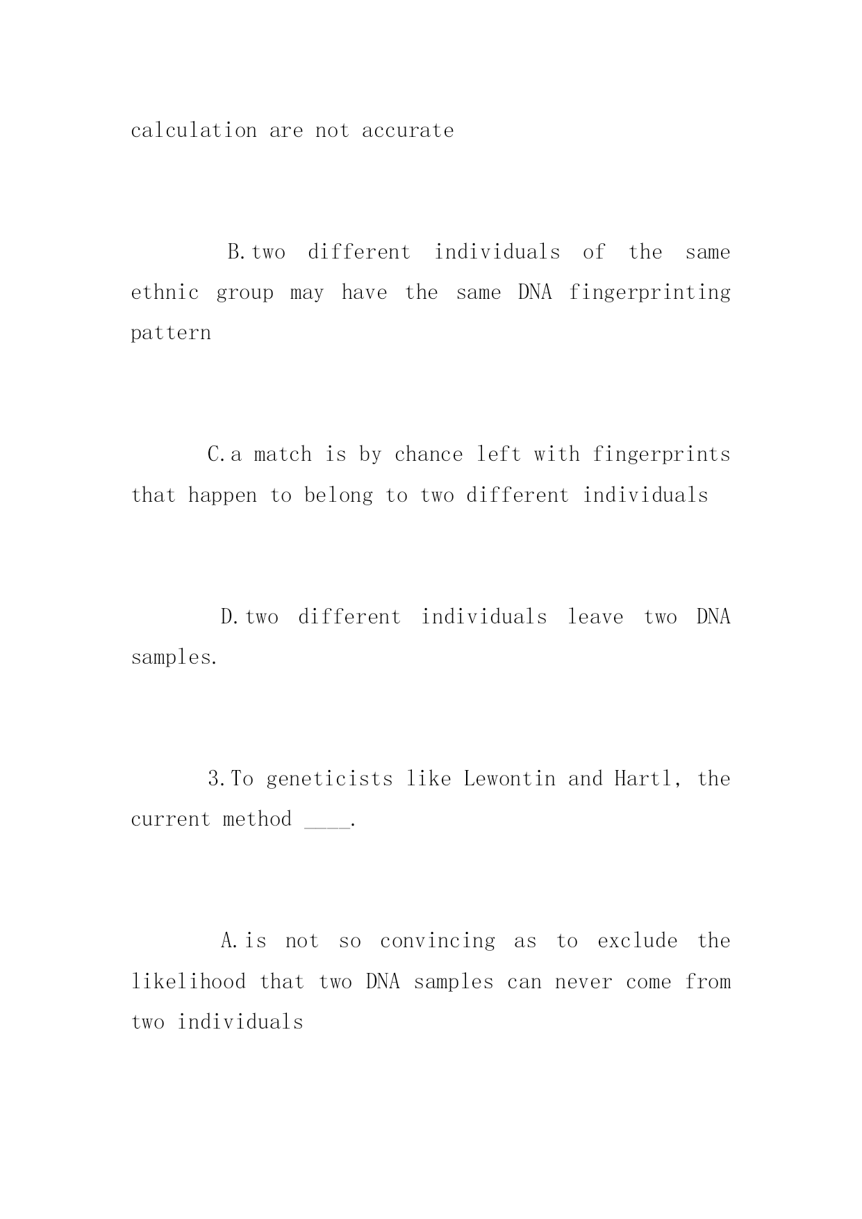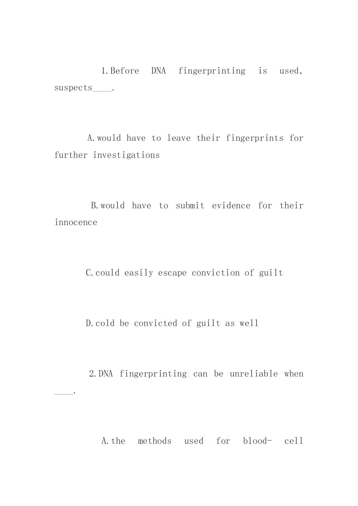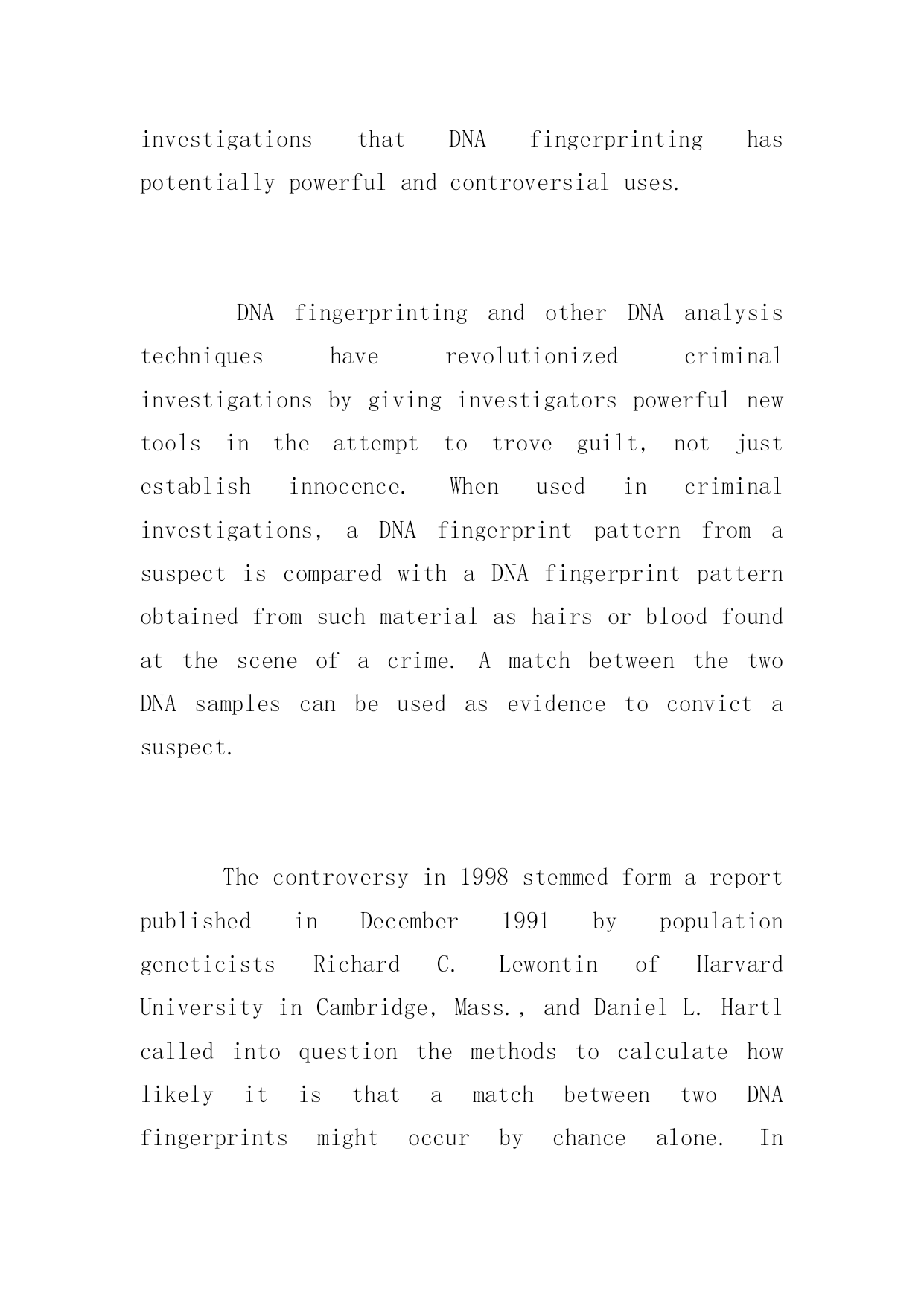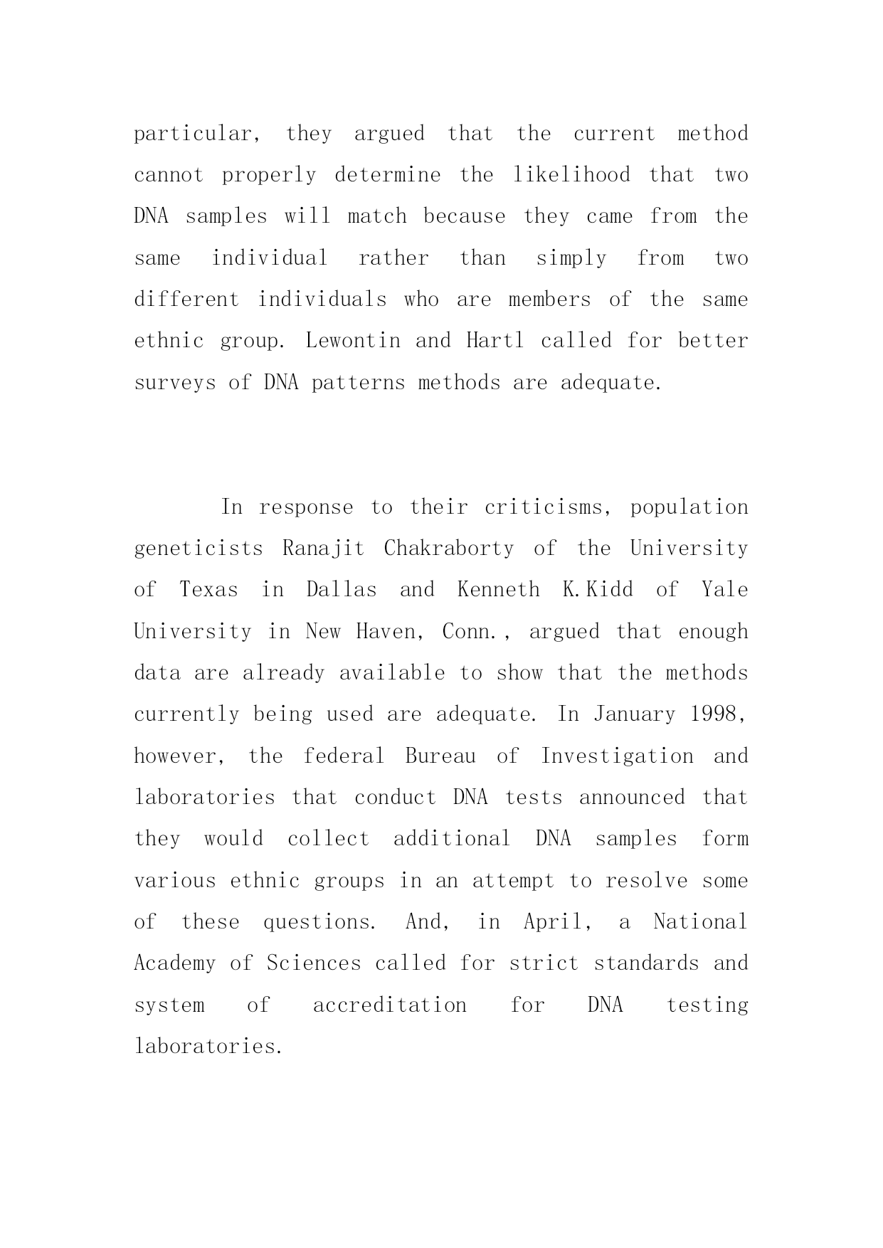 全国专四英语阅读考试特别训练题 全国专四英语阅读考试特别训练题 Thinktwicebeforeacting.以下是小编为大家搜索整理的全国专四英语阅读考试特别训练题,希望能给大家带来帮助!更多精彩内容请及时关注我们应届毕业生考试网! Acontroversyeruptedinthescientificcommunityinearly1998overtheuseofDNA(deoxyribonucleicacid)fingerprintingincriminalinvestigations.DNAfingerprintingwasintroducedin1987asamethodtoidentifyindividualsbasedonapatternseenintheirDNA,themoleculeofwhichgenesaremade.DNAispresentineverycellofthebodyexceptredbloodcells.DNAfingerprintinghasbeenusedsuccessfullyinvariousways,suchastodeterminepaternitywhereitisnotclearwhothefatherofaparticularchildis.However,itisintheareaofcriminalinvestigationsthatDNAfingerprintinghaspotentiallypowerfulandcontroversialuses. DNAfingerprintingandotherDNAanalysistechniqueshaverevolutionizedcriminalinvestigationsbygivinginvestigatorspowerfulnewtoolsintheattempttotroveguilt,notjustestablishinnocence.Whenusedincriminalinvestigations,aDNAfingerprintpatternfromasuspectiscomparedwithaDNAfingerprintpatternobtainedfromsuchmaterialashairsorbloodfoundatthesceneofacrime.AmatchbetweenthetwoDNAsamplescanbeusedasevidencetoconvictasuspect. Thecontroversyin1998stemmedformareportpublishedinDecember1991bypopulationgeneticistsRichardC.LewontinofHarvardUniversityinCambridge,Mass.,andDanielL.HartlcalledintoquestionthemethodstocalculatehowlikelyitisthatamatchbetweentwoDNAfingerprintsmightoccurbychancealone.Inparticular,theyarguedthatthecurrentmethodcannotproperlydeterminethelikelihoodthattwoDNAsampleswillmatchbecausetheycamefromthesameindividualratherthansimplyfromtwodifferentindividualswhoaremembersofthesameethnicgroup.LewontinandHartlcalledforbettersurveysofDNApatternsmethodsareadequate. Inresponsetotheircriticisms,populationgeneticistsRanajitChakrabortyoftheUniversityofTexasinDallasandKennethK.KiddofYaleUniversityinNewHaven,Conn.,arguedthatenoughdataarealreadyavailabletoshowthatthemethodscurrentlybeingusedareadequate.InJanuary1998,however,thefederalBureauofInvestigationandlaboratoriesthatconductDNAtestsannouncedthattheywouldcollectadditionalDNAsamples