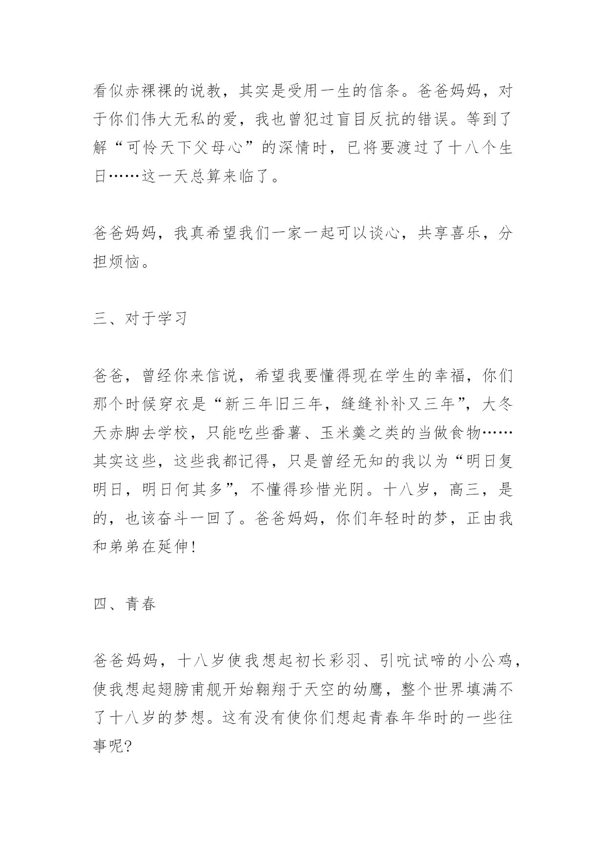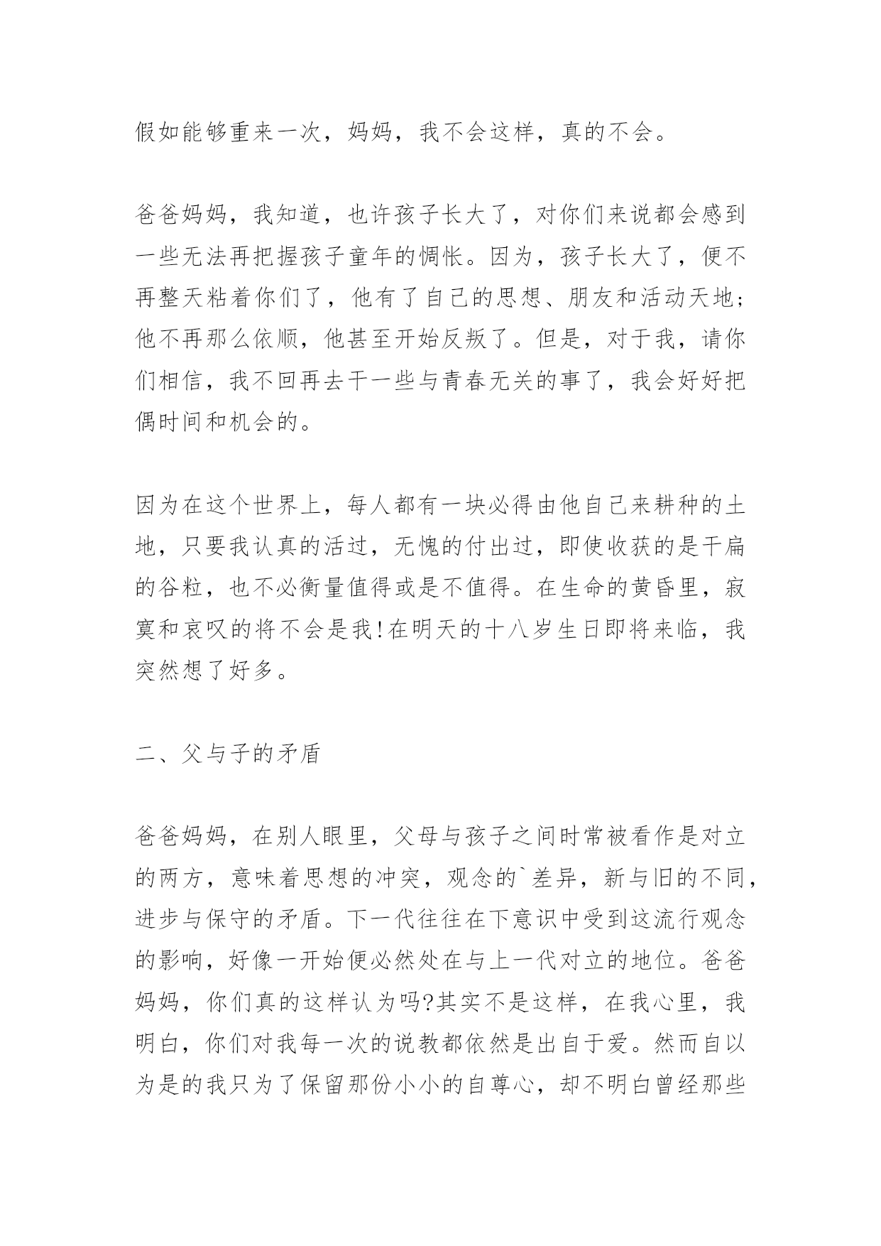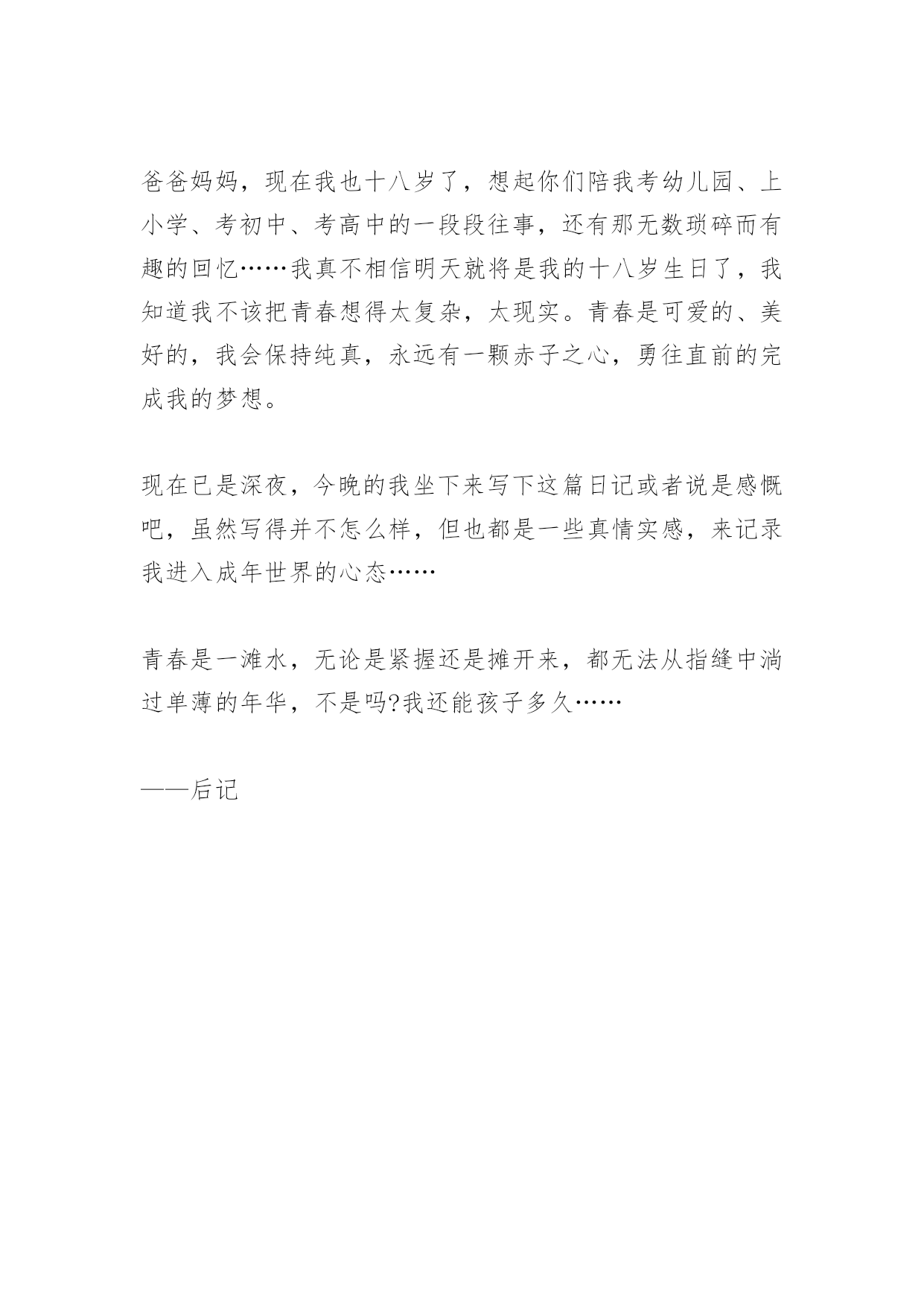 十八岁和其他作文 十八岁和其他作文明天是我十八岁的生日,我有一份长大了的欣慰,也有一份似水流年的迷惘……一、十八岁爸爸妈妈,还记得一次次的生日,都有你们陪伴在我身边,不经意间,已过去了十八个春秋。还记得,在澳门回归的那一夜,发高烧的我让你们一夜无法入眠;还记得曾经出去玩得很晚才回家,让你们无法安心……那种焦急忧虑,我都还历历在目。似乎,你们带我去白云山乐园玩耍,给我拍照,那种激动喜悦,还是昨天的事……怎么,昨天和今天,竟是十八年的光阴了!诗人说:“在东方似是晨曦初露,乍回身,已是大地明亮。”这正可引来描述我突然想起自己已是十八岁的心情。我,还能孩子多久。你们也许会笑我,我就是那么时常把自己看作想永远缠绕在你们身边的孩子呢!十八岁有许许多多令人沉湎眷恋的回忆。我知道十八年来我对你们有一些不经心的、任性的以及更深的伤害,而曾使你难过。我曾经因为一些小事,一次次顶嘴,而一次次伤了妈妈的心,假如时间能够重来一次,我真的不会将那样一些伤人的话说出来,而那也正是我年幼无知的自尊心所造成的。假如能够重来一次,妈妈,我不会这样,真的不会。爸爸妈妈,我知道,也许孩子长大了,对你们来说都会感到一些无法再把握孩子童年的惆怅。因为,孩子长大了,便不再整天粘着你们了,他有了自己的思想、朋友和活动天地;他不再那么依顺,他甚至开始反叛了。但是,对于我,请你们相信,我不回再去干一些与青春无关的事了,我会好好把偶时间和机会的。因为在这个世界上,每人都有一块必得由他自己来耕种的土地,只要我认真的活过,无愧的付出过,即使收获的是干扁的谷粒,也不必衡量值得或是不值得。在生命的黄昏里,寂寞和哀叹的将不会是我!在明天的十八岁生日即将来临,我突然想了好多。二、父与子的矛盾爸爸妈妈,在别人眼里,父母与孩子之间时常被看作是对立的两方,意味着思想的冲突,观念的`差异,新与旧的不同,进步与保守的矛盾。下一代往往在下意识中受到这流行观念的影响,好像一开始便必然处在与上一代对立的地位。爸爸妈妈,你们真的这样认为吗?其实不是这样,在我心里,我明白,你们对我每一次的说教都依然是出自于爱。然而自以为是的我只为了保留那份小小的自尊心,却不明白曾经那些看似赤裸裸的说教,其实是受用一生的信条。爸爸妈妈,对于你们伟大无私的爱,我也曾犯过盲目反抗的错误。等到了解“可怜天下父母心”的深情时,已将要渡过了十八个生日……这一天总算来临了。爸爸妈妈,我真希望我们一家一起可以谈心,共享喜乐,分担烦恼。三、对于学习爸爸,曾经你来信说,希望我要懂得现在学生的幸福,你们那个时候穿衣是“新三年旧三年,缝缝补补又三年”,大冬天赤脚去学校,只能吃些番薯、玉米羹之类的当做食物……其实这些,这些我都记得,只是曾经无知的我以为“明日复明日,明日何其多”,不懂得珍惜光阴。十八岁,高三,是的,也该奋斗一回了。爸爸妈妈,你们年轻时的梦,正由我和弟弟在延伸!四、青春爸爸妈妈,十八岁使我想起初长彩羽、引吭试啼的小公鸡,使我想起翅膀甫舰开始翱翔于天空的幼鹰,整个世界填满不了十八岁的梦想。这有没有使你们想起青春年华时的一些往事呢?爸爸妈妈,现在我也十八岁了,想起你们陪我考幼儿园、上小学、考初中、考高中的一段段往事,还有那无数琐碎而有趣的回忆……我真不相信明天就将是我的十八岁生日了,我知道我不该把青春想得太复杂,太现实。青春是可爱的、美好的,我会保持纯真,永远有一颗赤子之心,勇往直前的完成我的梦想。现在已是深夜,今晚的我坐下来写下这篇日记或者说是感慨吧,虽然写得并不怎么样,但也都是一些真情实感,来记录我进入成年世界的心态……青春是一滩水,无论是紧握还是摊开来,都无法从指缝中淌过单薄的年华,不是吗?我还能孩子多久……——后记