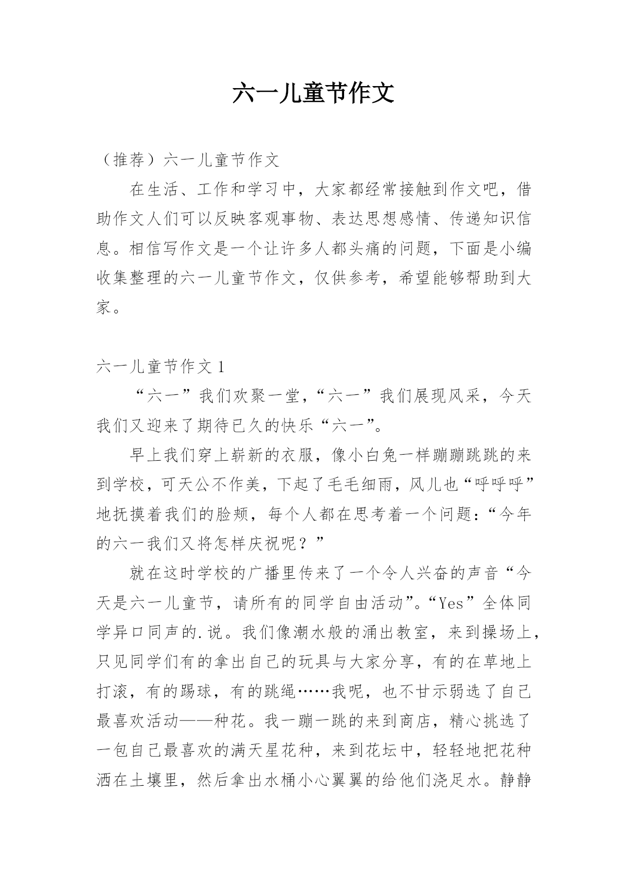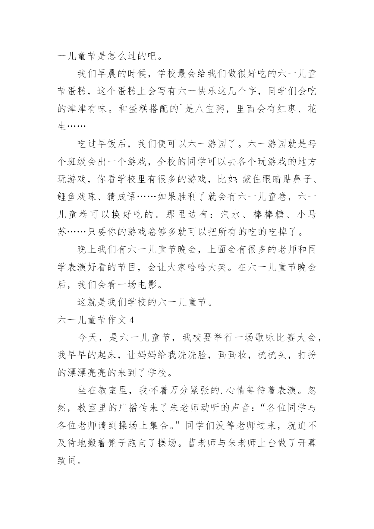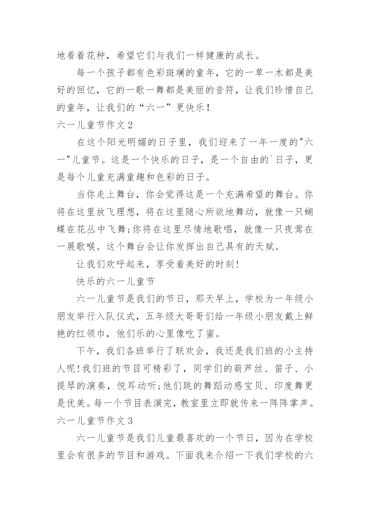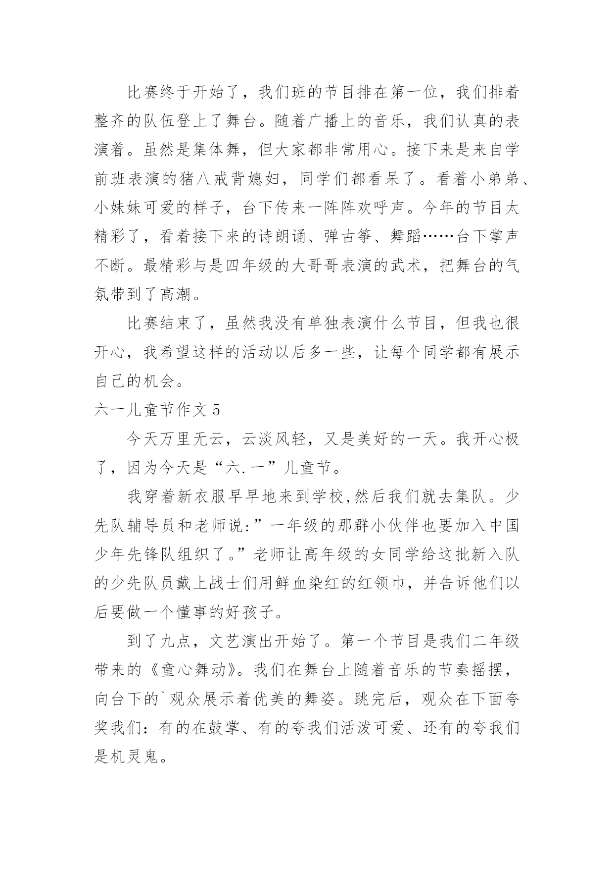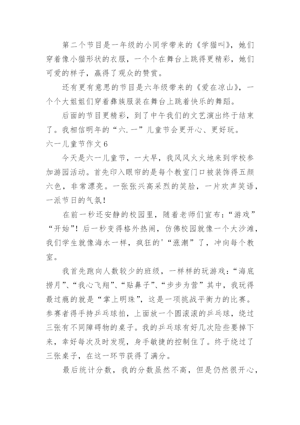六一儿童节作文 (推荐)六一儿童节作文在生活、工作和学习中,大家都经常接触到作文吧,借助作文人们可以反映客观事物、表达思想感情、传递知识信息。相信写作文是一个让许多人都头痛的问题,下面是小编收集整理的六一儿童节作文,仅供参考,希望能够帮助到大家。六一儿童节作文1“六一”我们欢聚一堂,“六一”我们展现风采,今天我们又迎来了期待已久的快乐“六一”。早上我们穿上崭新的衣服,像小白兔一样蹦蹦跳跳的来到学校,可天公不作美,下起了毛毛细雨,风儿也“呼呼呼”地抚摸着我们的脸颊,每个人都在思考着一个问题:“今年的六一我们又将怎样庆祝呢?”就在这时学校的广播里传来了一个令人兴奋的声音“今天是六一儿童节,请所有的同学自由活动”。“Yes”全体同学异口同声的.说。我们像潮水般的涌出教室,来到操场上,只见同学们有的拿出自己的玩具与大家分享,有的在草地上打滚,有的踢球,有的跳绳……我呢,也不甘示弱选了自己最喜欢活动——种花。我一蹦一跳的来到商店,精心挑选了一包自己最喜欢的满天星花种,来到花坛中,轻轻地把花种洒在土壤里,然后拿出水桶小心翼翼的给他们浇足水。静静地看着花种,希望它们与我们一样健康的成长。每一个孩子都有色彩斑斓的童年,它的一草一木都是美好的回忆,它的一歌一舞都是美丽的音符,让我们珍惜自己的童年,让我们的“六一”更快乐!六一儿童节作文2在这个阳光明媚的日子里,我们迎来了一年一度的"六一"儿童节。这是一个快乐的日子,是一个自由的`日子,更是每个儿童充满童趣和色彩的日子。当你走上舞台,你会觉得这是一个充满希望的舞台。你将在这里放飞理想,将在这里随心所欲地舞动,就像一只蝴蝶在花丛中飞舞;你将在这里尽情地歌唱,就像一只夜莺在一展歌喉。这个舞台会让你发挥出自己具有的天赋。让我们欢呼起来,享受着美好的时刻!快乐的六一儿童节六一儿童节是我们的节日,那天早上,学校为一年级小朋友举行入队仪式,五年级大哥哥们给一年级小朋友戴上鲜艳的红领巾,他们乐的心里像吃了蜜。下午,我们各班举行了联欢会,我还是我们班的小主持人呢!我们班的节目可精彩了,同学们的葫芦丝、笛子、小提琴的演奏,悦耳动听;他们跳的舞蹈动感宝贝、印度舞更是优美。每一个节目表演完,教室里立即就传来一阵阵掌声。六一儿童节作文3六一儿童节是我们儿童最喜欢的一个节日,因为在学校里会有很多的节目和游戏。下面我来介绍一下我们学校的六一儿童节是怎么过的吧。我们早晨的时候,学校最会给我们做很好吃的六一儿童节蛋糕,这个蛋糕上会写有六一快乐这几个字,同学们会吃的津津有味。和蛋糕搭配的`是八宝粥,里面会有红枣、花生……吃过早饭后,我们便可以六一游园了。六一游园就是每个班级会出一个游戏,全校的同学可以去各个玩游戏的地方玩游戏,你看学校里有很多的游戏,比如:蒙住眼睛贴鼻子、鲤鱼戏珠、猜成语……如果胜利了就会有六一儿童卷,六一儿童卷可以换好吃的。那里边有:汽水、棒棒糖、小马苏……只要你的游戏卷够多就可以把所有的吃的吃掉了。晚上我们有六一儿童节晚会,上面会有很多的老师和同学表演好看的节目,会让大家哈哈大笑。在六一儿童节晚会后,我们会看一场电影。这就是我们学校的六一儿童节。六一儿童节作文4今天,是六一儿童节,我校要举行一场歌咏比赛大会,我早早的起床,让妈妈给我洗洗脸,画画妆,梳梳头,打扮的漂漂亮亮的来到了学校。坐在教室里,我怀着万分紧张的.心情等待着表演。忽然,教室里的广播传来了朱老师动听的声音:“各位同学与各位老师请到操场上集合。”同学们没等老师过来,就迫不及待地搬着凳子跑向了操场。曹老师与朱老师上台做了开幕致词。比赛终于开始了,我们班的节目排在第一位,我们排着整齐的队伍登上了舞台。随着广播上的音乐,我们认真的表演着。虽然是集体舞,但大家都非常用心。接下来是来自学前班表演的猪八戒背媳妇,同学们都看呆了。看着小弟弟、小妹妹可爱的样子,台下传来一阵阵欢呼声。今年的节目太精彩了,看着接下来的诗朗诵、弹古筝、舞蹈……台下掌声不断。最精彩与是四年级的大哥哥表演的武术,把舞台的气氛带到了高潮。比赛结束了,虽然我没有单独表演什么节目,但我也很开心,我希望这样的活动以后多一些,让每个同学都有展示自己的机会。六一儿童节作文5今天万里无云,云淡风轻,又是美好的一天。我开心极了,因为今天是“六.一”儿童节。我穿着新衣服早早地来到学校,然后我们就去集队。少先队辅导员和老师说:”一年级的那群小伙伴也要加入中国少年先锋队组织了。”老师让高年级的女同学给这批新入队的少先队员戴上战士们用鲜血染红的红领巾,并告诉他们以后要做一个懂事的好孩子。到了九点,文艺演出开始了。第一个节目是我们二年级带来的《童心舞动》。我们在舞台上随着音乐的节奏摇摆,向台下的`观众展示着优美的舞姿。跳完后,观众在下面夸奖我们:有的在鼓掌、有的夸我们活泼可爱、还有的夸我们是机灵鬼。第二个节目是一年