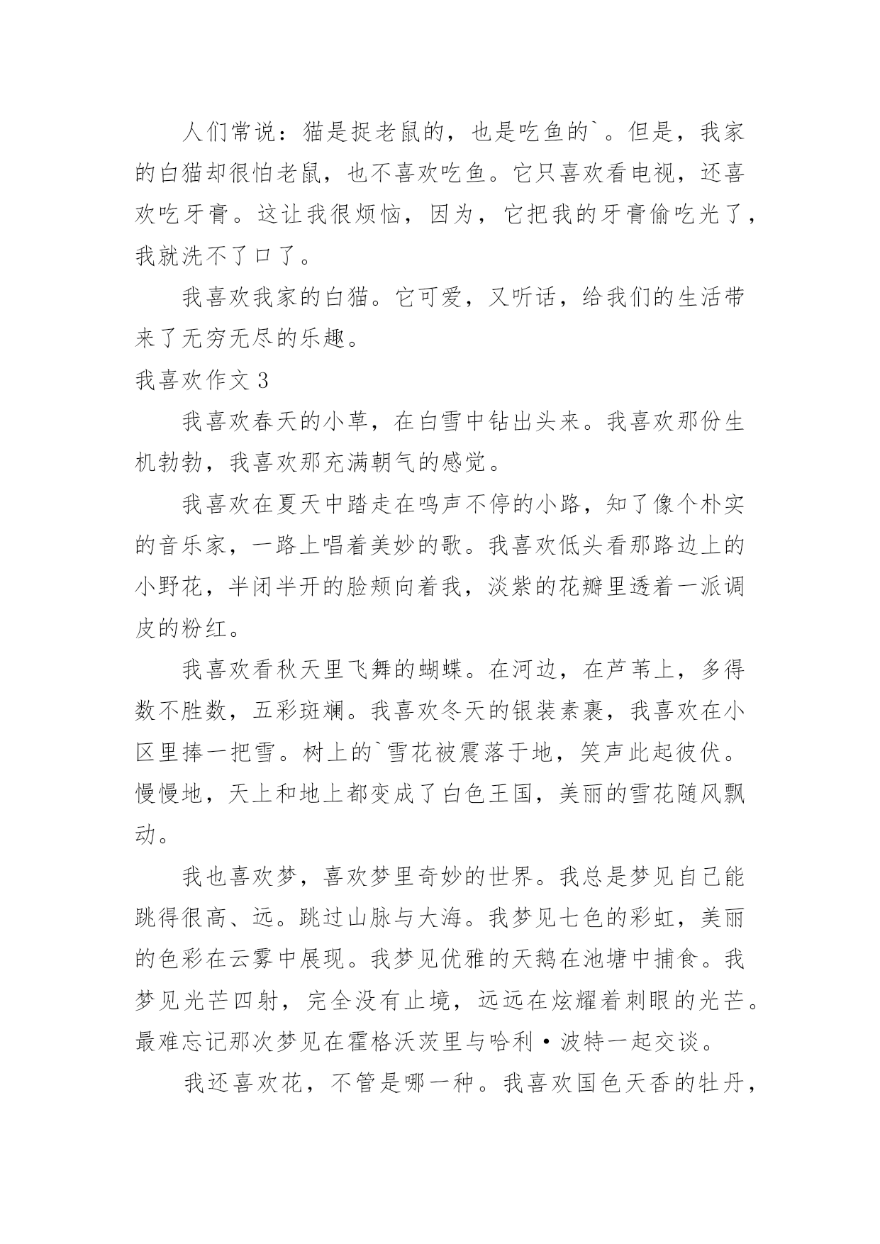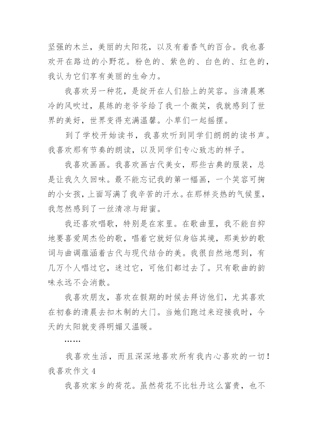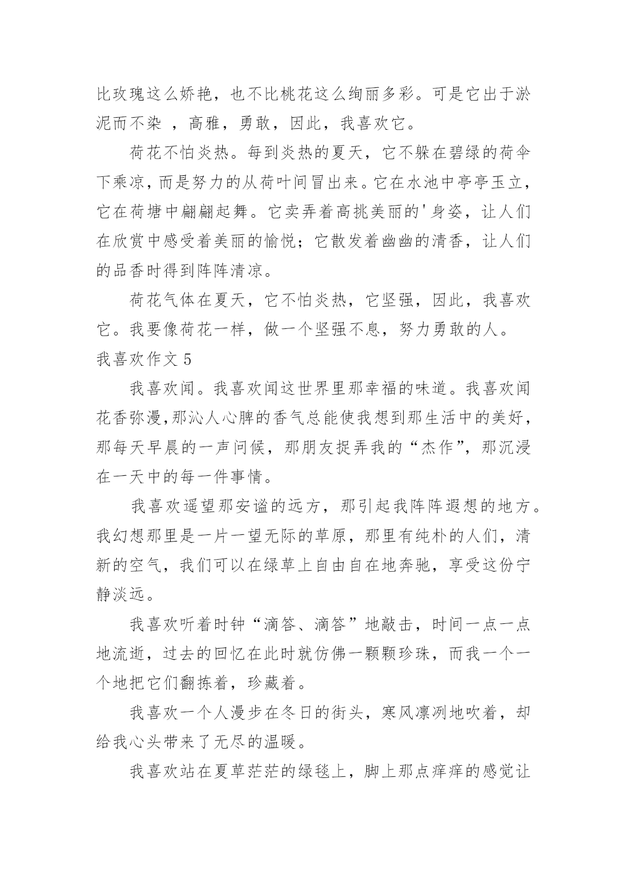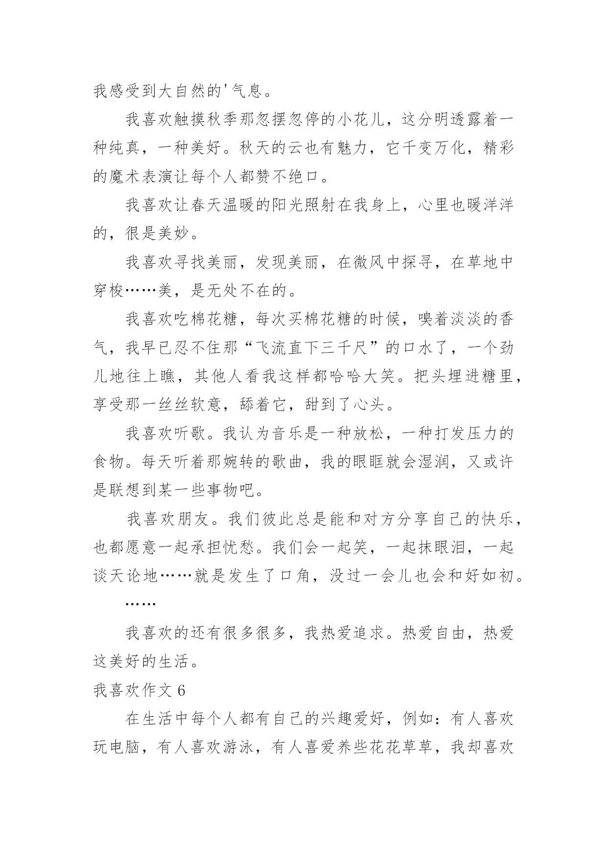 我喜欢作文 我喜欢作文无论是身处学校还是步入社会,大家都有写作文的经历,对作文很是熟悉吧,作文是经过人的思想考虑和语言组织,通过文字来表达一个主题意义的记叙方法。相信很多朋友都对写作文感到非常苦恼吧,下面是小编收集整理的我喜欢作文,欢迎大家分享。我喜欢作文1我喜欢大海,喜欢大海的一望无际,喜欢那波浪推涌的哗哗声,还喜欢在水里自由自在游泳的小鱼,它们在我的.梦里出现多次,将来我要去探索神奇的海底世界。我喜欢草原,喜欢那蓝天飘浮的白云和草原上游荡的羊群。到处茫茫草丛使我的眼睛充满绿色,我喜欢躺在草原上幻想,幻想着未来……我喜欢作文2我家喂养了一只猫,名字叫"三头"。它的毛是白色的,身上有灰色的条纹。白猫的眼睛是大大的,白天,总是密密的。晚上,白猫的眼睛是会发光的,怪吓人的。我家的白猫很听话,很乖巧。一是习惯在厕所里大小便,很讲卫生。二是当你给它拍照的时候,猫很害羞,连忙用前爪子挥挥自己的脸,让你无法拍到它的正面,也让我们很搞笑。人们常说:猫是捉老鼠的,也是吃鱼的`。但是,我家的白猫却很怕老鼠,也不喜欢吃鱼。它只喜欢看电视,还喜欢吃牙膏。这让我很烦恼,因为,它把我的牙膏偷吃光了,我就洗不了口了。我喜欢我家的白猫。它可爱,又听话,给我们的生活带来了无穷无尽的乐趣。我喜欢作文3我喜欢春天的小草,在白雪中钻出头来。我喜欢那份生机勃勃,我喜欢那充满朝气的感觉。我喜欢在夏天中踏走在鸣声不停的小路,知了像个朴实的音乐家,一路上唱着美妙的歌。我喜欢低头看那路边上的小野花,半闭半开的脸颊向着我,淡紫的花瓣里透着一派调皮的粉红。我喜欢看秋天里飞舞的蝴蝶。在河边,在芦苇上,多得数不胜数,五彩斑斓。我喜欢冬天的银装素裹,我喜欢在小区里捧一把雪。树上的`雪花被震落于地,笑声此起彼伏。慢慢地,天上和地上都变成了白色王国,美丽的雪花随风飘动。我也喜欢梦,喜欢梦里奇妙的世界。我总是梦见自己能跳得很高、远。跳过山脉与大海。我梦见七色的彩虹,美丽的色彩在云雾中展现。我梦见优雅的天鹅在池塘中捕食。我梦见光芒四射,完全没有止境,远远在炫耀着刺眼的光芒。最难忘记那次梦见在霍格沃茨里与哈利·波特一起交谈。我还喜欢花,不管是哪一种。我喜欢国色天香的牡丹,坚强的木兰,美丽的太阳花,以及有着香气的百合。我也喜欢开在路边的小野花。粉色的、紫色的、白色的、红色的,我认为它们享有美丽的生命力。我喜欢另一种花,是绽开在人们脸上的笑容。当清晨寒冷的风吹过,晨练的老爷爷给了我一个微笑,我就感到了世界的美好,世界变得充满温馨。小草们一起摇摆。到了学校开始读书,我喜欢听到同学们朗朗的读书声。我喜欢那有节奏的朗读,以及同学们专心致志的样子。我喜欢画画。我喜欢画古代美女,那些古典的服装,总是让我久久回味。最不能忘记我的第一幅画,一个笑容可掬的小女孩,上面写满了我辛苦的汗水。在那样炎热的气候里,我忽然感到了一丝清凉与甜蜜。我还喜欢唱歌,特别是在家里。在歌曲里,我不能自抑地要喜爱周杰伦的歌,唱着它就好似身临其境,那美妙的歌词与曲调蕴涵着古代与现代结合的美。我很自然地想到,有几万个人唱过它,迷过它,可他们都过去了。只有歌曲的韵味永远不会消散。我喜欢朋友,喜欢在假期的时候去拜访他们,尤其喜欢在初春的清晨去扣木制的大门。当她们跑过来迎接我时,今天的太阳就变得明媚又温暖。……我喜欢生活,而且深深地喜欢所有我内心喜欢的一切!我喜欢作文4我喜欢家乡的荷花。虽然荷花不比牡丹这么富贵,也不比玫瑰这么娇艳,也不比桃花这么绚丽多彩。可是它出于淤泥而不染,高雅,勇敢,因此,我喜欢它。荷花不怕炎热。每到炎热的夏天,它不躲在碧绿的荷伞下乘凉,而是努力的从荷叶间冒出来。它在水池中亭亭玉立,它在荷塘中翩翩起舞。它卖弄着高挑美丽的'身姿,让人们在欣赏中感受着美丽的愉悦;它散发着幽幽的清香,让人们的品香时得到阵阵清凉。荷花气体在夏天,它不怕炎热,它坚强,因此,我喜欢它。我要像荷花一样,做一个坚强不息,努力勇敢的人。我喜欢作文5我喜欢闻。我喜欢闻这世界里那幸福的味道。我喜欢闻花香弥漫,那沁人心脾的香气总能使我想到那生活中的美好,那每天早晨的一声问候,那朋友捉弄我的“杰作”,那沉浸在一天中的每一件事情。我喜欢遥望那安谧的远方,那引起我阵阵遐想的地方。我幻想那里是一片一望无际的草原,那里有纯朴的人们,清新的空气,我们可以在绿草上自由自在地奔驰,享受这份宁静淡远。我喜欢听着时钟“滴答、滴答”地敲击,时间一点一点地流逝,过去的回忆在此时就仿佛一颗颗珍珠,而我一个一个地把它们翻拣着,珍藏着。我喜欢一个人漫步在冬日的街头,寒风凛冽地吹着,却给我心头带来了无尽的温暖。我喜欢站在夏草茫茫的绿毯上,脚上那点痒痒的感觉让我感受到大自然的'气息。我喜欢触摸秋季那忽摆忽停的小花儿,这分明透露着一种纯真,一种美好。秋天的云也有魅力,它千变万化,精彩的魔术表演让每