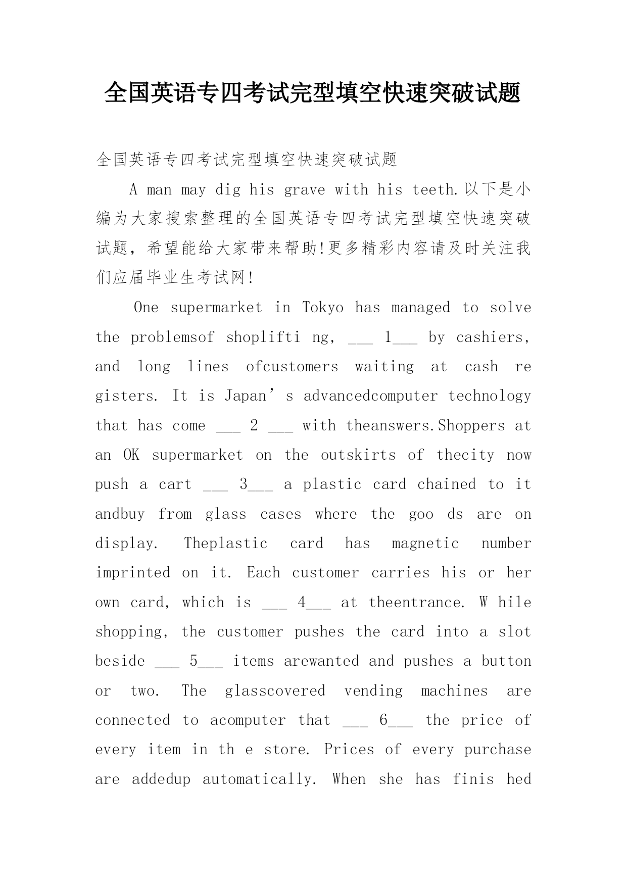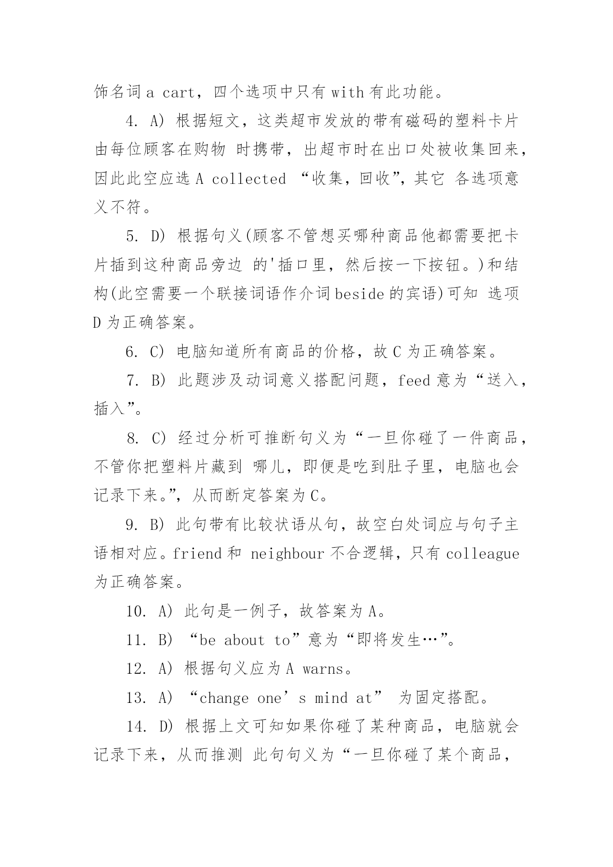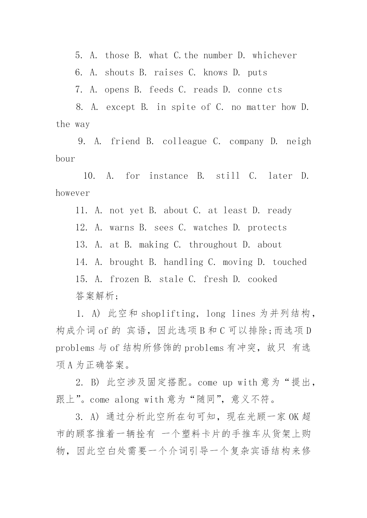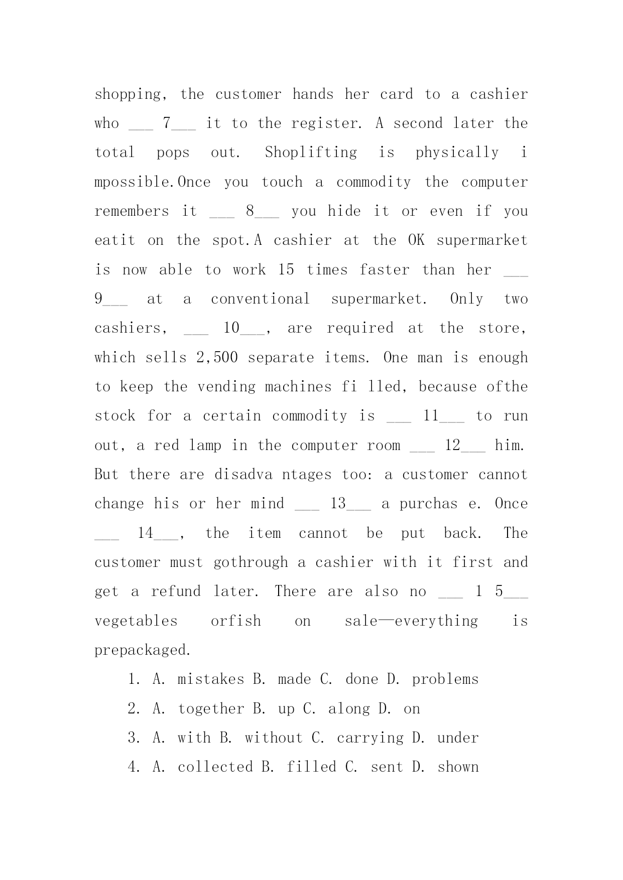 全国英语专四考试完型填空快速突破试题 全国英语专四考试完型填空快速突破试题Amanmaydighisgravewithhisteeth.以下是小编为大家搜索整理的全国英语专四考试完型填空快速突破试题,希望能给大家带来帮助!更多精彩内容请及时关注我们应届毕业生考试网!OnesupermarketinTokyohasmanagedtosolvetheproblemsofshoplifting,___1___bycashiers,andlonglinesofcustomerswaitingatcashregisters.ItisJapan’sadvancedcomputertechnologythathascome___2___withtheanswers.ShoppersatanOKsupermarketontheoutskirtsofthecitynowpushacart___3___aplasticcardchainedtoitandbuyfromglasscaseswherethegoodsareondisplay.Theplasticcardhasmagneticnumberimprintedonit.Eachcustomercarrieshisorherowncard,whichis___4___attheentrance.Whileshopping,thecustomerpushesthecardintoaslotbeside___5___itemsarewantedandpushesabuttonortwo.Theglasscoveredvendingmachinesareconnectedtoacomputerthat___6___thepriceofeveryiteminthestore.Pricesofeverypurchaseareaddedupautomatically.Whenshehasfinishedshopping,thecustomerhandshercardtoacashierwho___7___ittotheregister.Asecondlaterthetotalpopsout.Shopliftingisphysicallyimpossible.Onceyoutouchacommoditythecomputerremembersit___8___youhideitorevenifyoueatitonthespot.AcashierattheOKsupermarketisnowabletowork15timesfasterthanher___9___ataconventionalsupermarket.Onlytwocashiers,___10___,arerequiredatthestore,whichsells2,500separateitems.Onemanisenoughtokeepthevendingmachinesfilled,becauseofthestockforacertaincommodityis___11___torunout,aredlampinthecomputerroom___12___him.Buttherearedisadvantagestoo:acustomercannotchangehisorhermind___13___apurchase.Once___14___,theitemcannotbeputback.Thecustomermustgothroughacashierwithitfirstandgetarefundlater.Therearealsono___15___vegetablesorfishonsale—everythingisprepackaged.1.A.mistakesB.madeC.doneD.problems2.A.togetherB.upC.alongD.on3.A.withB.withoutC.carryingD.under4.A.collectedB.filledC.sentD.shown5.A.thoseB.whatC.thenumberD.whichever6.A.shoutsB.raisesC.knowsD.puts7.A.opensB.feedsC.readsD.connects8.A.exceptB.inspiteofC.nomatterhowD.theway9.A.friendB.colleagueC.companyD.neighbour10.A.forinstanceB.stillC.laterD.however11.A.notyetB.aboutC.atleastD.ready12.A.warnsB.see