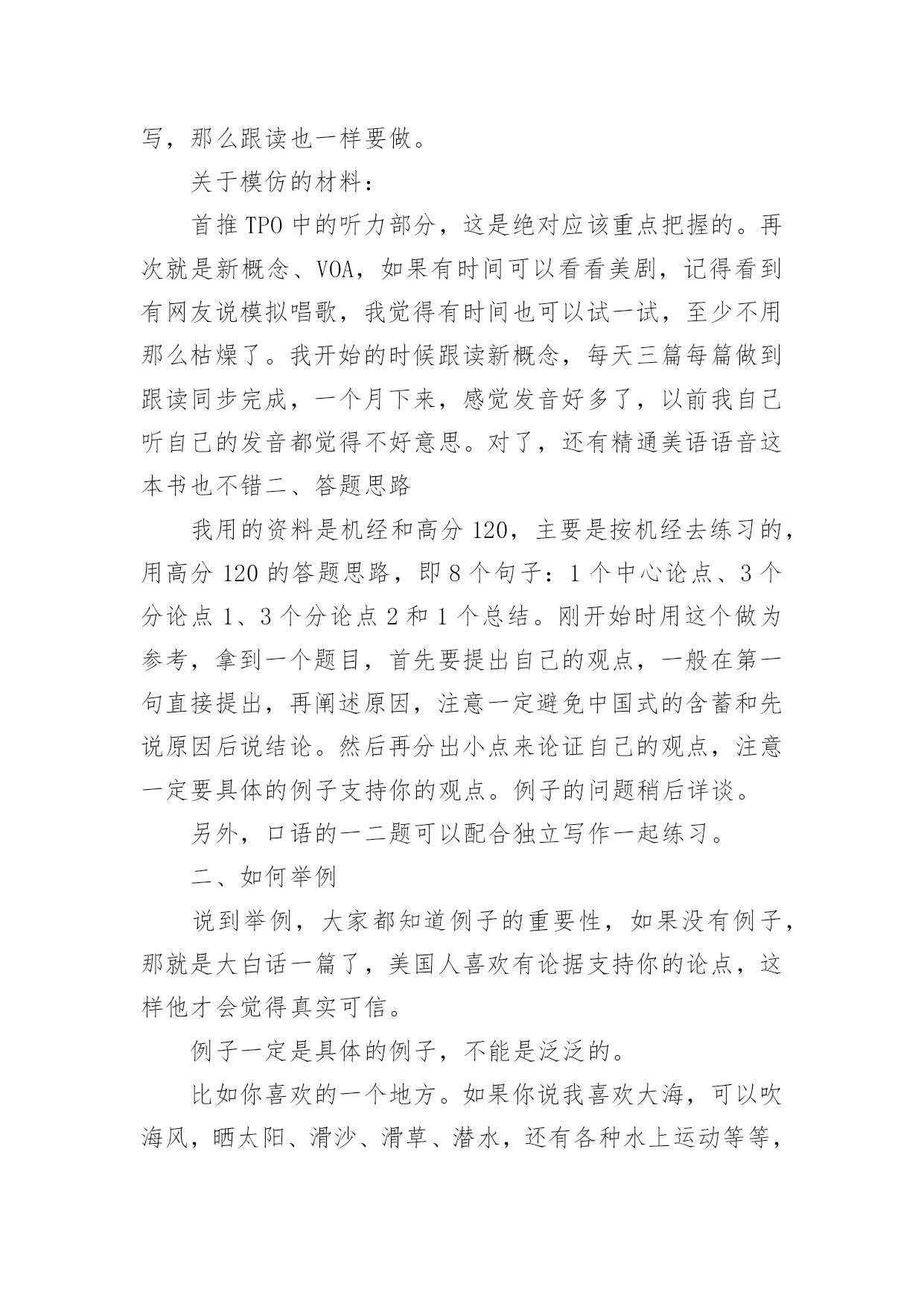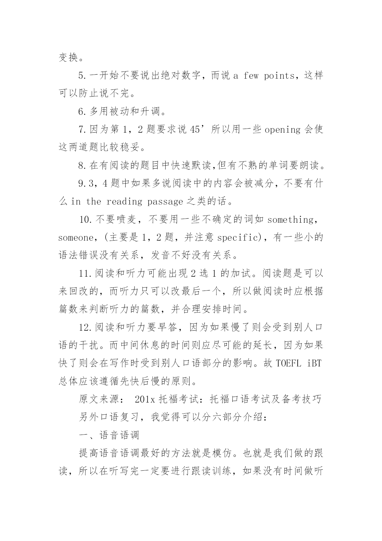 托福考试:托福口语考试及备考技巧 托福考试:托福口语考试及备考技巧201x托福考试:托福口语考试及备考技巧新托福口语心得是托福达人给出的一个口语从低分到高迈进的过程,为托福口语考试做一个计划是每个考生都必不可少的一个环节,不但能使复习有条不紊的进行,一个计划的实施更能锻炼一个人的能力与毅力.新托福口语考试是很多考生的纠结点,那么我们如何在托福口语考试中考出理想的成绩呢?现在小编隆重介绍超级实用的托福口语考试技巧让大家参考,希望对各位考生有帮助,下面我们一起来看看吧。1.在听力完成后会有5秒倒计时,结束后开始计时10分钟的休息,休息完后让监考输入密码进入口语部分,按完第一个NEXT后别按第二个NEXT,这样中间就有无限的时间听别人答完所有的题。第1,2题也要做笔记,虽然短而且简单,但这样可以防止到时万一因为某个词而卡住。2.答题时宁过勿缺,但如果最后差几秒又实在想不出,则可说:That’saboutit(连读)3’ORThat’severythingIcansayaboutthistopic.5’3.有时可用and将两个同义词连接,这样既可强调要表达的意思,又可延长一倍的时间。4.多用习语,口语词,gonna,wanna,thatal=thatwill,有的词读的短而快,有些则长而慢,注意语音语调的变换。5.一开始不要说出绝对数字,而说afewpoints,这样可以防止说不完。6.多用被动和升调。7.因为第1,2题要求说45’所以用一些opening会使这两道题比较稳妥。8.在有阅读的题目中快速默读,但有不熟的单词要朗读。9.3,4题中如果多说阅读中的内容会被减分,不要有什么inthereadingpassage之类的话。10.不要喷麦,不要用一些不确定的词如something,someone,(主要是1,2题,并注意specific),有一些小的语法错误没有关系,发音不好没有关系。11.阅读和听力可能出现2选1的加试。阅读题是可以来回改的,而听力只可以改最后一个,所以做阅读时应根据篇数来判断听力的篇数,并合理安排时间。12.阅读和听力要早答,因为如果慢了则会受到别人口语的干扰。而中间休息的时间则应尽可能的延长,因为如果快了则会在写作时受到别人口语部分的影响。故TOEFLiBT总体应该遵循先快后慢的原则。原文来源:201x托福考试:托福口语考试及备考技巧另外口语复习,我觉得可以分六部分介绍:一、语音语调提高语音语调最好的方法就是模仿。也就是我们做的跟读,所以在听写完一定要进行跟读训练,如果没有时间做听写,那么跟读也一样要做。关于模仿的材料:首推TPO中的听力部分,这是绝对应该重点把握的。再次就是新概念、VOA,如果有时间可以看看美剧,记得看到有网友说模拟唱歌,我觉得有时间也可以试一试,至少不用那么枯燥了。我开始的时候跟读新概念,每天三篇每篇做到跟读同步完成,一个月下来,感觉发音好多了,以前我自己听自己的发音都觉得不好意思。对了,还有精通美语语音这本书也不错二、答题思路我用的资料是机经和高分120,主要是按机经去练习的,用高分120的答题思路,即8个句子:1个中心论点、3个分论点1、3个分论点2和1个总结。刚开始时用这个做为参考,拿到一个题目,首先要提出自己的观点,一般在第一句直接提出,再阐述原因,注意一定避免中国式的含蓄和先说原因后说结论。然后再分出小点来论证自己的观点,注意一定要具体的例子支持你的观点。例子的问题稍后详谈。另外,口语的一二题可以配合独立写作一起练习。二、如何举例说到举例,大家都知道例子的重要性,如果没有例子,那就是大白话一篇了,美国人喜欢有论据支持你的论点,这样他才会觉得真实可信。例子一定是具体的例子,不能是泛泛的。比如你喜欢的一个地方。如果你说我喜欢大海,可以吹海风,晒太阳、滑沙、滑草、潜水,还有各种水上运动等等,这些是不够的,一定是具体的。比如,我几乎每年都去,今年和家人一起去的,在XX地方吃了海鲜,一起玩了XX水上运动,跟弟弟一起出海打鱼等等,这样就有说服力了。大家注意到了吗?一定是有具体的'人具体事。三、如何在有效的控制时间最初练习时,先写出草稿,然后对着念,看能否在45秒内完成。之后做调整,直到语速和长度都合适的时候,一定做模拟练习。拿到题目后,15秒来用构思框架和内容以及语言的组织,45秒作答。特别提醒:如果你没有学习伙伴,一定要把你的回答录下来,然后听听有什么问题,再做有针对性的改进,直到满意为止。想想我说成那样我都录了,你还怕什么。四、关于学习资料机经、高分120、新概念、VOA、TPO听力音频、精通美语语音,特别推荐机经,口语1、2题完全可以只用机经进行练习。强烈推荐YeeaooBox托福口语考试全真模拟软件。五、特别重要的一点:总结这也是我刚开始忽视的一点,后来就重视了。收获非常大。不管是