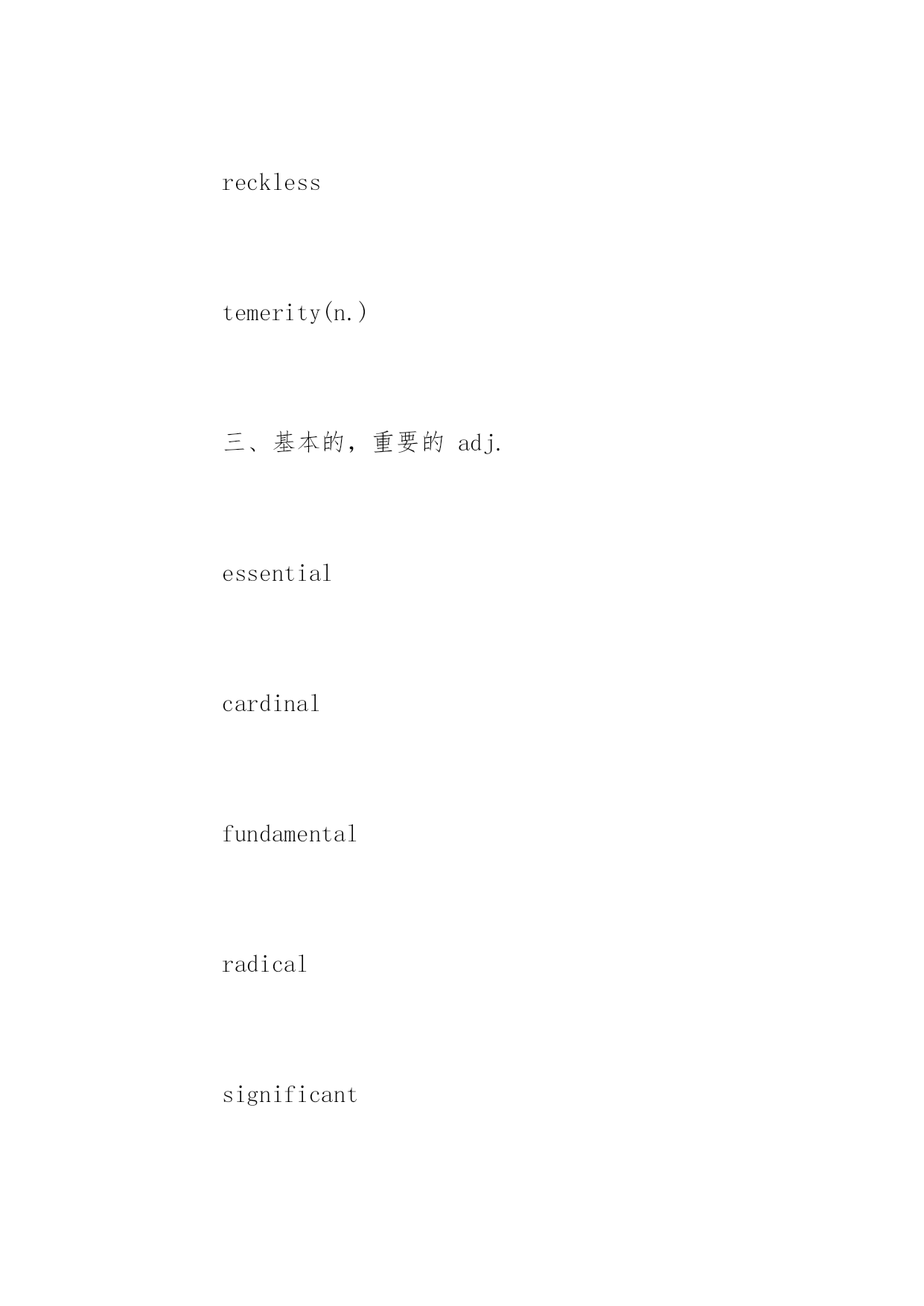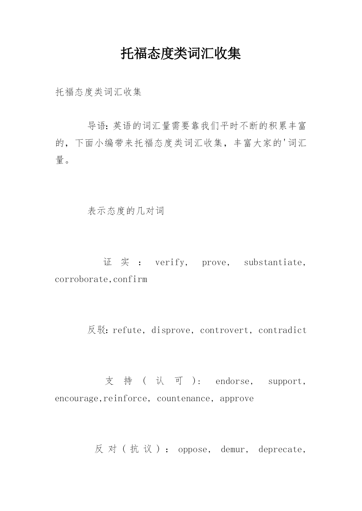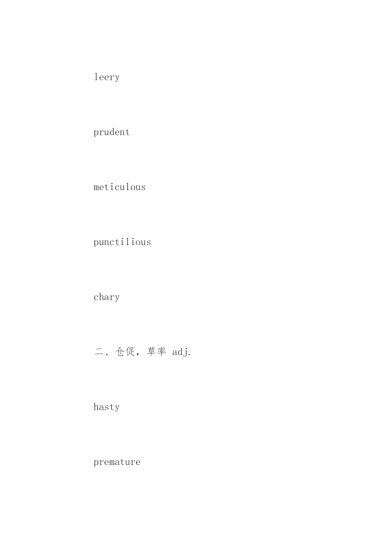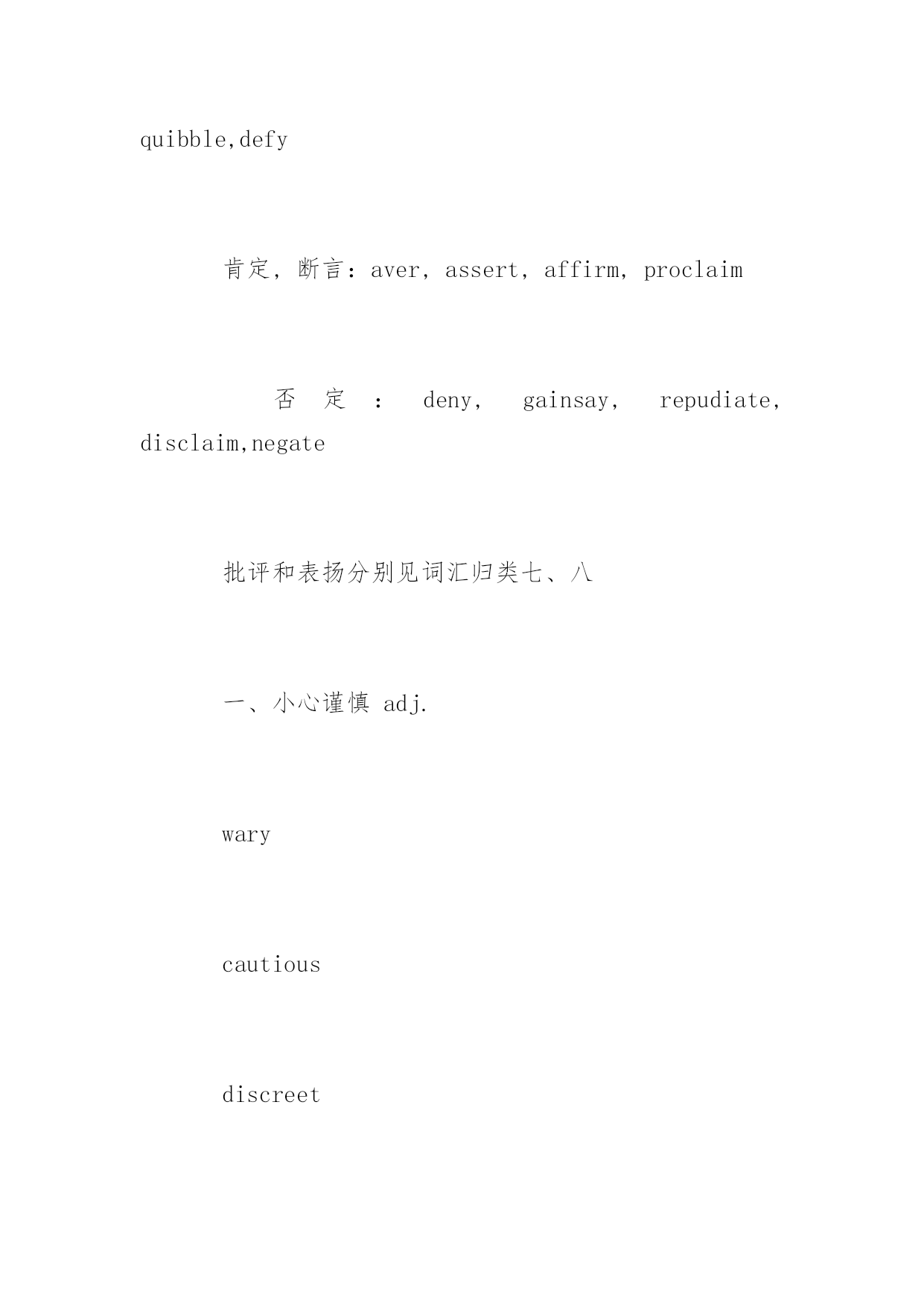 托福态度类词汇收集 托福态度类词汇收集 导语:英语的词汇量需要靠我们平时不断的积累丰富的,下面小编带来托福态度类词汇收集,丰富大家的'词汇量。 表示态度的几对词 证实:verify,prove,substantiate,corroborate,confirm 反驳:refute,disprove,controvert,contradict 支持(认可):endorse,support,encourage,reinforce,countenance,approve 反对(抗议):oppose,demur,deprecate,quibble,defy 肯定,断言:aver,assert,affirm,proclaim 否定:deny,gainsay,repudiate,disclaim,negate 批评和表扬分别见词汇归类七、八 一、小心谨慎adj. wary cautious discreet leery prudent meticulous punctilious chary 二、仓促,草率adj. hasty premature cursory perfunctory slipshod facile 鲁莽 daredevil rash impetuous reckless temerity(n.) 三、基本的,重要的adj. essential cardinal fundamental radical significant primary important key crucial momentous vital 四、自负、傲慢adj. 自负 arrogant presumptuous overweening pompous consequential self-conceited pretentious smug hubrisn. 傲慢 haughty contemptuous supercilious 五、阻碍v. retard check hinder impede arrest balk obstruct stymie stem stunt cumber forestall 六、缺乏,不足adj. devoid scarce scanty insufficient lack deficient inadequate meager dearth 七、批评、谴责v. denounce condemn reprehend rail censure upbraid chastise vituperate blame scold castigate reprimand reprove rebuke chide reproach opprobrium impugn 八、表扬,赞扬v. commend extol exalt acclaim laud eulogize accolade applaud glorify celebrate 九、贬低、诋毁v. detract belittle derogate demean disparage depreciate 十、节俭、吝啬adj. frugal thrifty husbandly parsimonious stingy spare miserly penurious niggardly