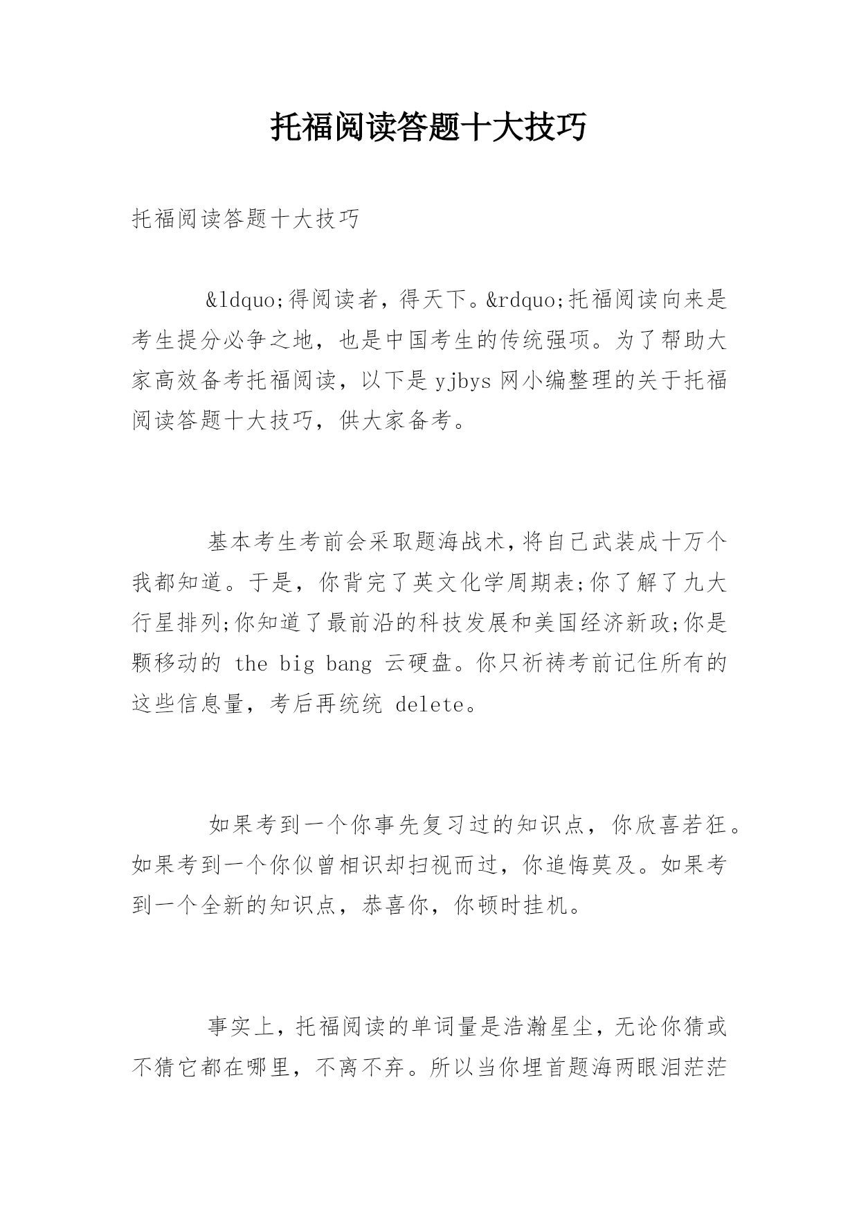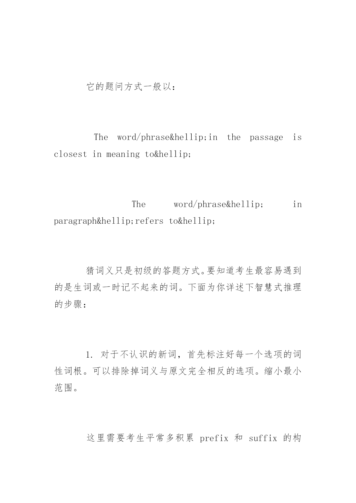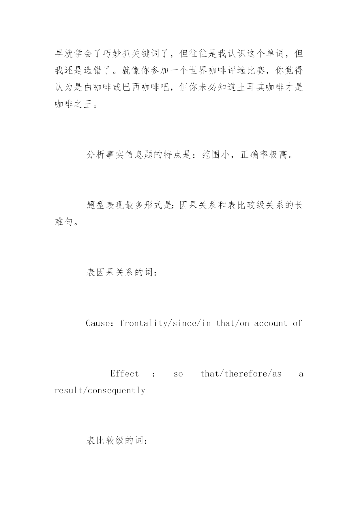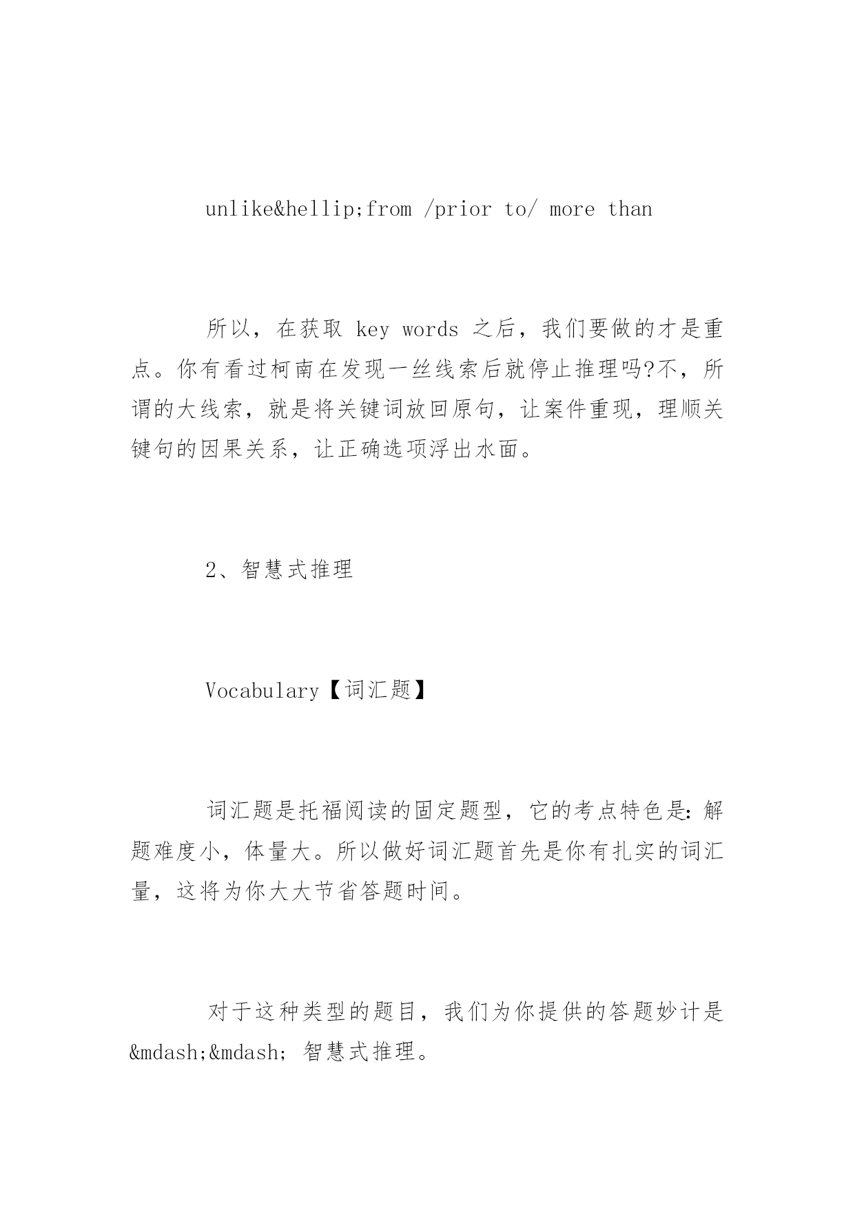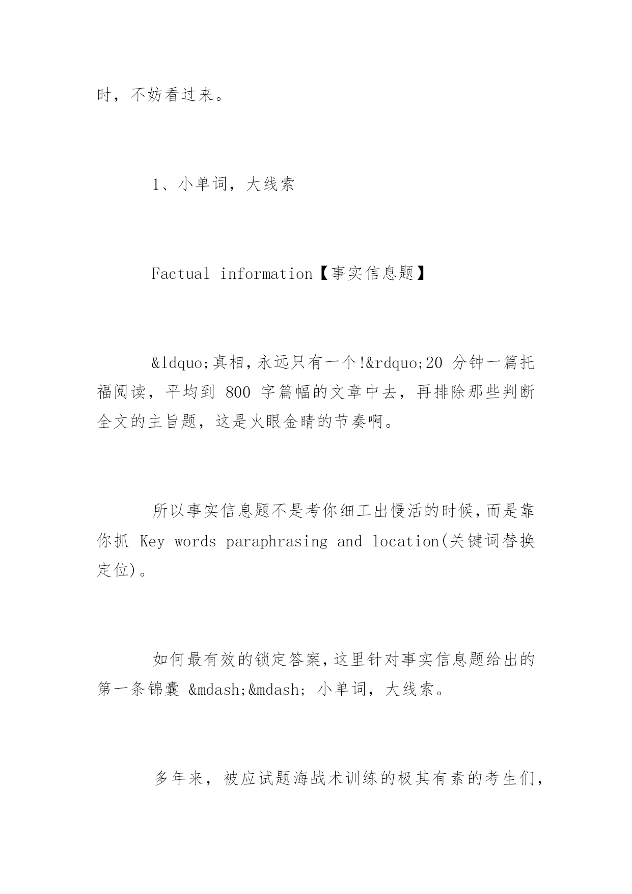 托福阅读答题十大技巧 托福阅读答题十大技巧 “得阅读者,得天下。”托福阅读向来是考生提分必争之地,也是中国考生的传统强项。为了帮助大家高效备考托福阅读,以下是yjbys网小编整理的关于托福阅读答题十大技巧,供大家备考。 基本考生考前会采取题海战术,将自己武装成十万个我都知道。于是,你背完了英文化学周期表;你了解了九大行星排列;你知道了最前沿的科技发展和美国经济新政;你是颗移动的thebigbang云硬盘。你只祈祷考前记住所有的这些信息量,考后再统统delete。 如果考到一个你事先复习过的知识点,你欣喜若狂。如果考到一个你似曾相识却扫视而过,你追悔莫及。如果考到一个全新的知识点,恭喜你,你顿时挂机。 事实上,托福阅读的单词量是浩瀚星尘,无论你猜或不猜它都在哪里,不离不弃。所以当你埋首题海两眼泪茫茫时,不妨看过来。 1、小单词,大线索 Factualinformation【事实信息题】 “真相,永远只有一个!”20分钟一篇托福阅读,平均到800字篇幅的文章中去,再排除那些判断全文的主旨题,这是火眼金睛的节奏啊。 所以事实信息题不是考你细工出慢活的时候,而是靠你抓Keywordsparaphrasingandlocation(关键词替换定位)。 如何最有效的锁定答案,这里针对事实信息题给出的第一条锦囊——小单词,大线索。 多年来,被应试题海战术训练的极其有素的考生们,早就学会了巧妙抓关键词了,但往往是我认识这个单词,但我还是选错了。就像你参加一个世界咖啡评选比赛,你觉得认为是白咖啡或巴西咖啡吧,但你未必知道土耳其咖啡才是咖啡之王。 分析事实信息题的特点是:范围小,正确率极高。 题型表现最多形式是:因果关系和表比较级关系的长难句。 表因果关系的词: Cause:frontality/since/inthat/onaccountof Effect:sothat/therefore/asaresult/consequently 表比较级的词: unlike…from/priorto/morethan 所以,在获取keywords之后,我们要做的才是重点。你有看过柯南在发现一丝线索后就停止推理吗?不,所谓的大线索,就是将关键词放回原句,让案件重现,理顺关键句的因果关系,让正确选项浮出水面。 2、智慧式推理 Vocabulary【词汇题】 词汇题是托福阅读的固定题型,它的考点特色是:解题难度小,体量大。所以做好词汇题首先是你有扎实的词汇量,这将为你大大节省答题时间。 对于这种类型的题目,我们为你提供的答题妙计是——智慧式推理。 它的题问方式一般以: Theword/phrase…inthepassageisclosestinmeaningto… Theword/phrase…inparagraph…refersto… 猜词义只是初级的答题方式。要知道考生最容易遇到的是生词或一时记不起来的词。下面为你详述下智慧式推理的步骤: 1.对于不认识的新词,首先标注好每一个选项的词性词根。可以排除掉词义与原文完全相反的选项。缩小最小范围。 这里需要考生平常多积累prefix和suffix的构词法,小站强烈推荐考生看构词法,因为学习前后缀的构词法,可以瞬间加大你的单词储备量。 2.剩下的选项词义接近,是很容易混淆失分点。一定要吃透关键词的上下文语境,要知道在特定语境时,单词的意思也会有微妙差别。通常意思完全一样或者含绝对肯定的词,往往不是正确选项。比如:undoubtedly/unquestionably/unanticipated 3.最后,需要考生利用常识知识去推理大致意思,锁定正确答案。 遇到词汇题Don'tpanic,标识好每一个单词的词性,然后根据词义放回原文,判断最适合原意的单词。学会一种有效的答题技巧,将助你事半功倍。 3、锁定故意相反信息 Negativefactualinfo【否定事实信息题】 否定事实信息题,顾名思义就是排除题。四个选项中让你排除表述错误、原文中没有描述或与原文描述相矛盾的内容,排除掉的选项即为正确选项。 所以此类题型的锦囊妙计就是——锁定故意相反信息 首先,我们来看一下此类出题常见形式: Accordingtothepassage,allofthefollowingstatementsaretrueEXCEPT… WhichofthefollowingisNOTmentionedas…? WhichofthefollowingaboutXisNOTtrue? 通常,一篇文章中可能