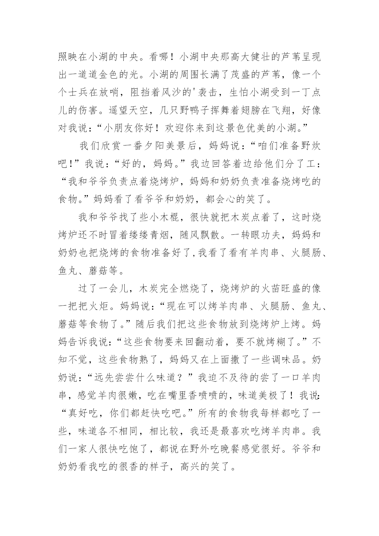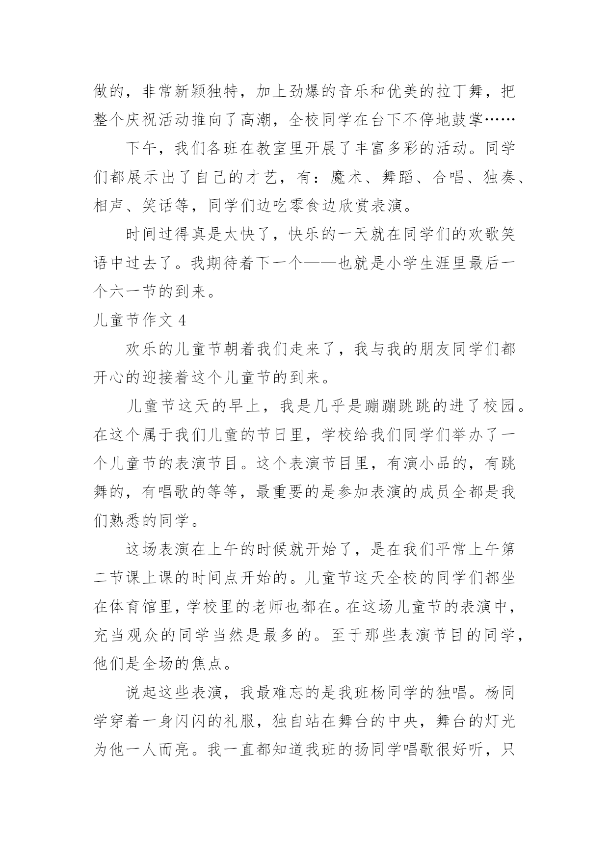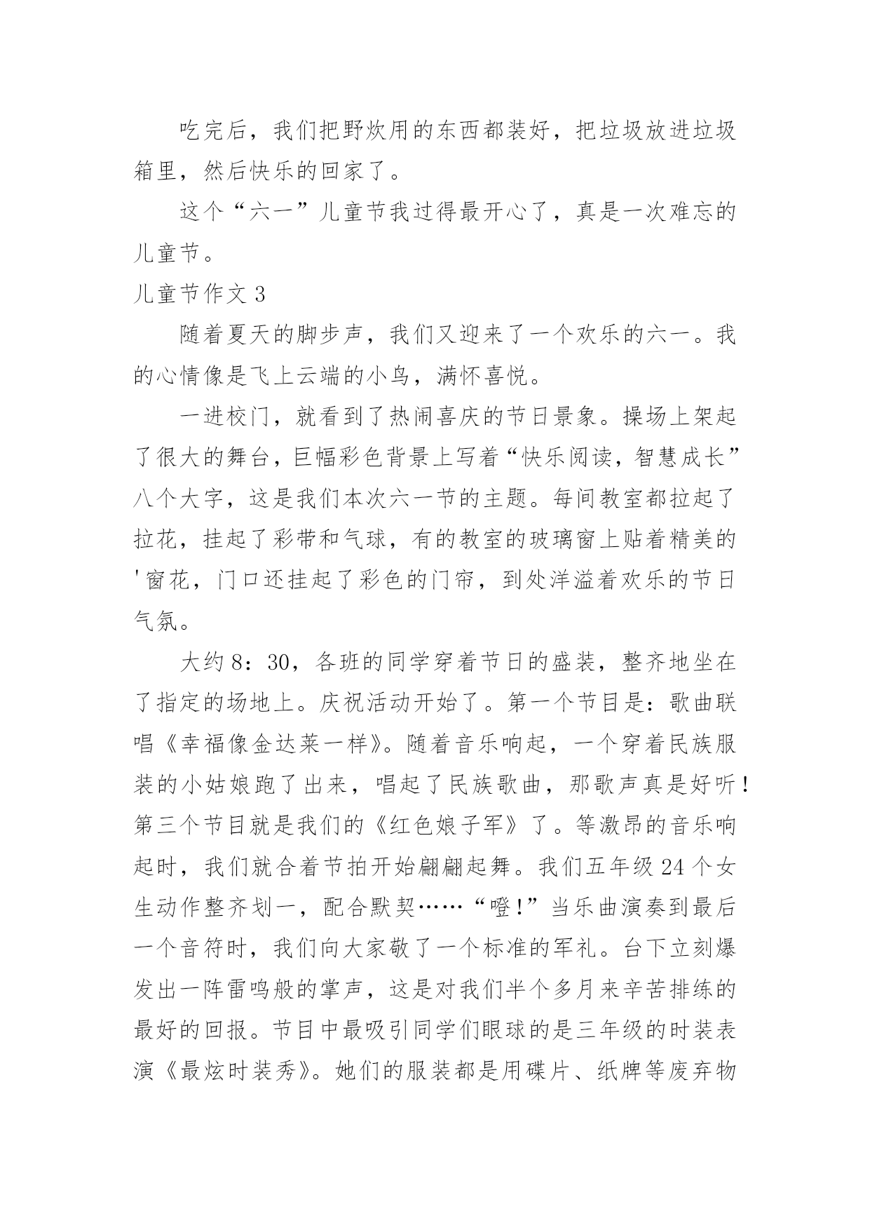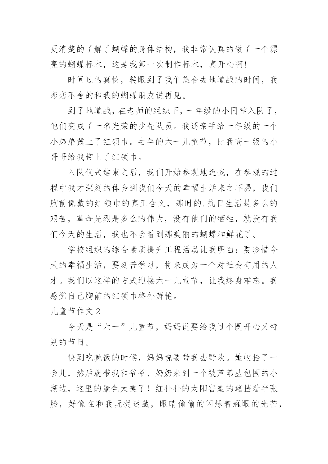儿童节作文 儿童节作文(必备15篇)在学习、工作、生活中,大家都经常看到作文的身影吧,作文根据体裁的不同可以分为记叙文、说明文、应用文、议论文。相信写作文是一个让许多人都头痛的问题,下面是小编精心整理的儿童节作文,欢迎大家分享。儿童节作文120xx年5月31日,为了迎接六一儿童节,学校组织我们进行综合素质提升工程活动,让我们去顺义的七彩蝶生态园和地道战参观体验。我们首先到达的是七彩蝶生态园,一从大巴车上下来,我就被七彩蝶园的大门吸引住了,它是很漂亮的蝴蝶形状,真是美啊!在老师的带领下,我们排着整齐的队伍穿过了漂亮的蝴蝶大门:“哇!好美啊!”我禁不住大叫起来,真的是蝴蝶的世界。我仿佛进入了另一种世界,成群的蝴蝶在漂亮的花海中自由的飞来飞去,跳着各式各样的舞蹈。有的淘气的蝴蝶会用它多彩的美丽的翅膀拍打我的头,又拍打我的肩膀,仿佛对我说:“李振宇小朋友,欢迎你来我家里玩。”我要是伸开我的小手,还会有胆子大的蝴蝶落在我手上,真好玩啊!我真想自己也变成一只蝴蝶和它们一起在花丛中飞翔。最有意思的是导游老师组织我们制作蝴蝶标本,这让我更清楚的了解了蝴蝶的身体结构,我非常认真的做了一个漂亮的蝴蝶标本,这是我第一次制作标本,真开心啊!时间过的真快,转眼到了我们集合去地道战的时间,我恋恋不舍的和我的蝴蝶朋友说再见。到了地道战,在老师的组织下,一年级的小同学入队了,他们变成了一名光荣的少先队员。我还亲手给一年级的一个小弟弟戴上了红领巾。去年的六一儿童节,比我高一级的小哥哥给我带上了红领巾。入队仪式结束之后,我们开始参观地道战,在参观的过程中我才深刻的体会到我们今天的幸福生活来之不易,我们胸前佩戴的红领巾的真正含义,那时的.抗日生活是多么的艰苦,革命先烈是多么的伟大,没有他们的牺牲,就没有我们今天的生活,我也不会看到那美丽的蝴蝶和鲜花了。学校组织的综合素质提升工程活动让我明白:要珍惜今天的幸福生活,要刻苦学习,将来成为一个对社会有用的人才。我们以这样的方式迎接六一儿童节,让我终身难忘。我感觉自己胸前的红领巾格外鲜艳。儿童节作文2今天是“六一”儿童节,妈妈说要给我过个既开心又特别的节日。快到吃晚饭的时候,妈妈说要带我去野炊。她收拾了一会儿,然后就带我和爷爷、奶奶来到一个被芦苇丛包围的小湖边,这里的景色太美了!红扑扑的太阳害羞的遮挡着半张脸,好像在和我玩捉迷藏,眼睛偷偷的闪烁着耀眼的光芒,照映在小湖的中央。看哪!小湖中央那高大健壮的芦苇呈现出一道道金色的光。小湖的周围长满了茂盛的芦苇,像一个个士兵在放哨,阻挡着风沙的'袭击,生怕小湖受到一丁点儿的伤害。遥望天空,几只野鸭子挥舞着翅膀在飞翔,好像对我说:“小朋友你好!欢迎你来到这景色优美的小湖。”我们欣赏一番夕阳美景后,妈妈说:“咱们准备野炊吧!”我说:“好的,妈妈。”我边回答着边给他们分了工:“我和爷爷负责点着烧烤炉,妈妈和奶奶负责准备烧烤吃的食物。”妈妈看了看爷爷和奶奶,都会心的笑了。我和爷爷找了些小木棍,很快就把木炭点着了,这时烧烤炉还不时冒着缕缕青烟,随风飘散。一转眼功夫,妈妈和奶奶也把烧烤的食物准备好了,我看了看有羊肉串、火腿肠、鱼丸、蘑菇等。过了一会儿,木炭完全燃烧了,烧烤炉的火苗旺盛的像一把把火炬。妈妈说:“现在可以烤羊肉串、火腿肠、鱼丸、蘑菇等食物了。”随后我们把这些食物放到烧烤炉上烤。妈妈告诉我说:“这些食物要来回翻动着,要不就烤糊了。”不知不觉,这些食物熟了,妈妈又在上面撒了一些调味品。奶奶说:“远先尝尝什么味道?”我迫不及待的尝了一口羊肉串,感觉羊肉很嫩,吃在嘴里香喷喷的,味道美极了!我说:“真好吃,你们都赶快吃吧。”所有的食物我每样都吃了一些,味道各不相同,相比较,我还是最喜欢吃烤羊肉串。我们一家人很快吃饱了,都说在野外吃晚餐感觉很好。爷爷和奶奶看我吃的很香的样子,高兴的笑了。吃完后,我们把野炊用的东西都装好,把垃圾放进垃圾箱里,然后快乐的回家了。这个“六一”儿童节我过得最开心了,真是一次难忘的儿童节。儿童节作文3随着夏天的脚步声,我们又迎来了一个欢乐的六一。我的心情像是飞上云端的小鸟,满怀喜悦。一进校门,就看到了热闹喜庆的节日景象。操场上架起了很大的舞台,巨幅彩色背景上写着“快乐阅读,智慧成长”八个大字,这是我们本次六一节的主题。每间教室都拉起了拉花,挂起了彩带和气球,有的教室的玻璃窗上贴着精美的'窗花,门口还挂起了彩色的门帘,到处洋溢着欢乐的节日气氛。大约8:30,各班的同学穿着节日的盛装,整齐地坐在了指定的场地上。庆祝活动开始了。第一个节目是:歌曲联唱《幸福像金达莱一样》。随着音乐响起,一个穿着民族服装的小姑娘跑了出来,唱起了民族歌曲,那歌声真是好听!第三个节目就是我们的《红色娘子军》了。等激昂的音乐响起时,我们就合着节拍开始翩翩起舞。我们五年级24个女生动作整齐划一,配合默