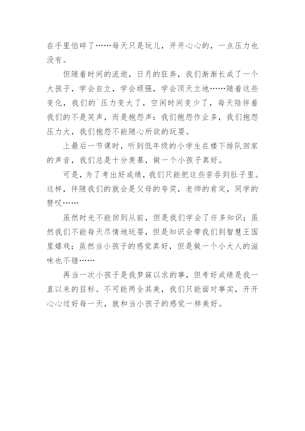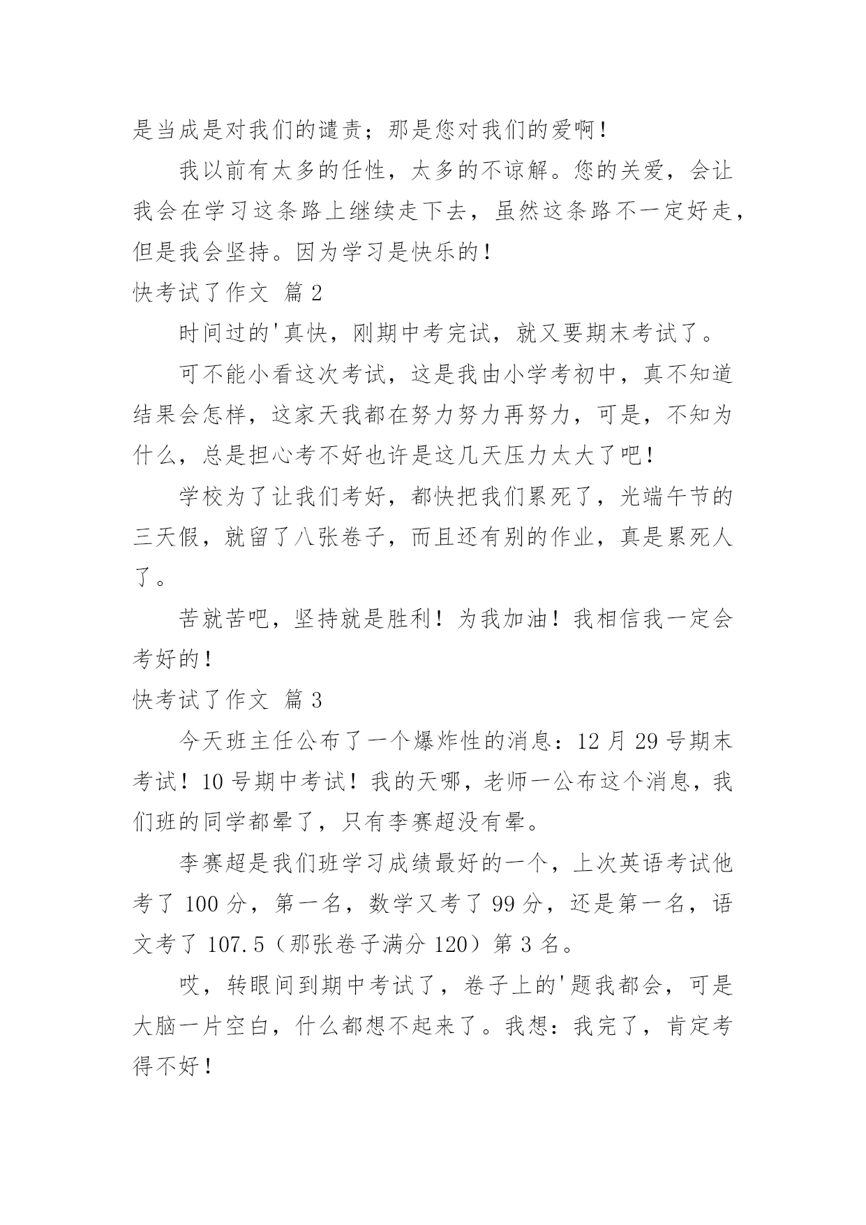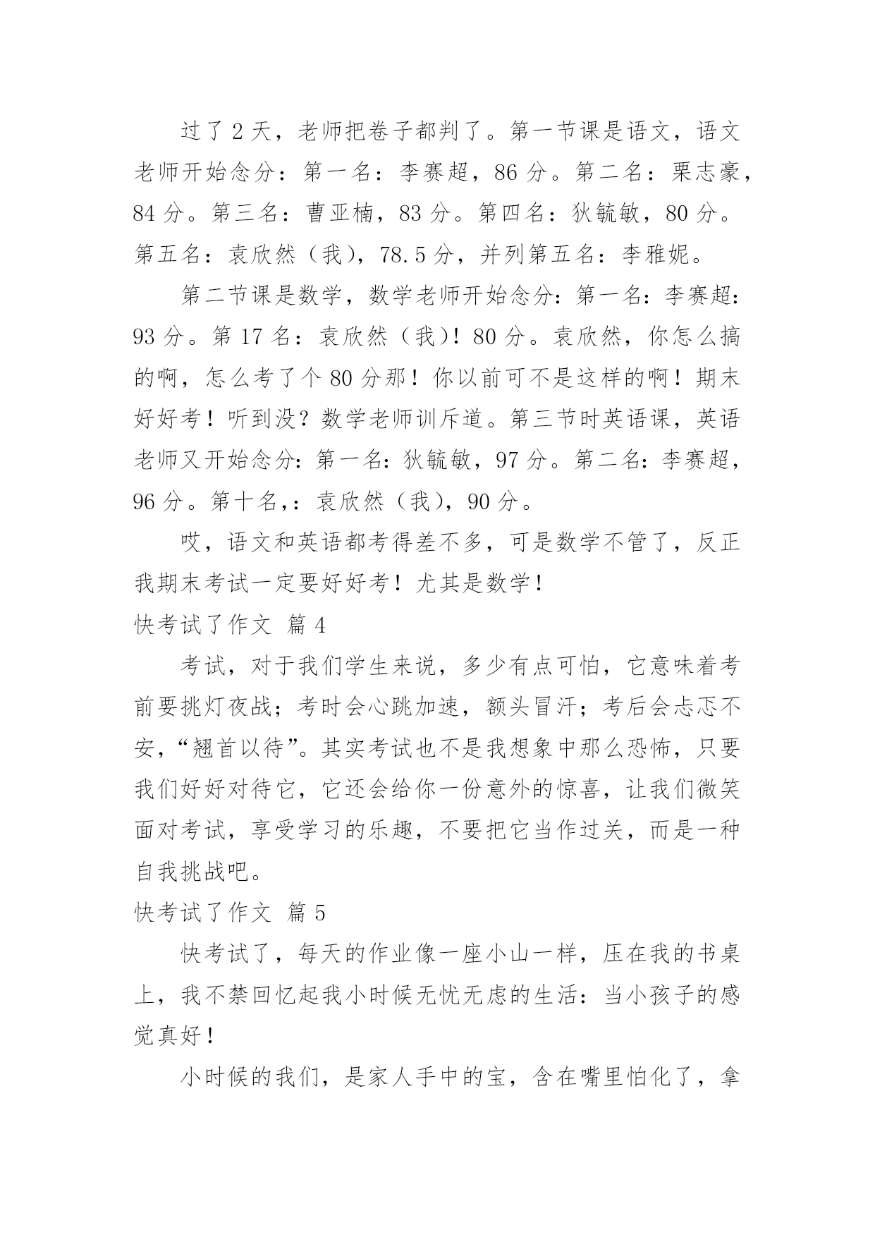快考试了作文 快考试了作文锦集5篇在学习、工作或生活中,大家总免不了要接触或使用作文吧,作文根据体裁的不同可以分为记叙文、说明文、应用文、议论文。相信许多人会觉得作文很难写吧,下面是小编为大家收集的快考试了作文5篇,希望能够帮助到大家。快考试了作文篇1快考试了,这不仅是我一年来来的付出的考验,其中掺杂了老师和家人对我们的期望,在学习的路上有欢笑、有泪水,但我相信,能坚持下去,我们依然很棒!学习中,有太多的收获,最不可思议的是,我竟然当了数学课代表,这让我有了压力,所以才有了积极进取的精神!我无时无刻都在为自己加油,因为有太多的原因是我自己没有太多的信心,但是为自己加油是我依然会做下去的事!师恩难忘,老师谢谢您这半年来对我的培养,我谢谢您们。妈妈谢谢你,是你的.母爱依然关爱我到现今在。我的身边有太多好人,我爱你们!我非常感谢你们,今天我不知道我为什么突然感慨万分,心里突然很激动,可能因为你们太爱我,我也太爱你们!我最感谢我现在的班主任,我本来对数学根本没有什么兴趣,是因为你对我的鼓励,你总是对我说加油别灰心,一次考得不好没关系!快考试了,你们放心,我一定不会让你们失望。老师我们非常对不起你们,你们的良苦用心我们总是当成是对我们的谴责;那是您对我们的爱啊!我以前有太多的任性,太多的不谅解。您的关爱,会让我会在学习这条路上继续走下去,虽然这条路不一定好走,但是我会坚持。因为学习是快乐的!快考试了作文篇2时间过的'真快,刚期中考完试,就又要期末考试了。可不能小看这次考试,这是我由小学考初中,真不知道结果会怎样,这家天我都在努力努力再努力,可是,不知为什么,总是担心考不好也许是这几天压力太大了吧!学校为了让我们考好,都快把我们累死了,光端午节的三天假,就留了八张卷子,而且还有别的作业,真是累死人了。苦就苦吧,坚持就是胜利!为我加油!我相信我一定会考好的!快考试了作文篇3今天班主任公布了一个爆炸性的消息:12月29号期末考试!10号期中考试!我的天哪,老师一公布这个消息,我们班的同学都晕了,只有李赛超没有晕。李赛超是我们班学习成绩最好的一个,上次英语考试他考了100分,第一名,数学又考了99分,还是第一名,语文考了107.5(那张卷子满分120)第3名。哎,转眼间到期中考试了,卷子上的'题我都会,可是大脑一片空白,什么都想不起来了。我想:我完了,肯定考得不好!过了2天,老师把卷子都判了。第一节课是语文,语文老师开始念分:第一名:李赛超,86分。第二名:栗志豪,84分。第三名:曹亚楠,83分。第四名:狄毓敏,80分。第五名:袁欣然(我),78.5分,并列第五名:李雅妮。第二节课是数学,数学老师开始念分:第一名:李赛超:93分。第17名:袁欣然(我)!80分。袁欣然,你怎么搞的啊,怎么考了个80分那!你以前可不是这样的啊!期末好好考!听到没?数学老师训斥道。第三节时英语课,英语老师又开始念分:第一名:狄毓敏,97分。第二名:李赛超,96分。第十名,:袁欣然(我),90分。哎,语文和英语都考得差不多,可是数学不管了,反正我期末考试一定要好好考!尤其是数学!快考试了作文篇4考试,对于我们学生来说,多少有点可怕,它意味着考前要挑灯夜战;考时会心跳加速,额头冒汗;考后会忐忑不安,“翘首以待”。其实考试也不是我想象中那么恐怖,只要我们好好对待它,它还会给你一份意外的惊喜,让我们微笑面对考试,享受学习的乐趣,不要把它当作过关,而是一种自我挑战吧。快考试了作文篇5快考试了,每天的作业像一座小山一样,压在我的书桌上,我不禁回忆起我小时候无忧无虑的生活:当小孩子的感觉真好!小时候的我们,是家人手中的宝,含在嘴里怕化了,拿在手里怕碎了……每天只是玩儿,开开心心的,一点压力也没有。但随着时间的流逝,日月的狂奔,我们渐渐长成了一个大孩子,学会自立,学会顽强,学会顶天立地……随着这些变化,我们的`压力变大了,空闲时间变少了,每天陪伴着我们的不是笑声,而是抱怨声:我们抱怨作业多,我们抱怨压力大,我们抱怨不能随心所欲的玩耍。上最后一节课时,听到低年级的小学生在楼下排队回家的声音,我们总是十分羡慕,做一个小孩子真好。可是,为了考出好成绩,我们只能把这些苦吞到肚子里。这样,伴随我们的就会是父母的夸奖,老师的肯定,同学的赞叹……虽然时光不能回到从前,但是我们学会了许多知识;虽然我们不能每天尽情地玩耍,但是知识会带我们到智慧王国里嬉戏;虽然当小孩子的感觉真好,但是做一个小大人的滋味也不错……再当一次小孩子是我梦寐以求的事,但考好成绩是我一直以来的目标。不可能两全其美,我们只能面对事实,开开心心过好每一天,就和当小孩子的感觉一样美好。