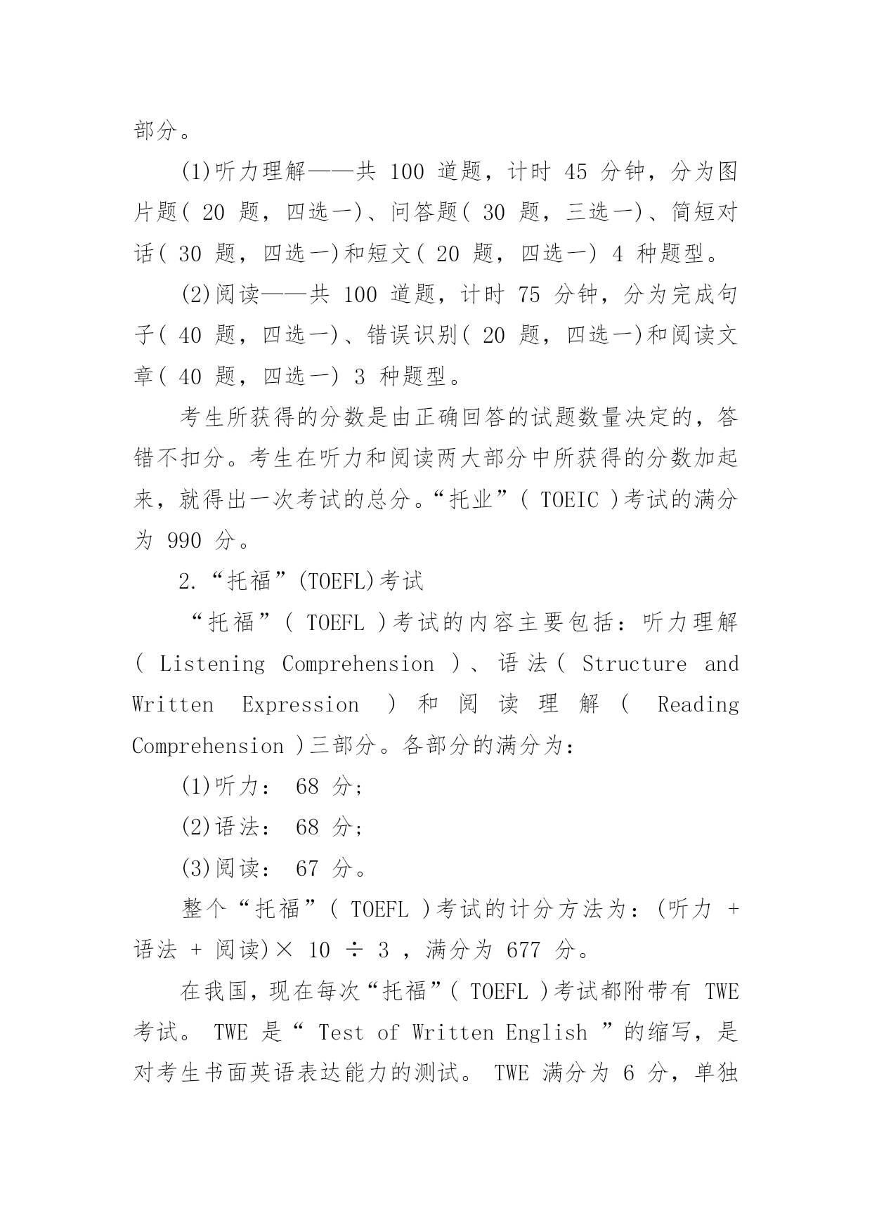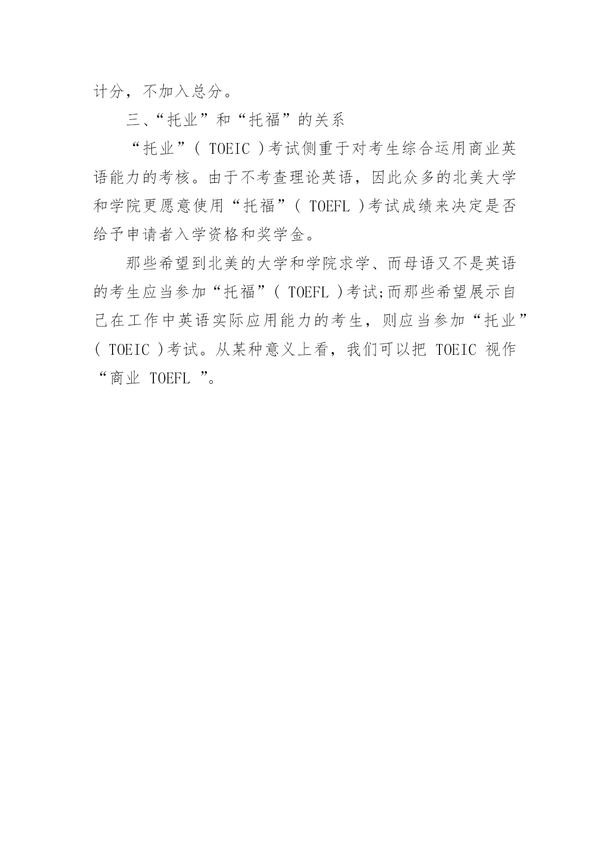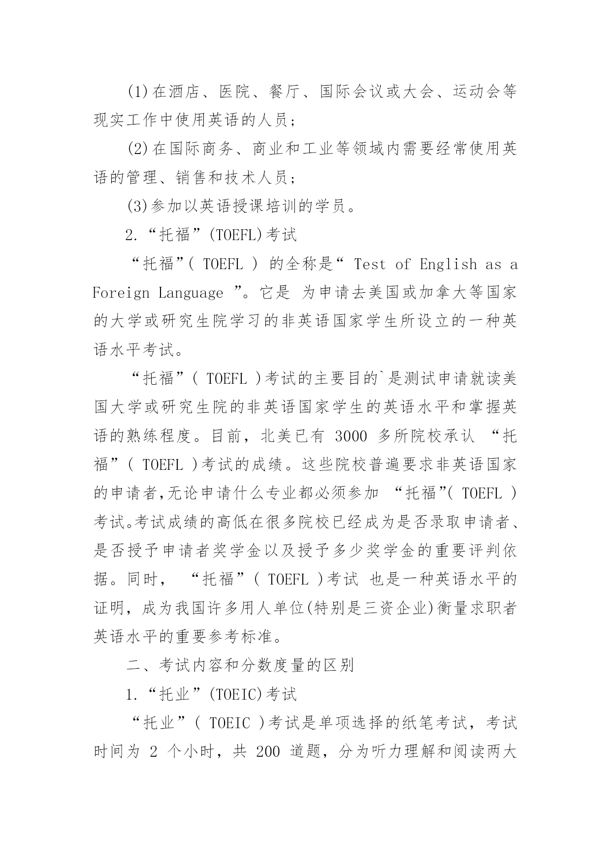 托福和托业的区别 托福和托业的区别由于缩写和读音的相近,考生往往容易把“托业”考试和在我国实行已久的“托福”考试相混淆;而且,这两种考试均由美国普林斯顿教育考试服务处(EducationalTestingService,简称ETS)开发和命题。但实际上,无论从考试性质、适用对象、考试内容和考试用途来看,这两种考试都有着很大的区别。跟着小编一起去看看吧。一、考试性质和对象的区别1.“托业”(TOEIC)考试“托业”(TOEIC)的全称是“TestofEnglishforInternationalCommunication(国际交流英语测评)”。它侧重于考查在国际工作环境中使用英语交流的人的英语能力。“托业”(TOEIC)考试目前主要被全球众多需要评估待聘员工及现有员工商业英语能力的机构所采用。在世界上,每年参加“托业”(TOEIC)考试的人次超过了300万,5000多家公司或机构承认并使用“托业”(TOEIC)考试成绩,其中包括地方性的中小企业、跨国公司、乃至各国的政府部门。“托业”(TOEIC)考试往往被视为一个重要的管理工具,帮助企业及政府部门作出相关的人事决定。根据“托业”(TOEIC)考试的官方说明,考试主要用来评估:(1)在酒店、医院、餐厅、国际会议或大会、运动会等现实工作中使用英语的人员;(2)在国际商务、商业和工业等领域内需要经常使用英语的管理、销售和技术人员;(3)参加以英语授课培训的学员。2.“托福”(TOEFL)考试“托福”(TOEFL)的全称是“TestofEnglishasaForeignLanguage”。它是为申请去美国或加拿大等国家的大学或研究生院学习的非英语国家学生所设立的一种英语水平考试。“托福”(TOEFL)考试的主要目的`是测试申请就读美国大学或研究生院的非英语国家学生的英语水平和掌握英语的熟练程度。目前,北美已有3000多所院校承认“托福”(TOEFL)考试的成绩。这些院校普遍要求非英语国家的申请者,无论申请什么专业都必须参加“托福”(TOEFL)考试。考试成绩的高低在很多院校已经成为是否录取申请者、是否授予申请者奖学金以及授予多少奖学金的重要评判依据。同时,“托福”(TOEFL)考试也是一种英语水平的证明,成为我国许多用人单位(特别是三资企业)衡量求职者英语水平的重要参考标准。二、考试内容和分数度量的区别1.“托业”(TOEIC)考试“托业”(TOEIC)考试是单项选择的纸笔考试,考试时间为2个小时,共200道题,分为听力理解和阅读两大部分。(1)听力理解——共100道题,计时45分钟,分为图片题(20题,四选一)、问答题(30题,三选一)、简短对话(30题,四选一)和短文(20题,四选一)4种题型。(2)阅读——共100道题,计时75分钟,分为完成句子(40题,四选一)、错误识别(20题,四选一)和阅读文章(40题,四选一)3种题型。考生所获得的分数是由正确回答的试题数量决定的,答错不扣分。考生在听力和阅读两大部分中所获得的分数加起来,就得出一次考试的总分。“托业”(TOEIC)考试的满分为990分。2.“托福”(TOEFL)考试“托福”(TOEFL)考试的内容主要包括:听力理解(ListeningComprehension)、语法(StructureandWrittenExpression)和阅读理解(ReadingComprehension)三部分。各部分的满分为:(1)听力:68分;(2)语法:68分;(3)阅读:67分。整个“托福”(TOEFL)考试的计分方法为:(听力+语法+阅读)×10÷3,满分为677分。在我国,现在每次“托福”(TOEFL)考试都附带有TWE考试。TWE是“TestofWrittenEnglish”的缩写,是对考生书面英语表达能力的测试。TWE满分为6分,单独计分,不加入总分。三、“托业”和“托福”的关系“托业”(TOEIC)考试侧重于对考生综合运用商业英语能力的考核。由于不考查理论英语,因此众多的北美大学和学院更愿意使用“托福”(TOEFL)考试成绩来决定是否给予申请者入学资格和奖学金。那些希望到北美的大学和学院求学、而母语又不是英语的考生应当参加“托福”(TOEFL)考试;而那些希望展示自己在工作中英语实际应用能力的考生,则应当参加“托业”(TOEIC)考试。从某种意义上看,我们可以把TOEIC视作“商业TOEFL”。