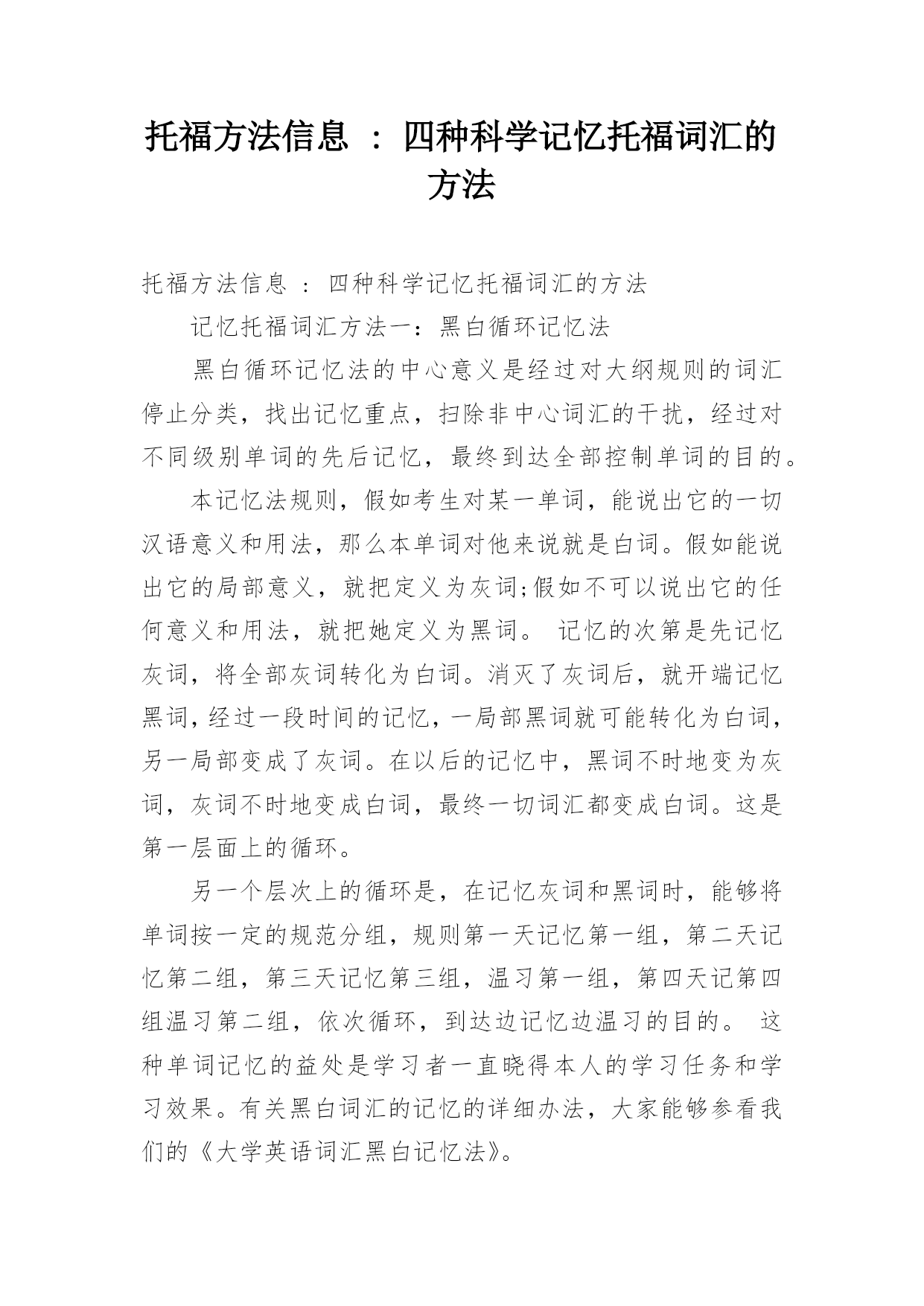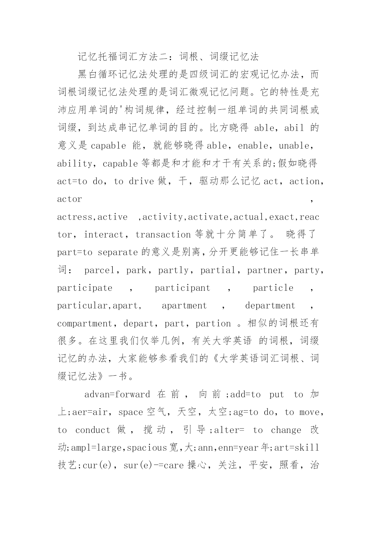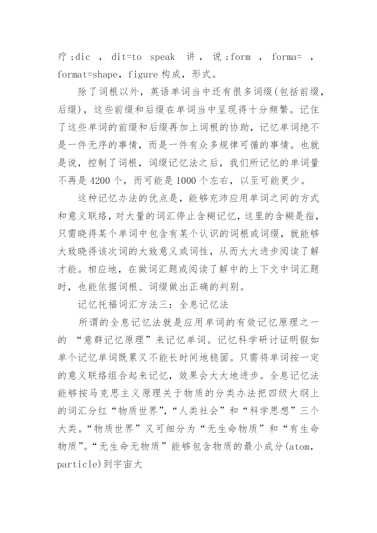 托福方法信息:四种科学记忆托福词汇的方法 托福方法信息:四种科学记忆托福词汇的方法记忆托福词汇方法一:黑白循环记忆法黑白循环记忆法的中心意义是经过对大纲规则的词汇停止分类,找出记忆重点,扫除非中心词汇的干扰,经过对不同级别单词的先后记忆,最终到达全部控制单词的目的。本记忆法规则,假如考生对某一单词,能说出它的一切汉语意义和用法,那么本单词对他来说就是白词。假如能说出它的局部意义,就把定义为灰词;假如不可以说出它的任何意义和用法,就把她定义为黑词。记忆的次第是先记忆灰词,将全部灰词转化为白词。消灭了灰词后,就开端记忆黑词,经过一段时间的记忆,一局部黑词就可能转化为白词,另一局部变成了灰词。在以后的记忆中,黑词不时地变为灰词,灰词不时地变成白词,最终一切词汇都变成白词。这是第一层面上的循环。另一个层次上的循环是,在记忆灰词和黑词时,能够将单词按一定的规范分组,规则第一天记忆第一组,第二天记忆第二组,第三天记忆第三组,温习第一组,第四天记第四组温习第二组,依次循环,到达边记忆边温习的目的。这种单词记忆的益处是学习者一直晓得本人的学习任务和学习效果。有关黑白词汇的记忆的详细办法,大家能够参看我们的《大学英语词汇黑白记忆法》。记忆托福词汇方法二:词根、词缀记忆法黑白循环记忆法处理的是四级词汇的宏观记忆办法,而词根词缀记忆法处理的是词汇微观记忆问题。它的特性是充沛应用单词的'构词规律,经过控制一组单词的共同词根或词缀,到达成串记忆单词的目的。比方晓得able,abil的意义是capable能,就能够晓得able,enable,unable,ability,capable等都是和才能和才干有关系的;假如晓得act=todo,todrive做,干,驱动那么记忆act,action,actor,actress,active,activity,activate,actual,exact,reactor,interact,transaction等就十分简单了。晓得了part=toseparate的意义是别离,分开更能够记住一长串单词:parcel,park,partly,partial,partner,party,participate,participant,particle,particular,apart,apartment,department,compartment,depart,part,partion。相似的词根还有很多。在这里我们仅举几例,有关大学英语的词根,词缀记忆的办法,大家能够参看我们的《大学英语词汇词根、词缀记忆法》一书。advan=forward在前,向前;add=toputto加上;aer=air,space空气,天空,太空;ag=todo,tomove,toconduct做,搅动,引导;alter=tochange改动;ampl=large,spacious宽,大;ann,enn=year年;art=skill技艺;cur(e),sur(e)-=care操心,关注,平安,照看,治疗;dic,dit=tospeak讲,说;form,forma=,format=shape,figure构成,形式。除了词根以外,英语单词当中还有很多词缀(包括前缀,后缀),这些前缀和后缀在单词当中呈现得十分频繁。记住了这些单词的前缀和后缀再加上词根的协助,记忆单词绝不是一件无序的事情,而是一件有众多规律可循的事情。也就是说,控制了词根,词缀记忆法之后,我们所记忆的单词量不再是4200个,而可能是1000个左右,以至可能更少。这种记忆办法的优点是,能够充沛应用单词之间的方式和意义联络,对大量的词汇停止含糊记忆,这里的含糊是指,只需晓得某个单词中包含有某个认识的词根或词缀,就能够大致晓得该次词的大致意义或词性,从而大大进步阅读了解才能。相应地,在做词汇题或阅读了解中的上下文中词汇题时,也能依据词根、词缀做出正确的判别。记忆托福词汇方法三:全息记忆法所谓的全息记忆法就是应用单词的有效记忆原理之一的“意群记忆原理”来记忆单词。记忆科学研讨证明假如单个记忆单词既累又不能长时间地稳固。只需将单词按一定的意义联络组合起来记忆,效果会大大地进步。全息记忆法能够按马克思主义原理关于物质的分类办法把四级大纲上的词汇分红“物质世界”,“人类社会”和“科学思想”三个大类。“物质世界”又可细分为“无生命物质”和“有生命物质”。“无生命无物质”能够包含物质的最小成分(atom,particle)到宇宙大