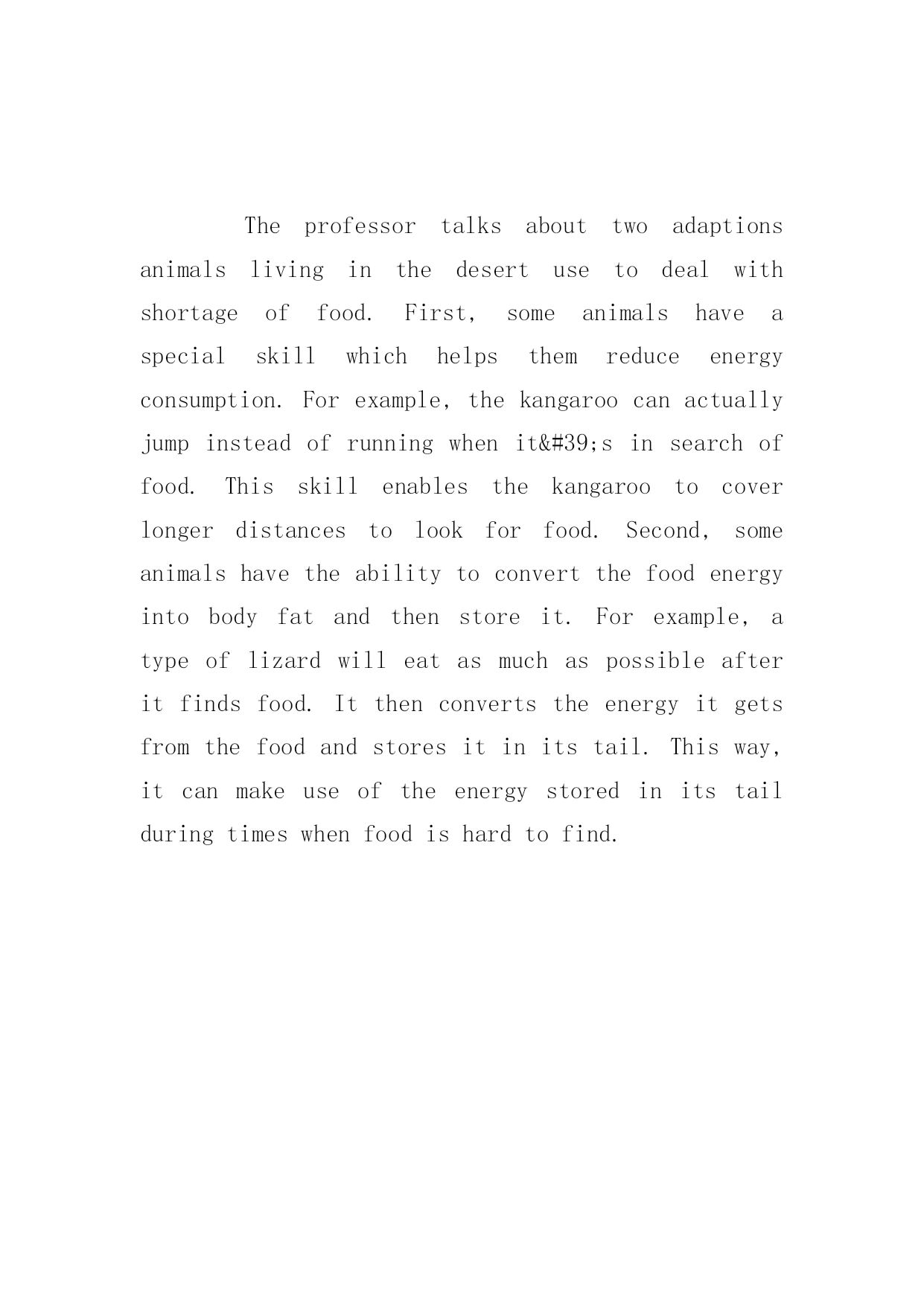 托福英语口语:沙漠中动物生存方式 托福英语口语范文:沙漠中动物生存方式 引言:对于正为托福考试熬夜备战的小伙伴们来说,攻下口语大关刻不容缓。接下来小编根据话题内容给大家分享一些托福英语口语范文。 2016年托福口语题目:沙漠中动物生存方式 沙漠中动物生存的两种方式。一是特殊的技巧,帮助减少能耗以走更远的路程来寻找食物,比如袋鼠可以用jump来代替run;二是把食物能量转换成bodyfat存储起来的'技能,比如一种蜥蜴在找到食物后会尽可能地多吃,然后把它们转换成能量储存在尾巴里,这样在长时间找不到食物的时候也可以利用尾巴里储存的能量。 托福口语模板及参考答案: Theprofessortalksabouttwoadaptionsanimalslivinginthedesertusetodealwithshortageoffood.First,someanimalshaveaspecialskillwhichhelpsthemreduceenergyconsumption.Forexample,thekangaroocanactuallyjumpinsteadofrunningwhenit'sinsearchoffood.Thisskillenablesthekangarootocoverlongerdistancestolookforfood.Second,someanimalshavetheabilitytoconvertthefoodenergyintobodyfatandthenstoreit.Forexample,atypeoflizardwilleatasmuchaspossibleafteritfindsfood.Itthenconvertstheenergyitgetsfromthefoodandstoresitinitstail.Thisway,itcanmakeuseoftheenergystoredinitstailduringtimeswhenfoodishardtofind.