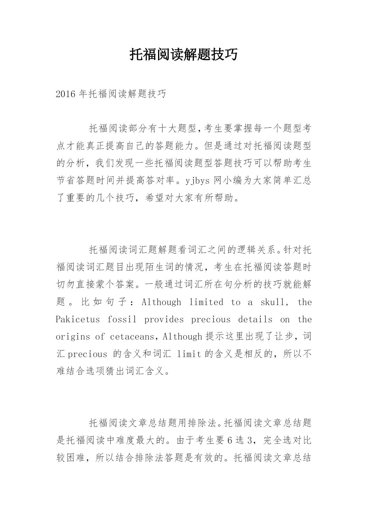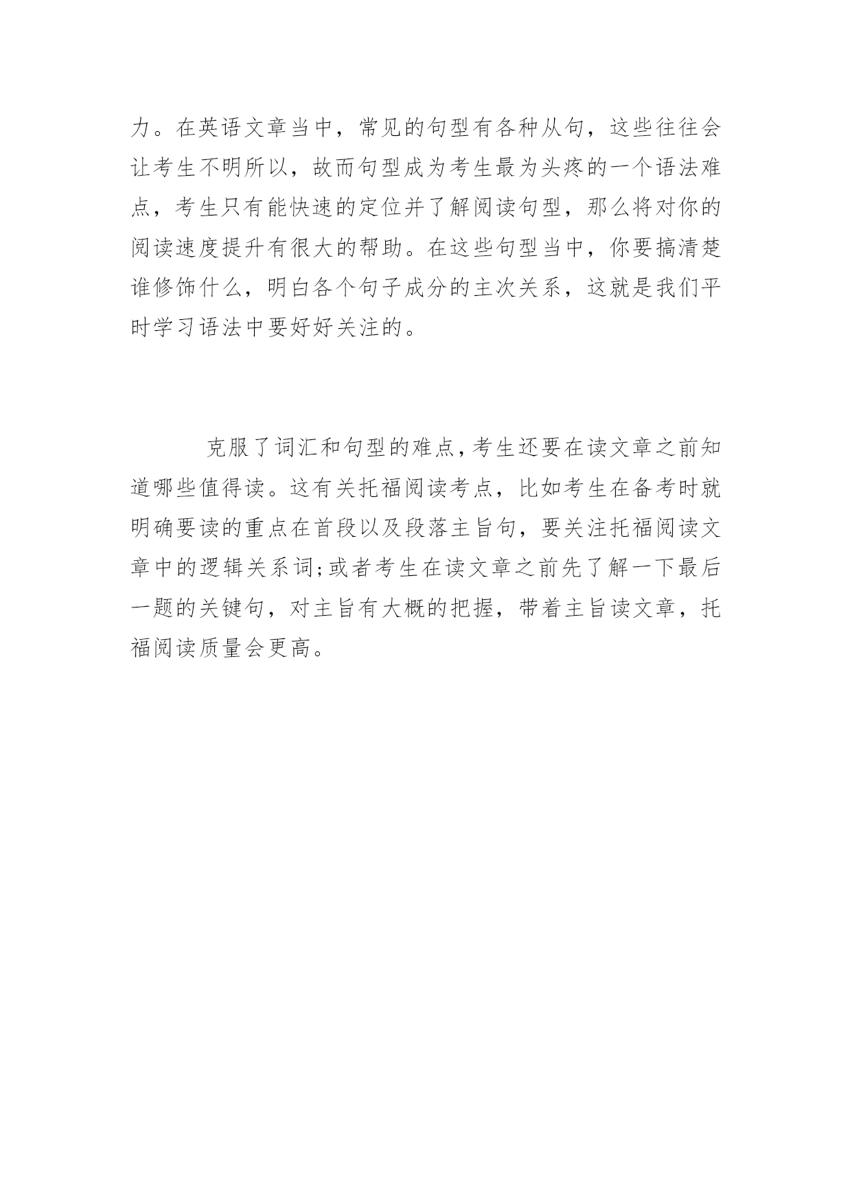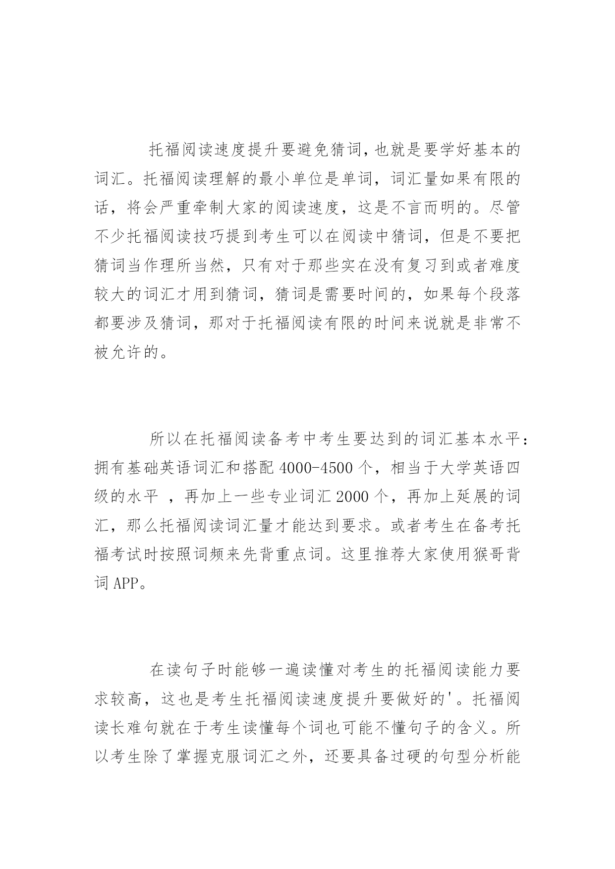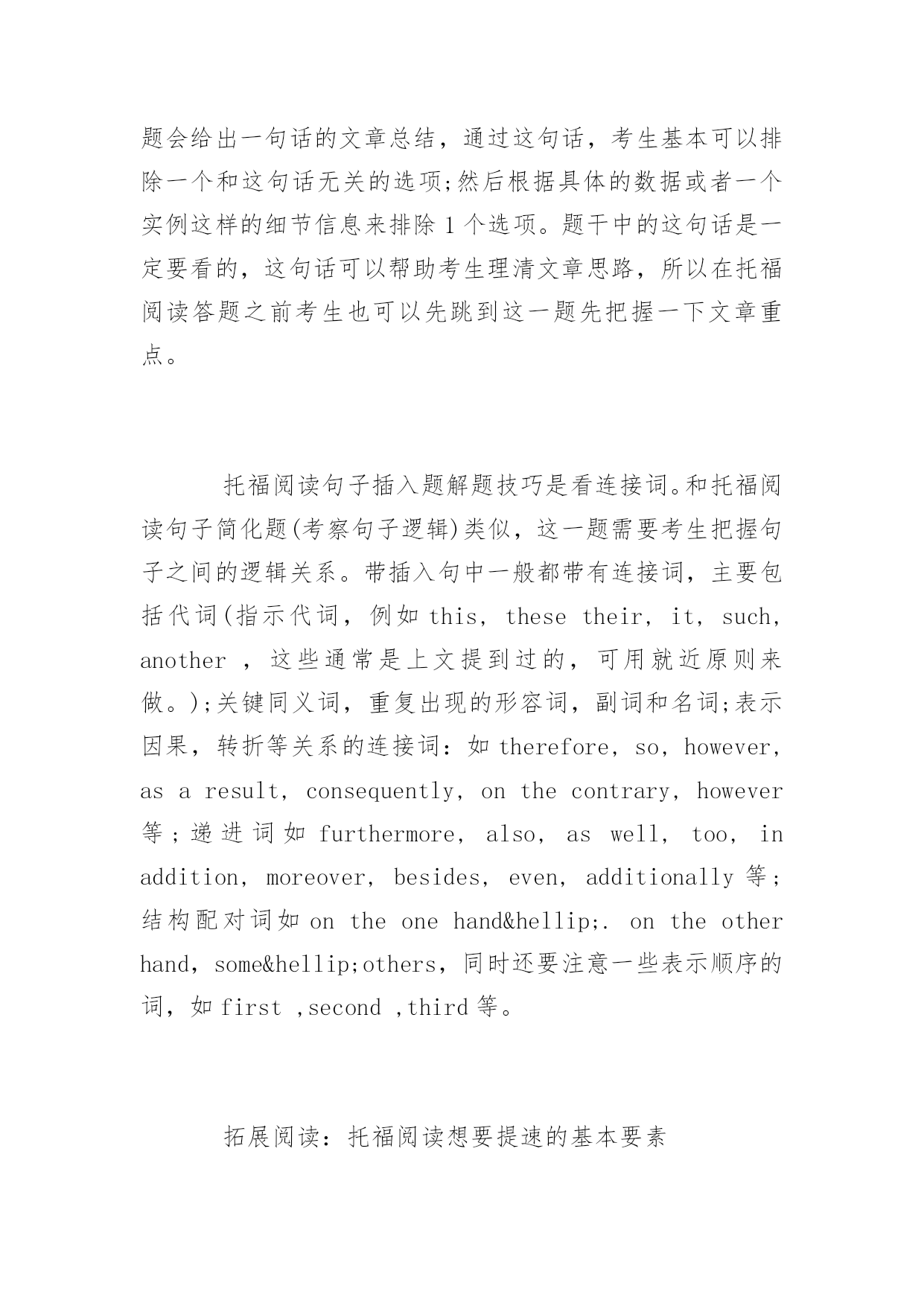 托福阅读解题技巧 2016年托福阅读解题技巧 托福阅读部分有十大题型,考生要掌握每一个题型考点才能真正提高自己的答题能力。但是通过对托福阅读题型的分析,我们发现一些托福阅读题型答题技巧可以帮助考生节省答题时间并提高答对率。yjbys网小编为大家简单汇总了重要的几个技巧,希望对大家有所帮助。 托福阅读词汇题解题看词汇之间的逻辑关系。针对托福阅读词汇题目出现陌生词的情况,考生在托福阅读答题时切勿直接蒙个答案。一般通过词汇所在句分析的技巧就能解题。比如句子:Althoughlimitedtoaskull,thePakicetusfossilprovidespreciousdetailsontheoriginsofcetaceans,Although提示这里出现了让步,词汇precious的含义和词汇limit的含义是相反的,所以不难结合选项猜出词汇含义。 托福阅读文章总结题用排除法。托福阅读文章总结题是托福阅读中难度最大的。由于考生要6选3,完全选对比较困难,所以结合排除法答题是有效的。托福阅读文章总结题会给出一句话的文章总结,通过这句话,考生基本可以排除一个和这句话无关的选项;然后根据具体的数据或者一个实例这样的细节信息来排除1个选项。题干中的这句话是一定要看的,这句话可以帮助考生理清文章思路,所以在托福阅读答题之前考生也可以先跳到这一题先把握一下文章重点。 托福阅读句子插入题解题技巧是看连接词。和托福阅读句子简化题(考察句子逻辑)类似,这一题需要考生把握句子之间的逻辑关系。带插入句中一般都带有连接词,主要包括代词(指示代词,例如this,thesetheir,it,such,another,这些通常是上文提到过的,可用就近原则来做。);关键同义词,重复出现的形容词,副词和名词;表示因果,转折等关系的连接词:如therefore,so,however,asaresult,consequently,onthecontrary,however等;递进词如furthermore,also,aswell,too,inaddition,moreover,besides,even,additionally等;结构配对词如ontheonehand….ontheotherhand,some…others,同时还要注意一些表示顺序的词,如first,second,third等。 拓展阅读:托福阅读想要提速的基本要素 托福阅读速度提升要避免猜词,也就是要学好基本的词汇。托福阅读理解的最小单位是单词,词汇量如果有限的话,将会严重牵制大家的阅读速度,这是不言而明的。尽管不少托福阅读技巧提到考生可以在阅读中猜词,但是不要把猜词当作理所当然,只有对于那些实在没有复习到或者难度较大的词汇才用到猜词,猜词是需要时间的,如果每个段落都要涉及猜词,那对于托福阅读有限的时间来说就是非常不被允许的。 所以在托福阅读备考中考生要达到的词汇基本水平:拥有基础英语词汇和搭配4000-4500个,相当于大学英语四级的水平,再加上一些专业词汇2000个,再加上延展的词汇,那么托福阅读词汇量才能达到要求。或者考生在备考托福考试时按照词频来先背重点词。这里推荐大家使用猴哥背词APP。 在读句子时能够一遍读懂对考生的托福阅读能力要求较高,这也是考生托福阅读速度提升要做好的'。托福阅读长难句就在于考生读懂每个词也可能不懂句子的含义。所以考生除了掌握克服词汇之外,还要具备过硬的句型分析能力。在英语文章当中,常见的句型有各种从句,这些往往会让考生不明所以,故而句型成为考生最为头疼的一个语法难点,考生只有能快速的定位并了解阅读句型,那么将对你的阅读速度提升有很大的帮助。在这些句型当中,你要搞清楚谁修饰什么,明白各个句子成分的主次关系,这就是我们平时学习语法中要好好关注的。 克服了词汇和句型的难点,考生还要在读文章之前知道哪些值得读。这有关托福阅读考点,比如考生在备考时就明确要读的重点在首段以及段落主旨句,要关注托福阅读文章中的逻辑关系词;或者考生在读文章之前先了解一下最后一题的关键句,对主旨有大概的把握,带着主旨读文章,托福阅读质量会更高。