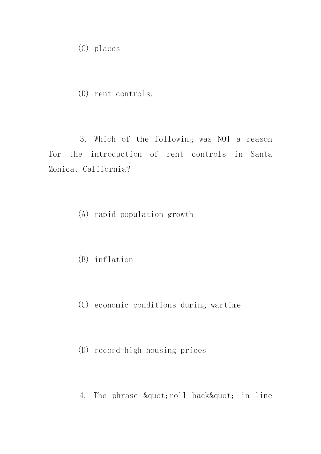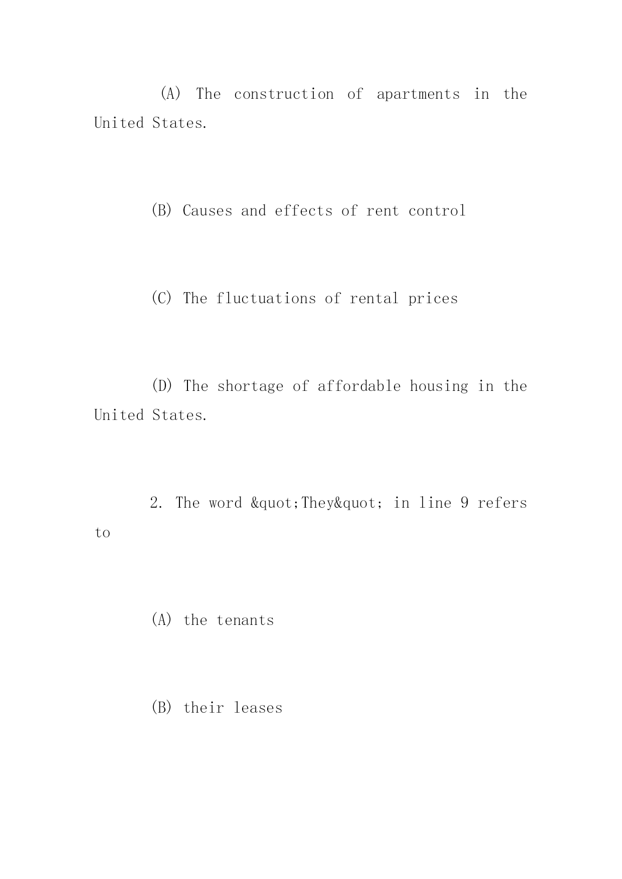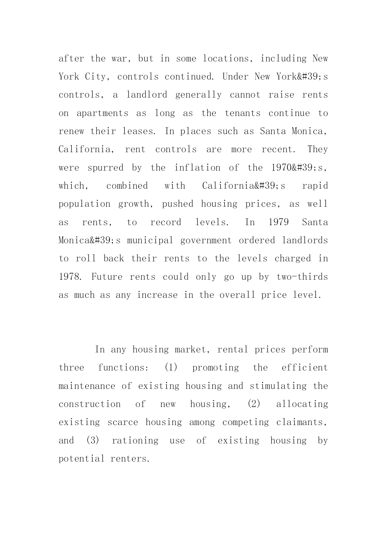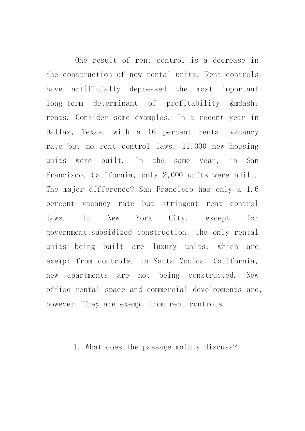 托福考试提分练习题 2017托福考试提分练习题 书山有路勤为径,学海无涯苦作舟。以下是小编为大家搜索整理的2017托福考试提分练习题,希望能给大家带来帮助!更多精彩内容请及时关注我们应届毕业生考试网! PASSAGE31 Rentcontrolisthesystemwherebythelocalgovernmenttellsbuildingownershowmuchtheycanchargetheirtenantsinrent.IntheUnitedStates,rentcontrolsdatebacktoatleastWorldWarII. In1943thefederalgovernmentimposedrentcontrolstohelpsolvetheproblemofhousingshortagesduringwartime.Thefederalprogramendedafterthewar,butinsomelocations,includingNewYorkCity,controlscontinued.UnderNewYork'scontrols,alandlordgenerallycannotraiserentsonapartmentsaslongasthetenantscontinuetorenewtheirleases.InplacessuchasSantaMonica,California,rentcontrolsaremorerecent.Theywerespurredbytheinflationofthe1970's,which,combinedwithCalifornia'srapidpopulationgrowth,pushedhousingprices,aswellasrents,torecordlevels.In1979SantaMonica'smunicipalgovernmentorderedlandlordstorollbacktheirrentstothelevelschargedin1978.Futurerentscouldonlygoupbytwo-thirdsasmuchasanyincreaseintheoverallpricelevel. Inanyhousingmarket,rentalpricesperformthreefunctions:(1)promotingtheefficientmaintenanceofexistinghousingandstimulatingtheconstructionofnewhousing,(2)allocatingexistingscarcehousingamongcompetingclaimants,and(3)rationinguseofexistinghousingbypotentialrenters. Oneresultofrentcontrolisadecreaseintheconstructionofnewrentalunits.Rentcontrolshaveartificiallydepressedthemostimportantlong-termdeterminantofprofitability—rents.Considersomeexamples.InarecentyearinDallas,Texas,witha16percentrentalvacancyratebutnorentcontrollaws,11,000newhousingunitswerebuilt.Inthesameyear,inSanFrancisco,California,only2,000unitswerebuilt.Themajordifference?SanFranciscohasonlya1.6percentvacancyratebutstringentrentcontrollaws.InNewYorkCity,exceptforgovernment-subsidizedconstruction,theonlyrentalunitsbeingbuiltareluxuryunits,whichareexemptfromcontrols.InSantaMonica,California,newapartmentsarenotbeingconstructed.Newofficerentalspaceandcommercialdevelopmentsare,however.Theyareexemptfromrentcontrols. 1.Whatdoesthepassagemainlydiscus