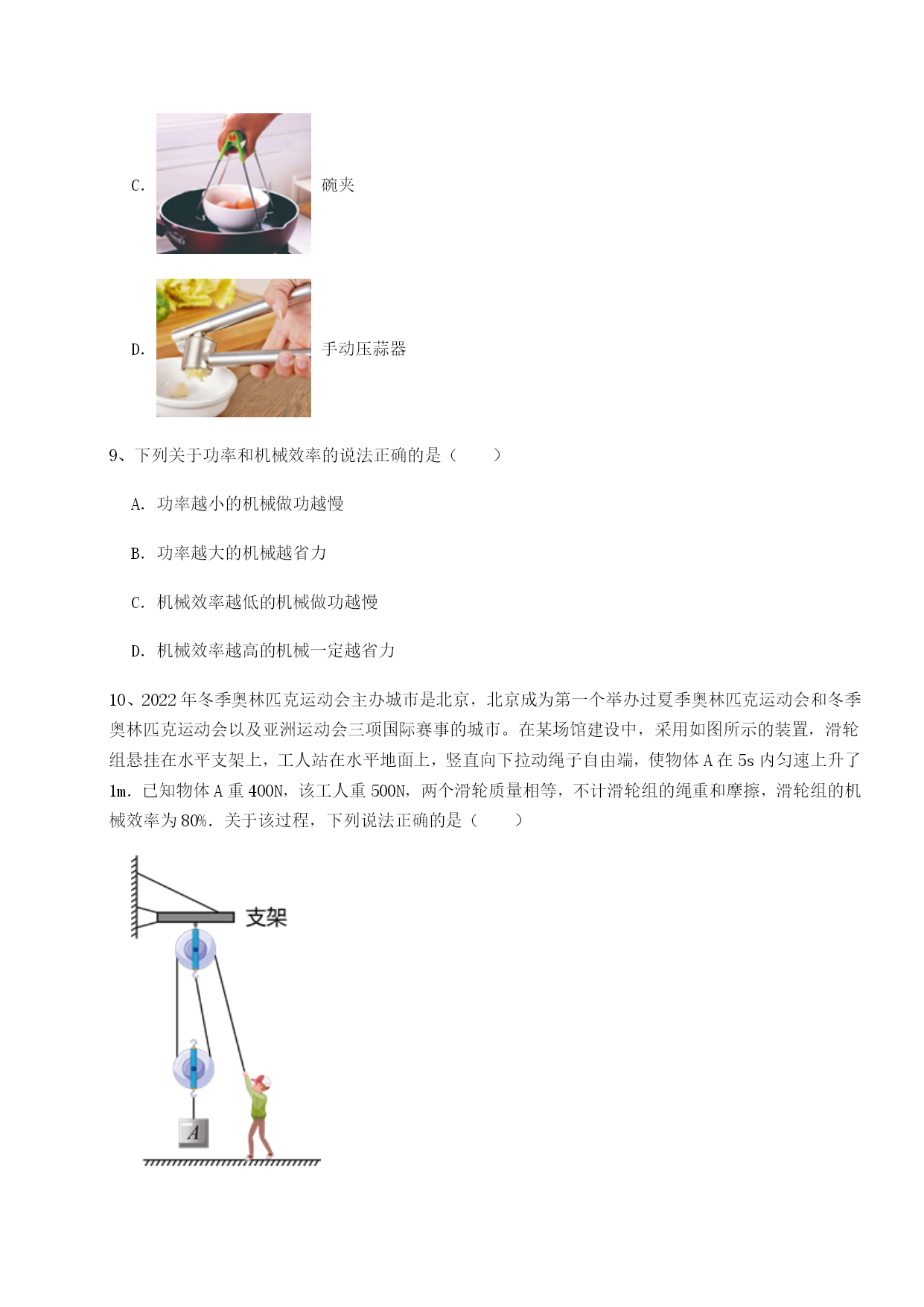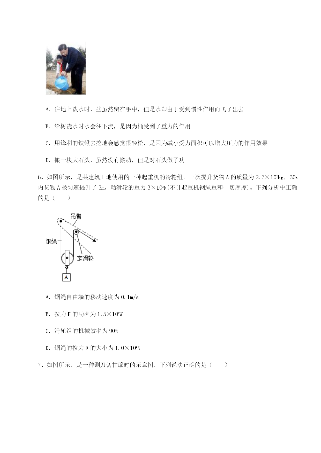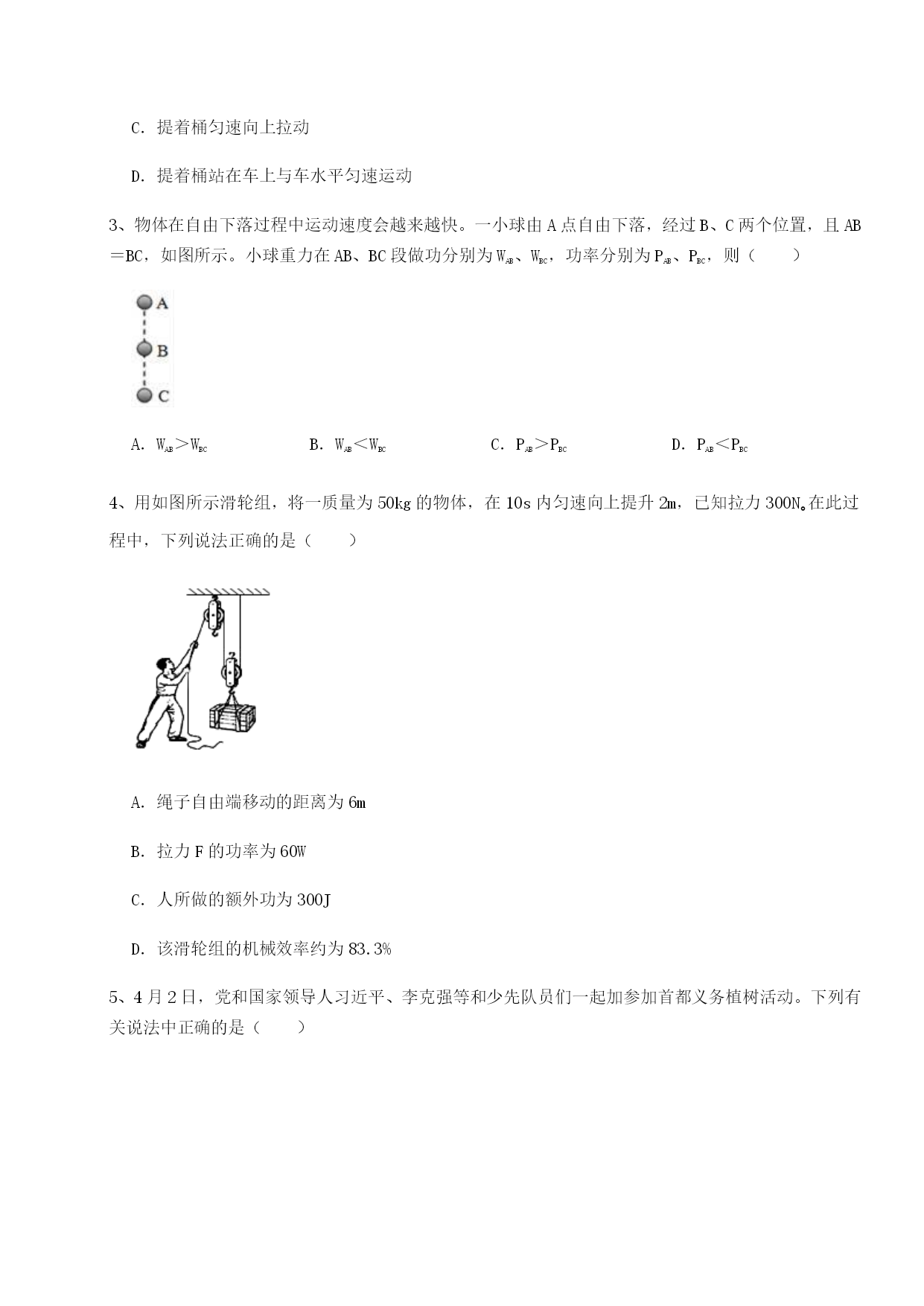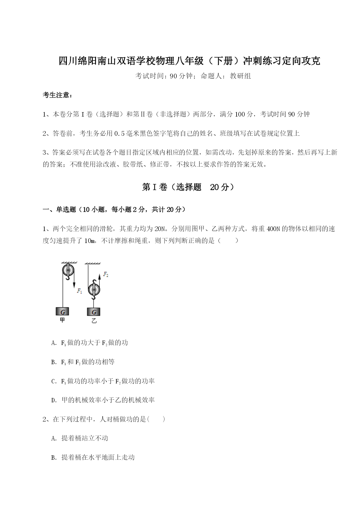 四川绵阳南山双语学校物理八年级(下册)冲刺练习定向攻克 考试时间:90分钟;命题人:教研组 考生注意: 1、本卷分第I卷(选择题)和第Ⅱ卷(非选择题)两部分,满分100分,考试时间90分钟 2、答卷前,考生务必用0.5毫米黑色签字笔将自己的姓名、班级填写在试卷规定位置上 3、答案必须写在试卷各个题目指定区域内相应的位置,如需改动,先划掉原来的答案,然后再写上新的答案;不准使用涂改液、胶带纸、修正带,不按以上要求作答的答案无效。 第I卷(选择题20分) 一、单选题(10小题,每小题2分,共计20分) 1、两个完全相同的滑轮,其重力均为20N。分别用图甲、乙两种方式,将重400N的物体以相同的速度匀速提升了10m,不计摩擦和绳重,则下列判断正确的是() A.F1做的功大于F2做的功 B.F1和F2做的功相等 C.F1做功的功率小于F2做功的功率 D.甲的机械效率小于乙的机械效率 2、在下列过程中,人对桶做功的是() A.提着桶站立不动 B.提着桶在水平地面上走动 C.提着桶匀速向上拉动 D.提着桶站在车上与车水平匀速运动 3、物体在自由下落过程中运动速度会越来越快。一小球由A点自由下落,经过B、C两个位置,且AB=BC,如图所示。小球重力在AB、BC段做功分别为WAB、WBC,功率分别为PAB、PBC,则() A.WAB>WBC B.WAB<WBC C.PAB>PBC D.PAB<PBC 4、用如图所示滑轮组,将一质量为50kg的物体,在10s内匀速向上提升2m,已知拉力300N。在此过程中,下列说法正确的是() A.绳子自由端移动的距离为6m B.拉力F的功率为60W C.人所做的额外功为300J D.该滑轮组的机械效率约为83.3% 5、4月2日,党和国家领导人习近平、李克强等和少先队员们一起加参加首都义务植树活动。下列有关说法中正确的是() A.往地上泼水时,盆虽然留在手中,但是水却由于受到惯性作用而飞了出去 B.给树浇水时水会往下流,是因为桶受到了重力的作用 C.用锋利的铁锹去挖地会感觉很轻松,是因为减小受力面积可以增大压力的作用效果 D.搬一块大石头,虽然没有搬动,但是对石头做了功 6、如图所示,是某建筑工地使用的一种起重机的滑轮组。一次提升货物A的质量为2.7×103kg,30s内货物A被匀速提升了3m,动滑轮的重力3×103N(不计起重机钢绳重和一切摩擦)。下列分析中正确的是() A.钢绳自由端的移动速度为0.1m/s B.拉力F的功率为1.5×103W C.滑轮组的机械效率为90% D.钢绳的拉力F的大小为1.0×104N 7、如图所示,是一种铡刀切甘蔗时的示意图,下列说法正确的是() A.刀刃很薄可以增大压力 B.铡刀实质上是一种费力杠杆 C.把甘蔗放在b点比放在a点更容易切断 D.手沿F2方向用力比沿F1方向时更省力 8、人体上的杠杆有很多,如手握拳向上运动时前臂骨骼就是一个杠杆(如图),下列生活用具正常使用时也是杠杆,其中与前臂骨骼同类的是() A.核桃夹 B.水龙头 C.碗夹 D.手动压蒜器 9、下列关于功率和机械效率的说法正确的是() A.功率越小的机械做功越慢 B.功率越大的机械越省力 C.机械效率越低的机械做功越慢 D.机械效率越高的机械一定越省力 10、2022年冬季奥林匹克运动会主办城市是北京,北京成为第一个举办过夏季奥林匹克运动会和冬季奥林匹克运动会以及亚洲运动会三项国际赛事的城市。在某场馆建设中,采用如图所示的装置,滑轮组悬挂在水平支架上,工人站在水平地面上,竖直向下拉动绳子自由端,使物体A在5s内匀速上升了1m.已知物体A重400N,该工人重500N,两个滑轮质量相等,不计滑轮组的绳重和摩擦,滑轮组的机械效率为80%.关于该过程,下列说法正确的是() A.水平地面对工人的支持力为300N B.动滑轮重为50N C.人对绳子拉力的功率为120W D.支架受到滑轮组的拉力为850N 第Ⅱ卷(非选择题80分) 二、填空题(5小题,每小题4分,共计20分) 1、如图甲所示,放在水平地面上的物体,受到方向不变的水平推力F的作用,F的大小与时间t的关系如图乙所示,物体运动速度v与时间t的关系如图丙所示,由图象可知t=0~2s物体处于(选填“运动“或“静止”)状态,水平推力F做的功为J;t=4~6s,物体经过的距离为m,水平推力F做的功为J。 2、某班级组织了一次物理课外实践活动,比较全班同学中从一楼爬上三楼过程中谁的爬楼功率最大。为了简便获得比赛结果,则活动中至少测量的物理量是:人体的体重和。实验结束后,有位质量为50kg同学进行爬杆训练,当他沿竖直杆匀速上爬时,人受到的摩擦力大小为N,方向。 3、某同学用如图所示装置进行实验。图甲中直接用弹簧测力计匀速提升重物高度为h过程中,弹簧测力