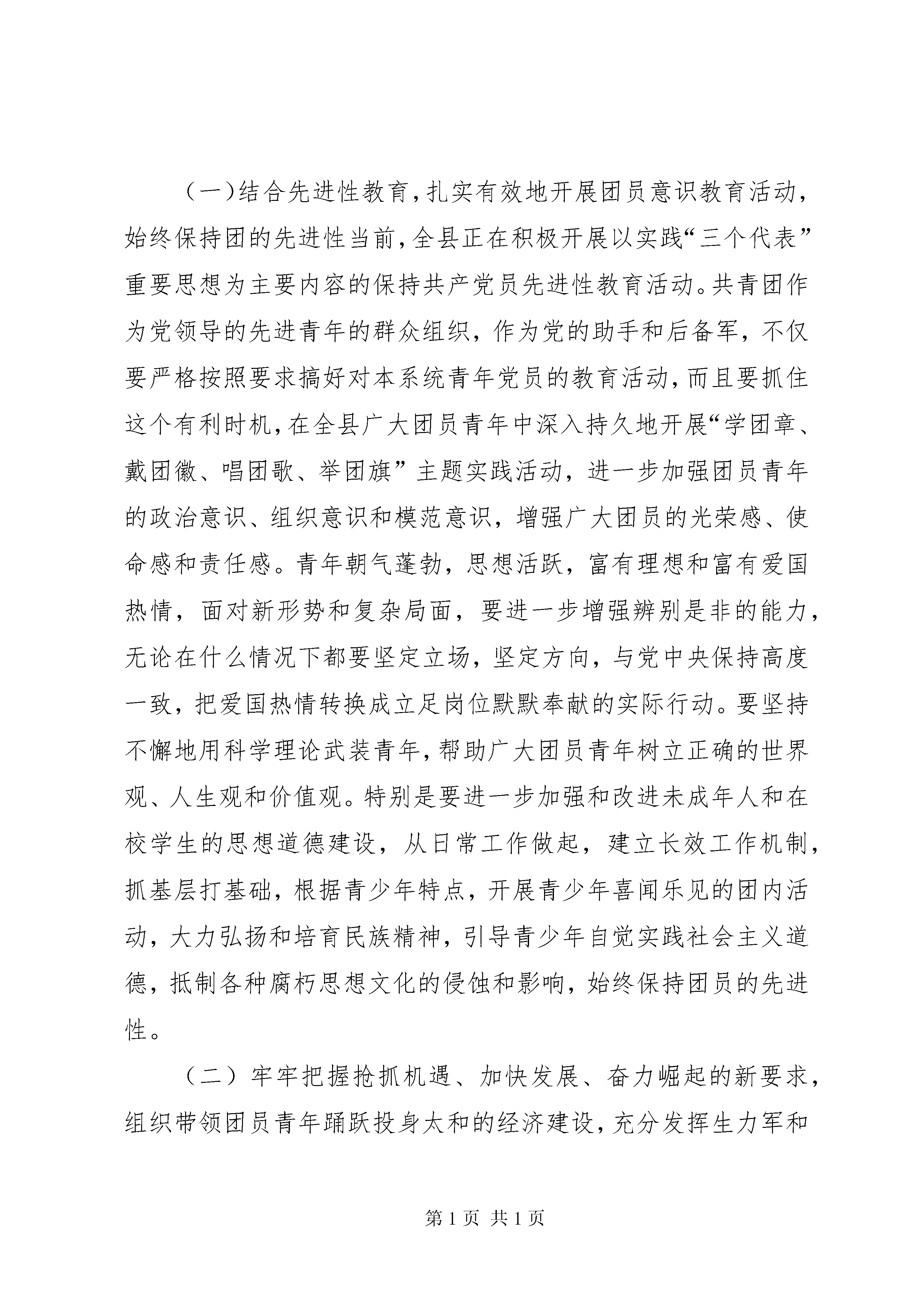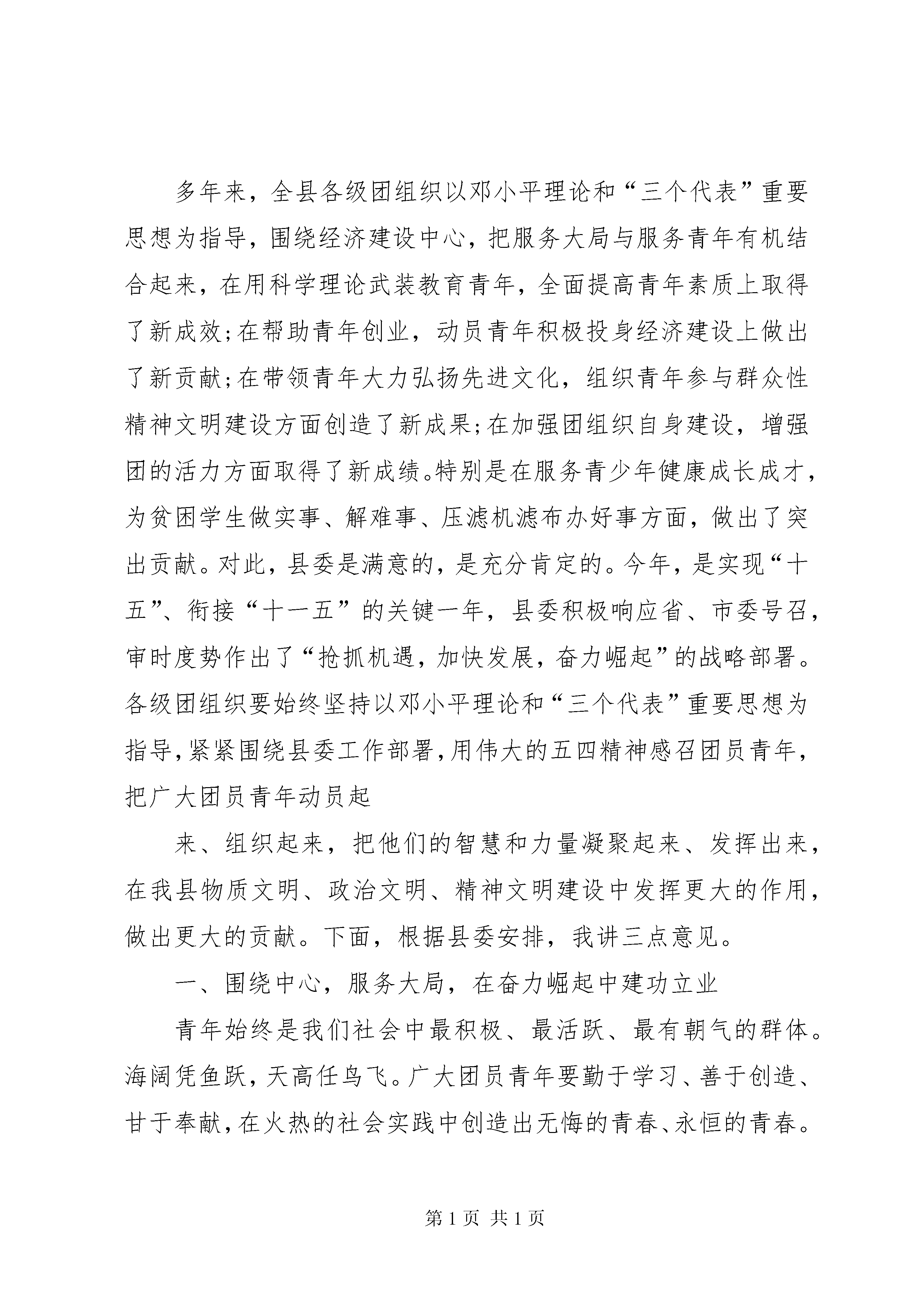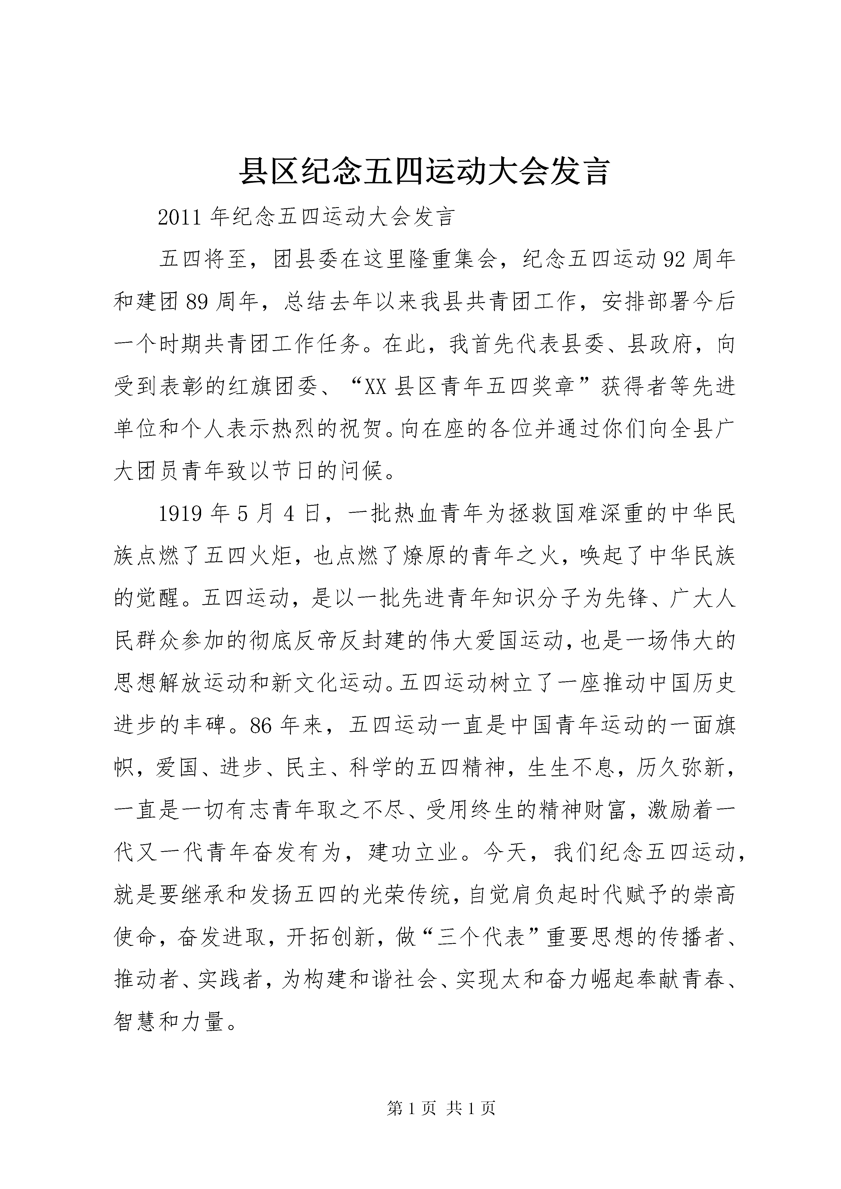 县区纪念五四运动大会发言2011年纪念五四运动大会发言五四将至,团县委在这里隆重集会,纪念五四运动92周年和建团89周年,总结去年以来我县共青团工作,安排部署今后一个时期共青团工作任务。在此,我首先代表县委、县政府,向受到表彰的红旗团委、“XX县区青年五四奖章”获得者等先进单位和个人表示热烈的祝贺。向在座的各位并通过你们向全县广大团员青年致以节日的问候。1919年5月4日,一批热血青年为拯救国难深重的中华民族点燃了五四火炬,也点燃了燎原的青年之火,唤起了中华民族的觉醒。五四运动,是以一批先进青年知识分子为先锋、广大人民群众参加的彻底反帝反封建的伟大爱国运动,也是一场伟大的思想解放运动和新文化运动。五四运动树立了一座推动中国历史进步的丰碑。86年来,五四运动一直是中国青年运动的一面旗帜,爱国、进步、民主、科学的五四精神,生生不息,历久弥新,一直是一切有志青年取之不尽、受用终生的精神财富,激励着一代又一代青年奋发有为,建功立业。今天,我们纪念五四运动,就是要继承和发扬五四的光荣传统,自觉肩负起时代赋予的崇高使命,奋发进取,开拓创新,做“三个代表”重要思想的传播者、推动者、实践者,为构建和谐社会、实现太和奋力崛起奉献青春、智慧和力量。多年来,全县各级团组织以邓小平理论和“三个代表”重要思想为指导,围绕经济建设中心,把服务大局与服务青年有机结合起来,在用科学理论武装教育青年,全面提高青年素质上取得了新成效;在帮助青年创业,动员青年积极投身经济建设上做出了新贡献;在带领青年大力弘扬先进文化,组织青年参与群众性精神文明建设方面创造了新成果;在加强团组织自身建设,增强团的活力方面取得了新成绩。特别是在服务青少年健康成长成才,为贫困学生做实事、解难事、压滤机滤布办好事方面,做出了突出贡献。对此,县委是满意的,是充分肯定的。今年,是实现“十五”、衔接“十一五”的关键一年,县委积极响应省、市委号召,审时度势作出了“抢抓机遇,加快发展,奋力崛起”的战略部署。各级团组织要始终坚持以邓小平理论和“三个代表”重要思想为指导,紧紧围绕县委工作部署,用伟大的五四精神感召团员青年,把广大团员青年动员起来、组织起来,把他们的智慧和力量凝聚起来、发挥出来,在我县物质文明、政治文明、精神文明建设中发挥更大的作用,做出更大的贡献。下面,根据县委安排,我讲三点意见。一、围绕中心,服务大局,在奋力崛起中建功立业青年始终是我们社会中最积极、最活跃、最有朝气的群体。海阔凭鱼跃,天高任鸟飞。广大团员青年要勤于学习、善于创造、甘于奉献,在火热的社会实践中创造出无悔的青春、永恒的青春。(一)结合先进性教育,扎实有效地开展团员意识教育活动,始终保持团的先进性当前,全县正在积极开展以实践“三个代表”重要思想为主要内容的保持共产党员先进性教育活动。共青团作为党领导的先进青年的群众组织,作为党的助手和后备军,不仅要严格按照要求搞好对本系统青年党员的教育活动,而且要抓住这个有利时机,在全县广大团员青年中深入持久地开展“学团章、戴团徽、唱团歌、举团旗”主题实践活动,进一步加强团员青年的政治意识、组织意识和模范意识,增强广大团员的光荣感、使命感和责任感。青年朝气蓬勃,思想活跃,富有理想和富有爱国热情,面对新形势和复杂局面,要进一步增强辨别是非的能力,无论在什么情况下都要坚定立场,坚定方向,与党中央保持高度一致,把爱国热情转换成立足岗位默默奉献的实际行动。要坚持不懈地用科学理论武装青年,帮助广大团员青年树立正确的世界观、人生观和价值观。特别是要进一步加强和改进未成年人和在校学生的思想道德建设,从日常工作做起,建立长效工作机制,抓基层打基础,根据青少年特点,开展青少年喜闻乐见的团内活动,大力弘扬和培育民族精神,引导青少年自觉实践社会主义道德,抵制各种腐朽思想文化的侵蚀和影响,始终保持团员的先进性。(二)牢牢把握抢抓机遇、加快发展、奋力崛起的新要求,组织带领团员青年踊跃投身太和的经济建设,充分发挥生力军和突击队作用经济建设领域是广大青年发挥生力军作用的主战场。各级团组织要带领广大青年积极投身太和经济建设的伟大实践。要着眼于服务农村经济发展,引导青年认真贯彻落实中央的支农惠农政策,在搞好粮食生产、调整农业结构、推广农业技术、发展农业产业化经营、加强农业基础设施建设等方面施展本领。要着眼于提高科技自主创新能力,引导青年增强创新意识,立足本职岗位开展发明创造活动,为实现技术的跨越式发展、增强企业的核心竞争力充分发挥聪明才智。要着眼于深入推进经济体制改革,引导青年保持锐意改革的热情和勇气,坚定地支持县委、县政府的重大改革举措,为进一步深化改革出谋划策、贡献智慧。要继续深入开展青年创业行动,鼓励和引导更多的青年艰苦创业,动员和组织当地青年大胆创业,为促进太和经济协调发展多做工作。要充分