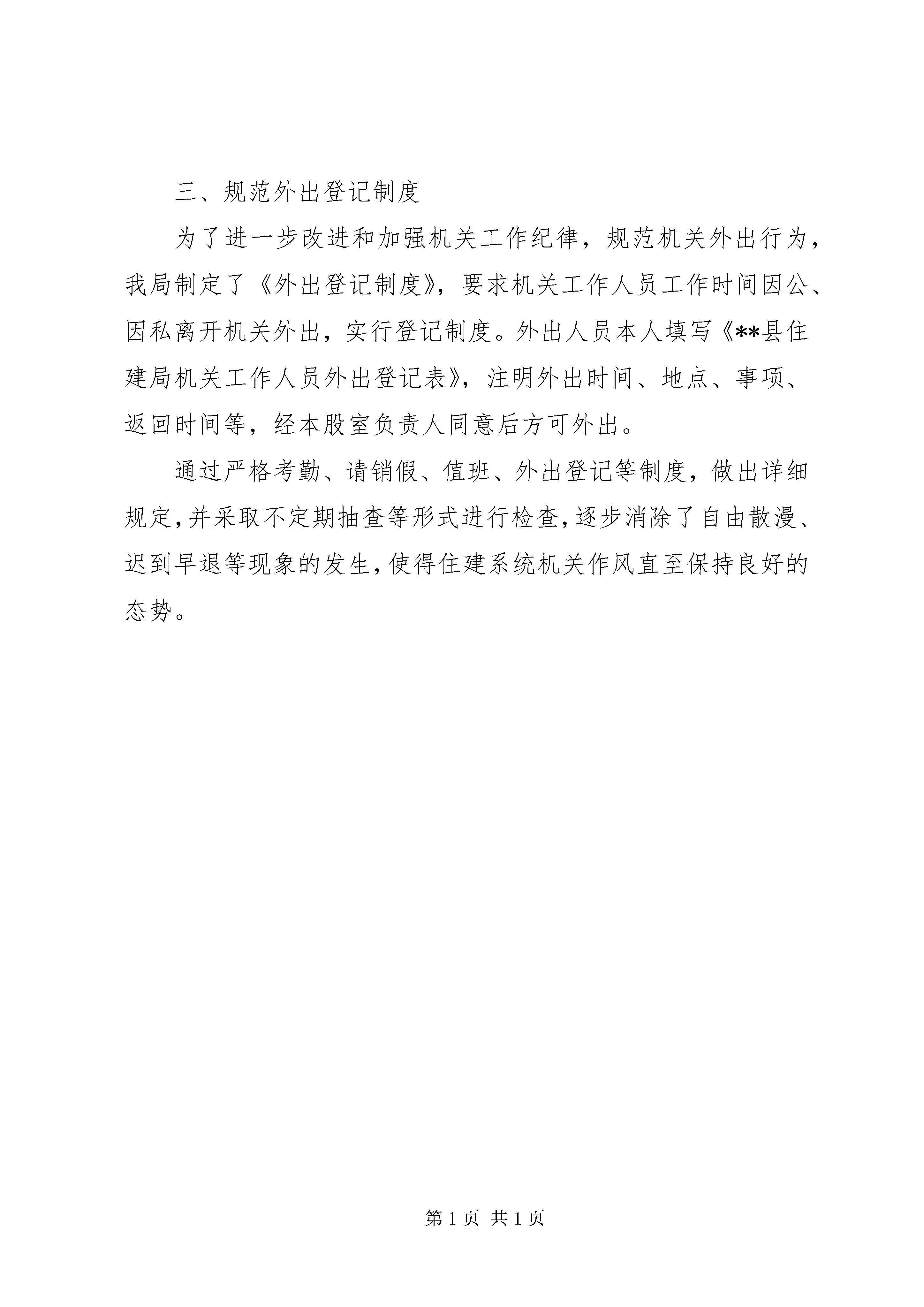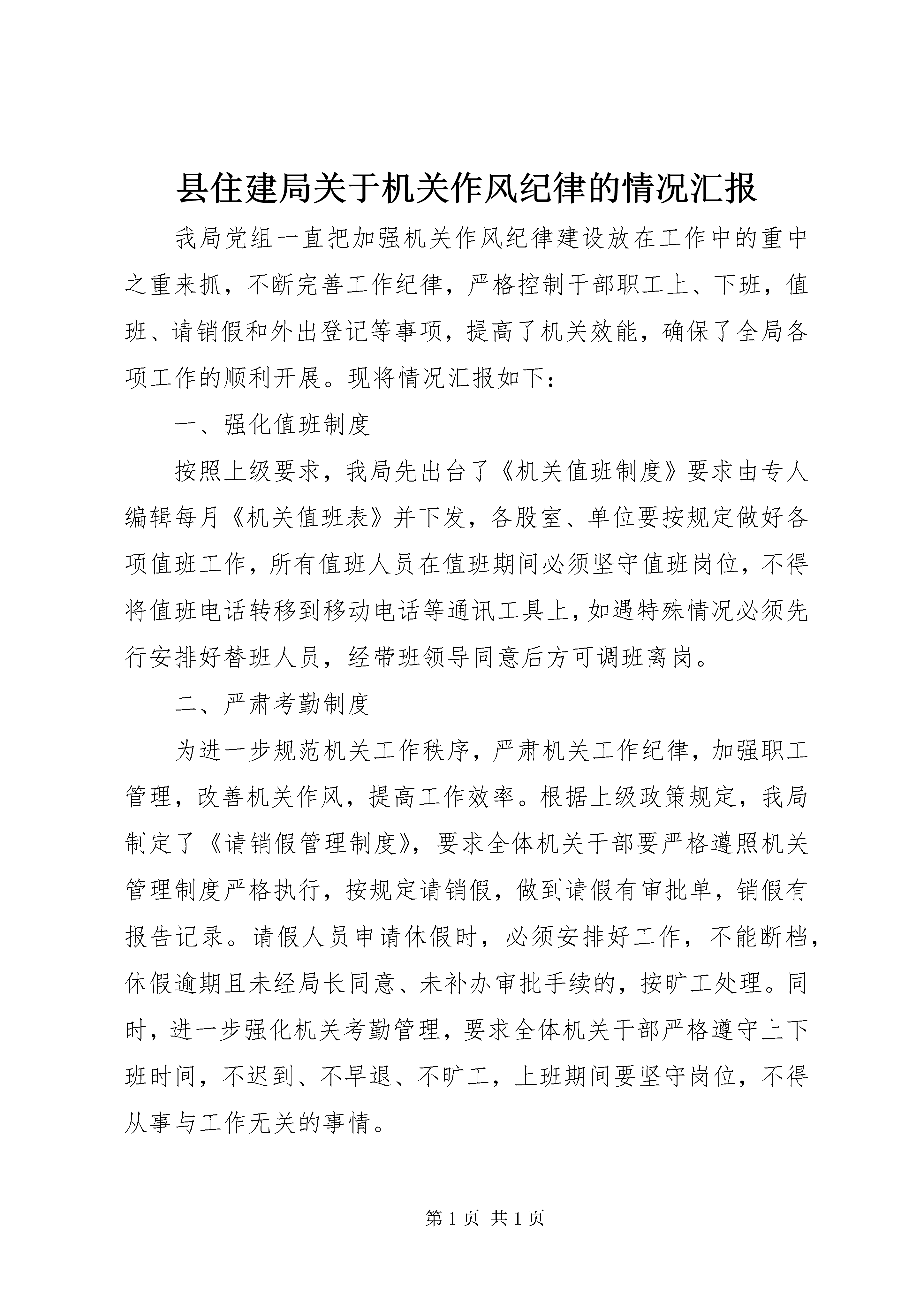 县住建局关于机关作风纪律的情况汇报我局党组一直把加强机关作风纪律建设放在工作中的重中之重来抓,不断完善工作纪律,严格控制干部职工上、下班,值班、请销假和外出登记等事项,提高了机关效能,确保了全局各项工作的顺利开展。现将情况汇报如下:一、强化值班制度按照上级要求,我局先出台了《机关值班制度》要求由专人编辑每月《机关值班表》并下发,各股室、单位要按规定做好各项值班工作,所有值班人员在值班期间必须坚守值班岗位,不得将值班电话转移到移动电话等通讯工具上,如遇特殊情况必须先行安排好替班人员,经带班领导同意后方可调班离岗。二、严肃考勤制度为进一步规范机关工作秩序,严肃机关工作纪律,加强职工管理,改善机关作风,提高工作效率。根据上级政策规定,我局制定了《请销假管理制度》,要求全体机关干部要严格遵照机关管理制度严格执行,按规定请销假,做到请假有审批单,销假有报告记录。请假人员申请休假时,必须安排好工作,不能断档,休假逾期且未经局长同意、未补办审批手续的,按旷工处理。同时,进一步强化机关考勤管理,要求全体机关干部严格遵守上下班时间,不迟到、不早退、不旷工,上班期间要坚守岗位,不得从事与工作无关的事情。三、规范外出登记制度为了进一步改进和加强机关工作纪律,规范机关外出行为,我局制定了《外出登记制度》,要求机关工作人员工作时间因公、因私离开机关外出,实行登记制度。外出人员本人填写《**县住建局机关工作人员外出登记表》,注明外出时间、地点、事项、返回时间等,经本股室负责人同意后方可外出。通过严格考勤、请销假、值班、外出登记等制度,做出详细规定,并采取不定期抽查等形式进行检查,逐步消除了自由散漫、迟到早退等现象的发生,使得住建系统机关作风直至保持良好的态势。