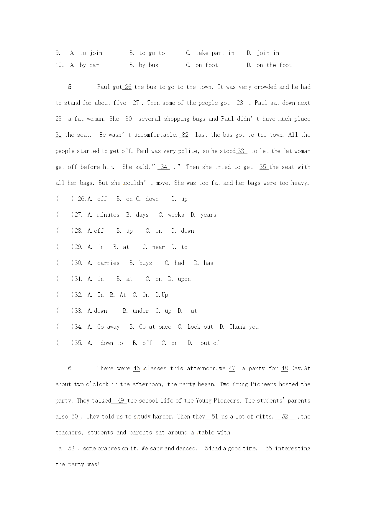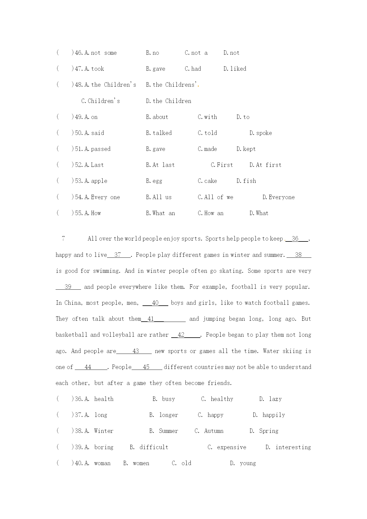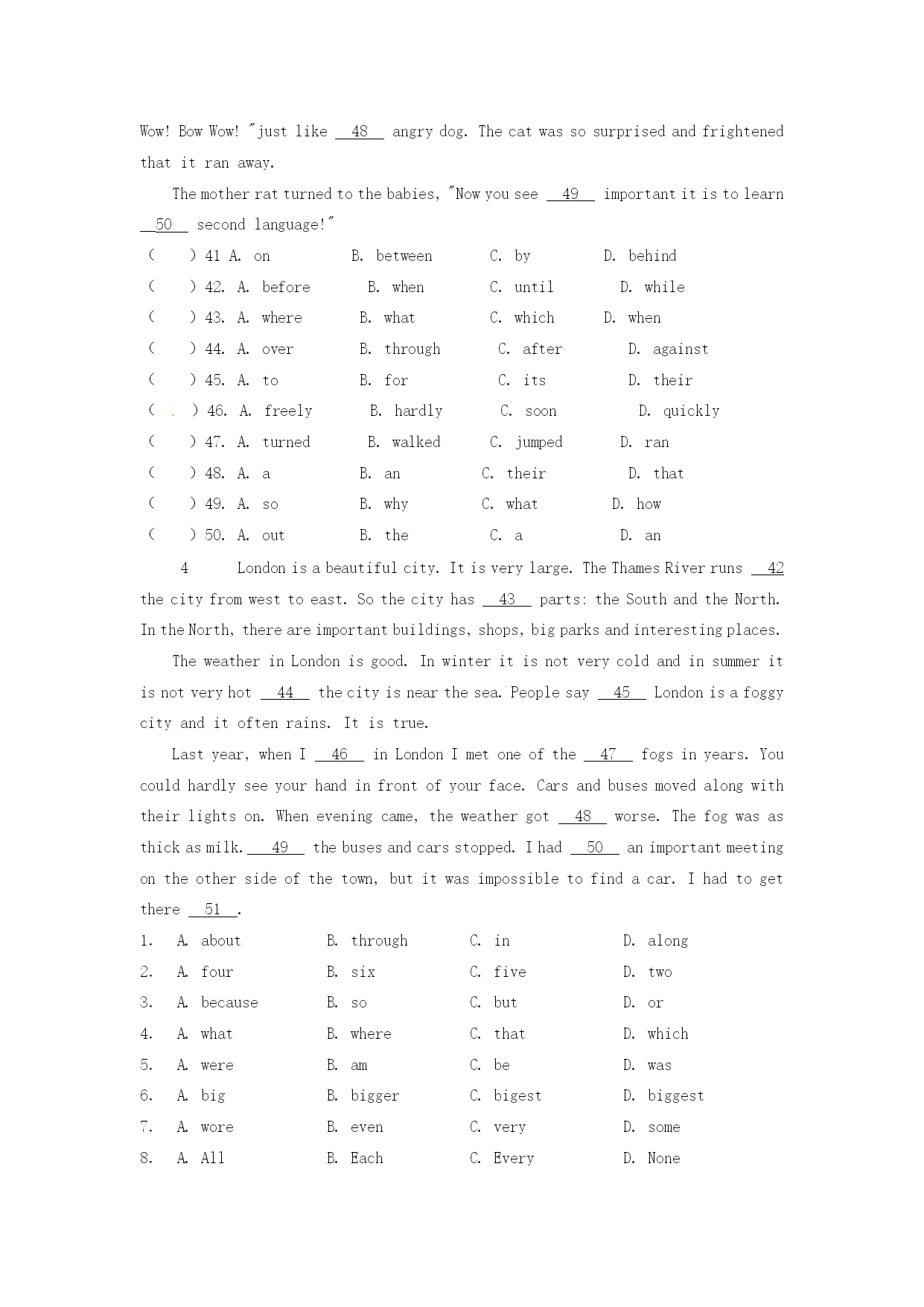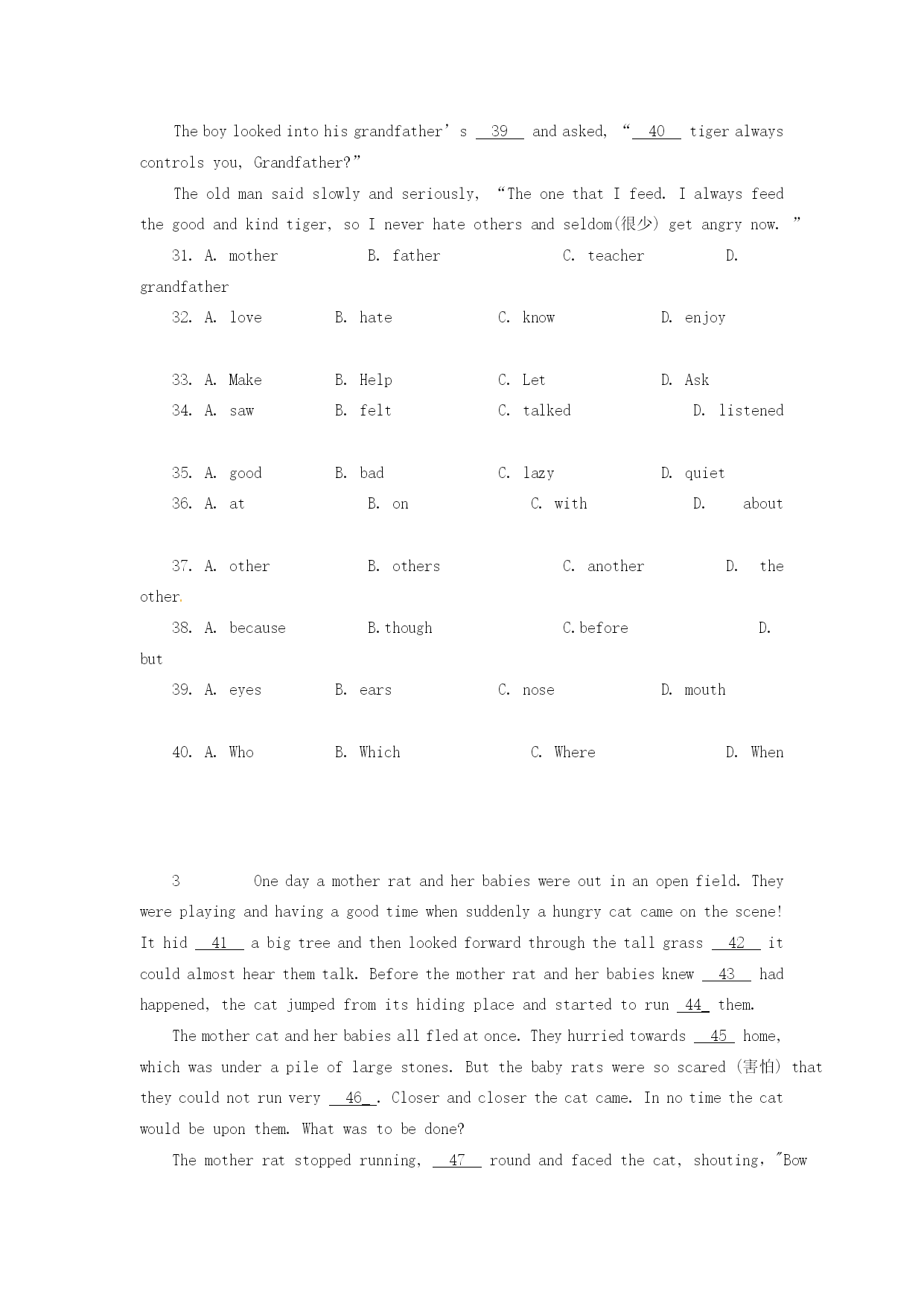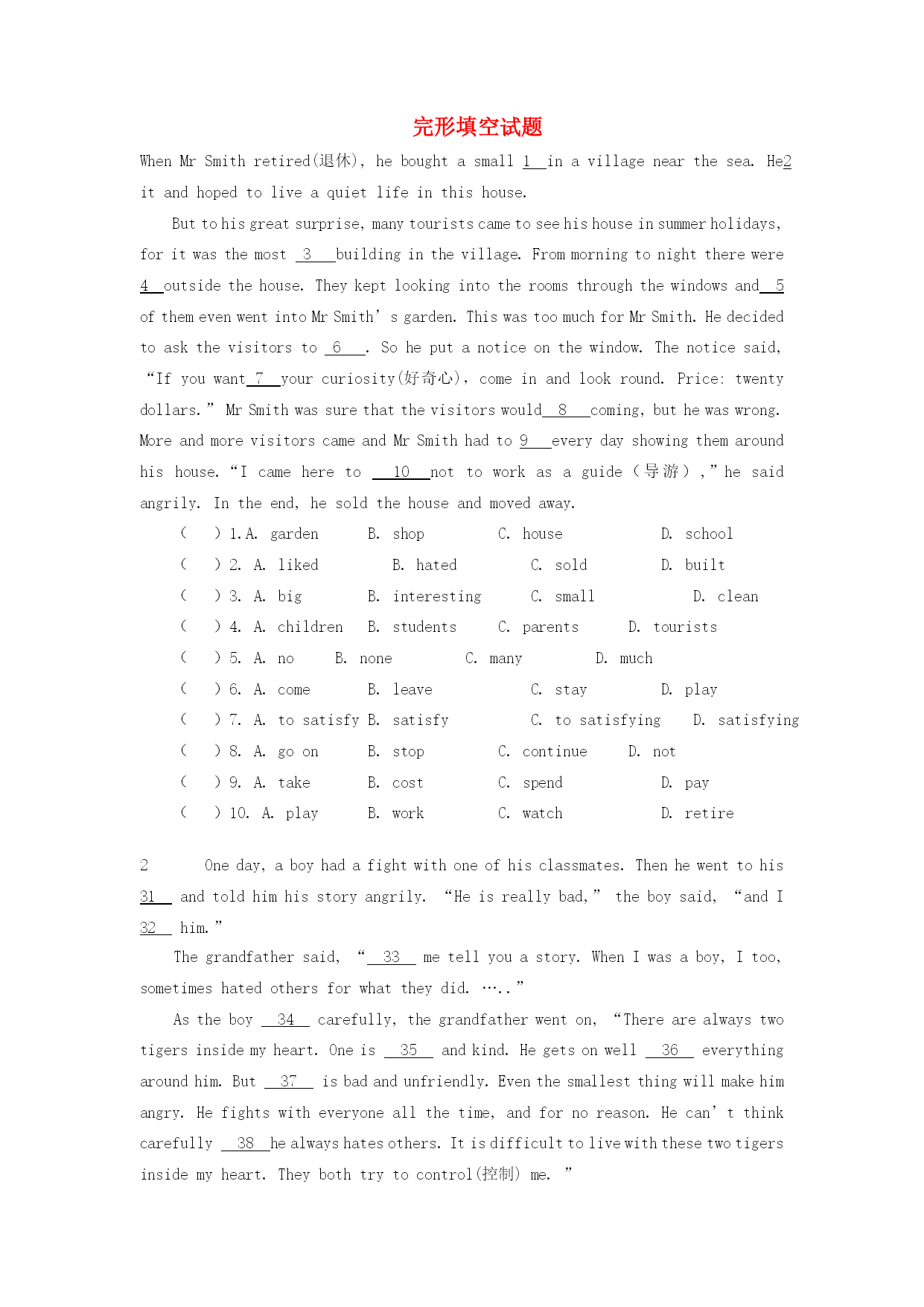 完形填空试题 WhenMrSmithretired(退休),heboughtasmall1inavillagenearthesea.He2itandhopedtoliveaquietlifeinthishouse. Buttohisgreatsurprise,manytouristscametoseehishouseinsummerholidays,foritwasthemost3buildinginthevillage.Frommorningtonighttherewere4outsidethehouse.Theykeptlookingintotheroomsthroughthewindowsand5ofthemevenwentintoMrSmith’sgarden.ThiswastoomuchforMrSmith.Hedecidedtoaskthevisitorsto6.Soheputanoticeonthewindow.Thenoticesaid,“Ifyouwant7yourcuriosity(好奇心),comeinandlookround.Price:twentydollars.”MrSmithwassurethatthevisitorswould8coming,buthewaswrong.MoreandmorevisitorscameandMrSmithhadto9everydayshowingthemaroundhishouse.“Icamehereto10nottoworkasaguide(导游),”hesaidangrily.Intheend,hesoldthehouseandmovedaway. ()1.A.garden B.shop C.house D.school ()2.A.liked B.hated C.sold D.built ()3.A.big B.interesting C.small D.clean ()4.A.childrenB.students C.parents D.tourists ()5.A.no B.none C.many D.much ()6.A.come B.leave C.stay D.play ()7.A.tosatisfy B.satisfy C.tosatisfying D.satisfying ()8.A.goon B.stop C.continue D.not ()9.A.take B.cost C.spend D.pay ()10.A.play B.work C.watch D.retire 2Oneday,aboyhadafightwithoneofhisclassmates.Thenhewenttohis31andtoldhimhisstoryangrily.“Heisreallybad,”theboysaid,“andI32him.” Thegrandfathersaid,“33metellyouastory.WhenIwasaboy,Itoo,sometimeshatedothersforwhattheydid.…..” Astheboy34carefully,thegrandfatherwenton,“Therearealwaystwotigersinsidemyheart.Oneis35andkind.Hegetsonwell36everythingaroundhim.But37isbadandunfriendly.Eventhesmallestthingwillmakehimangry.Hefightswitheveryoneallthetime,andfornoreason.Hecan’tthinkcarefully38healwayshatesothers.Itisdifficulttolivewiththesetwotigersinsidemyheart.Theybothtrytocontrol(控制)me.” Theboylookedintohisgrandfather’s39andasked,“40tigeralwayscontrolsyou,Grandfather?” Theoldmansaidslowlyandseriously,“TheonethatIfeed.Ialwaysfeedthegoodandkindtiger,soIneverhateothersandseldom(很少)getangrynow.” 31.A.mother B.father C.teacher D.grandfather 32.A.l