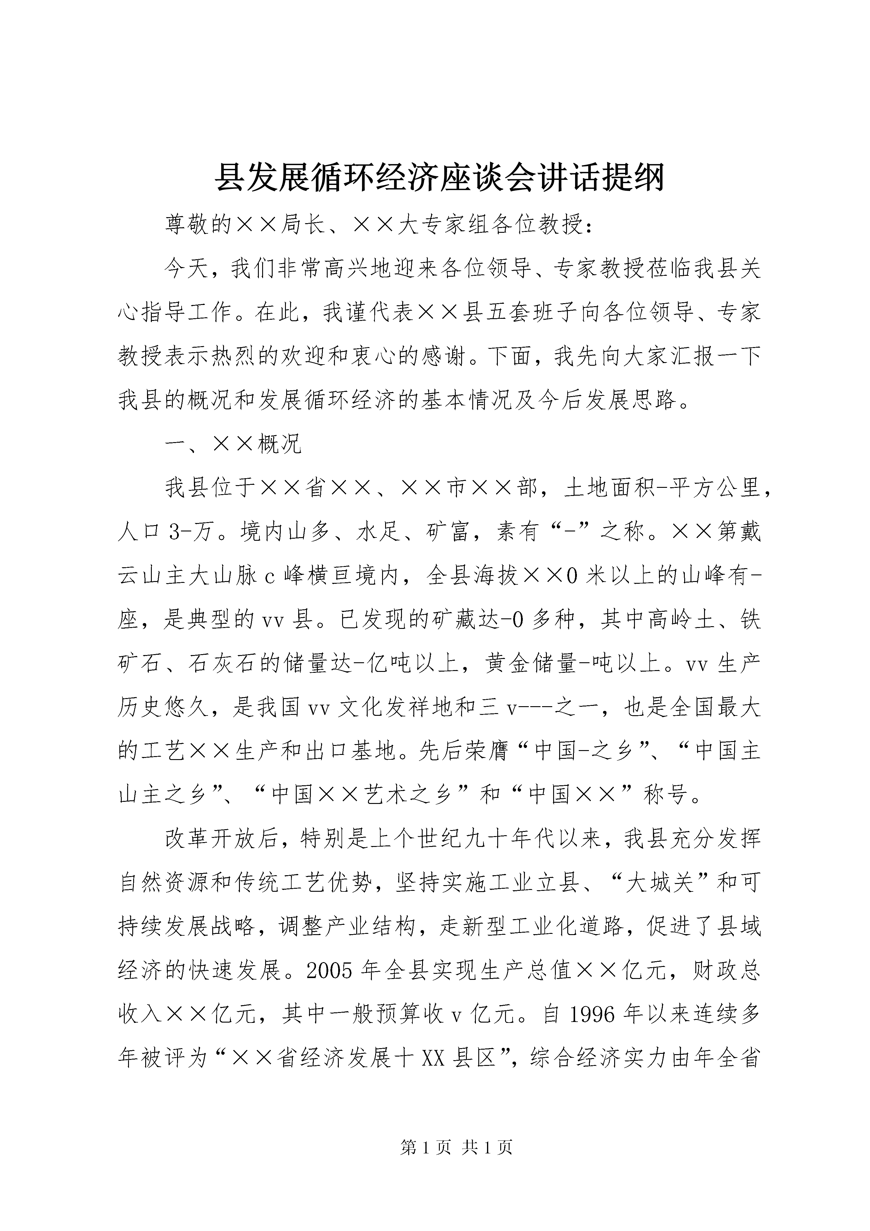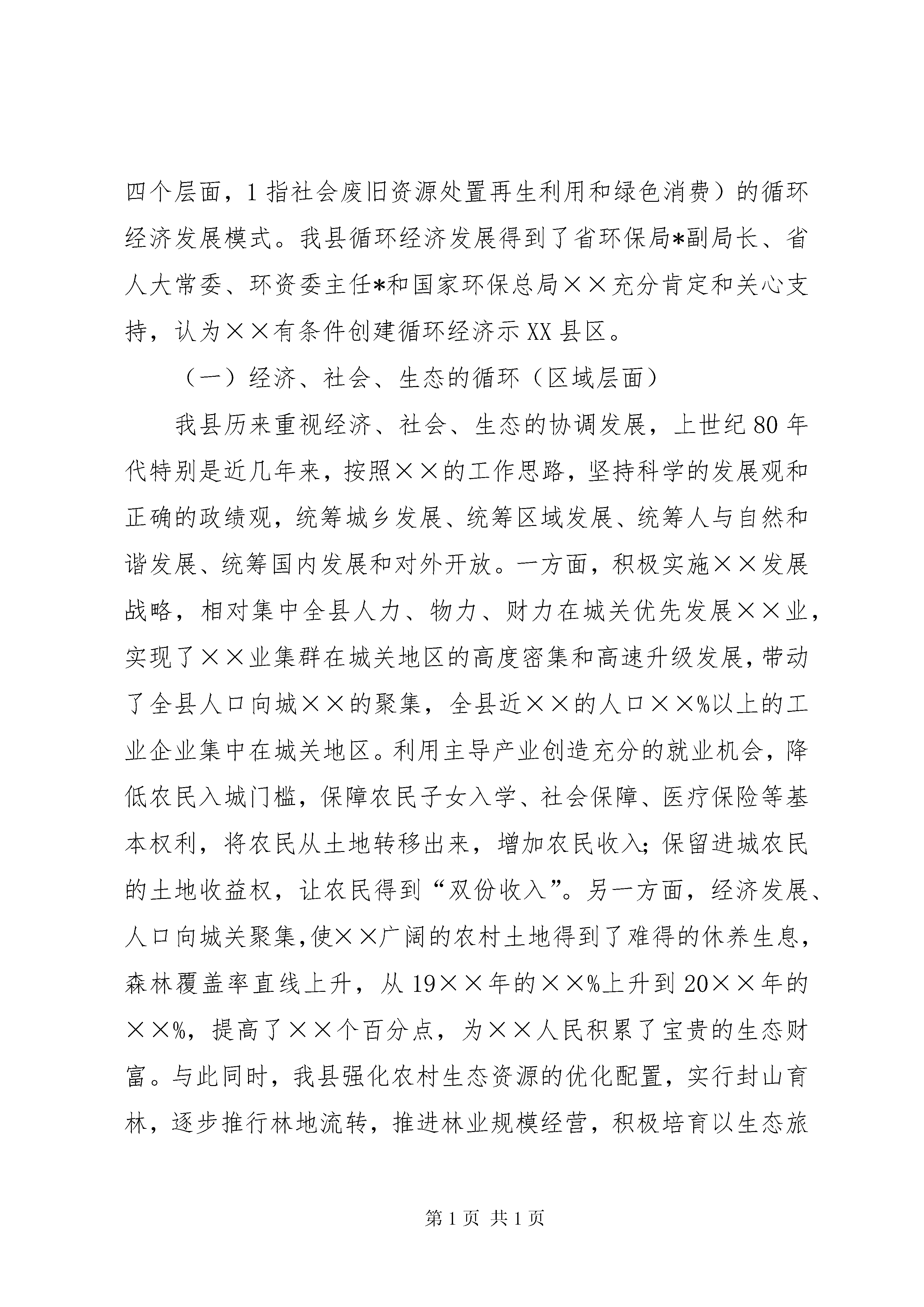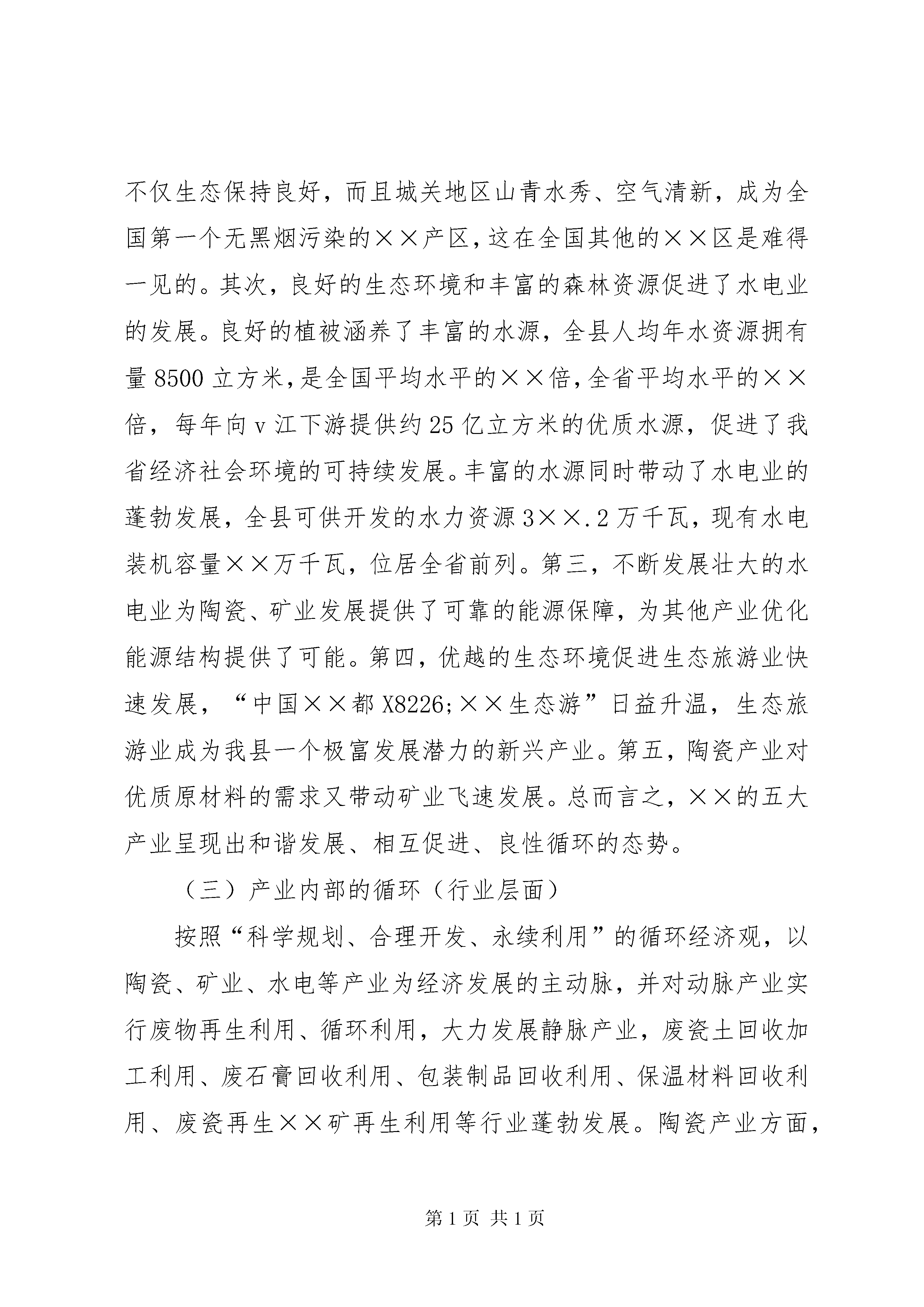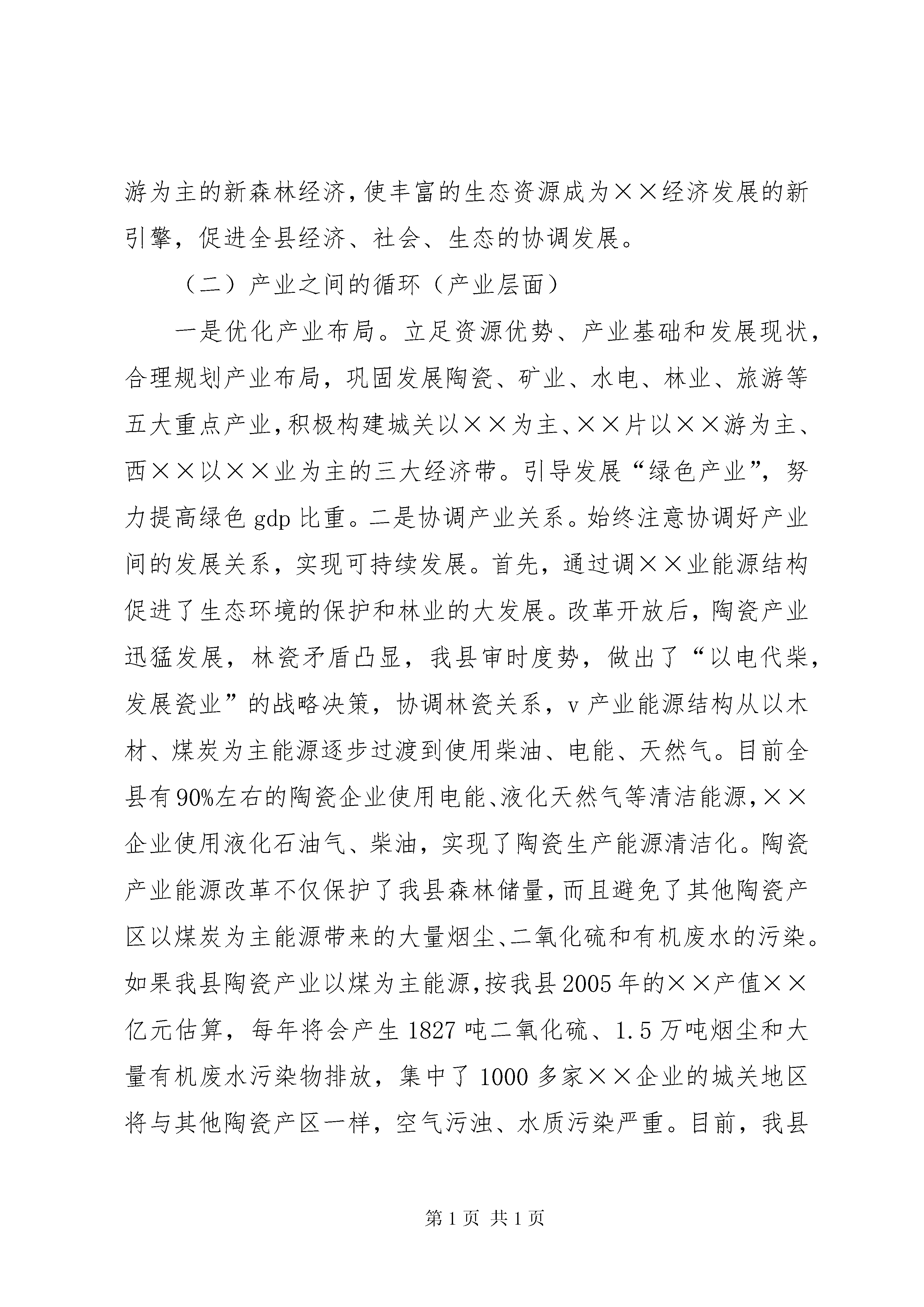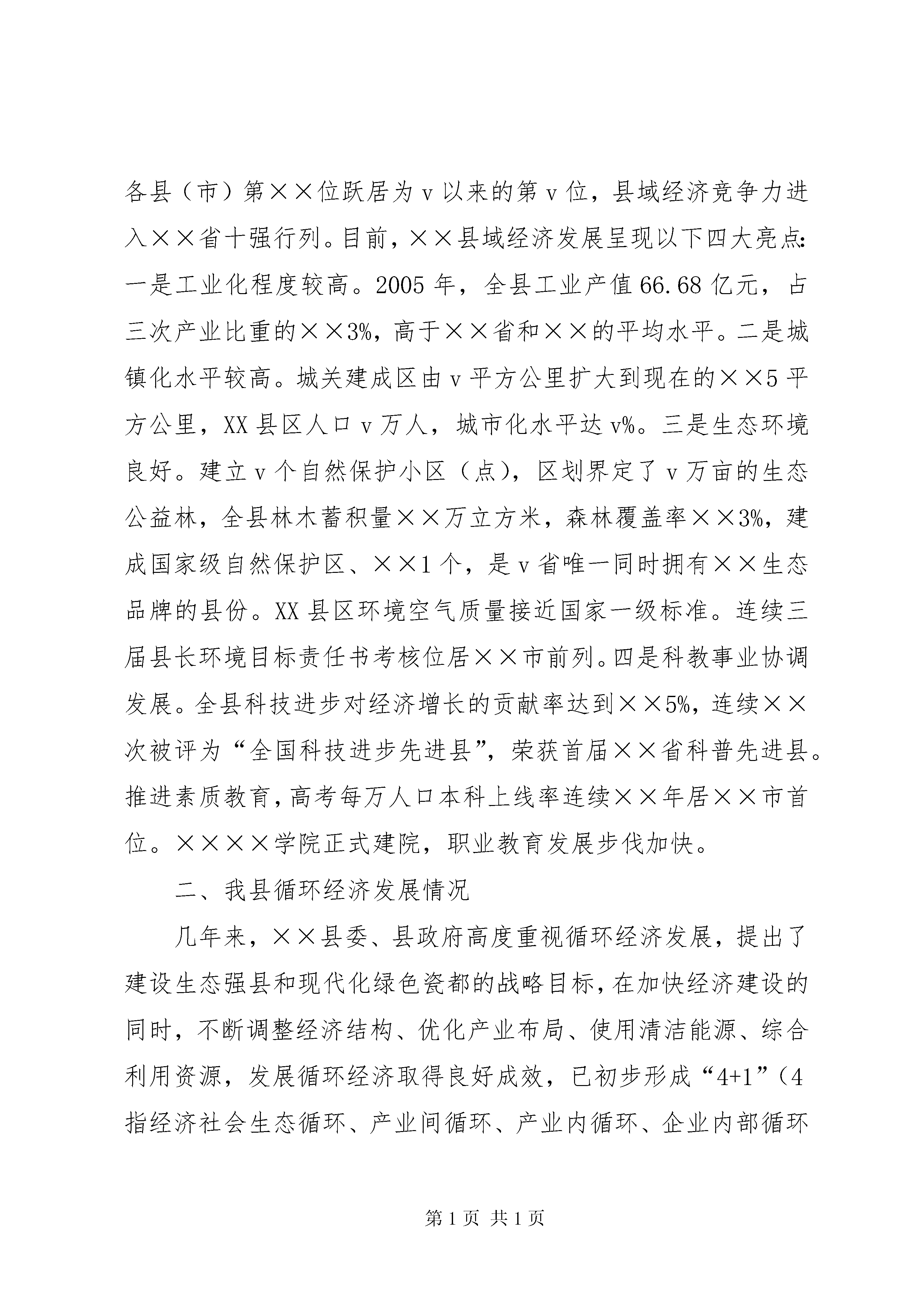 县发展循环经济座谈会讲话提纲尊敬的××局长、××大专家组各位教授:今天,我们非常高兴地迎来各位领导、专家教授莅临我县关心指导工作。在此,我谨代表××县五套班子向各位领导、专家教授表示热烈的欢迎和衷心的感谢。下面,我先向大家汇报一下我县的概况和发展循环经济的基本情况及今后发展思路。一、××概况我县位于××省××、××市××部,土地面积-平方公里,人口3-万。境内山多、水足、矿富,素有“-”之称。××第戴云山主大山脉c峰横亘境内,全县海拔××0米以上的山峰有-座,是典型的vv县。已发现的矿藏达-0多种,其中高岭土、铁矿石、石灰石的储量达-亿吨以上,黄金储量-吨以上。vv生产历史悠久,是我国vv文化发祥地和三v---之一,也是全国最大的工艺××生产和出口基地。先后荣膺“中国-之乡”、“中国主山主之乡”、“中国××艺术之乡”和“中国××”称号。改革开放后,特别是上个世纪九十年代以来,我县充分发挥自然资源和传统工艺优势,坚持实施工业立县、“大城关”和可持续发展战略,调整产业结构,走新型工业化道路,促进了县域经济的快速发展。2005年全县实现生产总值××亿元,财政总收入××亿元,其中一般预算收v亿元。自1996年以来连续多年被评为“××省经济发展十XX县区”,综合经济实力由年全省各县(市)第××位跃居为v以来的第v位,县域经济竞争力进入××省十强行列。目前,××县域经济发展呈现以下四大亮点:一是工业化程度较高。2005年,全县工业产值66.68亿元,占三次产业比重的××3%,高于××省和××的平均水平。二是城镇化水平较高。城关建成区由v平方公里扩大到现在的××5平方公里,XX县区人口v万人,城市化水平达v%。三是生态环境良好。建立v个自然保护小区(点),区划界定了v万亩的生态公益林,全县林木蓄积量××万立方米,森林覆盖率××3%,建成国家级自然保护区、××1个,是v省唯一同时拥有××生态品牌的县份。XX县区环境空气质量接近国家一级标准。连续三届县长环境目标责任书考核位居××市前列。四是科教事业协调发展。全县科技进步对经济增长的贡献率达到××5%,连续××次被评为“全国科技进步先进县”,荣获首届××省科普先进县。推进素质教育,高考每万人口本科上线率连续××年居××市首位。××××学院正式建院,职业教育发展步伐加快。二、我县循环经济发展情况几年来,××县委、县政府高度重视循环经济发展,提出了建设生态强县和现代化绿色瓷都的战略目标,在加快经济建设的同时,不断调整经济结构、优化产业布局、使用清洁能源、综合利用资源,发展循环经济取得良好成效,已初步形成“4+1”(4指经济社会生态循环、产业间循环、产业内循环、企业内部循环四个层面,1指社会废旧资源处置再生利用和绿色消费)的循环经济发展模式。我县循环经济发展得到了省环保局*副局长、省人大常委、环资委主任*和国家环保总局××充分肯定和关心支持,认为××有条件创建循环经济示XX县区。(一)经济、社会、生态的循环(区域层面)我县历来重视经济、社会、生态的协调发展,上世纪80年代特别是近几年来,按照××的工作思路,坚持科学的发展观和正确的政绩观,统筹城乡发展、统筹区域发展、统筹人与自然和谐发展、统筹国内发展和对外开放。一方面,积极实施××发展战略,相对集中全县人力、物力、财力在城关优先发展××业,实现了××业集群在城关地区的高度密集和高速升级发展,带动了全县人口向城××的聚集,全县近××的人口××%以上的工业企业集中在城关地区。利用主导产业创造充分的就业机会,降低农民入城门槛,保障农民子女入学、社会保障、医疗保险等基本权利,将农民从土地转移出来,增加农民收入;保留进城农民的土地收益权,让农民得到“双份收入”。另一方面,经济发展、人口向城关聚集,使××广阔的农村土地得到了难得的休养生息,森林覆盖率直线上升,从19××年的××%上升到20××年的××%,提高了××个百分点,为××人民积累了宝贵的生态财富。与此同时,我县强化农村生态资源的优化配置,实行封山育林,逐步推行林地流转,推进林业规模经营,积极培育以生态旅游为主的新森林经济,使丰富的生态资源成为××经济发展的新引擎,促进全县经济、社会、生态的协调发展。(二)产业之间的循环(产业层面)一是优化产业布局。立足资源优势、产业基础和发展现状,合理规划产业布局,巩固发展陶瓷、矿业、水电、林业、旅游等五大重点产业,积极构建城关以××为主、××片以××游为主、西××以××业为主的三大经济带。引导发展“绿色产业”,努力提高绿色gdp比重。二是协调产业关系。始终注意协调好产业间的发展关系,实现可持续发展。首先,通过调××业能源结构促进了生态环境的保护和林业的大发展。改革开放后,陶瓷产业迅猛发展,林瓷矛盾凸显,我县审时度势,做出了“以电代柴,发展瓷业”