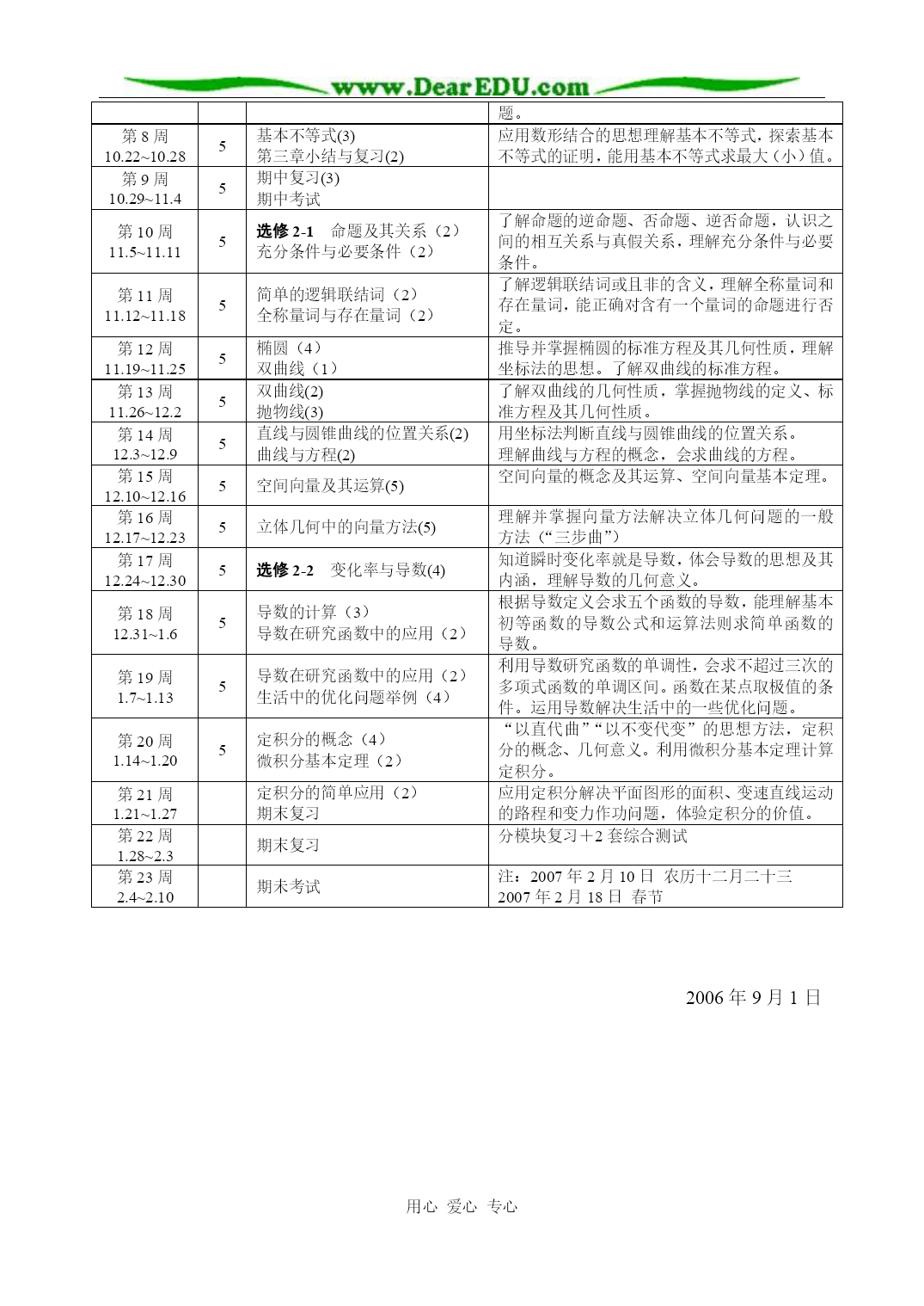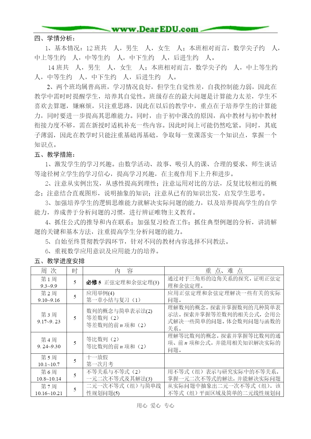 用心爱心专心 2006~2007学年度上学期教学计划 东升高中数学科高二备课组 一、指导思想: 使学生在九年义务教育数学课程的基础上,进一步提高作为未来公民所必要的数学素养,以满足个人发展与社会进步的需要。具体目标如下。 1.获得必要的数学基础知识和基本技能,理解基本的数学概念、数学结论的本质,了解概念、结论等产生的背景、应用,体会其中所蕴涵的数学思想和方法,以及它们在后续学习中的作用。通过不同形式的自主学习、探究活动,体验数学发现和创造的历程。 2.提高空间想像、抽象概括、推理论证、运算求解、数据处理等基本能力。 3.提高数学地提出、分析和解决问题(包括简单的实际问题)的能力,数学表达和交流的能力,发展独立获取数学知识的能力。 4.发展数学应用意识和创新意识,力求对现实世界中蕴涵的一些数学模式进行思考和作出判断。 5.提高学习数学的兴趣,树立学好数学的信心,形成锲而不舍的钻研精神和科学态度。 6.具有一定的数学视野,逐步认识数学的科学价值、应用价值和文化价值,形成批判性的思维习惯,崇尚数学的理性精神,体会数学的美学意义,从而进一步树立辩证唯物主义和历史唯物主义世界观。 教材特点: 我们所使用的教材是人教版《普通高中课程标准实验教科书·数学(A版)》,它在坚持我国数学教育优良传统的前提下,认真处理继承,借签,发展,创新之间的关系,体现基础性,时代性,典型性和可接受性等到,具有如下特点: 1.“亲和力”:以生动活泼的呈现方式,激发兴趣和美感,引发学习激情。 2.“问题性”:以恰时恰点的问题引导数学活动,培养问题意识,孕育创新精神。 3.“科学性”与“思想性”:通过不同数学内容的联系与启发,强调类比,推广,特殊化,化归等思想方法的运用,学习数学地思考问题的方式,提高数学思维能力,培育理性精神。 4.“时代性”与“应用性”:以具有时代性和现实感的素材创设情境,加强数学活动,发展应用意识。 教法分析: 选取与内容密切相关的,典型的,丰富的和学生熟悉的素材,用生动活泼的语言,创设能够体现数学的概念和结论,数学的思想和方法,以及数学应用的学习情境,使学生产生对数学的亲切感,引发学生“看个究竟”的冲动,以达到培养其兴趣的目的。 通过“观察”,“思考”,“探究”等栏目,引发学生的思考和探索活动,切实改进学生的学习方式。 在教学中强调类比,推广,特殊化,化归等数学思想方法,尽可能养成其逻辑思维的习惯。 学情分析: 1、基本情况:12班共人,男生人,女生人;本班相对而言,数学尖子约人,中上等生约人,中等生约人,中下生约人,后进生约人。 14班共人,男生人,女生人;本班相对而言,数学尖子约人,中上等生约人,中等生约人,中下生约人,后进生约人。 2、两个班均属普高班,学习情况良好,但学生自觉性差,自我控制能力弱,因此在教学中需时时提醒学生,培养其自觉性。班级存在的最大问题是计算能力太差,学生不喜欢去算题,嫌麻烦,只注重思路,因此在以后的教学中,重点在于培养学生的计算能力,同时要进一步提高其思维能力。同时,由于初中课改的原因,高中教材与初中教材衔接力度不够,需在新授时适机补充一些内容。因此时间上可能仍然吃紧。同时,其底子薄弱,因此在教学时只能注重基础再基础,争取每一堂课落实一个知识点,掌握一个知识点。 五、教学措施: 1、激发学生的学习兴趣。由数学活动、故事、吸引人的课、合理的要求、师生谈话等途径树立学生的学习信心,提高学习兴趣,在主观作用下上升和进步。 2、注意从实例出发,从感性提高到理性;注意运用对比的方法,反复比较相近的概念;注意结合直观图形,说明抽象的知识;注意从已有的知识出发,启发学生思考。 3、加强培养学生的逻辑思维能力就解决实际问题的能力,以及培养提高学生的自学能力,养成善于分析问题的习惯,进行辨证唯物主义教育。 4、抓住公式的推导和内在联系;加强复习检查工作;抓住典型例题的分析,讲清解题的关键和基本方法,注重提高学生分析问题的能力。 5、自始至终贯彻教学四环节,针对不同的教材内容选择不同教法。 6、重视数学应用意识及应用能力的培养。 教学进度安排 周次时内容重点、难点第1周 9.3~9.95必修5正弦定理和余弦定理(3)通过对于三角形的边角关系的探究,证明正弦定理和余弦定理。第2周 9.10~9.165应用举例(4) 第一章小结与复习(1)应用正弦定理和余弦定理解决一些有关的实际问题。第3周 9.17~9.235数列的概念与简单表示法(2) 等差数列(2) 等差数列的前n项和(2)理解数列的概念,探索并掌握数列的几种简单表示法。探索并掌握等差数列的相关公式,会用公式解决一些简单的问题。体会数列问题与函数的关系。第4周 9.24~9.305等比数列(2) 等比数列的前n项和(2)理解等比数列的概念,探索并掌握等比数列的通项、前n