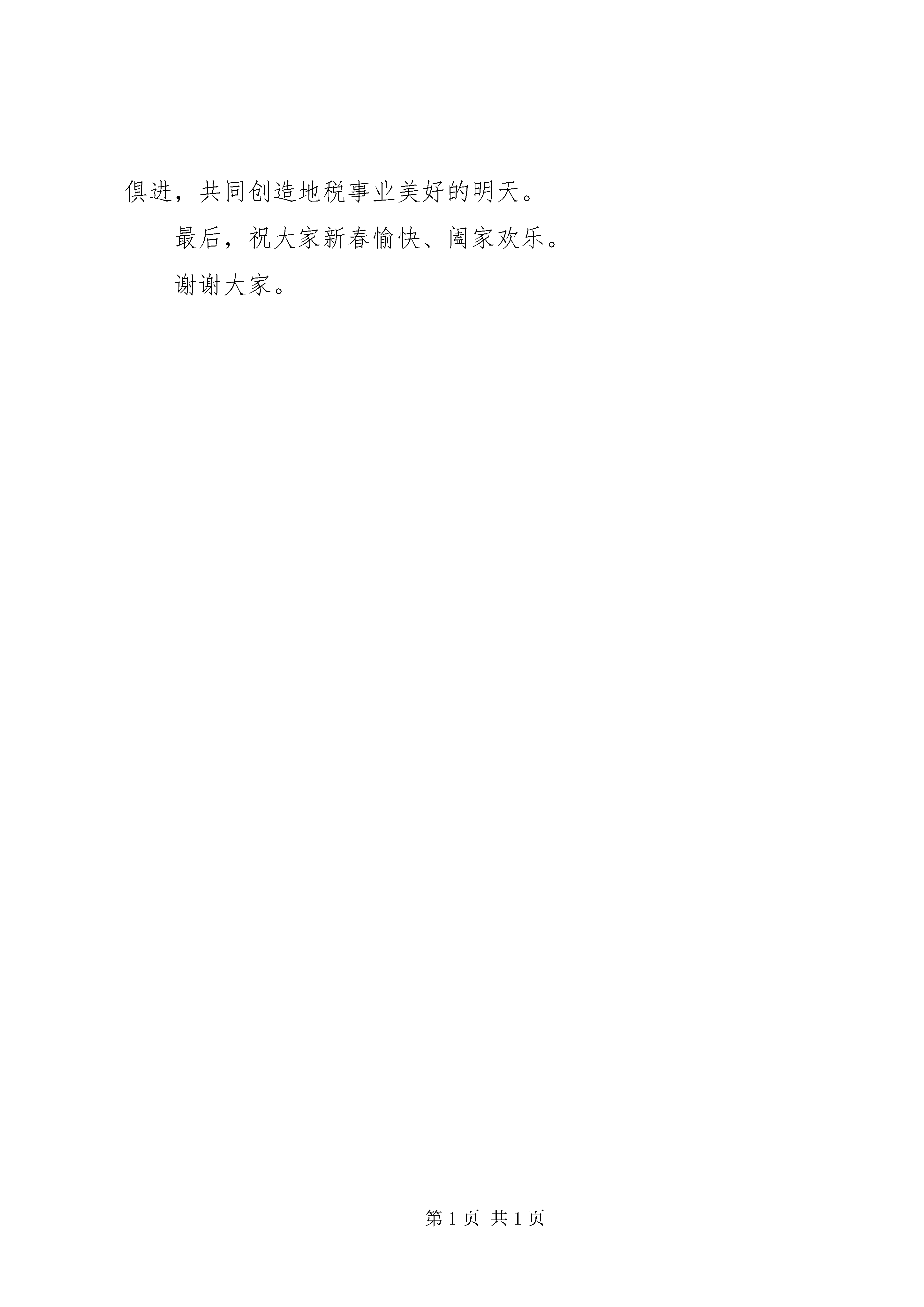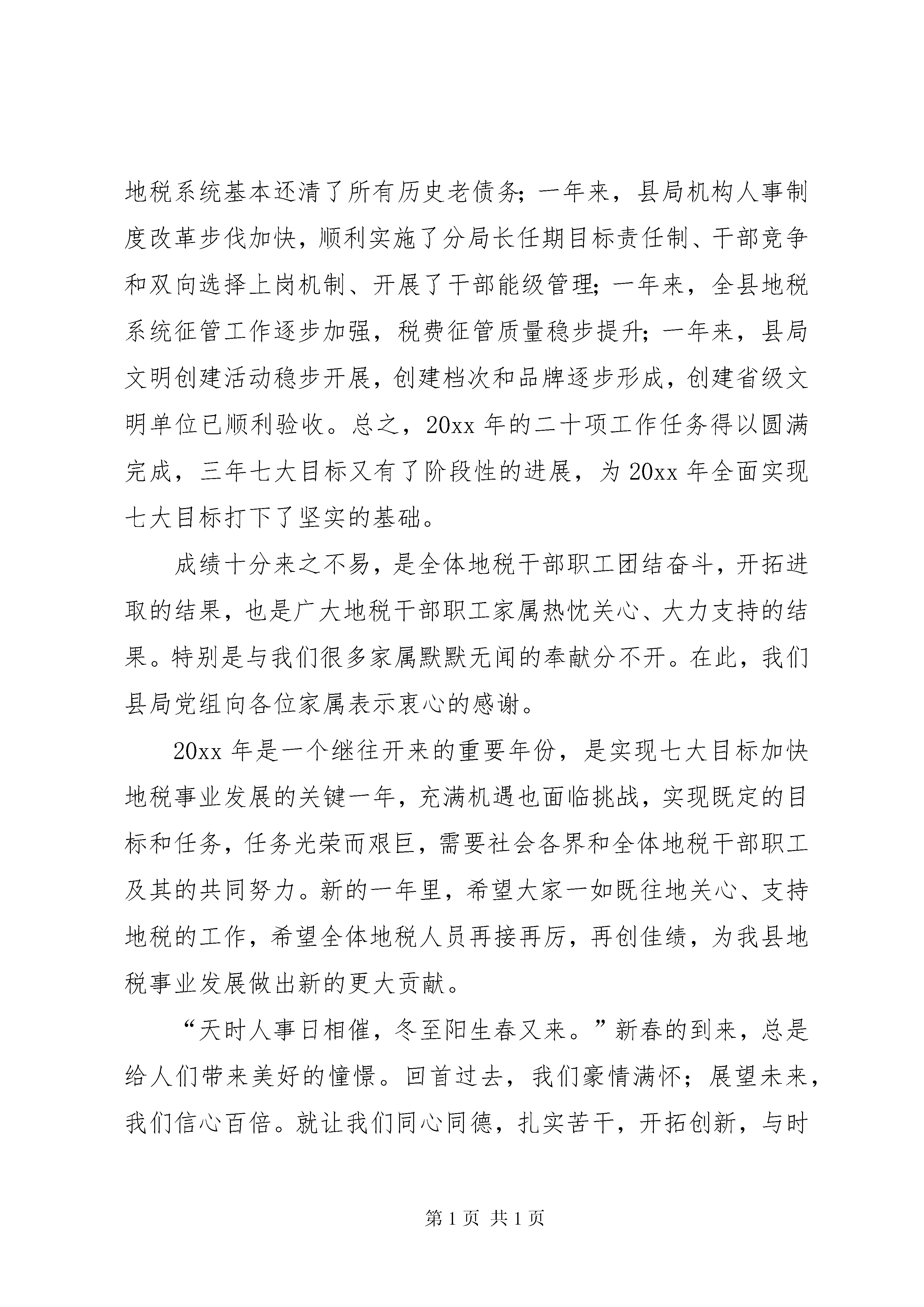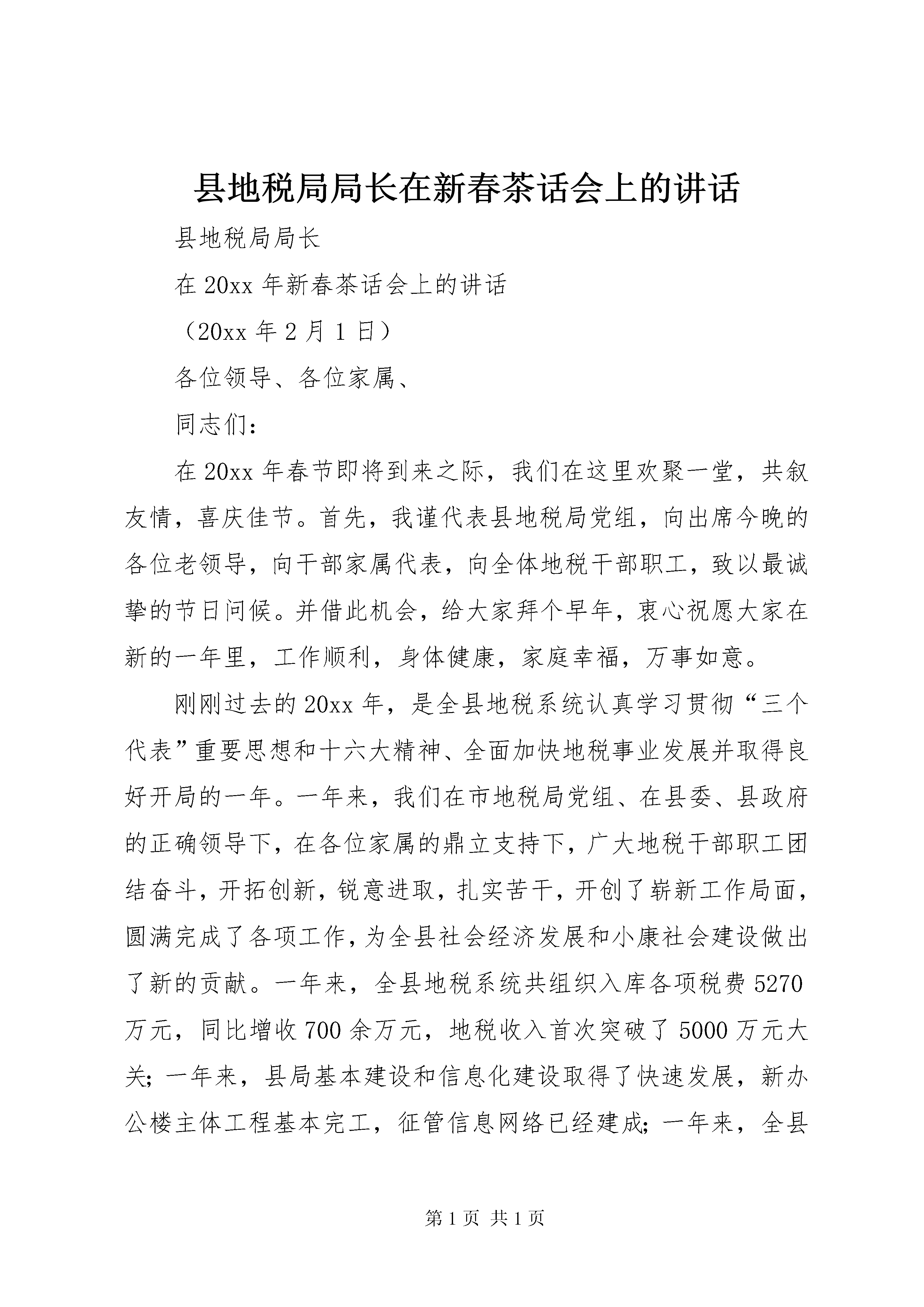 县地税局局长在新春茶话会上的讲话县地税局局长在20xx年新春茶话会上的讲话(20xx年2月1日)各位领导、各位家属、同志们:在20xx年春节即将到来之际,我们在这里欢聚一堂,共叙友情,喜庆佳节。首先,我谨代表县地税局党组,向出席今晚的各位老领导,向干部家属代表,向全体地税干部职工,致以最诚挚的节日问候。并借此机会,给大家拜个早年,衷心祝愿大家在新的一年里,工作顺利,身体健康,家庭幸福,万事如意。刚刚过去的20xx年,是全县地税系统认真学习贯彻“三个代表”重要思想和十六大精神、全面加快地税事业发展并取得良好开局的一年。一年来,我们在市地税局党组、在县委、县政府的正确领导下,在各位家属的鼎立支持下,广大地税干部职工团结奋斗,开拓创新,锐意进取,扎实苦干,开创了崭新工作局面,圆满完成了各项工作,为全县社会经济发展和小康社会建设做出了新的贡献。一年来,全县地税系统共组织入库各项税费5270万元,同比增收700余万元,地税收入首次突破了5000万元大关;一年来,县局基本建设和信息化建设取得了快速发展,新办公楼主体工程基本完工,征管信息网络已经建成;一年来,全县地税系统基本还清了所有历史老债务;一年来,县局机构人事制度改革步伐加快,顺利实施了分局长任期目标责任制、干部竞争和双向选择上岗机制、开展了干部能级管理;一年来,全县地税系统征管工作逐步加强,税费征管质量稳步提升;一年来,县局文明创建活动稳步开展,创建档次和品牌逐步形成,创建省级文明单位已顺利验收。总之,20xx年的二十项工作任务得以圆满完成,三年七大目标又有了阶段性的进展,为20xx年全面实现七大目标打下了坚实的基础。成绩十分来之不易,是全体地税干部职工团结奋斗,开拓进取的结果,也是广大地税干部职工家属热忱关心、大力支持的结果。特别是与我们很多家属默默无闻的奉献分不开。在此,我们县局党组向各位家属表示衷心的感谢。20xx年是一个继往开来的重要年份,是实现七大目标加快地税事业发展的关键一年,充满机遇也面临挑战,实现既定的目标和任务,任务光荣而艰巨,需要社会各界和全体地税干部职工及其的共同努力。新的一年里,希望大家一如既往地关心、支持地税的工作,希望全体地税人员再接再厉,再创佳绩,为我县地税事业发展做出新的更大贡献。“天时人事日相催,冬至阳生春又来。”新春的到来,总是给人们带来美好的憧憬。回首过去,我们豪情满怀;展望未来,我们信心百倍。就让我们同心同德,扎实苦干,开拓创新,与时俱进,共同创造地税事业美好的明天。最后,祝大家新春愉快、阖家欢乐。谢谢大家。