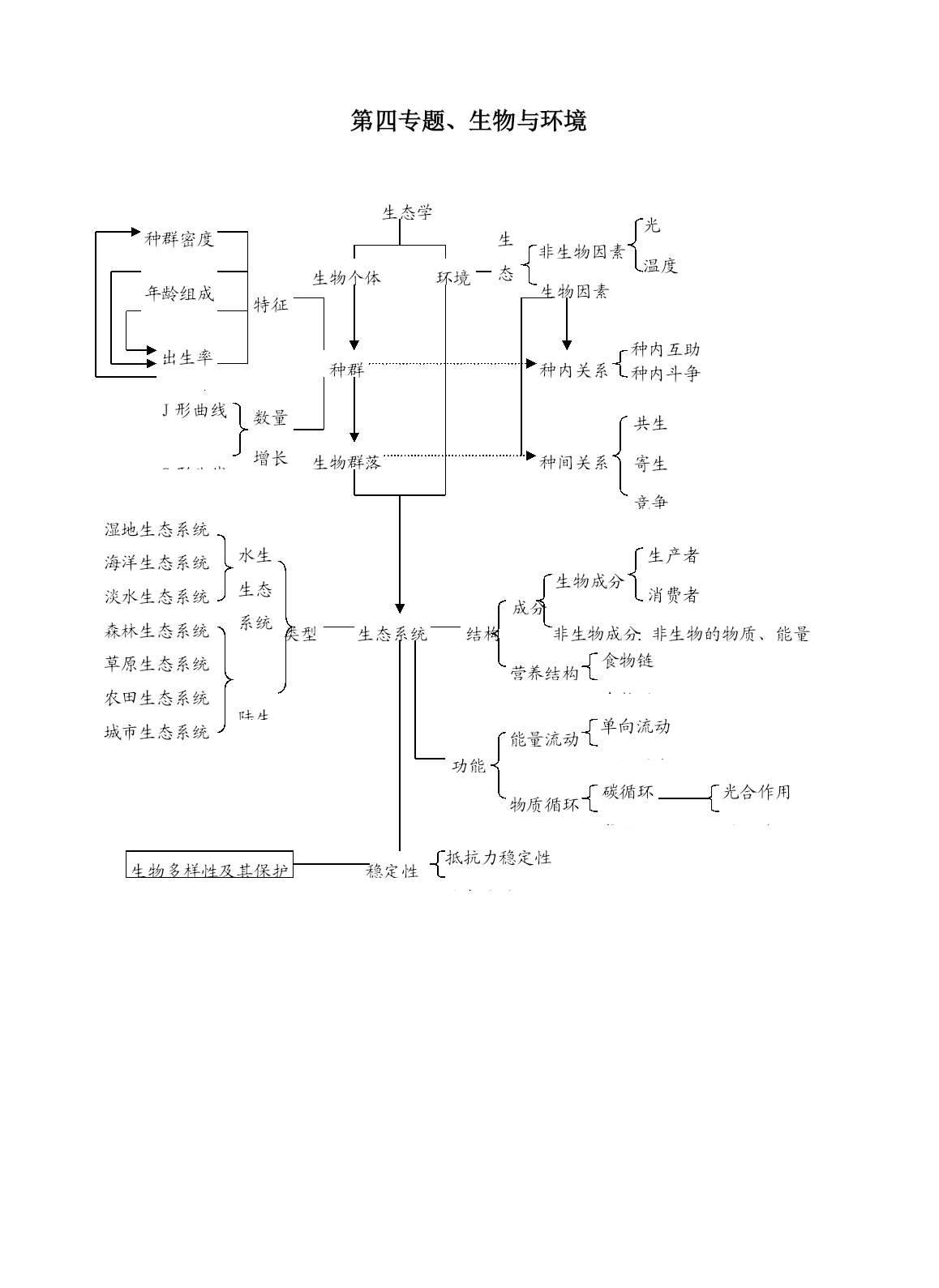第四专题、生物与环境 种内互助 种内斗争 抵抗力稳定性 恢复力稳定性 J形曲线 S形曲线 种群密度 年龄组成 性别比例 出生率 死亡率 特征 数量增长曲线 种群 环境 生物群落 生物个体 生态学 生物因素 非生物因素 生态因素 光 温度 水、CO2、矿质元素等 种内关系 种间关系 共生 寄生 竞争 捕食 湿地生态系统 海洋生态系统 淡水生态系统 森林生态系统 草原生态系统 农田生态系统 城市生态系统 生态系统 水生生态系统 陆生生态系统 类型 成分 非生物成分:非生物的物质、能量 生物成分 生产者 消费者 分解者 食物链 食物网 营养结构 结构 单向流动 逐级递减 碳循环 氮循环 光合作用 呼吸作用 能量流动 物质循环 功能 稳定性 生物多样性及其保护
