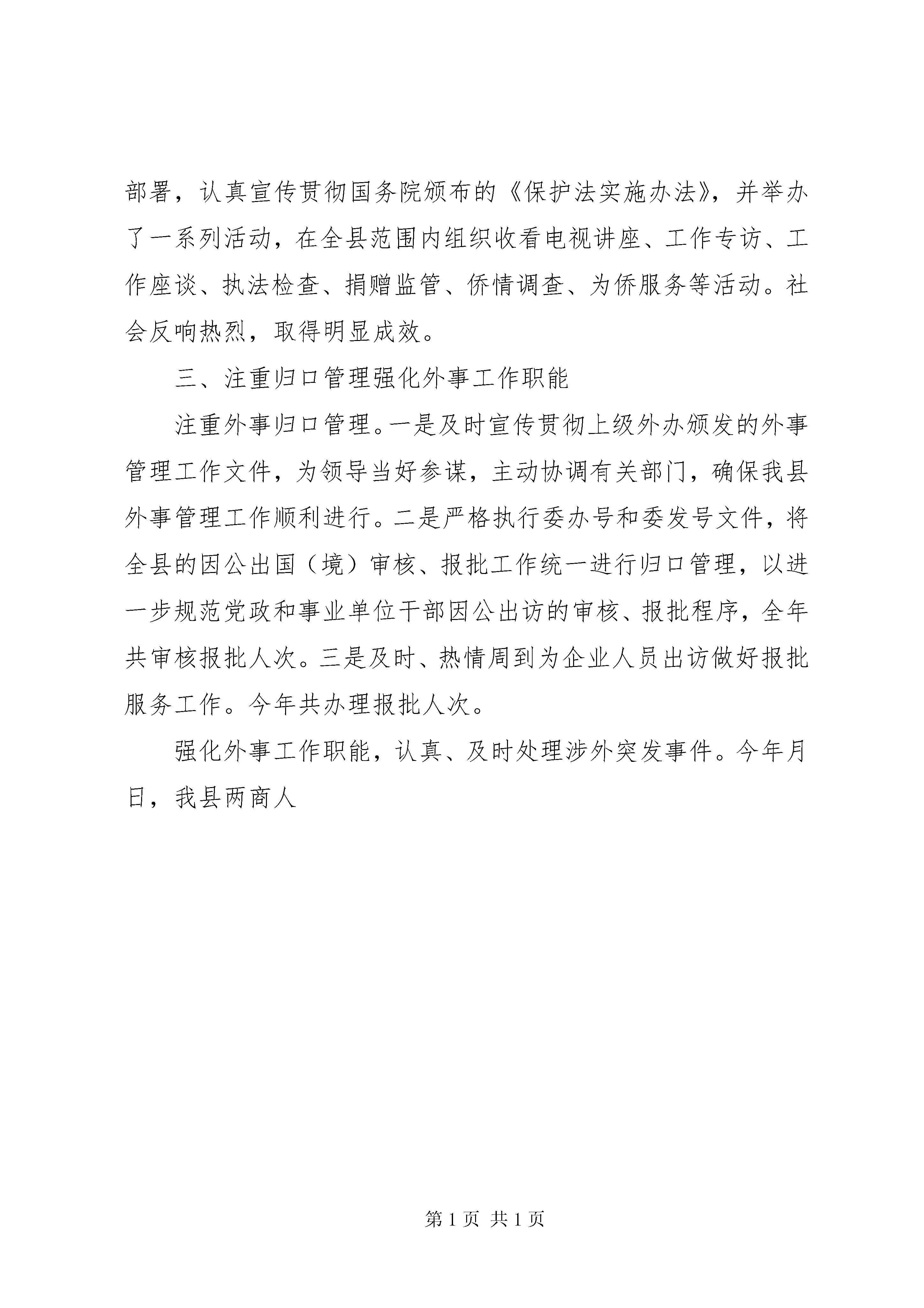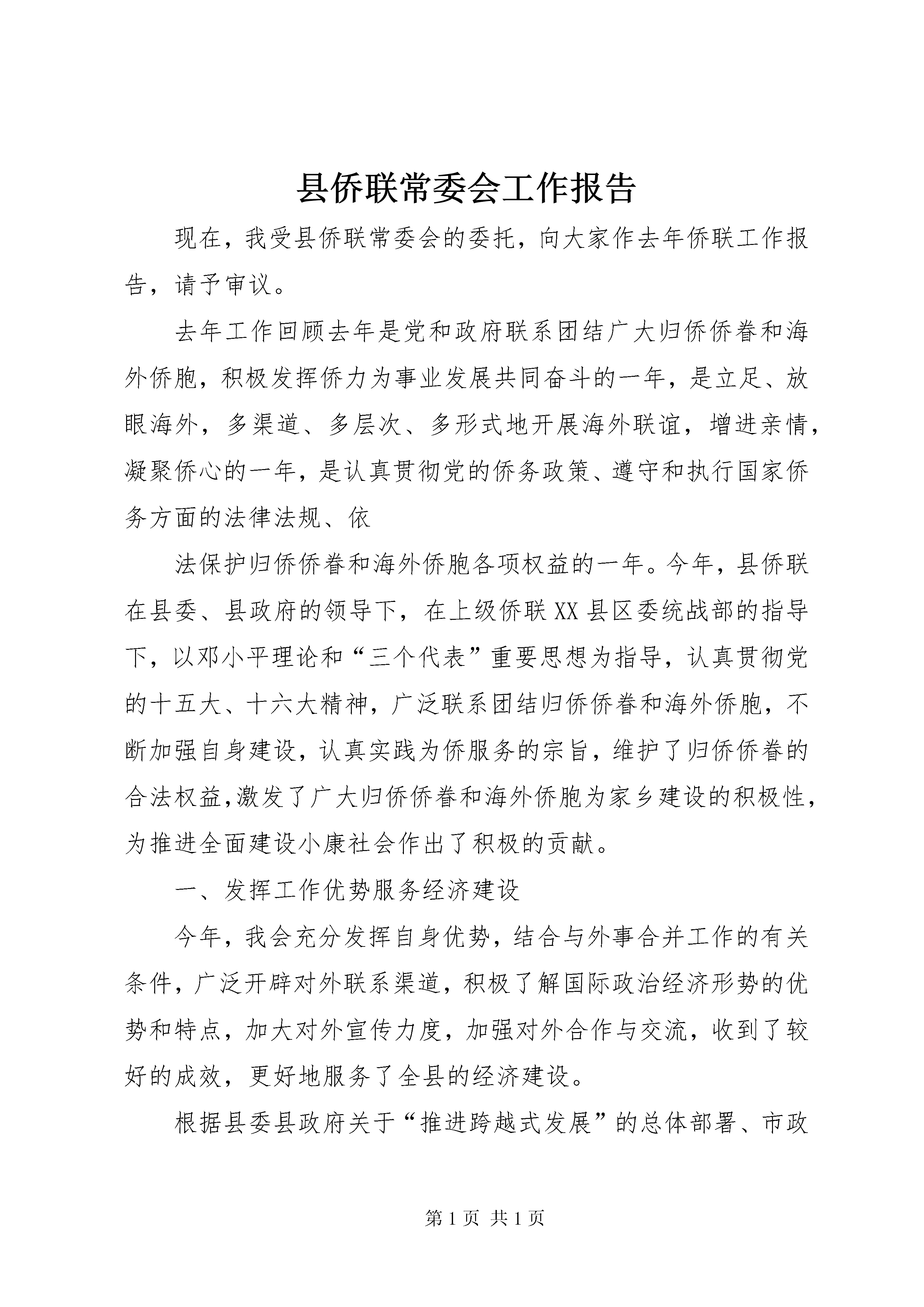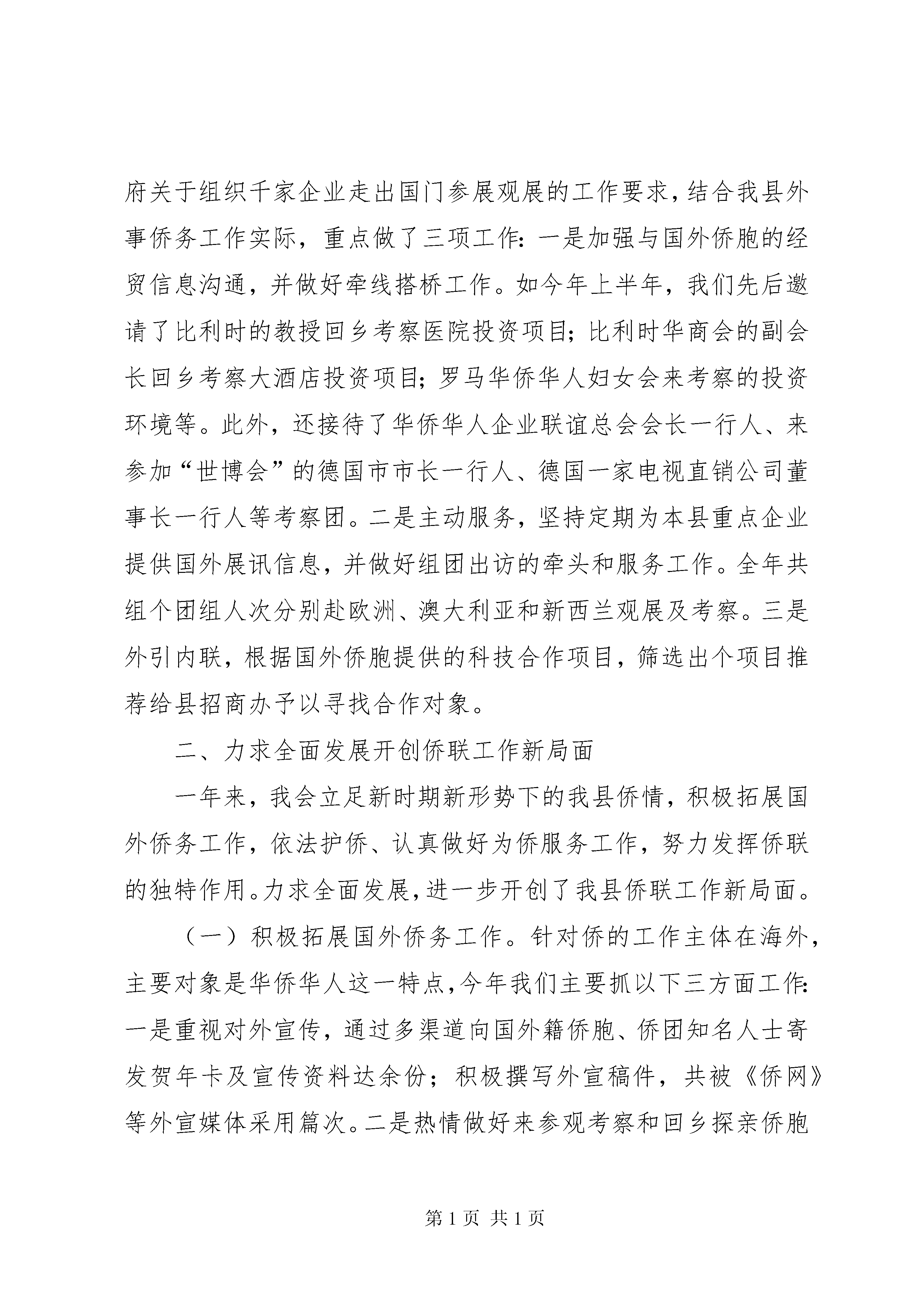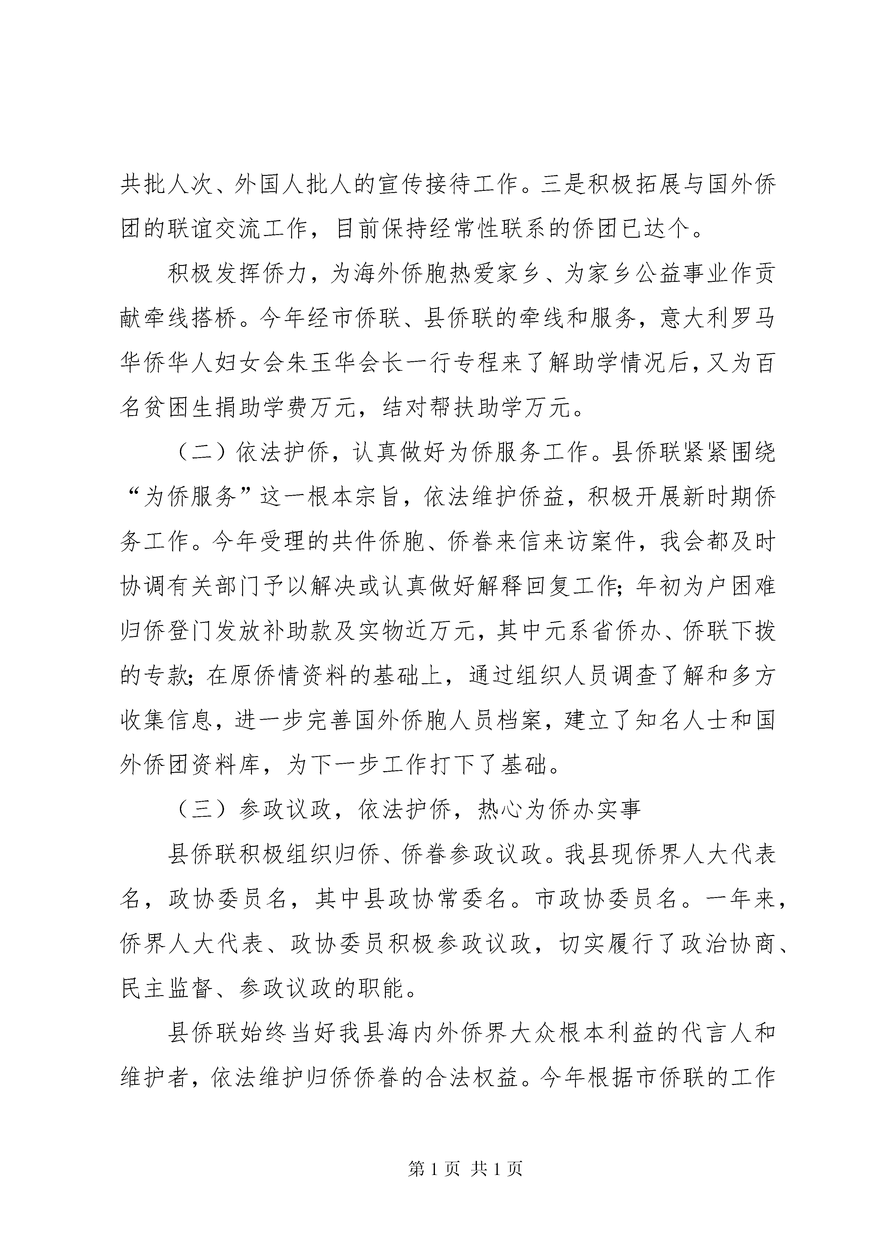 县侨联常委会工作报告现在,我受县侨联常委会的委托,向大家作去年侨联工作报告,请予审议。去年工作回顾去年是党和政府联系团结广大归侨侨眷和海外侨胞,积极发挥侨力为事业发展共同奋斗的一年,是立足、放眼海外,多渠道、多层次、多形式地开展海外联谊,增进亲情,凝聚侨心的一年,是认真贯彻党的侨务政策、遵守和执行国家侨务方面的法律法规、依法保护归侨侨眷和海外侨胞各项权益的一年。今年,县侨联在县委、县政府的领导下,在上级侨联XX县区委统战部的指导下,以邓小平理论和“三个代表”重要思想为指导,认真贯彻党的十五大、十六大精神,广泛联系团结归侨侨眷和海外侨胞,不断加强自身建设,认真实践为侨服务的宗旨,维护了归侨侨眷的合法权益,激发了广大归侨侨眷和海外侨胞为家乡建设的积极性,为推进全面建设小康社会作出了积极的贡献。一、发挥工作优势服务经济建设今年,我会充分发挥自身优势,结合与外事合并工作的有关条件,广泛开辟对外联系渠道,积极了解国际政治经济形势的优势和特点,加大对外宣传力度,加强对外合作与交流,收到了较好的成效,更好地服务了全县的经济建设。根据县委县政府关于“推进跨越式发展”的总体部署、市政府关于组织千家企业走出国门参展观展的工作要求,结合我县外事侨务工作实际,重点做了三项工作:一是加强与国外侨胞的经贸信息沟通,并做好牵线搭桥工作。如今年上半年,我们先后邀请了比利时的教授回乡考察医院投资项目;比利时华商会的副会长回乡考察大酒店投资项目;罗马华侨华人妇女会来考察的投资环境等。此外,还接待了华侨华人企业联谊总会会长一行人、来参加“世博会”的德国市市长一行人、德国一家电视直销公司董事长一行人等考察团。二是主动服务,坚持定期为本县重点企业提供国外展讯信息,并做好组团出访的牵头和服务工作。全年共组个团组人次分别赴欧洲、澳大利亚和新西兰观展及考察。三是外引内联,根据国外侨胞提供的科技合作项目,筛选出个项目推荐给县招商办予以寻找合作对象。二、力求全面发展开创侨联工作新局面一年来,我会立足新时期新形势下的我县侨情,积极拓展国外侨务工作,依法护侨、认真做好为侨服务工作,努力发挥侨联的独特作用。力求全面发展,进一步开创了我县侨联工作新局面。(一)积极拓展国外侨务工作。针对侨的工作主体在海外,主要对象是华侨华人这一特点,今年我们主要抓以下三方面工作:一是重视对外宣传,通过多渠道向国外籍侨胞、侨团知名人士寄发贺年卡及宣传资料达余份;积极撰写外宣稿件,共被《侨网》等外宣媒体采用篇次。二是热情做好来参观考察和回乡探亲侨胞共批人次、外国人批人的宣传接待工作。三是积极拓展与国外侨团的联谊交流工作,目前保持经常性联系的侨团已达个。积极发挥侨力,为海外侨胞热爱家乡、为家乡公益事业作贡献牵线搭桥。今年经市侨联、县侨联的牵线和服务,意大利罗马华侨华人妇女会朱玉华会长一行专程来了解助学情况后,又为百名贫困生捐助学费万元,结对帮扶助学万元。(二)依法护侨,认真做好为侨服务工作。县侨联紧紧围绕“为侨服务”这一根本宗旨,依法维护侨益,积极开展新时期侨务工作。今年受理的共件侨胞、侨眷来信来访案件,我会都及时协调有关部门予以解决或认真做好解释回复工作;年初为户困难归侨登门发放补助款及实物近万元,其中元系省侨办、侨联下拨的专款;在原侨情资料的基础上,通过组织人员调查了解和多方收集信息,进一步完善国外侨胞人员档案,建立了知名人士和国外侨团资料库,为下一步工作打下了基础。(三)参政议政,依法护侨,热心为侨办实事县侨联积极组织归侨、侨眷参政议政。我县现侨界人大代表名,政协委员名,其中县政协常委名。市政协委员名。一年来,侨界人大代表、政协委员积极参政议政,切实履行了政治协商、民主监督、参政议政的职能。县侨联始终当好我县海内外侨界大众根本利益的代言人和维护者,依法维护归侨侨眷的合法权益。今年根据市侨联的工作部署,认真宣传贯彻国务院颁布的《保护法实施办法》,并举办了一系列活动,在全县范围内组织收看电视讲座、工作专访、工作座谈、执法检查、捐赠监管、侨情调查、为侨服务等活动。社会反响热烈,取得明显成效。三、注重归口管理强化外事工作职能注重外事归口管理。一是及时宣传贯彻上级外办颁发的外事管理工作文件,为领导当好参谋,主动协调有关部门,确保我县外事管理工作顺利进行。二是严格执行委办号和委发号文件,将全县的因公出国(境)审核、报批工作统一进行归口管理,以进一步规范党政和事业单位干部因公出访的审核、报批程序,全年共审核报批人次。三是及时、热情周到为企业人员出访做好报批服务工作。今年共办理报批人次。强化外事工作职能,认真、及时处理涉外突发事件。今年月日,我县两商人