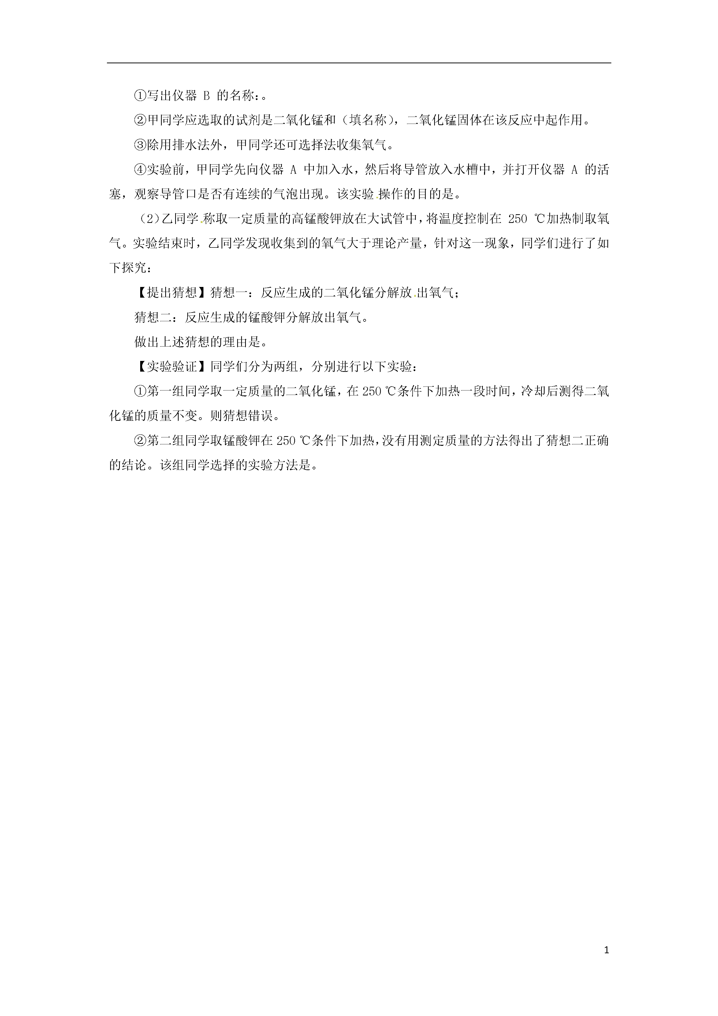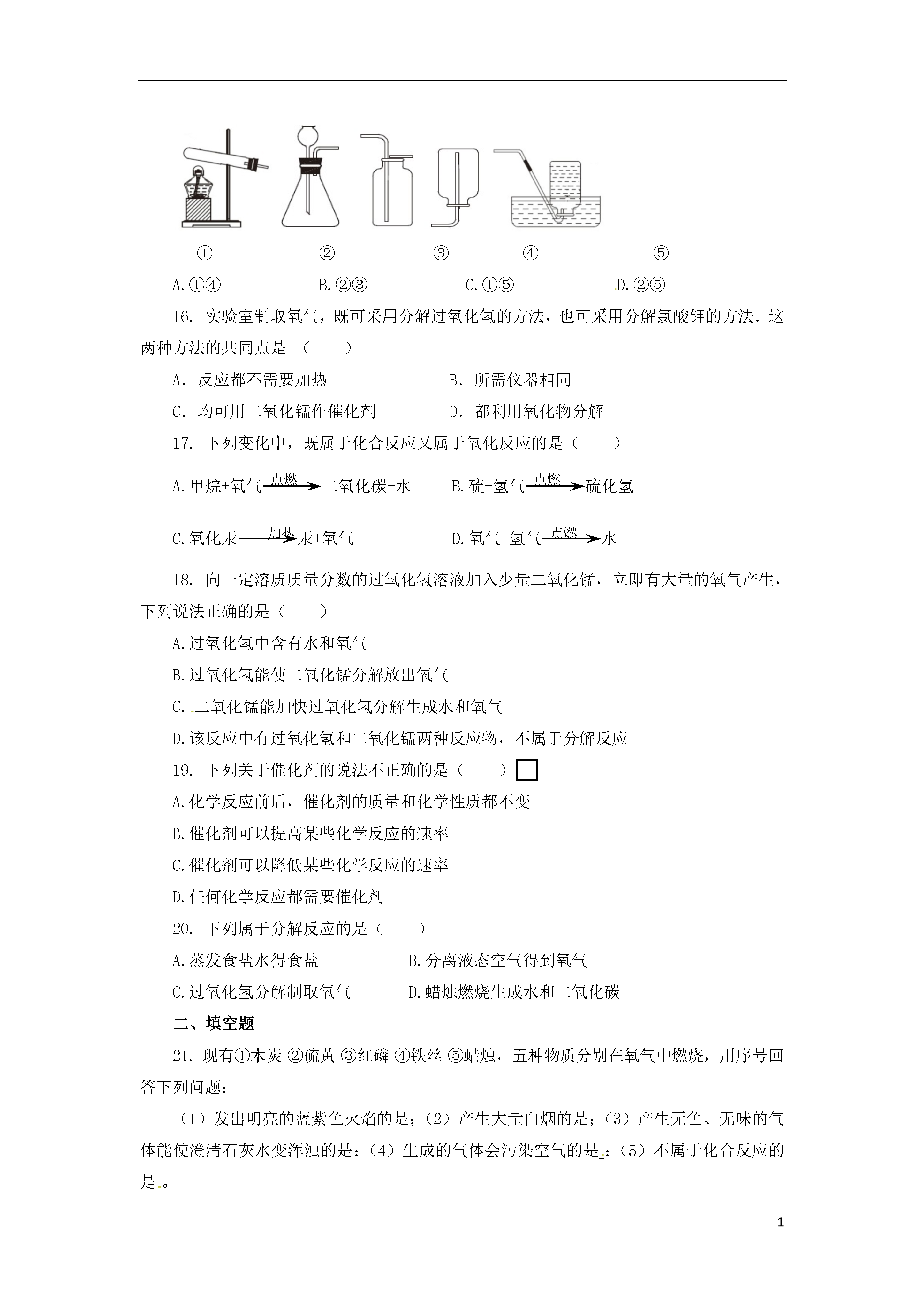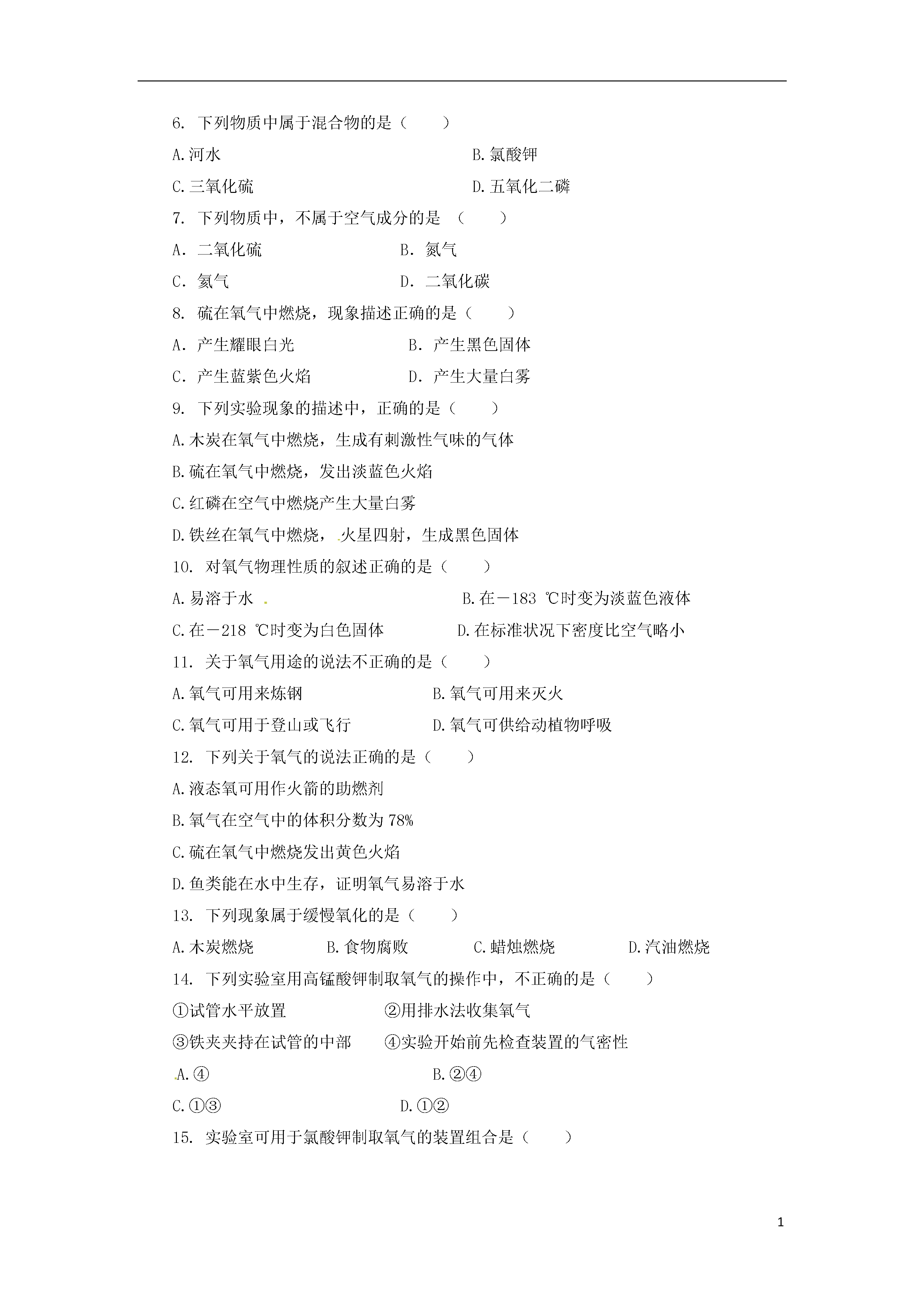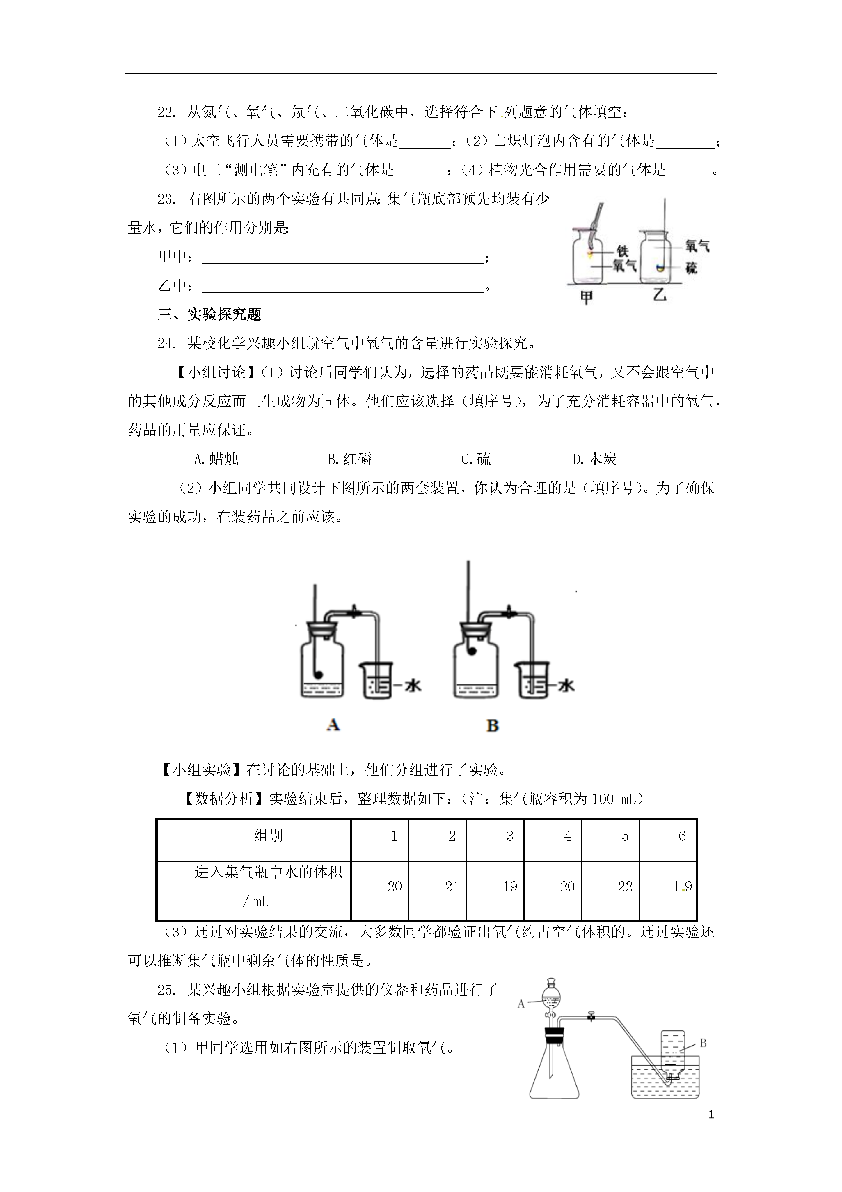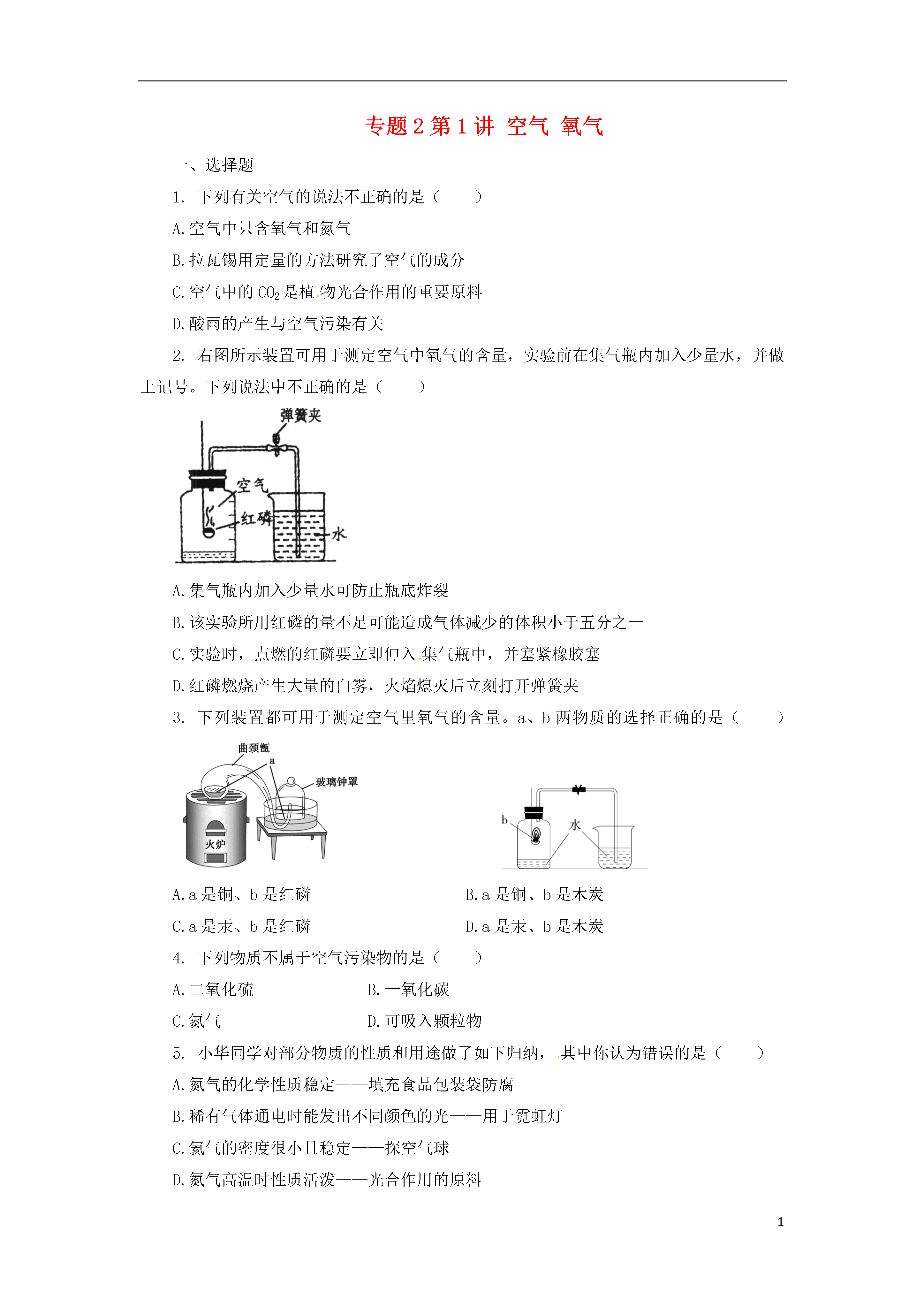 1专题2第1讲空气氧气一、选择题1.下列有关空气的说法不正确的是()A.空气中只含氧气和氮气B.拉瓦锡用定量的方法研究了空气的成分C.空气中的CO2是植物光合作用的重要原料D.酸雨的产生与空气污染有关2.右图所示装置可用于测定空气中氧气的含量,实验前在集气瓶内加入少量水,并做上记号。下列说法中不正确的是()A.集气瓶内加入少量水可防止瓶底炸裂B.该实验所用红磷的量不足可能造成气体减少的体积小于五分之一C.实验时,点燃的红磷要立即伸入集气瓶中,并塞紧橡胶塞D.红磷燃烧产生大量的白雾,火焰熄灭后立刻打开弹簧夹3.下列装置都可用于测定空气里氧气的含量。a、b两物质的选择正确的是()A.a是铜、b是红磷B.a是铜、b是木炭C.a是汞、b是红磷D.a是汞、b是木炭4.下列物质不属于空气污染物的是()A.二氧化硫B.一氧化碳C.氮气D.可吸入颗粒物5.小华同学对部分物质的性质和用途做了如下归纳,其中你认为错误的是()A.氮气的化学性质稳定——填充食品包装袋防腐B.稀有气体通电时能发出不同颜色的光——用于霓虹灯C.氦气的密度很小且稳定——探空气球D.氮气高温时性质活泼——光合作用的原料6.下列物质中属于混合物的是()A.河水B.氯酸钾C.三氧化硫D.五氧化二磷7.下列物质中,不属于空气成分的是()A.二氧化硫B.氮气C.氦气D.二氧化碳8.硫在氧气中燃烧,现象描述正确的是()A.产生耀眼白光B.产生黑色固体C.产生蓝紫色火焰D.产生大量白雾9.下列实验现象的描述中,正确的是()A.木炭在氧气中燃烧,生成有刺激性气味的气体B.硫在氧气中燃烧,发出淡蓝色火焰C.红磷在空气中燃烧产生大量白雾D.铁丝在氧气中燃烧,火星四射,生成黑色固体10.对氧气物理性质的叙述正确的是()A.易溶于水B.在-183℃时变为淡蓝色液体C.在-218℃时变为白色固体D.在标准状况下密度比空气略小11.关于氧气用途的说法不正确的是()A.氧气可用来炼钢B.氧气可用来灭火C.氧气可用于登山或飞行D.氧气可供给动植物呼吸12.下列关于氧气的说法正确的是()A.液态氧可用作火箭的助燃剂B.氧气在空气中的体积分数为78%C.硫在氧气中燃烧发出黄色火焰D.鱼类能在水中生存,证明氧气易溶于水13.下列现象属于缓慢氧化的是()A.木炭燃烧B.食物腐败C.蜡烛燃烧D.汽油燃烧14.下列实验室用高锰酸钾制取氧气的操作中,不正确的是()①试管水平放置②用排水法收集氧气③铁夹夹持在试管的中部④实验开始前先检查装置的气密性A.④B.②④C.①③D.①②15.实验室可用于氯酸钾制取氧气的装置组合是()①②③④⑤A.①④B.②③C.①⑤D.②⑤16.实验室制取氧气,既可采用分解过氧化氢的方法,也可采用分解氯酸钾的方法.这两种方法的共同点是()A.反应都不需要加热B.所需仪器相同C.均可用二氧化锰作催化剂D.都利用氧化物分解17.下列变化中,既属于化合反应又属于氧化反应的是()A.甲烷+氧气点燃二氧化碳+水B.硫+氢气点燃硫化氢C.氧化汞加热汞+氧气D.氧气+氢气点燃水18.向一定溶质质量分数的过氧化氢溶液加入少量二氧化锰,立即有大量的氧气产生,下列说法正确的是()A.过氧化氢中含有水和氧气B.过氧化氢能使二氧化锰分解放出氧气C.二氧化锰能加快过氧化氢分解生成水和氧气D.该反应中有过氧化氢和二氧化锰两种反应物,不属于分解反应19.下列关于催化剂的说法不正确的是()A.化学反应前后,催化剂的质量和化学性质都不变B.催化剂可以提高某些化学反应的速率C.催化剂可以降低某些化学反应的速率D.任何化学反应都需要催化剂20.下列属于分解反应的是()A.蒸发食盐水得食盐B.分离液态空气得到氧气C.过氧化氢分解制取氧气D.蜡烛燃烧生成水和二氧化碳二、填空题21.现有①木炭②硫黄③红磷④铁丝⑤蜡烛,五种物质分别在氧气中燃烧,用序号回答下列问题:(1)发出明亮的蓝紫色火焰的是;(2)产生大量白烟的是;(3)产生无色、无味的气体能使澄清石灰水变浑浊的是;(4)生成的气体会污染空气的是;(5)不属于化合反应的是。22.从氮气、氧气、氖气、二氧化碳中,选择符合下列题意的气体填空:(1)太空飞行人员需要携带的气体是;(2)白炽灯泡内含有的气体是;(3)电工“测电笔”内充有的气体是;(4)植物光合作用需要的气体是。23.右图所示的两个实验有共同点:集气瓶底部预先均装有少量水,它们的作用分别是:甲中:;乙中:。三、实验探究题24.某校化学兴趣小组就空气中氧气的含量进行实验探究。【小组讨论】(1)讨论后同
