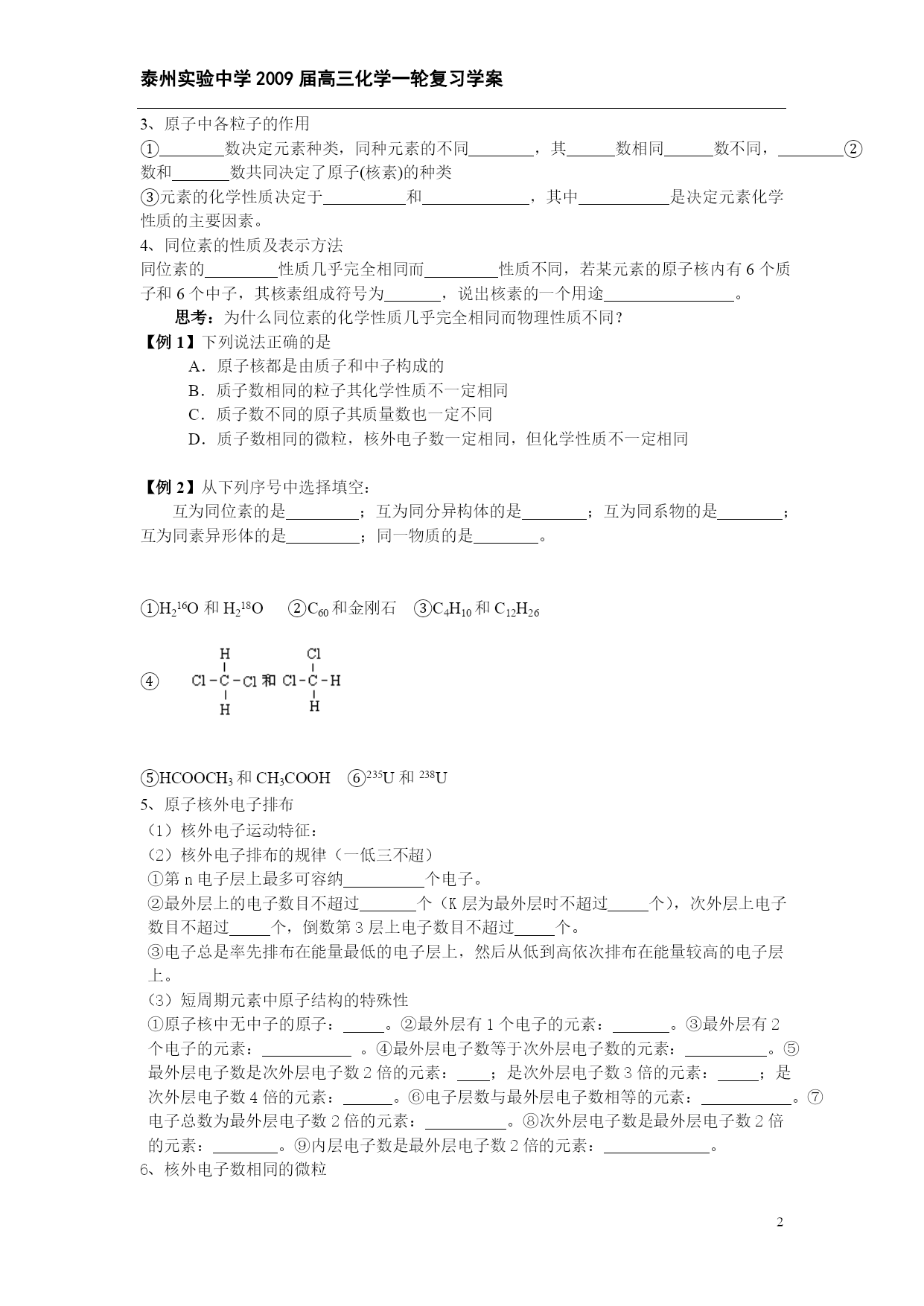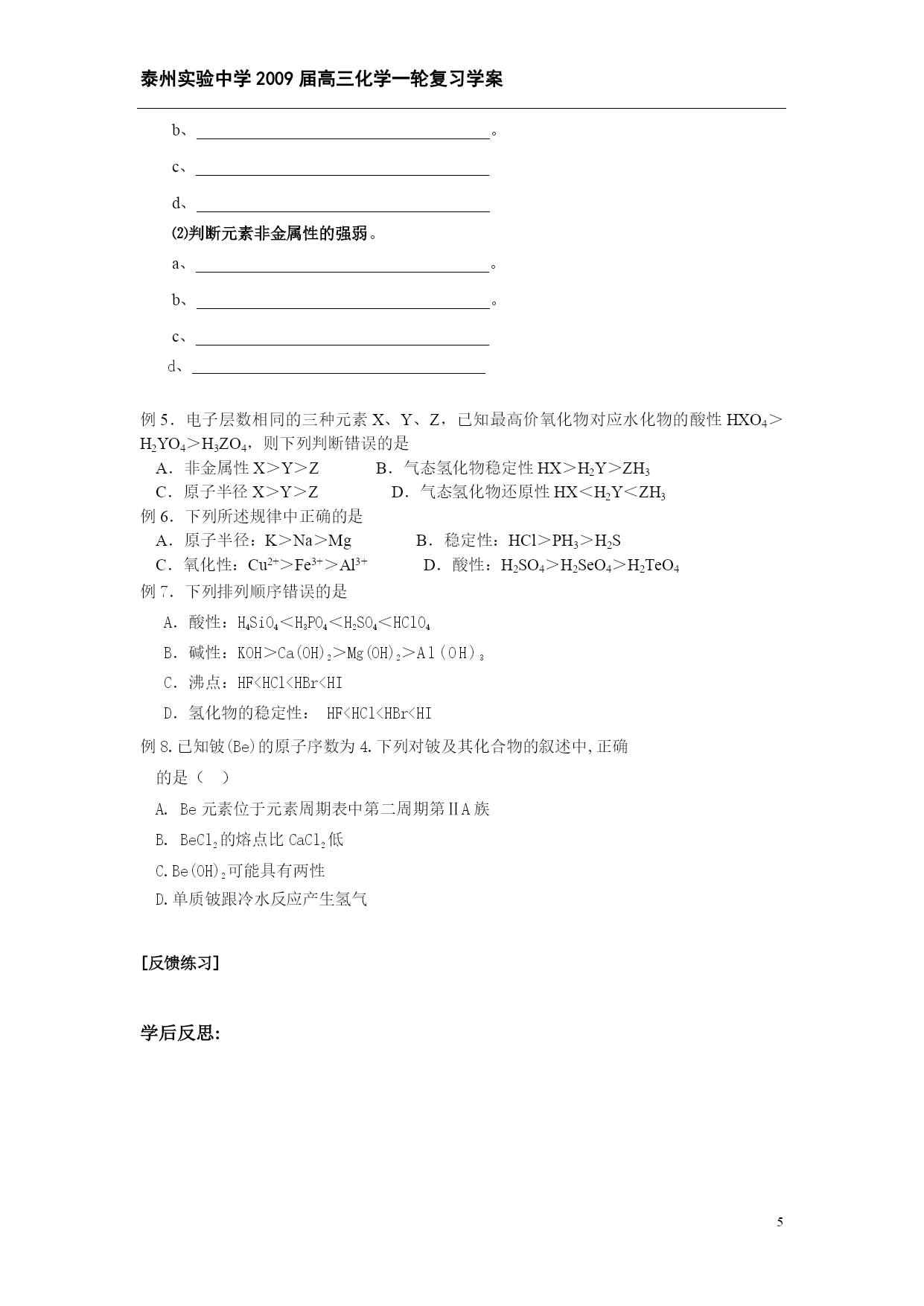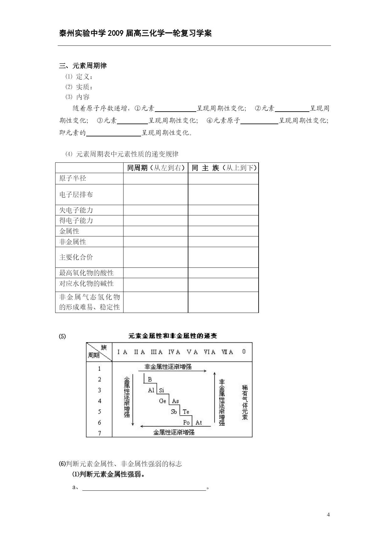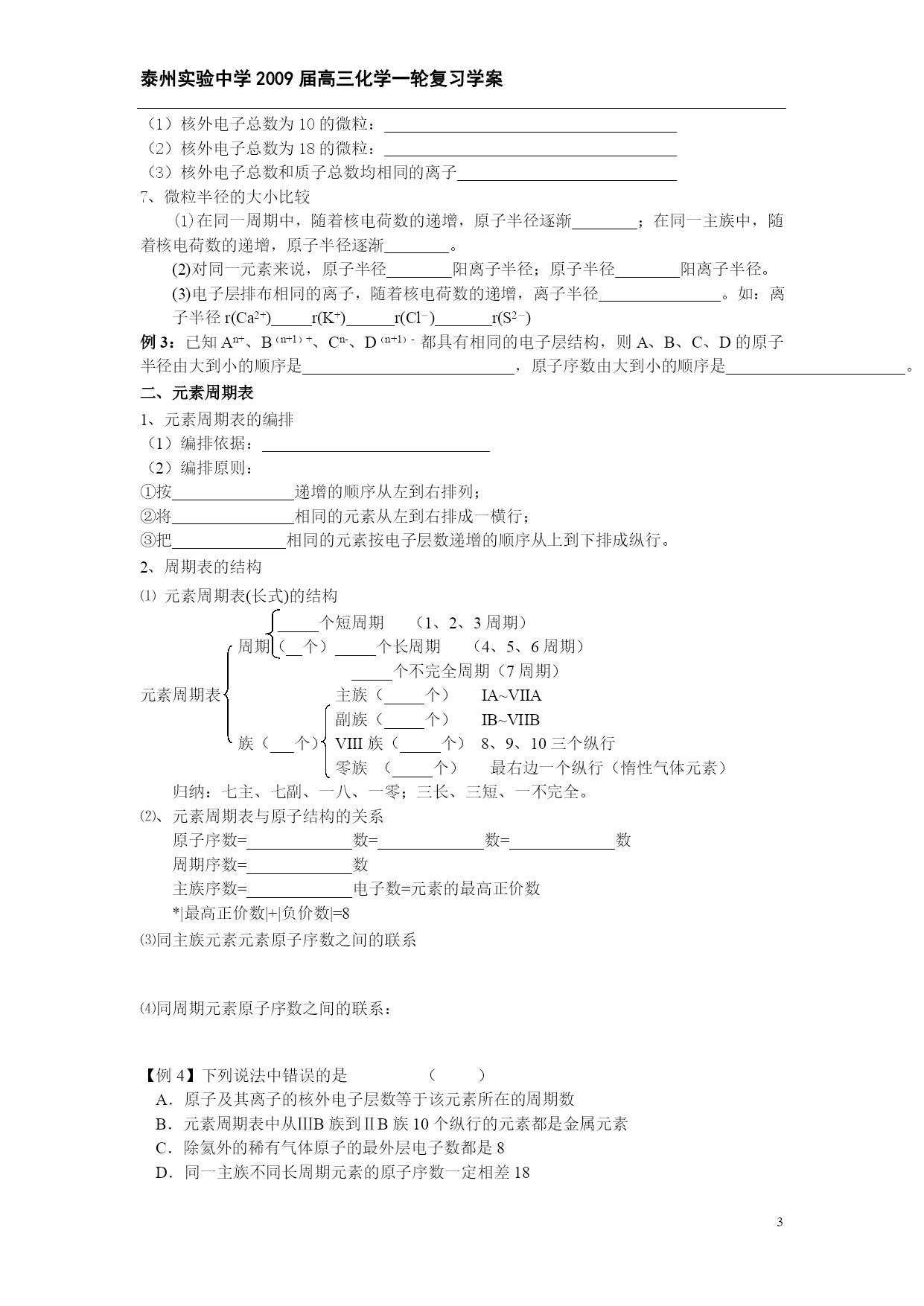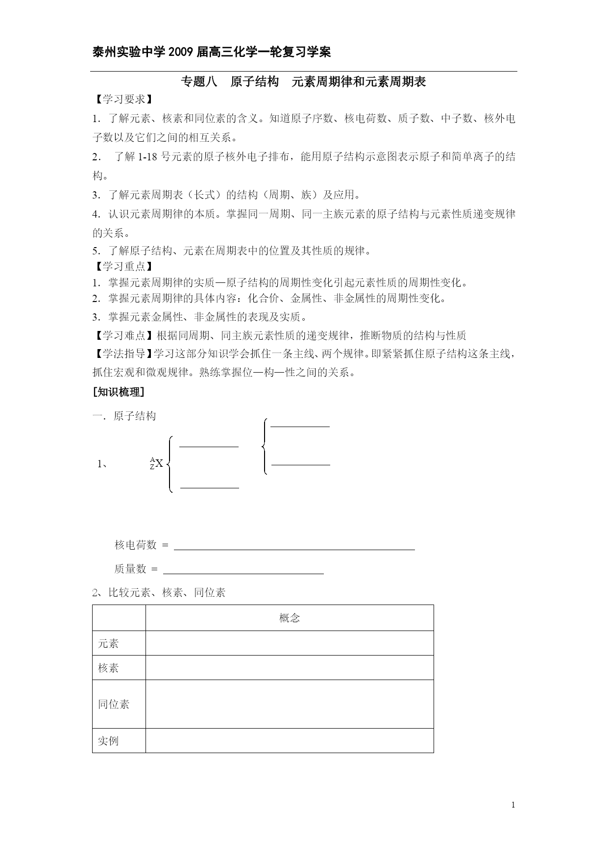 泰州实验中学2009届高三化学一轮复习学案 专题八原子结构元素周期律和元素周期表 【学习要求】 1.了解元素、核素和同位素的含义。知道原子序数、核电荷数、质子数、中子数、核外电子数以及它们之间的相互关系。 2.了解1-18号元素的原子核外电子排布,能用原子结构示意图表示原子和简单离子的结构。 3.了解元素周期表(长式)的结构(周期、族)及应用。 4.认识元素周期律的本质。掌握同一周期、同一主族元素的原子结构与元素性质递变规律的关系。 5.了解原子结构、元素在周期表中的位置及其性质的规律。 【学习重点】 1.掌握元素周期律的实质—原子结构的周期性变化引起元素性质的周期性变化。 2.掌握元素周期律的具体内容:化合价、金属性、非金属性的周期性变化。 3.掌握元素金属性、非金属性的表现及实质。 【学习难点】根据同周期、同主族元素性质的递变规律,推断物质的结构与性质 【学法指导】学习这部分知识学会抓住一条主线、两个规律。即紧紧抓住原子结构这条主线,抓住宏观和微观规律。熟练掌握位—构—性之间的关系。 [知识梳理] X Z A 一.原子结构 1、 核电荷数= 质量数= 2、比较元素、核素、同位素 概念元素核素同位素实例 3、原子中各粒子的作用 ①数决定元素种类,同种元素的不同,其数相同数不同,②数和数共同决定了原子(核素)的种类 ③元素的化学性质决定于和,其中是决定元素化学性质的主要因素。 4、同位素的性质及表示方法 同位素的性质几乎完全相同而性质不同,若某元素的原子核内有6个质子和6个中子,其核素组成符号为,说出核素的一个用途。 思考:为什么同位素的化学性质几乎完全相同而物理性质不同? 【例1】下列说法正确的是 A.原子核都是由质子和中子构成的 B.质子数相同的粒子其化学性质不一定相同 C.质子数不同的原子其质量数也一定不同 D.质子数相同的微粒,核外电子数一定相同,但化学性质不一定相同 【例2】从下列序号中选择填空: 互为同位素的是;互为同分异构体的是;互为同系物的是;互为同素异形体的是;同一物质的是。 ①H216O和H218O②C60和金刚石③C4H10和C12H26 ④ ⑤HCOOCH3和CH3COOH⑥235U和238U 5、原子核外电子排布 (1)核外电子运动特征: (2)核外电子排布的规律(一低三不超) ①第n电子层上最多可容纳个电子。 ②最外层上的电子数目不超过个(K层为最外层时不超过个),次外层上电子数目不超过个,倒数第3层上电子数目不超过个。 ③电子总是率先排布在能量最低的电子层上,然后从低到高依次排布在能量较高的电子层上。 (3)短周期元素中原子结构的特殊性 ①原子核中无中子的原子:。②最外层有1个电子的元素:。③最外层有2个电子的元素:。④最外层电子数等于次外层电子数的元素:。⑤最外层电子数是次外层电子数2倍的元素:;是次外层电子数3倍的元素:;是次外层电子数4倍的元素:。⑥电子层数与最外层电子数相等的元素:。⑦电子总数为最外层电子数2倍的元素:。⑧次外层电子数是最外层电子数2倍的元素:。⑨内层电子数是最外层电子数2倍的元素:。 6、核外电子数相同的微粒 (1)核外电子总数为10的微粒: (2)核外电子总数为18的微粒: (3)核外电子总数和质子总数均相同的离子 7、微粒半径的大小比较 (1)在同一周期中,随着核电荷数的递增,原子半径逐渐;在同一主族中,随着核电荷数的递增,原子半径逐渐。 (2)对同一元素来说,原子半径阳离子半径;原子半径阳离子半径。 (3)电子层排布相同的离子,随着核电荷数的递增,离子半径。如:离子半径r(Ca2+)r(K+)r(Cl-)r(S2-) 例3:已知An+、B(n+1)+、Cn-、D(n+1)-都具有相同的电子层结构,则A、B、C、D的原子半径由大到小的顺序是,原子序数由大到小的顺序是。 二、元素周期表 1、元素周期表的编排 (1)编排依据: (2)编排原则: ①按递增的顺序从左到右排列; ②将相同的元素从左到右排成一横行; ③把相同的元素按电子层数递增的顺序从上到下排成纵行。 2、周期表的结构 ⑴元素周期表(长式)的结构 _____个短周期(1、2、3周期) 周期(__个)_____个长周期(4、5、6周期) _____个不完全周期(7周期) 元素周期表主族(_____个)IA~VIIA 副族(_____个)IB~VIIB 族(___个)VIII族(_____个)8、9、10三个纵行 零族(_____个)最右边一个纵行(惰性气体元素) 归纳:七主、七副、一八、一零;三长、三短、一不完全。 ⑵、元素周期表与原子结构的关系 原子序数=_____________数=_____________数=_____________数 周期序数=_______