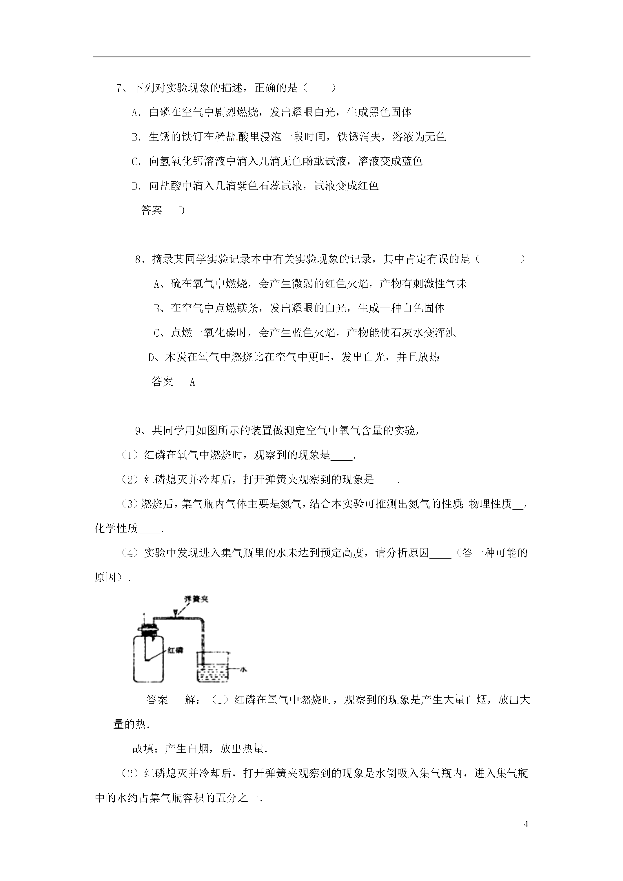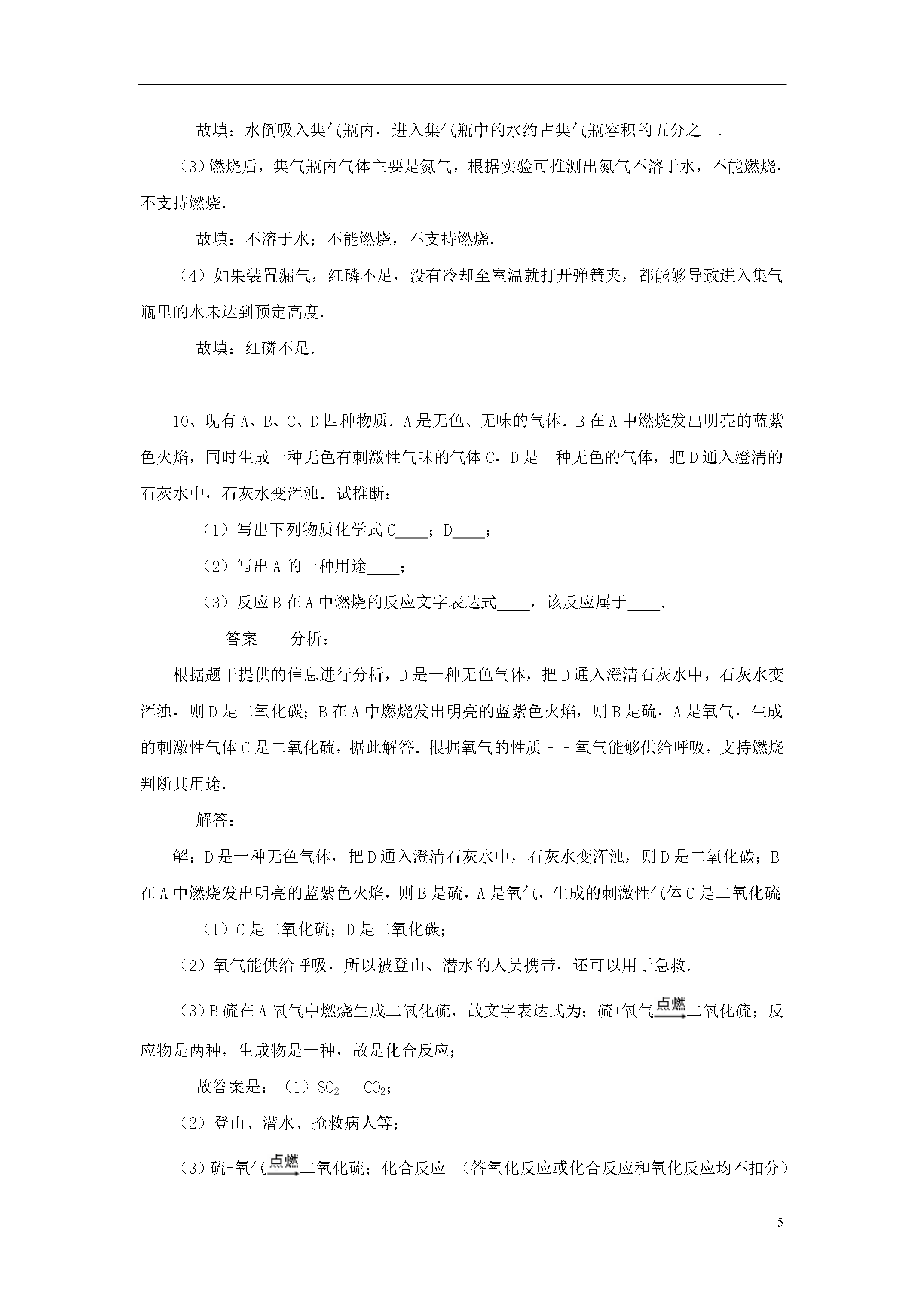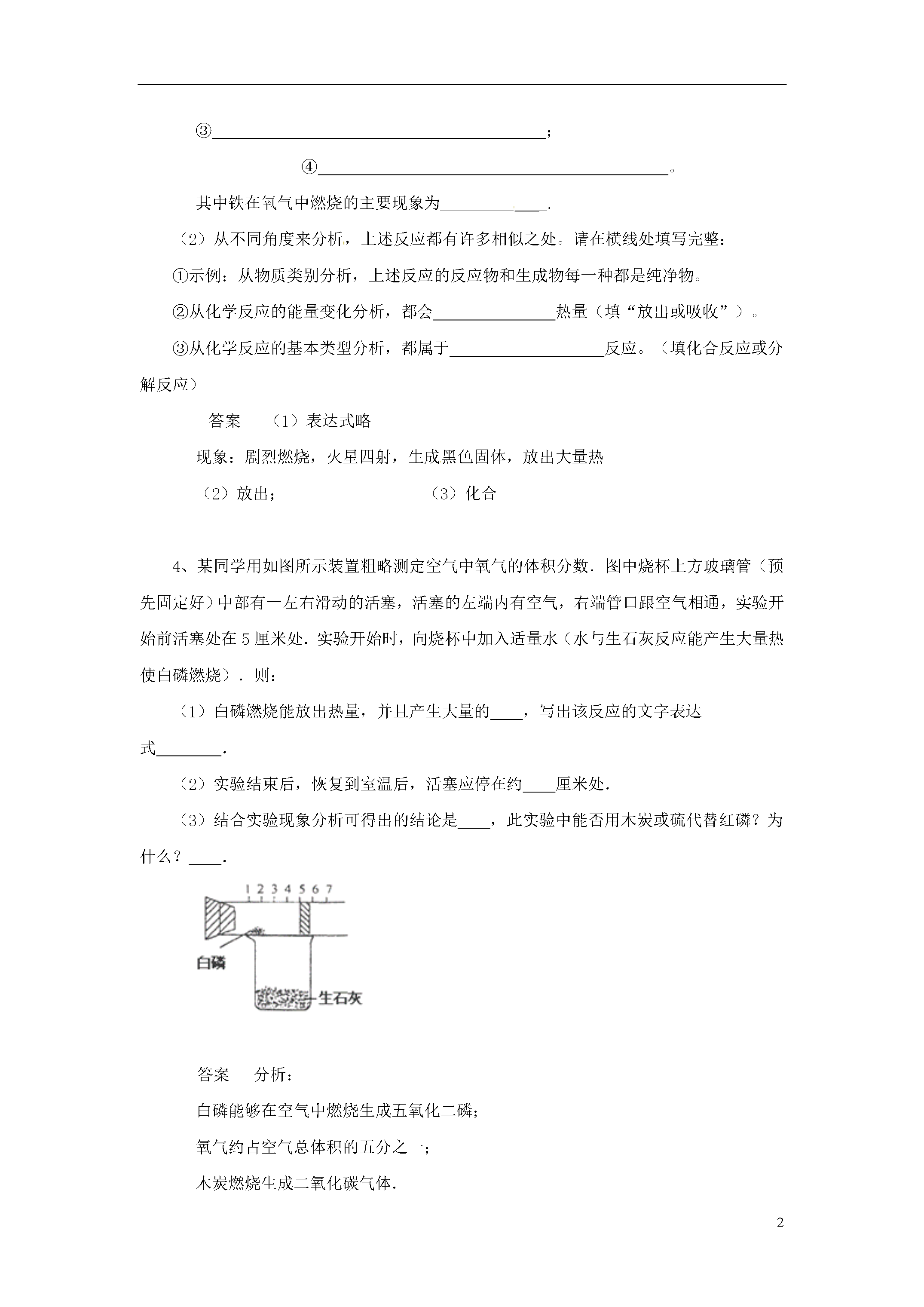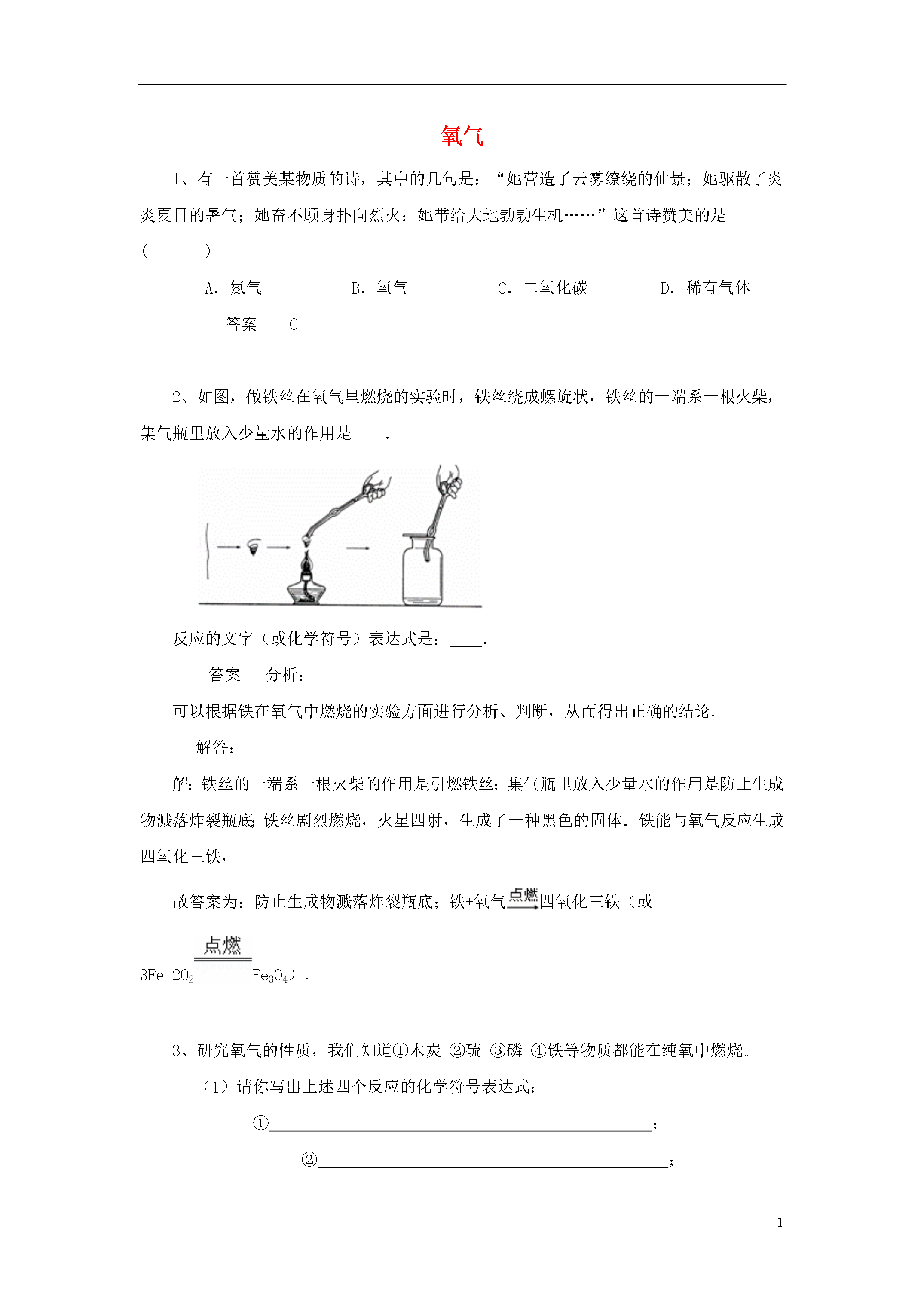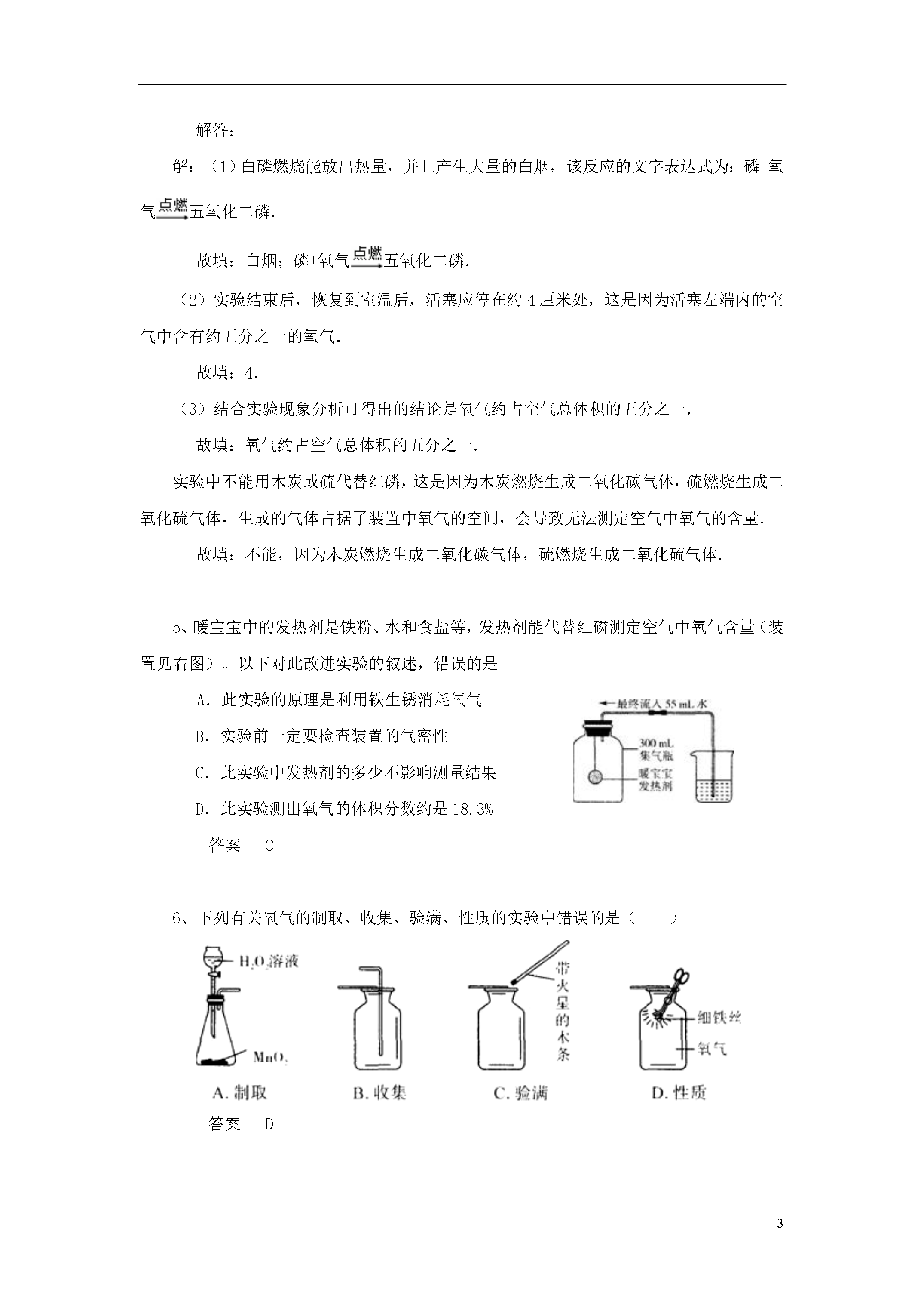 25氧气1、有一首赞美某物质的诗,其中的几句是:“她营造了云雾缭绕的仙景;她驱散了炎炎夏日的暑气;她奋不顾身扑向烈火:她带给大地勃勃生机……”这首诗赞美的是()A.氮气B.氧气C.二氧化碳D.稀有气体答案C2、如图,做铁丝在氧气里燃烧的实验时,铁丝绕成螺旋状,铁丝的一端系一根火柴,集气瓶里放入少量水的作用是.反应的文字(或化学符号)表达式是:.答案分析:可以根据铁在氧气中燃烧的实验方面进行分析、判断,从而得出正确的结论.解答:解:铁丝的一端系一根火柴的作用是引燃铁丝;集气瓶里放入少量水的作用是防止生成物溅落炸裂瓶底;铁丝剧烈燃烧,火星四射,生成了一种黑色的固体.铁能与氧气反应生成四氧化三铁,故答案为:防止生成物溅落炸裂瓶底;铁+氧气四氧化三铁(或3Fe+2O2Fe3O4).3、研究氧气的性质,我们知道①木炭②硫③磷④铁等物质都能在纯氧中燃烧。(1)请你写出上述四个反应的化学符号表达式:①;②;③;④。其中铁在氧气中燃烧的主要现象为__________.(2)从不同角度来分析,上述反应都有许多相似之处。请在横线处填写完整:①示例:从物质类别分析,上述反应的反应物和生成物每一种都是纯净物。②从化学反应的能量变化分析,都会热量(填“放出或吸收”)。③从化学反应的基本类型分析,都属于反应。(填化合反应或分解反应)答案(1)表达式略现象:剧烈燃烧,火星四射,生成黑色固体,放出大量热(2)放出;(3)化合4、某同学用如图所示装置粗略测定空气中氧气的体积分数.图中烧杯上方玻璃管(预先固定好)中部有一左右滑动的活塞,活塞的左端内有空气,右端管口跟空气相通,实验开始前活塞处在5厘米处.实验开始时,向烧杯中加入适量水(水与生石灰反应能产生大量热使白磷燃烧).则:(1)白磷燃烧能放出热量,并且产生大量的,写出该反应的文字表达式.(2)实验结束后,恢复到室温后,活塞应停在约厘米处.(3)结合实验现象分析可得出的结论是,此实验中能否用木炭或硫代替红磷?为什么?.答案分析:白磷能够在空气中燃烧生成五氧化二磷;氧气约占空气总体积的五分之一;木炭燃烧生成二氧化碳气体.解答:解:(1)白磷燃烧能放出热量,并且产生大量的白烟,该反应的文字表达式为:磷+氧气五氧化二磷.故填:白烟;磷+氧气五氧化二磷.(2)实验结束后,恢复到室温后,活塞应停在约4厘米处,这是因为活塞左端内的空气中含有约五分之一的氧气.故填:4.(3)结合实验现象分析可得出的结论是氧气约占空气总体积的五分之一.故填:氧气约占空气总体积的五分之一.实验中不能用木炭或硫代替红磷,这是因为木炭燃烧生成二氧化碳气体,硫燃烧生成二氧化硫气体,生成的气体占据了装置中氧气的空间,会导致无法测定空气中氧气的含量.故填:不能,因为木炭燃烧生成二氧化碳气体,硫燃烧生成二氧化硫气体.5、暖宝宝中的发热剂是铁粉、水和食盐等,发热剂能代替红磷测定空气中氧气含量(装置见右图)。以下对此改进实验的叙述,错误的是A.此实验的原理是利用铁生锈消耗氧气B.实验前一定要检查装置的气密性C.此实验中发热剂的多少不影响测量结果D.此实验测出氧气的体积分数约是18.3%答案C6、下列有关氧气的制取、收集、验满、性质的实验中错误的是()答案D7、下列对实验现象的描述,正确的是()A.白磷在空气中剧烈燃烧,发出耀眼白光,生成黑色固体B.生锈的铁钉在稀盐酸里浸泡一段时间,铁锈消失,溶液为无色C.向氢氧化钙溶液中滴入几滴无色酚酞试液,溶液变成蓝色D.向盐酸中滴入几滴紫色石蕊试液,试液变成红色答案D8、摘录某同学实验记录本中有关实验现象的记录,其中肯定有误的是()A、硫在氧气中燃烧,会产生微弱的红色火焰,产物有刺激性气味B、在空气中点燃镁条,发出耀眼的白光,生成一种白色固体C、点燃一氧化碳时,会产生蓝色火焰,产物能使石灰水变浑浊D、木炭在氧气中燃烧比在空气中更旺,发出白光,并且放热答案A9、某同学用如图所示的装置做测定空气中氧气含量的实验,(1)红磷在氧气中燃烧时,观察到的现象是.(2)红磷熄灭并冷却后,打开弹簧夹观察到的现象是.(3)燃烧后,集气瓶内气体主要是氮气,结合本实验可推测出氮气的性质:物理性质,化学性质.(4)实验中发现进入集气瓶里的水未达到预定高度,请分析原因(答一种可能的原因).答案解:(1)红磷在氧气中燃烧时,观察到的现象是产生大量白烟,放出大量的热.故填:产生白烟,放出热量.(2)红磷熄灭并冷却后,打开弹簧夹观察到的现象是水倒吸入集气瓶内,进入集气瓶中的水约占集气瓶容积的五分之一.故填:水倒吸入集气瓶内,进入集气瓶中的水约占集气瓶容积的五分之一.(3)燃烧后,集气瓶内气体主要是氮气,根据实验可推测出氮气不溶于水,不能燃烧,不支持燃烧.故填:不溶于水;不能燃烧,不支持燃烧.(4)如果装置漏气,红磷不足,没有冷却至室温就打开弹簧夹,都能