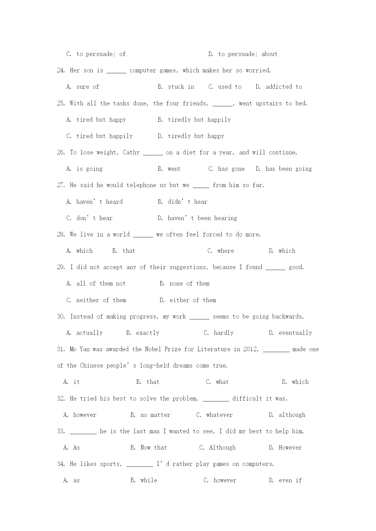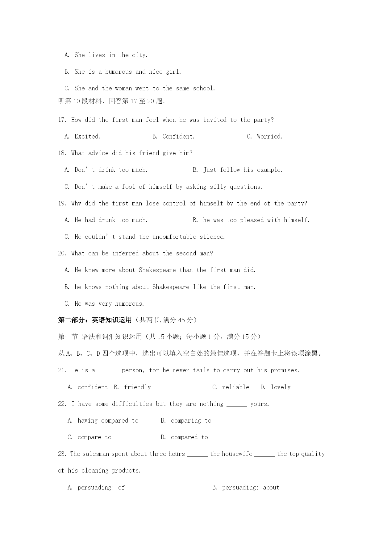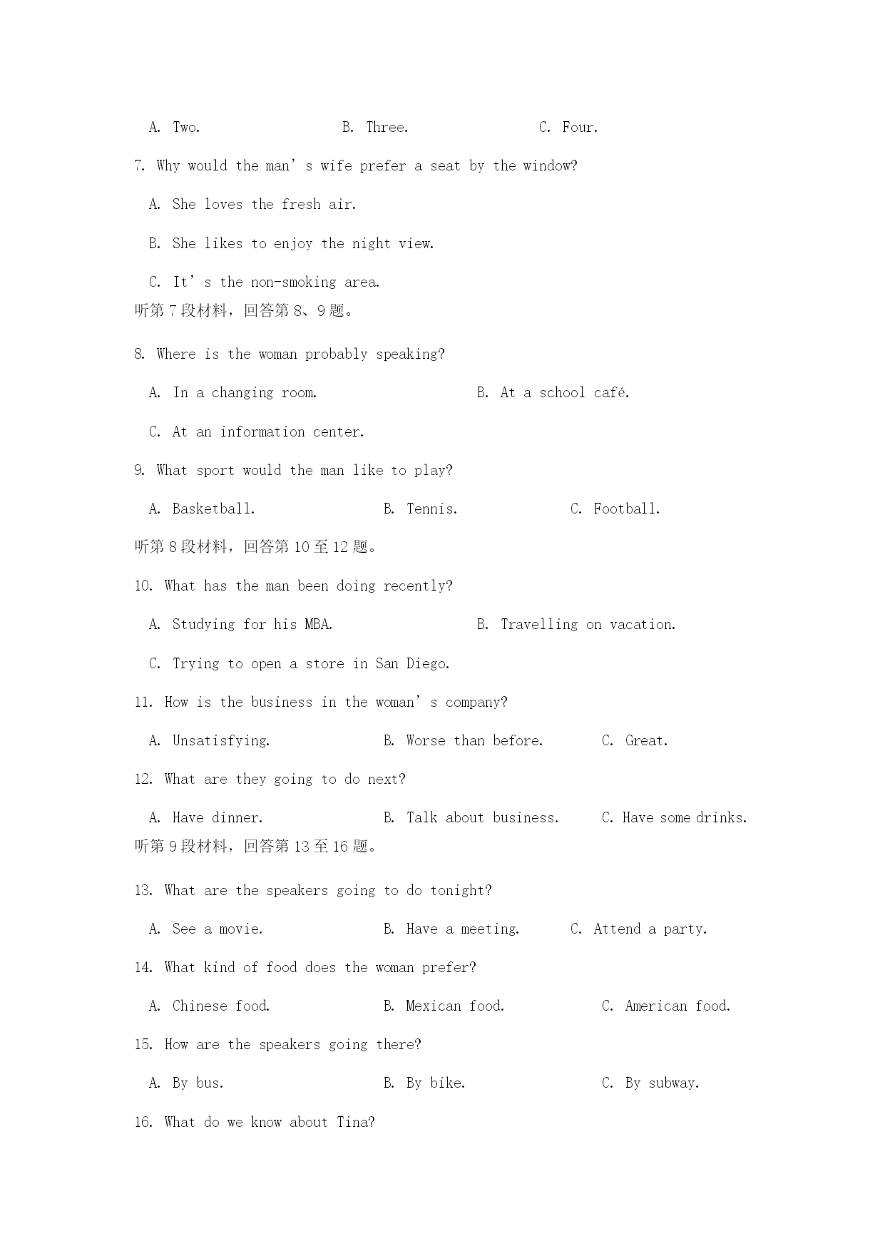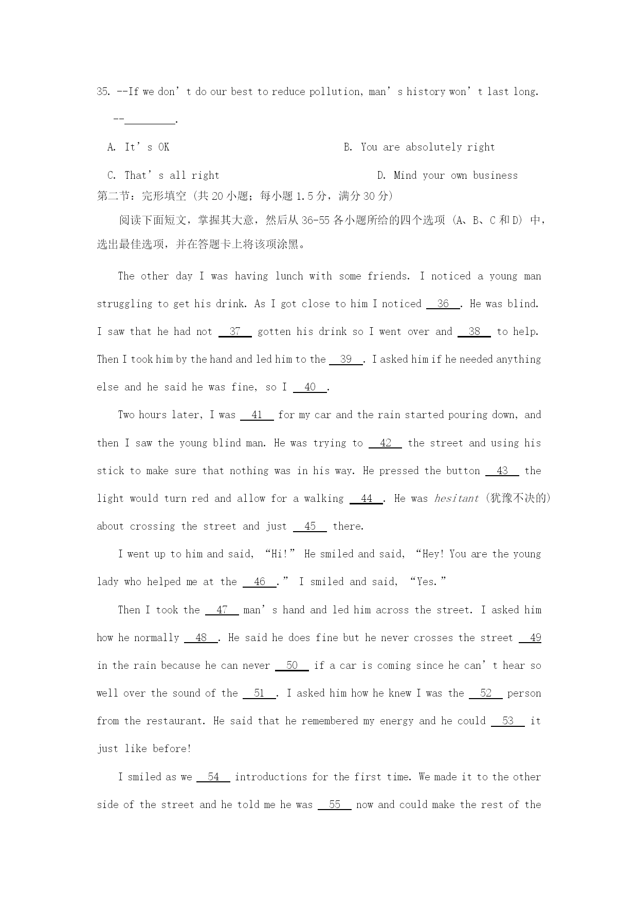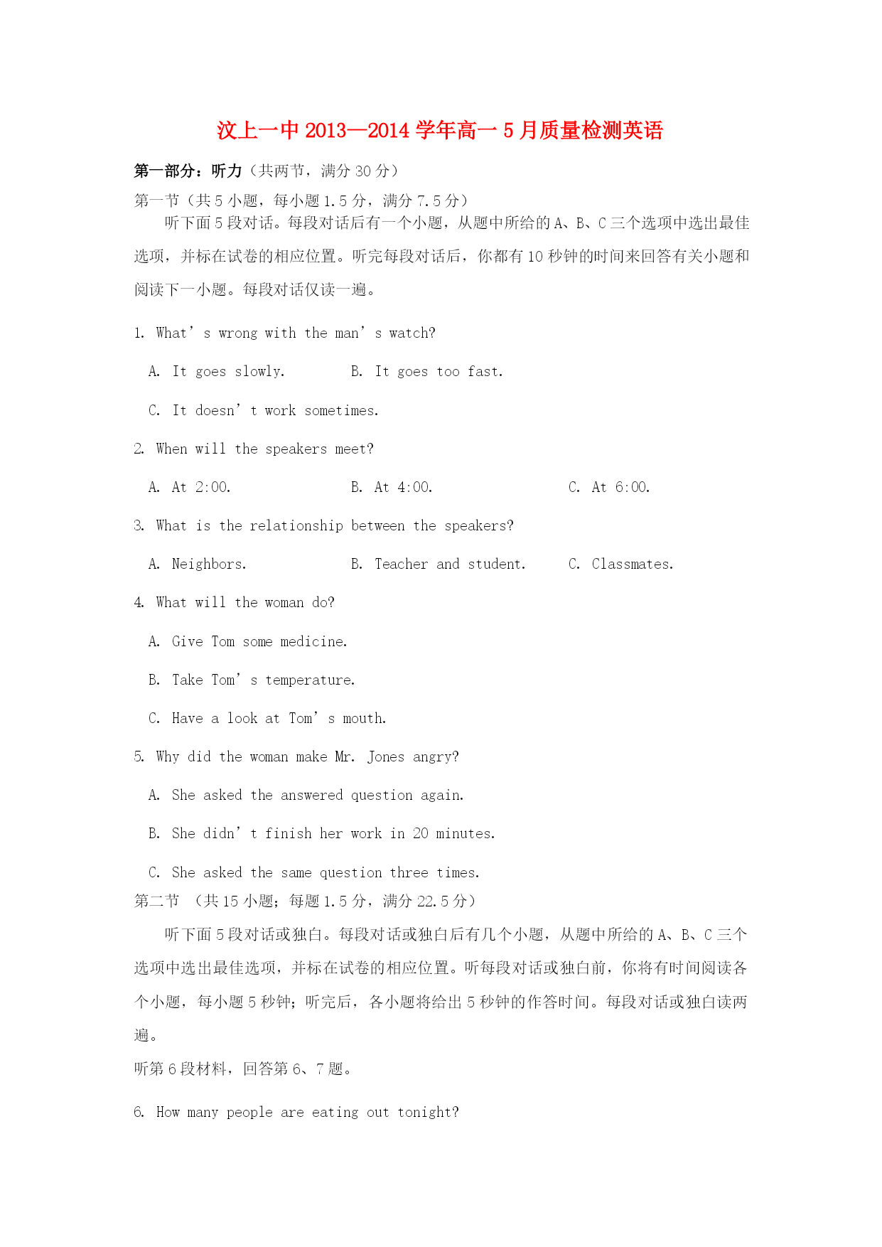 汶上一中2013—2014学年高一5月质量检测英语 第一部分:听力(共两节,满分30分) 第一节(共5小题,每小题1.5分,满分7.5分) 听下面5段对话。每段对话后有一个小题,从题中所给的A、B、C三个选项中选出最佳选项,并标在试卷的相应位置。听完每段对话后,你都有10秒钟的时间来回答有关小题和阅读下一小题。每段对话仅读一遍。 1.What’swrongwiththeman’swatch? A.Itgoesslowly. B.Itgoestoofast. C.Itdoesn’tworksometimes. 2.Whenwillthespeakersmeet? A.At2:00. B.At4:00. C.At6:00. 3.Whatistherelationshipbetweenthespeakers? A.Neighbors. B.Teacherandstudent. C.Classmates. 4.Whatwillthewomando? A.GiveTomsomemedicine. B.TakeTom’stemperature. C.HavealookatTom’smouth. 5.WhydidthewomanmakeMr.Jonesangry? A.Sheaskedtheansweredquestionagain. B.Shedidn’tfinishherworkin20minutes. C.Sheaskedthesamequestionthreetimes. 第二节(共15小题;每题1.5分,满分22.5分) 听下面5段对话或独白。每段对话或独白后有几个小题,从题中所给的A、B、C三个选项中选出最佳选项,并标在试卷的相应位置。听每段对话或独白前,你将有时间阅读各个小题,每小题5秒钟;听完后,各小题将给出5秒钟的作答时间。每段对话或独白读两遍。 听第6段材料,回答第6、7题。 6.Howmanypeopleareeatingouttonight? A.Two. B.Three. C.Four. 7.Whywouldtheman’swifepreferaseatbythewindow? A.Shelovesthefreshair. B.Shelikestoenjoythenightview. C.It’sthenon-smokingarea. 听第7段材料,回答第8、9题。 8.Whereisthewomanprobablyspeaking? A.Inachangingroom. B.Ataschoolcafé. C.Ataninformationcenter. 9.Whatsportwouldthemanliketoplay? A.Basketball. B.Tennis. C.Football. 听第8段材料,回答第10至12题。 10.Whathasthemanbeendoingrecently? A.StudyingforhisMBA. B.Travellingonvacation. C.TryingtoopenastoreinSanDiego. 11.Howisthebusinessinthewoman’scompany? A.Unsatisfying. B.Worsethanbefore. C.Great. 12.Whataretheygoingtodonext? A.Havedinner. B.Talkaboutbusiness. C.Havesomedrinks. 听第9段材料,回答第13至16题。 13.Whatarethespeakersgoingtodotonight? A.Seeamovie. B.Haveameeting. C.Attendaparty. 14.Whatkindoffooddoesthewomanprefer? A.Chinesefood. B.Mexicanfood. C.Americanfood. 15.Howarethespeakersgoingthere? A.Bybus. B.Bybike. C.Bysubway. 16.WhatdoweknowaboutTina? A.Shelivesinthecity. B.Sheisahumorousandnicegirl. C.Sheandthewomanwenttothesameschool. 听第10段材料,回答第17至20题。 17.Howdidthefirstmanfeelwhenhewasinvitedtotheparty? A.Excited. B.Confident. C.Worried. 18