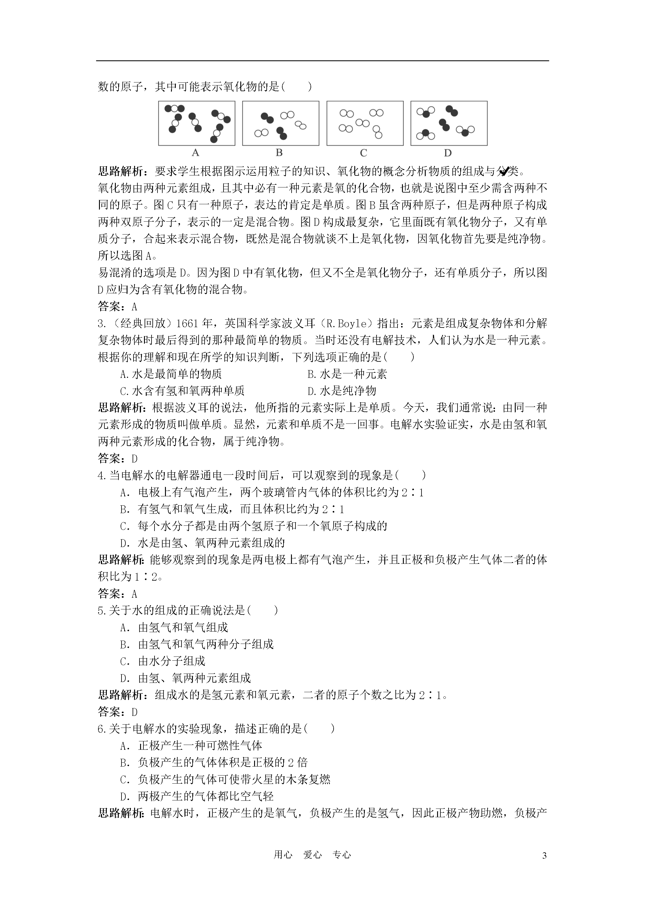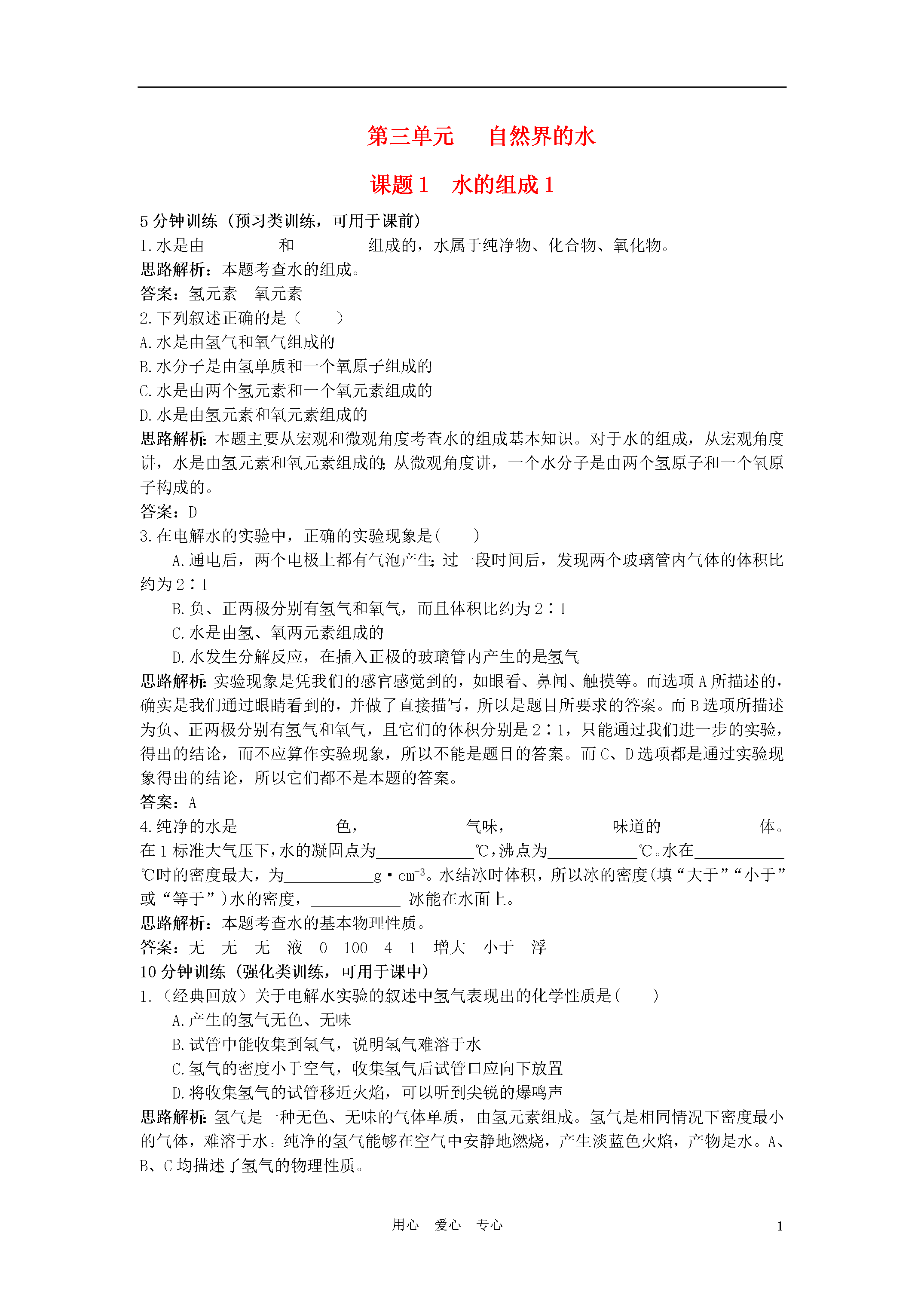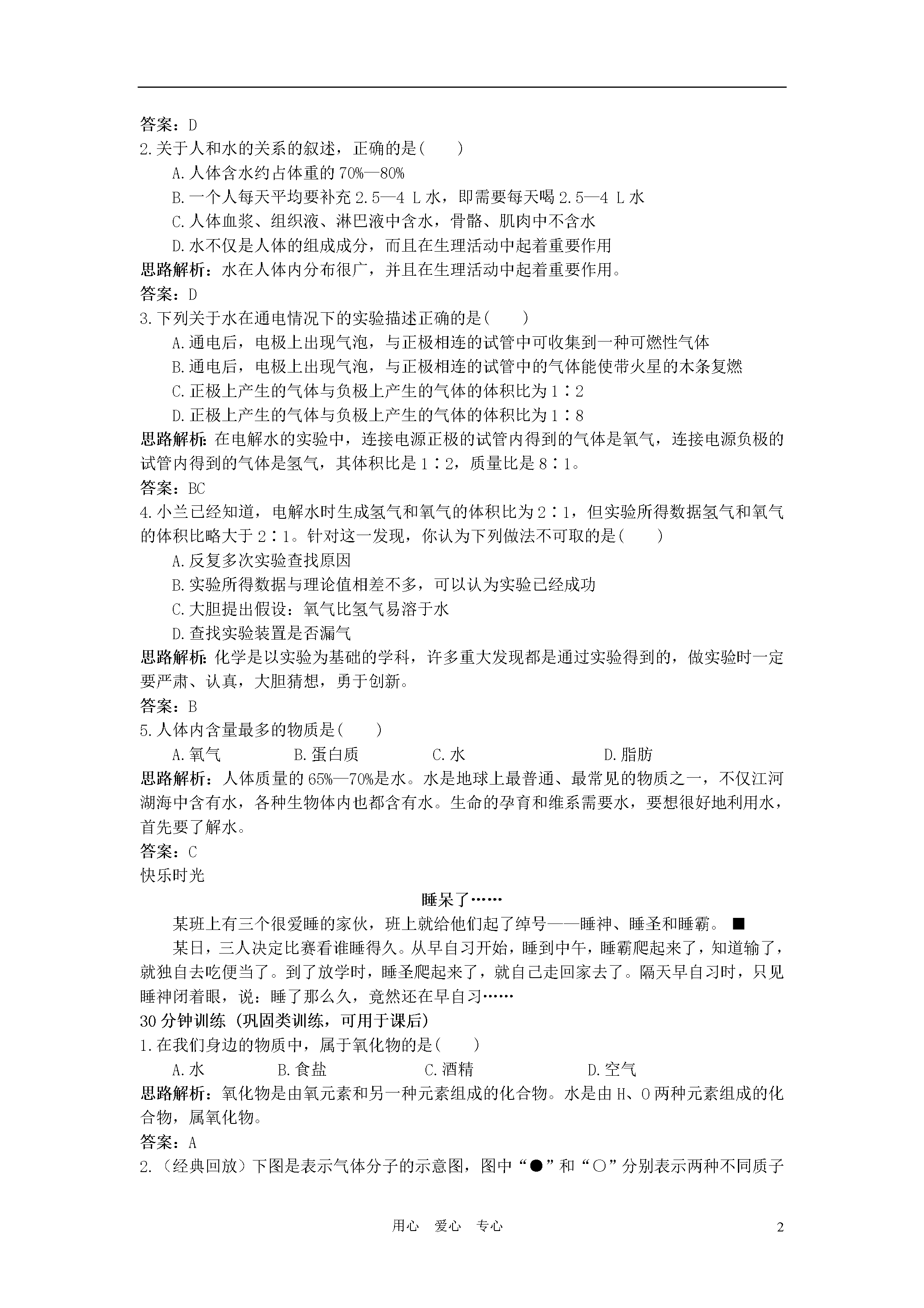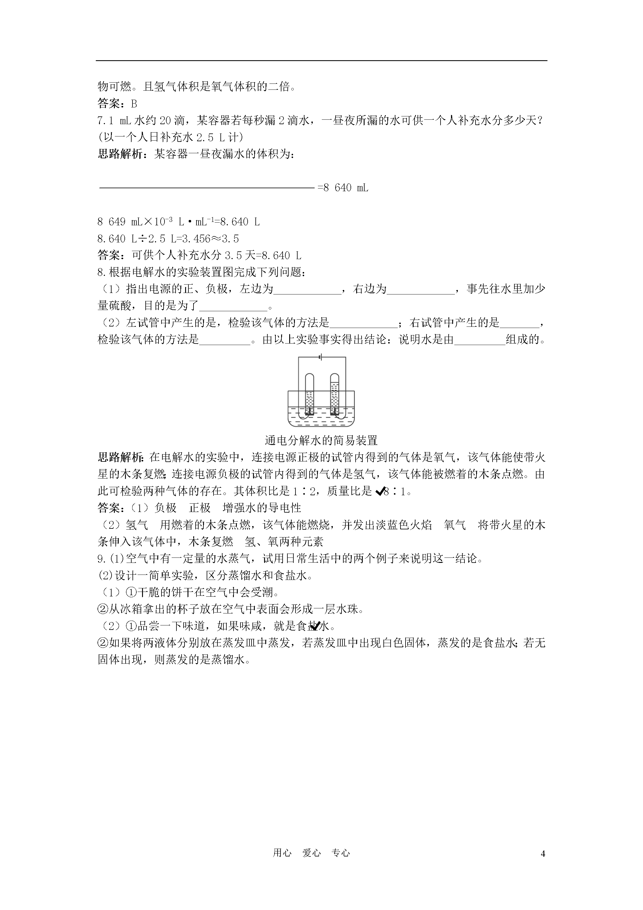 4用心爱心专心第三单元自然界的水课题1水的组成15分钟训练(预习类训练,可用于课前)1.水是由_________和_________组成的,水属于纯净物、化合物、氧化物。思路解析:本题考查水的组成。答案:氢元素氧元素2.下列叙述正确的是()A.水是由氢气和氧气组成的B.水分子是由氢单质和一个氧原子组成的C.水是由两个氢元素和一个氧元素组成的D.水是由氢元素和氧元素组成的思路解析:本题主要从宏观和微观角度考查水的组成基本知识。对于水的组成,从宏观角度讲,水是由氢元素和氧元素组成的;从微观角度讲,一个水分子是由两个氢原子和一个氧原子构成的。答案:D3.在电解水的实验中,正确的实验现象是()A.通电后,两个电极上都有气泡产生;过一段时间后,发现两个玻璃管内气体的体积比约为2∶1B.负、正两极分别有氢气和氧气,而且体积比约为2∶1C.水是由氢、氧两元素组成的D.水发生分解反应,在插入正极的玻璃管内产生的是氢气思路解析:实验现象是凭我们的感官感觉到的,如眼看、鼻闻、触摸等。而选项A所描述的,确实是我们通过眼睛看到的,并做了直接描写,所以是题目所要求的答案。而B选项所描述为负、正两极分别有氢气和氧气,且它们的体积分别是2∶1,只能通过我们进一步的实验,得出的结论,而不应算作实验现象,所以不能是题目的答案。而C、D选项都是通过实验现象得出的结论,所以它们都不是本题的答案。答案:A4.纯净的水是____________色,____________气味,____________味道的____________体。在1标准大气压下,水的凝固点为____________℃,沸点为___________℃。水在___________℃时的密度最大,为___________g·cm-3。水结冰时体积,所以冰的密度(填“大于”“小于”或“等于”)水的密度,___________冰能在水面上。思路解析:本题考查水的基本物理性质。答案:无无无液010041增大小于浮10分钟训练(强化类训练,可用于课中)1.(经典回放)关于电解水实验的叙述中氢气表现出的化学性质是()A.产生的氢气无色、无味B.试管中能收集到氢气,说明氢气难溶于水C.氢气的密度小于空气,收集氢气后试管口应向下放置D.将收集氢气的试管移近火焰,可以听到尖锐的爆鸣声思路解析:氢气是一种无色、无味的气体单质,由氢元素组成。氢气是相同情况下密度最小的气体,难溶于水。纯净的氢气能够在空气中安静地燃烧,产生淡蓝色火焰,产物是水。A、B、C均描述了氢气的物理性质。答案:D2.关于人和水的关系的叙述,正确的是()A.人体含水约占体重的70%—80%B.一个人每天平均要补充2.5—4L水,即需要每天喝2.5—4L水C.人体血浆、组织液、淋巴液中含水,骨骼、肌肉中不含水D.水不仅是人体的组成成分,而且在生理活动中起着重要作用思路解析:水在人体内分布很广,并且在生理活动中起着重要作用。答案:D3.下列关于水在通电情况下的实验描述正确的是()A.通电后,电极上出现气泡,与正极相连的试管中可收集到一种可燃性气体B.通电后,电极上出现气泡,与正极相连的试管中的气体能使带火星的木条复燃C.正极上产生的气体与负极上产生的气体的体积比为1∶2D.正极上产生的气体与负极上产生的气体的体积比为1∶8思路解析:在电解水的实验中,连接电源正极的试管内得到的气体是氧气,连接电源负极的试管内得到的气体是氢气,其体积比是1∶2,质量比是8∶1。答案:BC4.小兰已经知道,电解水时生成氢气和氧气的体积比为2∶1,但实验所得数据氢气和氧气的体积比略大于2∶1。针对这一发现,你认为下列做法不可取的是()A.反复多次实验查找原因B.实验所得数据与理论值相差不多,可以认为实验已经成功C.大胆提出假设:氧气比氢气易溶于水D.查找实验装置是否漏气思路解析:化学是以实验为基础的学科,许多重大发现都是通过实验得到的,做实验时一定要严肃、认真,大胆猜想,勇于创新。答案:B5.人体内含量最多的物质是()A.氧气B.蛋白质C.水D.脂肪思路解析:人体质量的65%—70%是水。水是地球上最普通、最常见的物质之一,不仅江河湖海中含有水,各种生物体内也都含有水。生命的孕育和维系需要水,要想很好地利用水,首先要了解水。答案:C快乐时光睡呆了……某班上有三个很爱睡的家伙,班上就给他们起了绰号——睡神、睡圣和睡霸。某日,三人决定比赛看谁睡得久。从早自习开始,睡到中午,睡霸爬起来了,知道输了,就独自去吃便当了。到了放学时,睡圣爬起来了,就自己走回家去了。隔天早自习时,只见睡神闭着眼,说:睡了那么久,竟然还在早自习……30分钟训练(巩固类训练,可用于课后)1.在我们身边的物质中,属于氧化物的是()A.水B.食盐C.酒精D.空气思路解析:氧化物是由氧元素和另一种元素组成的化合物。水