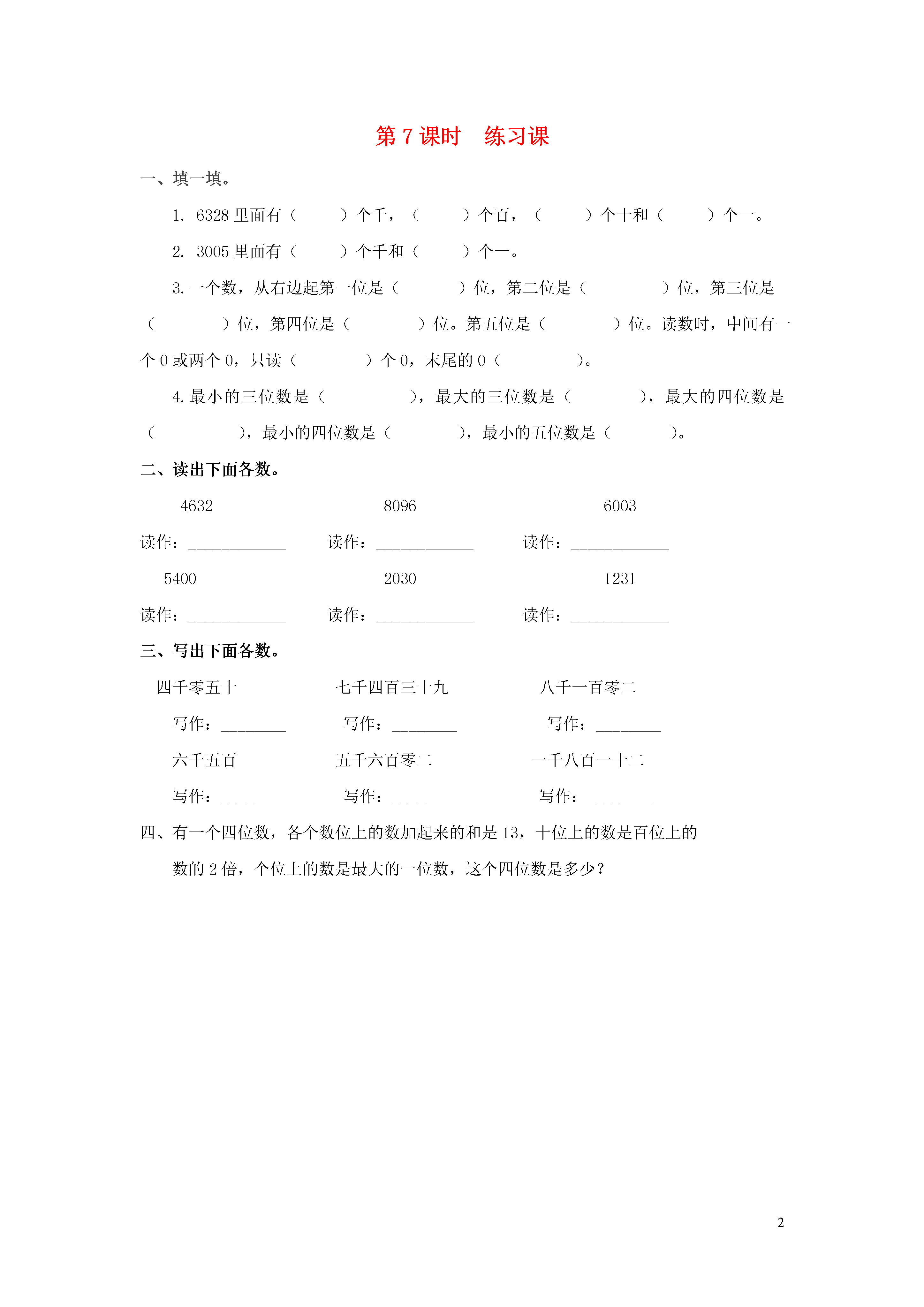 2第7课时练习课一、填一填。1.6328里面有()个千,()个百,()个十和()个一。2.3005里面有()个千和()个一。3.一个数,从右边起第一位是()位,第二位是()位,第三位是()位,第四位是()位。第五位是()位。读数时,中间有一个0或两个0,只读()个0,末尾的0()。4.最小的三位数是(),最大的三位数是(),最大的四位数是(),最小的四位数是(),最小的五位数是()。二、读出下面各数。463280966003读作:____________读作:____________读作:____________540020301231读作:____________读作:____________读作:____________三、写出下面各数。四千零五十七千四百三十九八千一百零二写作:________写作:________写作:________六千五百五千六百零二一千八百一十二写作:________写作:________写作:________四、有一个四位数,各个数位上的数加起来的和是13,十位上的数是百位上的数的2倍,个位上的数是最大的一位数,这个四位数是多少?
