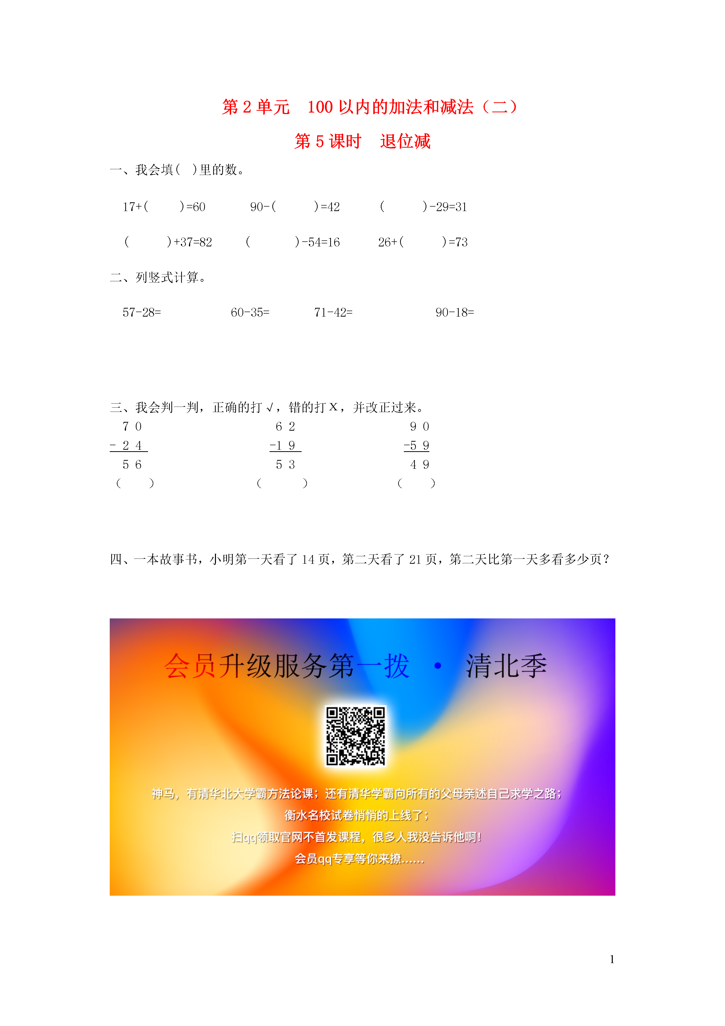 1第2单元100以内的加法和减法(二)第5课时退位减一、我会填()里的数。17+()=6090-()=42()-29=31()+37=82()-54=1626+()=73二、列竖式计算。57-28=60-35=71-42=90-18=三、我会判一判,正确的打√,错的打Х,并改正过来。706290-24-19-59565349()()()四、一本故事书,小明第一天看了14页,第二天看了21页,第二天比第一天多看多少页?
