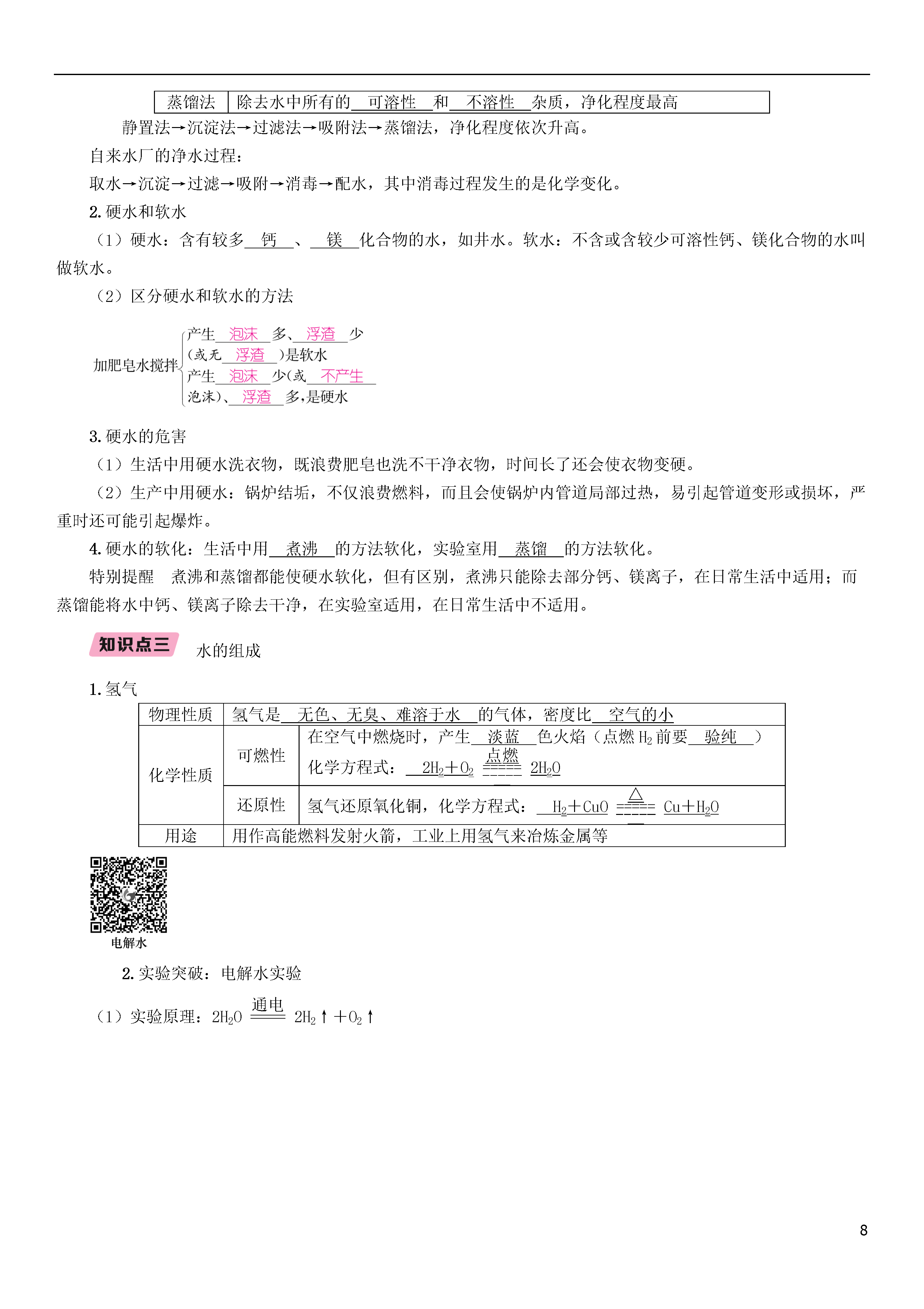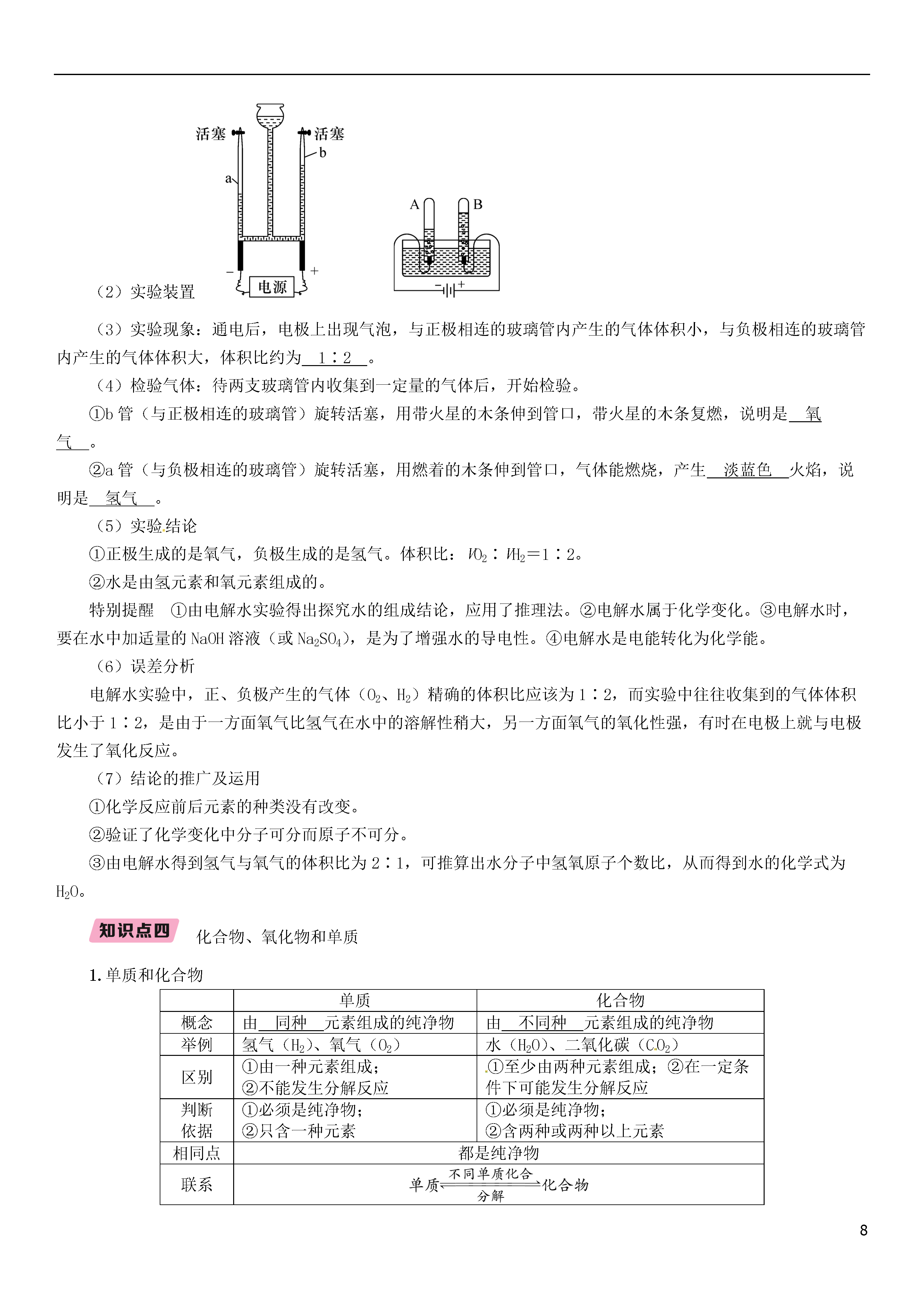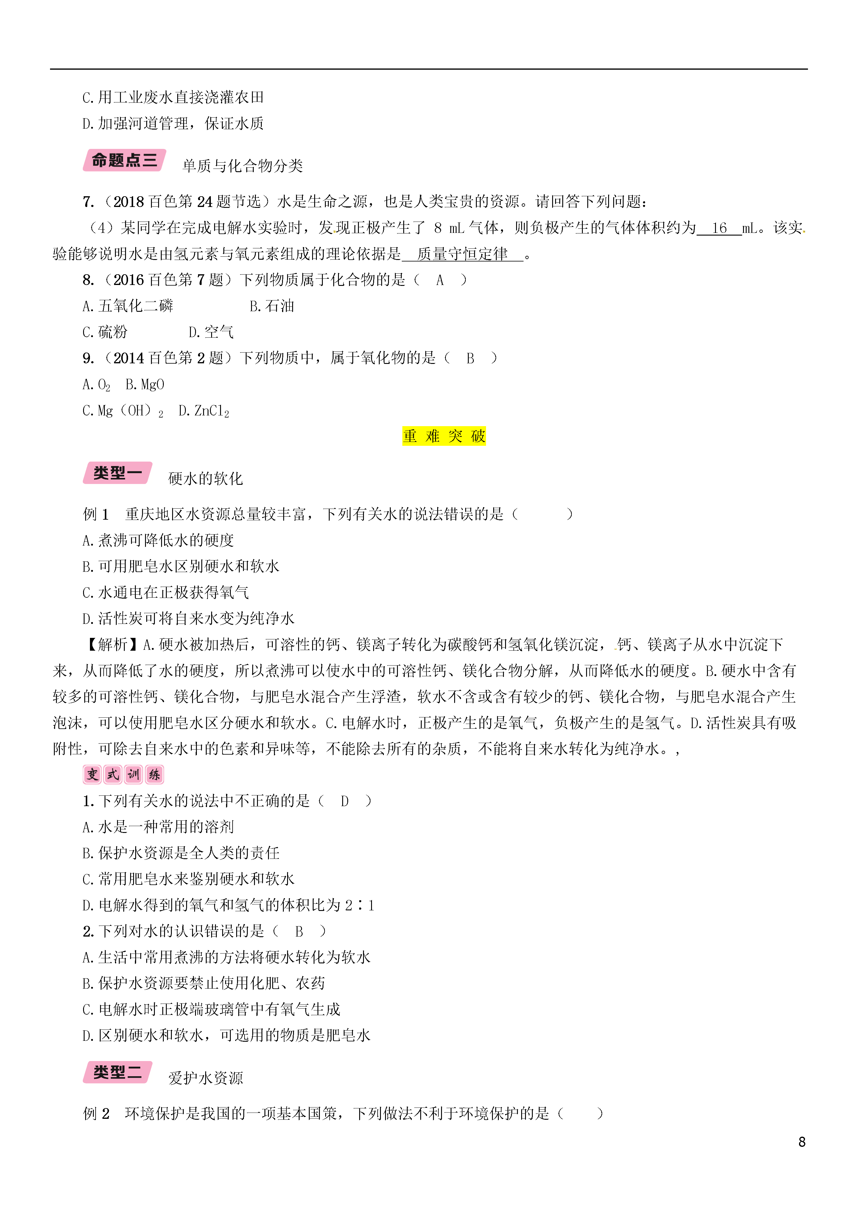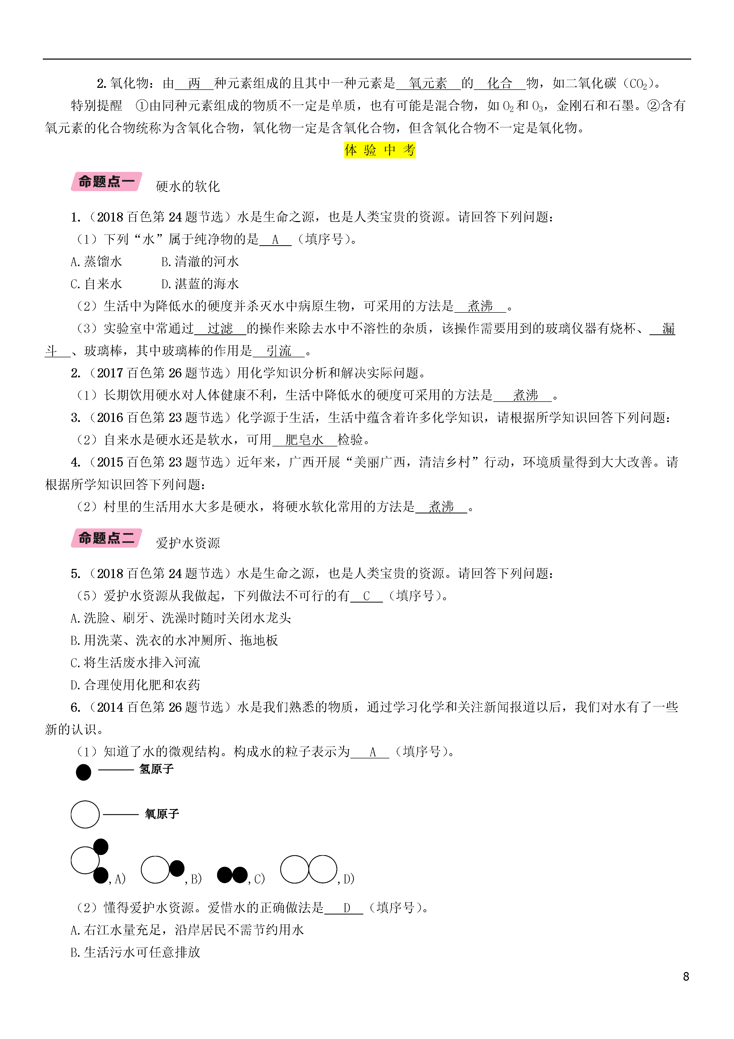 8第四单元自然界的水第1讲自然界的水百色五年中考命题规律近五年百色中考考情分析2019年中考预测年份考点题型题号分值本讲考查的重点是水的组成、水在自然界的分布、水的污染与防治,净化水的常用方法也是本讲的重点内容。有关本讲的内容多以联系现代科技成果、生活生产实际的选择题、填空题等题型出现,有关水资源的利用、保护、开发及分子的基本性质是简答题和探究题命题的热点,预计2019年百色中考会以填空题的形式考查水资源的利用或保护;以选择题的形式考查物质分类。2018硬水的软化、水的电解、爱护水资源填空题2482017硬水的软化简答题26(1)12016单质与化合物分类、硬水与软水选择、填空题7、13(2)32015硬水的软化填空题23(2)12014单质与化合物分类、水的组成及水资源选择、简答题2、26(1)(2)4知识清单爱护水资源1.人类拥有的水资源地球上的总水储量虽然很大,但淡水很少,还不到总水量的3%,大部分是含盐量很高的海水。2.爱护水资源爱护水资源,一方面要节约用水,另一方面要防治水体污染。(1)节水措施:用淘米水浇花、洗衣服水冲厕所、用水后及时关闭水龙头等。特别提醒国家节水标志(2)防治水体污染污染源:①工业污染;②农业污染;③生活污染。防治措施:工业废水处理符合标准后排放;农业上提倡使用农家肥,合理使用化肥和农药;生活污水逐步实现集中处理和排放。水的净化1.水的净化方法和作用方法作用静置法将浑浊的水,装入容器中静置不动,使水中大颗粒杂质自然沉降(生活中常用)明矾沉淀法明矾溶于水生成的胶状物对杂质的吸附,使杂质沉降(发生的是化学变化)过滤法除去水中所有的不溶性杂质(发生的是物理变化)吸附法加入活性炭除去水中的色素和异味(发生的是物理变化)蒸馏法除去水中所有的可溶性和不溶性杂质,净化程度最高静置法→沉淀法→过滤法→吸附法→蒸馏法,净化程度依次升高。自来水厂的净水过程:取水→沉淀→过滤→吸附→消毒→配水,其中消毒过程发生的是化学变化。2.硬水和软水(1)硬水:含有较多钙、镁化合物的水,如井水。软水:不含或含较少可溶性钙、镁化合物的水叫做软水。(2)区分硬水和软水的方法3.硬水的危害(1)生活中用硬水洗衣物,既浪费肥皂也洗不干净衣物,时间长了还会使衣物变硬。(2)生产中用硬水:锅炉结垢,不仅浪费燃料,而且会使锅炉内管道局部过热,易引起管道变形或损坏,严重时还可能引起爆炸。4.硬水的软化:生活中用煮沸的方法软化,实验室用蒸馏的方法软化。特别提醒煮沸和蒸馏都能使硬水软化,但有区别,煮沸只能除去部分钙、镁离子,在日常生活中适用;而蒸馏能将水中钙、镁离子除去干净,在实验室适用,在日常生活中不适用。水的组成1.氢气物理性质氢气是无色、无臭、难溶于水的气体,密度比空气的小化学性质可燃性在空气中燃烧时,产生淡蓝色火焰(点燃H2前要验纯)化学方程式:2H2+O2eq\o(=====,\s\up7(点燃))2H2O还原性氢气还原氧化铜,化学方程式:H2+CuOeq\o(=====,\s\up7(△))Cu+H2O用途用作高能燃料发射火箭,工业上用氢气来冶炼金属等2.实验突破:电解水实验(1)实验原理:2H2Oeq\o(=====,\s\up7(通电))2H2↑+O2↑(2)实验装置(3)实验现象:通电后,电极上出现气泡,与正极相连的玻璃管内产生的气体体积小,与负极相连的玻璃管内产生的气体体积大,体积比约为1∶2。(4)检验气体:待两支玻璃管内收集到一定量的气体后,开始检验。①b管(与正极相连的玻璃管)旋转活塞,用带火星的木条伸到管口,带火星的木条复燃,说明是氧气。②a管(与负极相连的玻璃管)旋转活塞,用燃着的木条伸到管口,气体能燃烧,产生淡蓝色火焰,说明是氢气。(5)实验结论①正极生成的是氧气,负极生成的是氢气。体积比:VO2∶VH2=1∶2。②水是由氢元素和氧元素组成的。特别提醒①由电解水实验得出探究水的组成结论,应用了推理法。②电解水属于化学变化。③电解水时,要在水中加适量的NaOH溶液(或Na2SO4),是为了增强水的导电性。④电解水是电能转化为化学能。(6)误差分析电解水实验中,正、负极产生的气体(O2、H2)精确的体积比应该为1∶2,而实验中往往收集到的气体体积比小于1∶2,是由于一方面氧气比氢气在水中的溶解性稍大,另一方面氧气的氧化性强,有时在电极上就与电极发生了氧化反应。(7)结论的推广及运用①化学反应前后元素的种类没有改变。②验证了化学变化中分子可分而原子不可分。③由电解水得到氢气与氧气的体积比为2∶1,可推算出水分子中氢氧原子个数比,从而得到水的化学式为H2O。化合物、氧化物和单质1.单质和