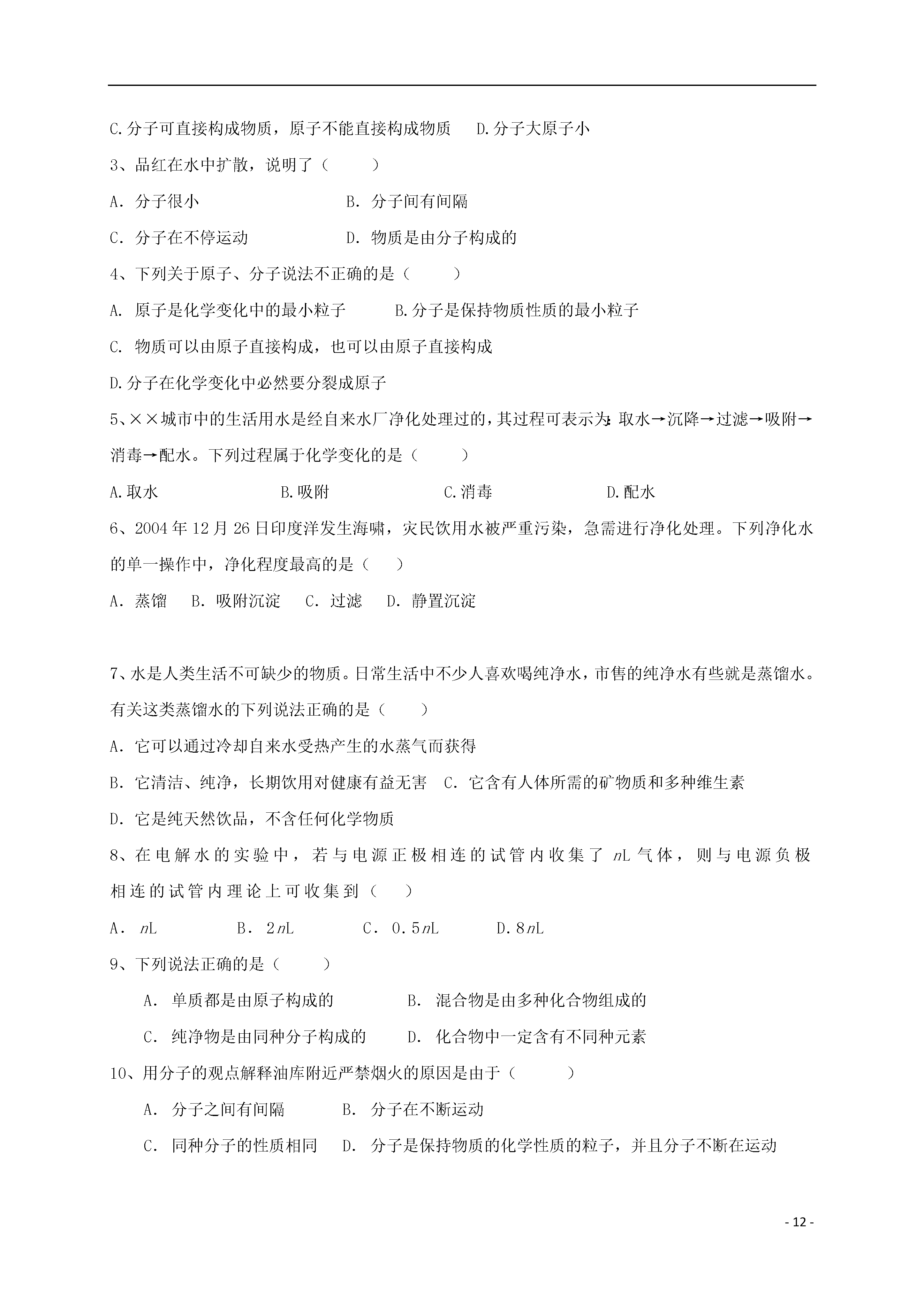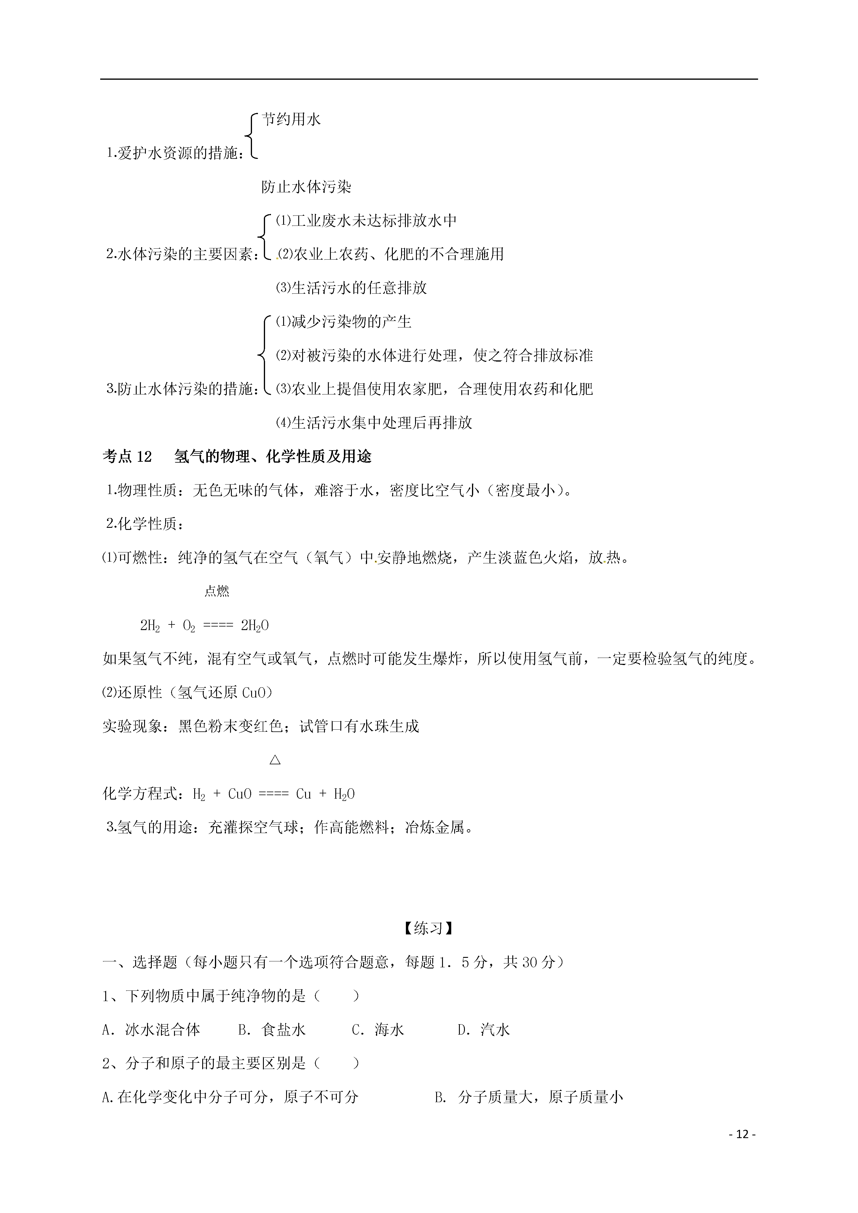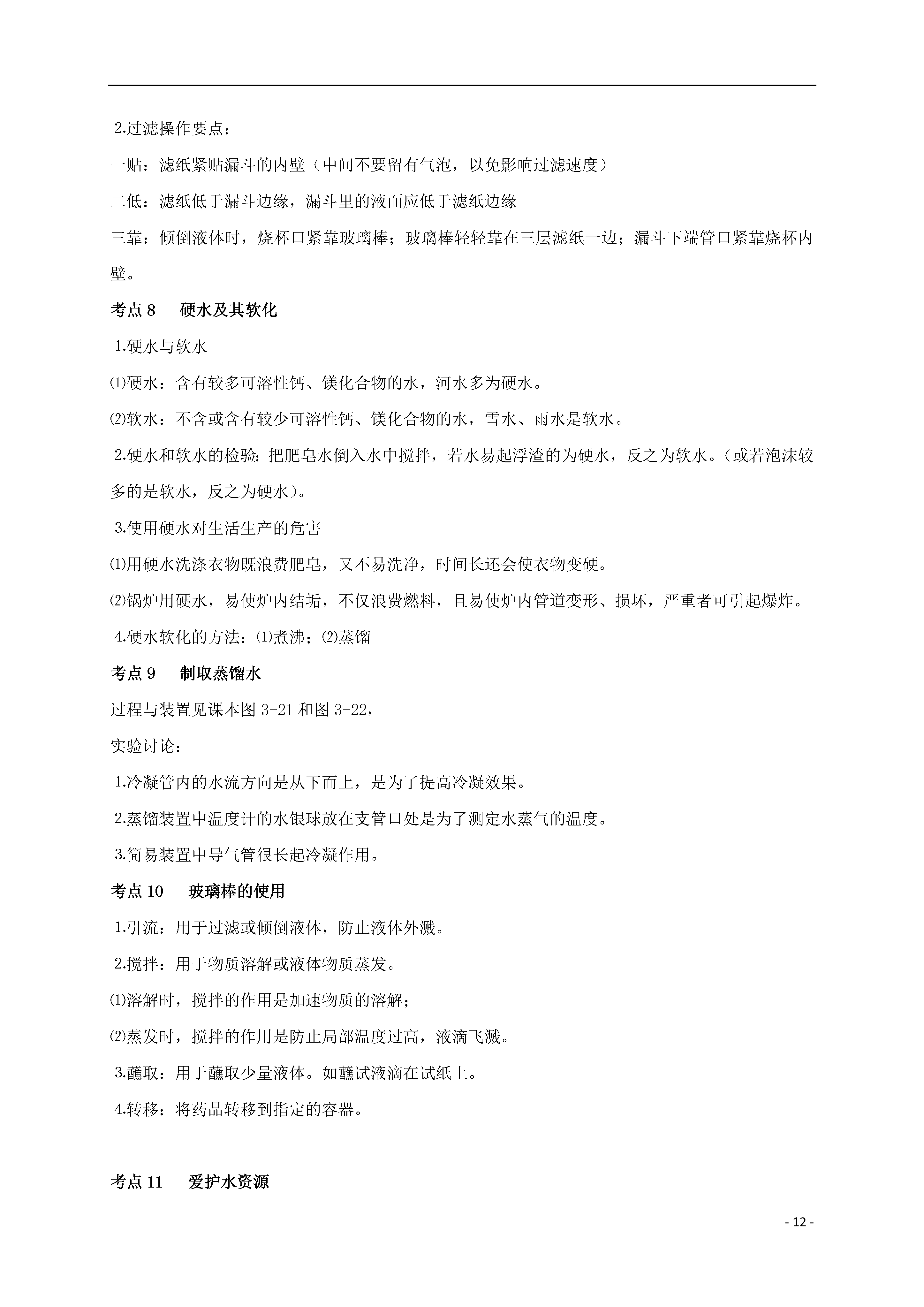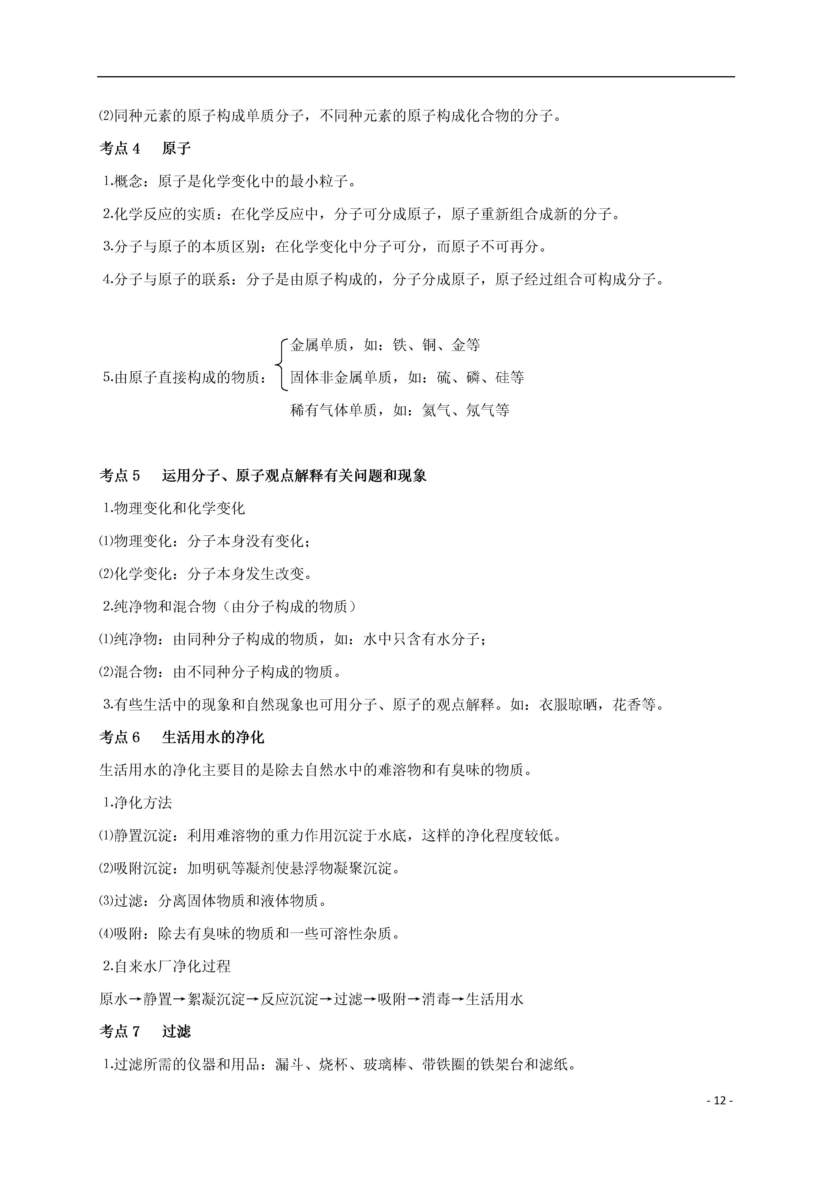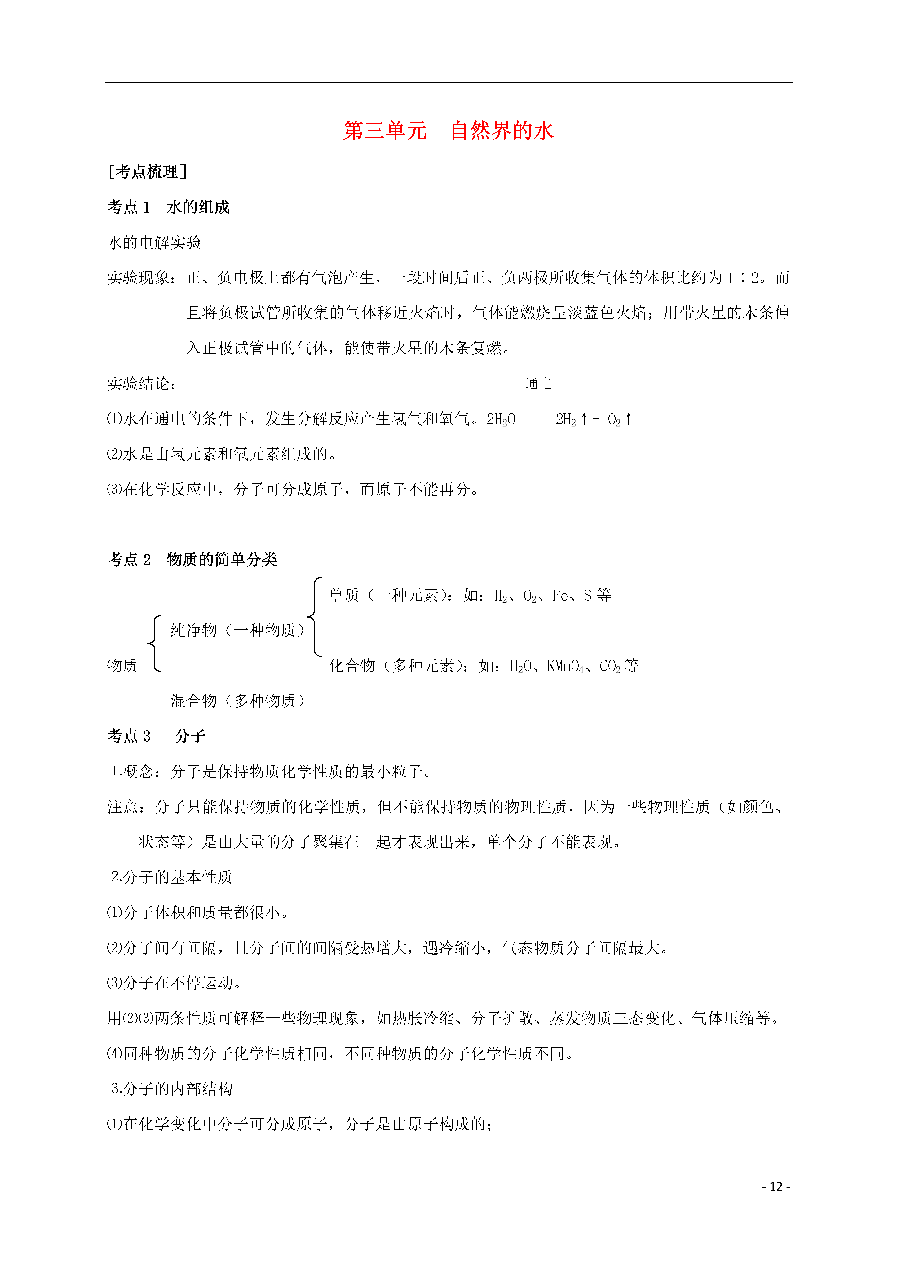 -12-第三单元自然界的水[考点梳理]考点1水的组成水的电解实验实验现象:正、负电极上都有气泡产生,一段时间后正、负两极所收集气体的体积比约为1∶2。而且将负极试管所收集的气体移近火焰时,气体能燃烧呈淡蓝色火焰;用带火星的木条伸入正极试管中的气体,能使带火星的木条复燃。通电实验结论:⑴水在通电的条件下,发生分解反应产生氢气和氧气。2H2O====2H2↑+O2↑⑵水是由氢元素和氧元素组成的。⑶在化学反应中,分子可分成原子,而原子不能再分。考点2物质的简单分类单质(一种元素):如:H2、O2、Fe、S等纯净物(一种物质)物质化合物(多种元素):如:H2O、KMnO4、CO2等混合物(多种物质)考点3分子⒈概念:分子是保持物质化学性质的最小粒子。注意:分子只能保持物质的化学性质,但不能保持物质的物理性质,因为一些物理性质(如颜色、状态等)是由大量的分子聚集在一起才表现出来,单个分子不能表现。⒉分子的基本性质⑴分子体积和质量都很小。⑵分子间有间隔,且分子间的间隔受热增大,遇冷缩小,气态物质分子间隔最大。⑶分子在不停运动。用⑵⑶两条性质可解释一些物理现象,如热胀冷缩、分子扩散、蒸发物质三态变化、气体压缩等。⑷同种物质的分子化学性质相同,不同种物质的分子化学性质不同。⒊分子的内部结构⑴在化学变化中分子可分成原子,分子是由原子构成的;⑵同种元素的原子构成单质分子,不同种元素的原子构成化合物的分子。考点4原子⒈概念:原子是化学变化中的最小粒子。⒉化学反应的实质:在化学反应中,分子可分成原子,原子重新组合成新的分子。⒊分子与原子的本质区别:在化学变化中分子可分,而原子不可再分。⒋分子与原子的联系:分子是由原子构成的,分子分成原子,原子经过组合可构成分子。金属单质,如:铁、铜、金等⒌由原子直接构成的物质:固体非金属单质,如:硫、磷、硅等稀有气体单质,如:氦气、氖气等考点5运用分子、原子观点解释有关问题和现象⒈物理变化和化学变化⑴物理变化:分子本身没有变化;⑵化学变化:分子本身发生改变。⒉纯净物和混合物(由分子构成的物质)⑴纯净物:由同种分子构成的物质,如:水中只含有水分子;⑵混合物:由不同种分子构成的物质。⒊有些生活中的现象和自然现象也可用分子、原子的观点解释。如:衣服晾晒,花香等。考点6生活用水的净化生活用水的净化主要目的是除去自然水中的难溶物和有臭味的物质。⒈净化方法⑴静置沉淀:利用难溶物的重力作用沉淀于水底,这样的净化程度较低。⑵吸附沉淀:加明矾等凝剂使悬浮物凝聚沉淀。⑶过滤:分离固体物质和液体物质。⑷吸附:除去有臭味的物质和一些可溶性杂质。⒉自来水厂净化过程原水→静置→絮凝沉淀→反应沉淀→过滤→吸附→消毒→生活用水考点7过滤⒈过滤所需的仪器和用品:漏斗、烧杯、玻璃棒、带铁圈的铁架台和滤纸。⒉过滤操作要点:一贴:滤纸紧贴漏斗的内壁(中间不要留有气泡,以免影响过滤速度)二低:滤纸低于漏斗边缘,漏斗里的液面应低于滤纸边缘三靠:倾倒液体时,烧杯口紧靠玻璃棒;玻璃棒轻轻靠在三层滤纸一边;漏斗下端管口紧靠烧杯内壁。考点8硬水及其软化⒈硬水与软水⑴硬水:含有较多可溶性钙、镁化合物的水,河水多为硬水。⑵软水:不含或含有较少可溶性钙、镁化合物的水,雪水、雨水是软水。⒉硬水和软水的检验:把肥皂水倒入水中搅拌,若水易起浮渣的为硬水,反之为软水。(或若泡沫较多的是软水,反之为硬水)。⒊使用硬水对生活生产的危害⑴用硬水洗涤衣物既浪费肥皂,又不易洗净,时间长还会使衣物变硬。⑵锅炉用硬水,易使炉内结垢,不仅浪费燃料,且易使炉内管道变形、损坏,严重者可引起爆炸。⒋硬水软化的方法:⑴煮沸;⑵蒸馏考点9制取蒸馏水过程与装置见课本图3-21和图3-22,实验讨论:⒈冷凝管内的水流方向是从下而上,是为了提高冷凝效果。⒉蒸馏装置中温度计的水银球放在支管口处是为了测定水蒸气的温度。⒊简易装置中导气管很长起冷凝作用。考点10玻璃棒的使用⒈引流:用于过滤或倾倒液体,防止液体外溅。⒉搅拌:用于物质溶解或液体物质蒸发。⑴溶解时,搅拌的作用是加速物质的溶解;⑵蒸发时,搅拌的作用是防止局部温度过高,液滴飞溅。⒊蘸取:用于蘸取少量液体。如蘸试液滴在试纸上。⒋转移:将药品转移到指定的容器。考点11爱护水资源节约用水⒈爱护水资源的措施:防止水体污染⑴工业废水未达标排放水中⒉水体污染的主要因素:⑵农业上农药、化肥的不合理施用⑶生活污水的任意排放⑴减少污染物的产生⑵对被污染的水体进行处理,使之符合排放标准⒊防止水体污染的措施:⑶农业上提倡使用农家肥,合理使用农药和化肥⑷生活污水集中处理后再排放考点1