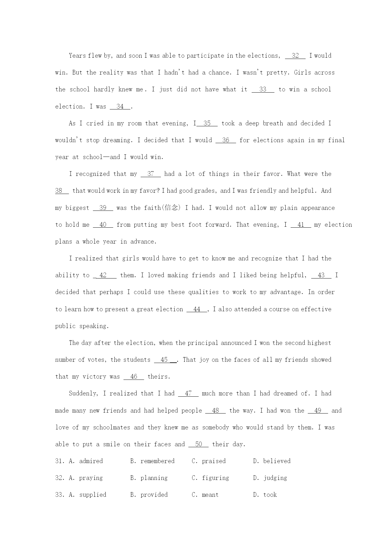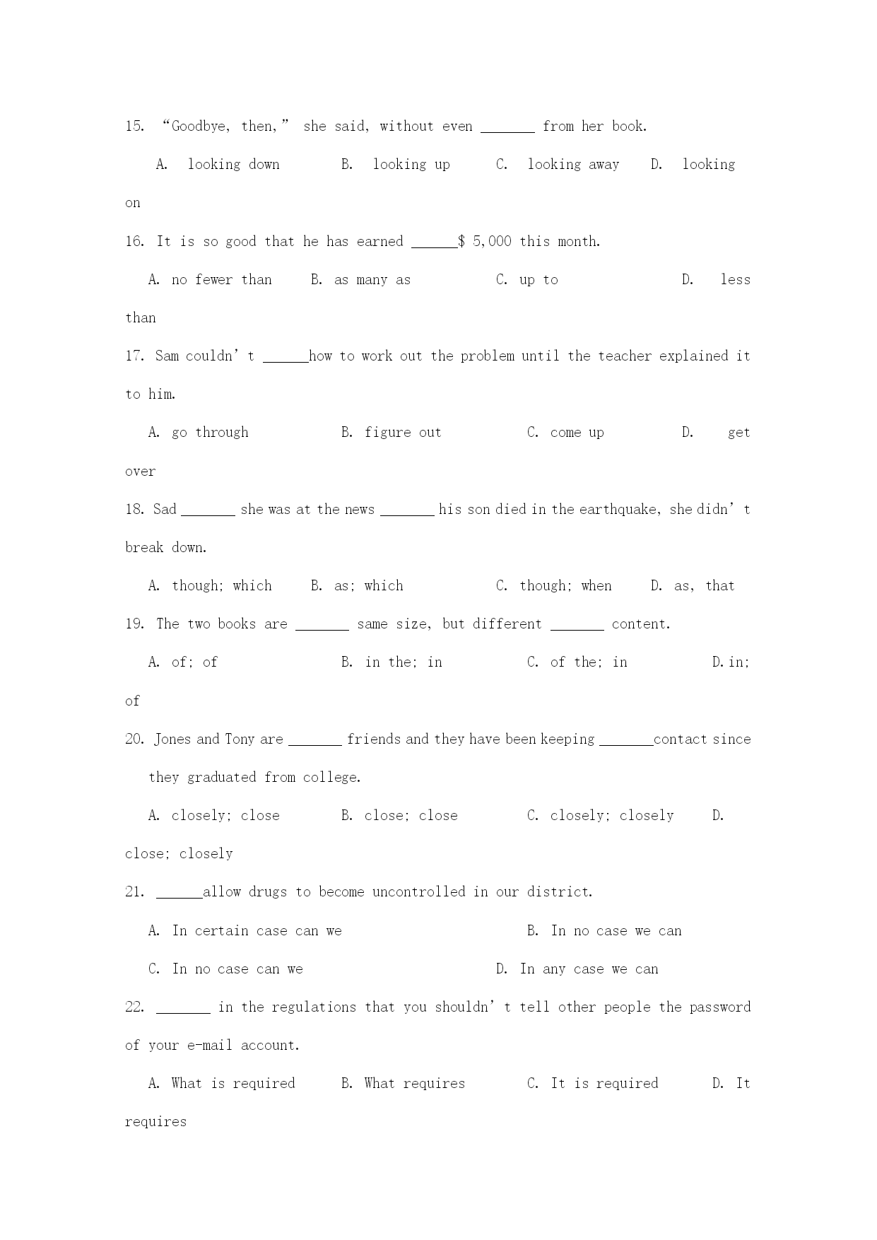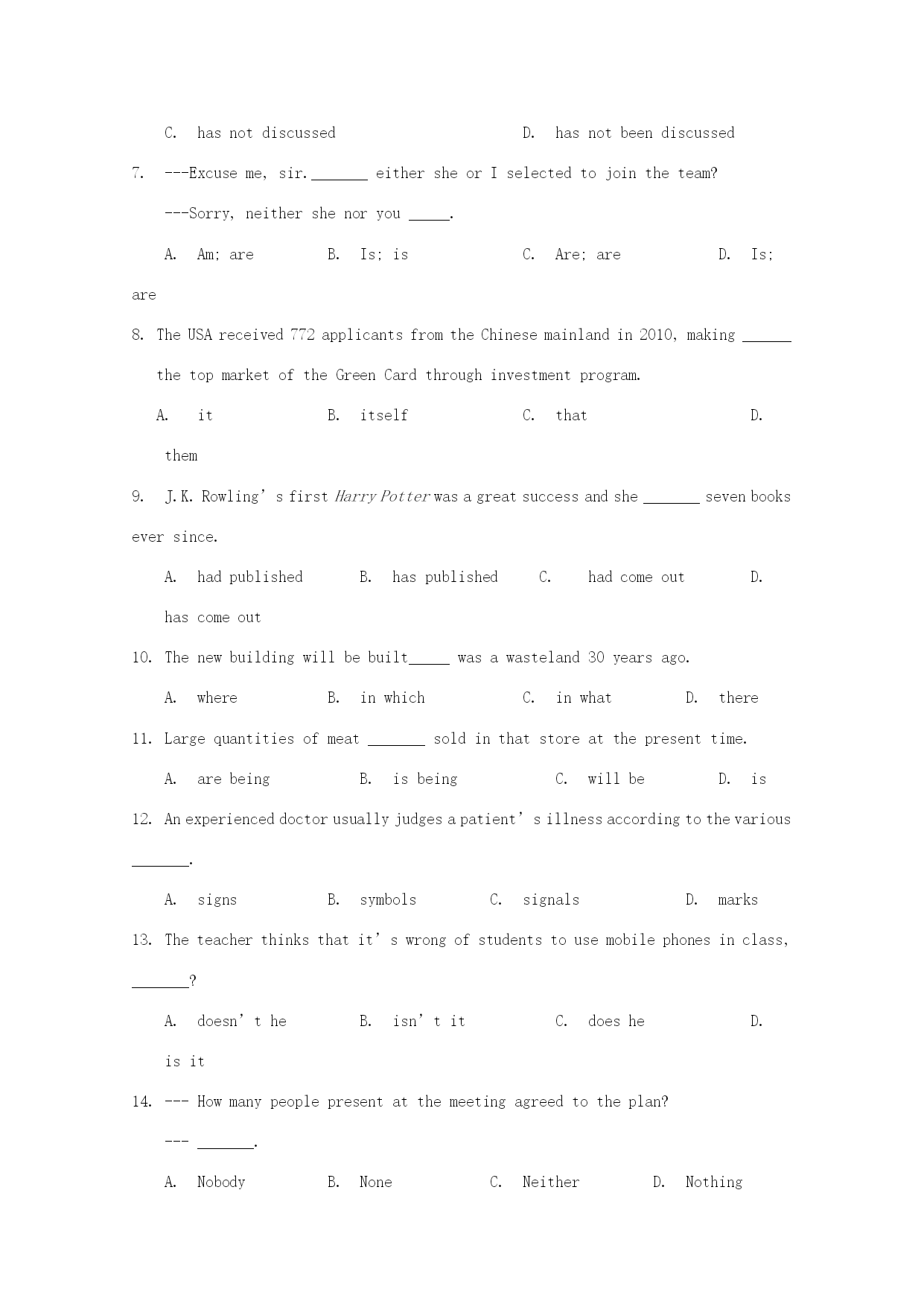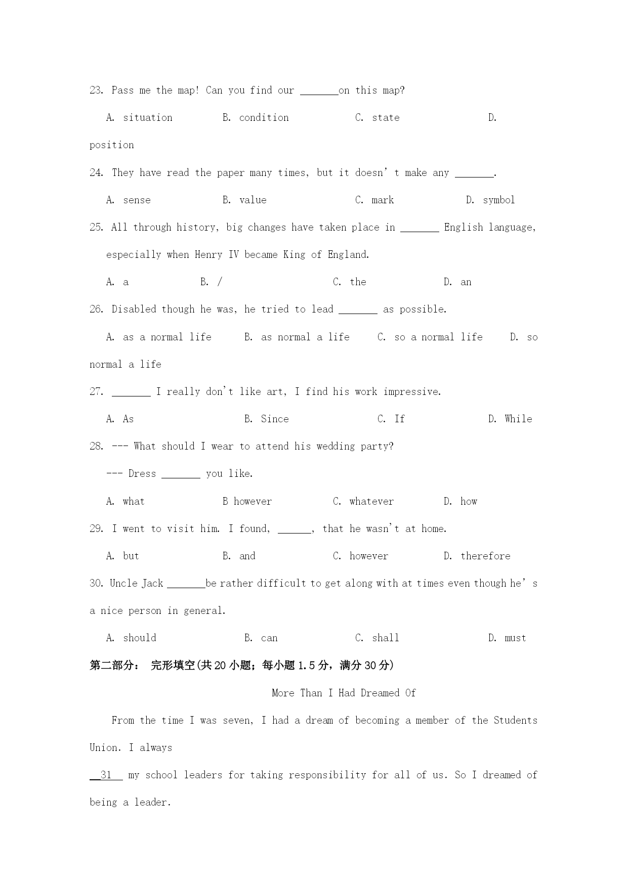 哈师大附中2011—2012学年度下学期4月月考 高一英语试题 (满分150分时间90分钟) 第一卷(共三部分) 第一部分:单项填空(共30小题;每题1分,满分30分) 从A、B、C、D四个选项中,选出可以填入空白处的最佳选项。并在答题卡上将该项涂黑。 1. HesuddenlysawSue_______theroom.Hepushedhisway_______thecrowdofpeopletogettoher. A. across;across B. over;through C. over;into D. across;through 2. Iwouldlikeajobwhichpaysmore,but_______IenjoytheworkI’mdoingatthemoment. A. inotherwords B. ontheotherhand C. foronething D. asamatteroffact 3. ---Didyougototheshowlastnight? ---Yeah.Everyboyandgirlinthearea_______invited. A. were B. havebeen C. hasbeen D. was 4. Itisthehotel_____locatedinthedowntown_______heappliedtoforajob. A. /;that B.which;that C. that;where D.that;that 5. Anoldfriendofminecalledmeupthismorning,butherefusedtotellmehispresent_______. A. home B. place C. where D. whereabouts 6. Wheretogetthematerialsandhowtogetthem________atthemeeting. A. havenotdiscussed B. havenotbeendiscussed C. hasnotdiscussed D. hasnotbeendiscussed 7. ---Excuseme,sir._______eithersheorIselectedtojointheteam? ---Sorry,neithershenoryou_____. A. Am;are B. Is;is C. Are;are D. Is;are 8. TheUSAreceived772applicantsfromtheChinesemainlandin2010,making______thetopmarketoftheGreenCardthroughinvestmentprogram. A. it B. itself C. that D. them 9. J.K.Rowling’sfirstHarryPotterwasagreatsuccessandshe_______sevenbookseversince. A. hadpublished B. haspublishedC. hadcomeout D. hascomeout 10. Thenewbuildingwillbebuilt_____wasawasteland30yearsago. A. where B. inwhich C. inwhat D. there 11. Largequantitiesofmeat_______soldinthatstoreatthepresenttime. A. arebeing B. isbeing C. willbe D. is 12. Anexperienceddoctorusuallyjudgesapatient’sillnessaccordingtothevarious_______. A. signs B. symbols C. signals D. marks 13. Theteacherthinksthatit’swrongofstudentstousemobilephonesinclass,_______? A. doesn’the B. isn’tit C. doeshe D. isit 14. ---Howmanypeoplepresentatthemeetingagreedtotheplan? ---_______. A. Nobody B. None C. Neither D. Nothing 15. “G