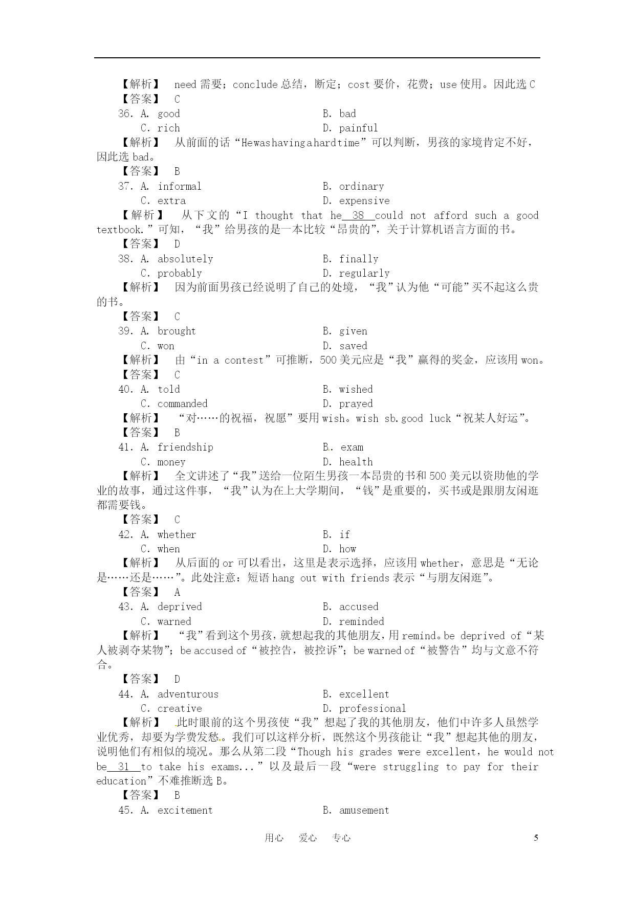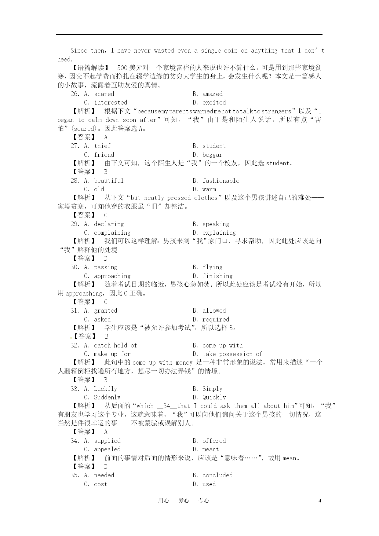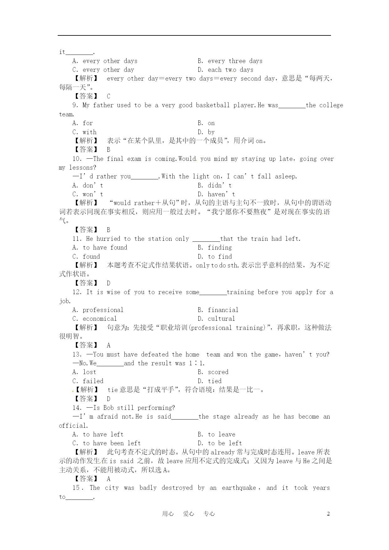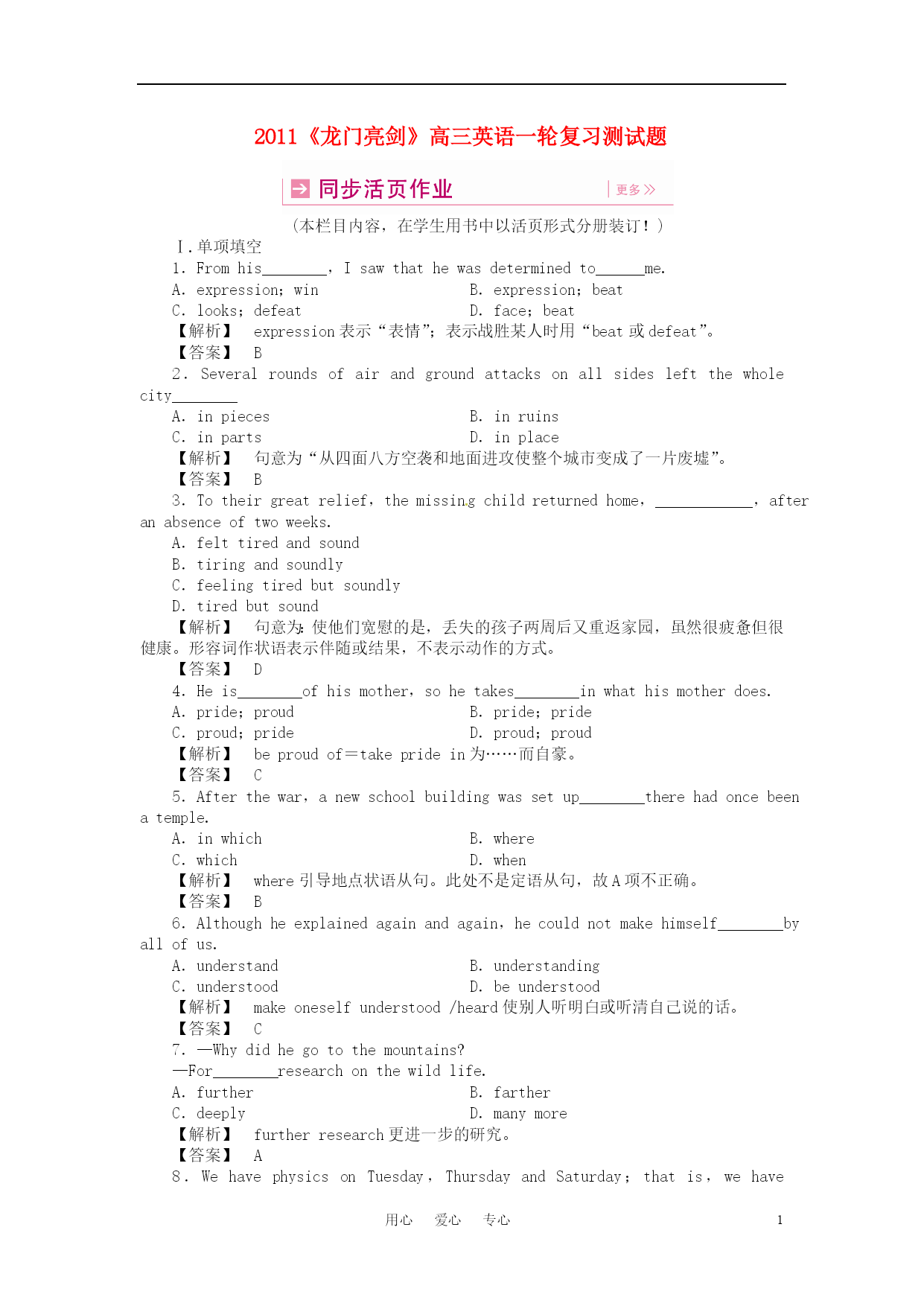 用心爱心专心 2011《龙门亮剑》高三英语一轮复习测试题 (本栏目内容,在学生用书中以活页形式分册装订!) Ⅰ.单项填空 1.Fromhis________,Isawthathewasdeterminedto______me. A.expression;win B.expression;beat C.looks;defeat D.face;beat 【解析】expression表示“表情”;表示战胜某人时用“beat或defeat”。 【答案】B 2.Severalroundsofairandgroundattacksonallsidesleftthewholecity________ A.inpieces B.inruins C.inparts D.inplace 【解析】句意为“从四面八方空袭和地面进攻使整个城市变成了一片废墟”。 【答案】B 3.Totheirgreatrelief,themissingchildreturnedhome,____________,afteranabsenceoftwoweeks. A.felttiredandsound B.tiringandsoundly C.feelingtiredbutsoundly D.tiredbutsound 【解析】句意为:使他们宽慰的是,丢失的孩子两周后又重返家园,虽然很疲惫但很健康。形容词作状语表示伴随或结果,不表示动作的方式。 【答案】D 4.Heis________ofhismother,sohetakes________inwhathismotherdoes. A.pride;proud B.pride;pride C.proud;pride D.proud;proud 【解析】beproudof=takepridein为……而自豪。 【答案】C 5.Afterthewar,anewschoolbuildingwassetup________therehadoncebeenatemple. A.inwhich B.where C.which D.when 【解析】where引导地点状语从句。此处不是定语从句,故A项不正确。 【答案】B 6.Althoughheexplainedagainandagain,hecouldnotmakehimself________byallofus. A.understand B.understanding C.understood D.beunderstood 【解析】makeoneselfunderstood/heard使别人听明白或听清自己说的话。 【答案】C 7.—Whydidhegotothemountains? —For________researchonthewildlife. A.further B.farther C.deeply D.manymore 【解析】furtherresearch更进一步的研究。 【答案】A 8.WehavephysicsonTuesday,ThursdayandSaturday;thatis,wehaveit________. A.everyotherdays B.everythreedays C.everyotherday D.eachtwodays 【解析】everyotherday=everytwodays=everysecondday,意思是“每两天,每隔一天”。 【答案】C 9.Myfatherusedtobeaverygoodbasketballplayer.Hewas________thecollegeteam. A.for B.on C.with D.by 【解析】表示“在某个队里,是其中的一个成员”,用介词on。 【答案】B 10.—Thefinalexamiscoming.Wouldyoumindmystayinguplate,goingovermylessons? —I’dratheryou________.Withthelighton,Ican’tfallasleep. A.don’t B.didn’t C.won’t D.haven’t 【解析】“wouldrather+从句”时,从句的主语与主句不一致时,从句中的谓语动词若表示同现在事实相反,则应用一般过去时。“我宁愿你不要熬夜”是对现在事实的语气。 【答案】B 11.Hehurriedtothestationonly________thatthetrainhadleft. A.tohavefound B.finding C.found D.tofind 【解析】本题考查不定式作结果状语。onlytodosth.表示出乎意料的结果,为不定式作状语。 【答案】D 12.Itisw