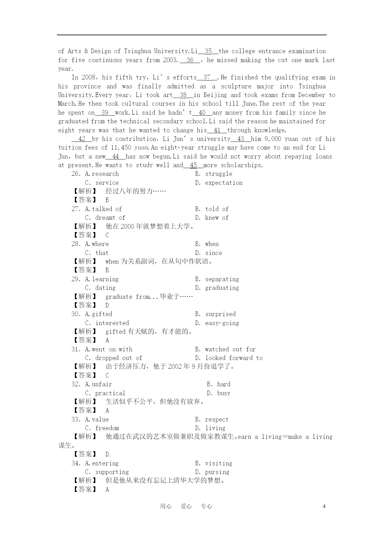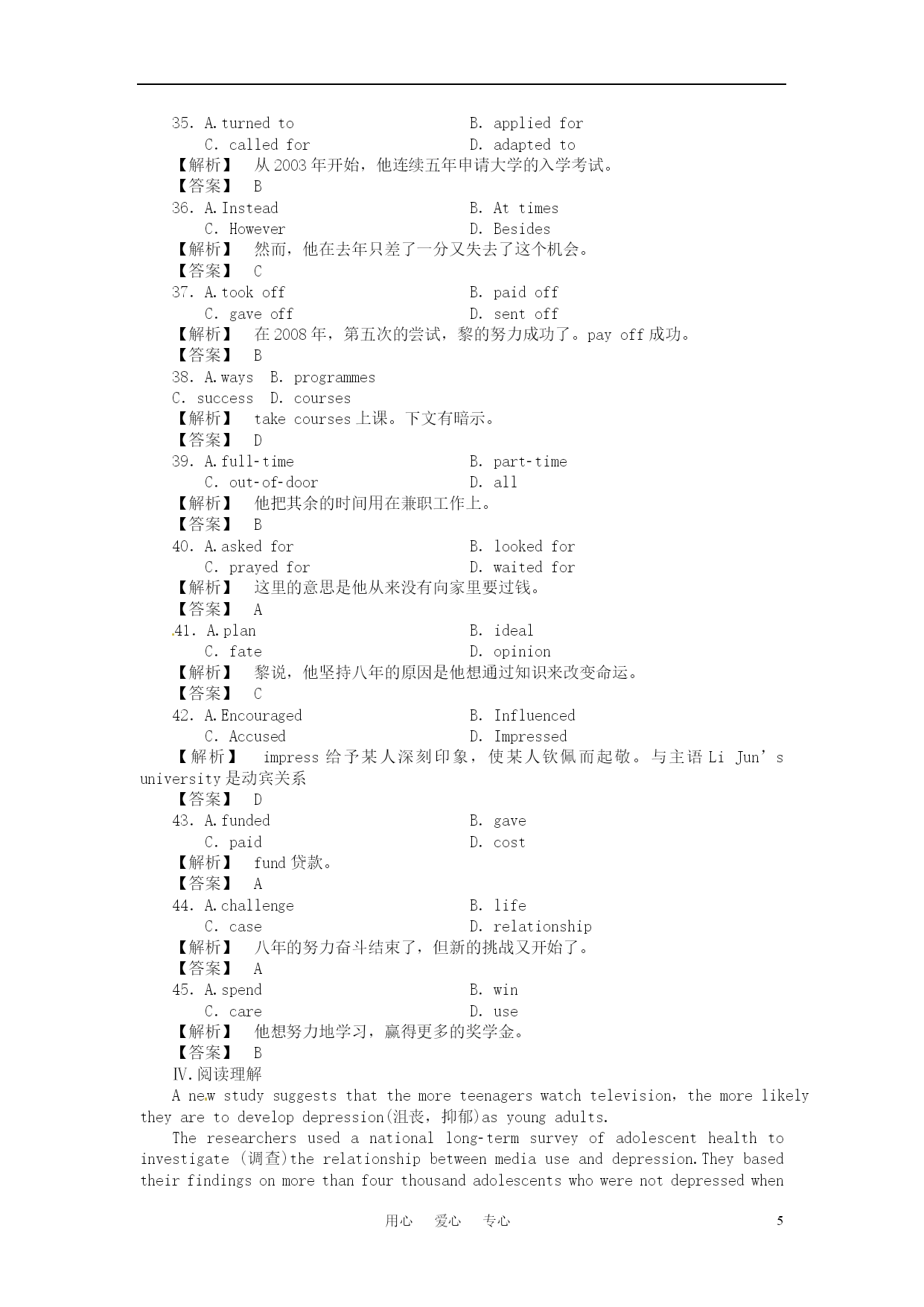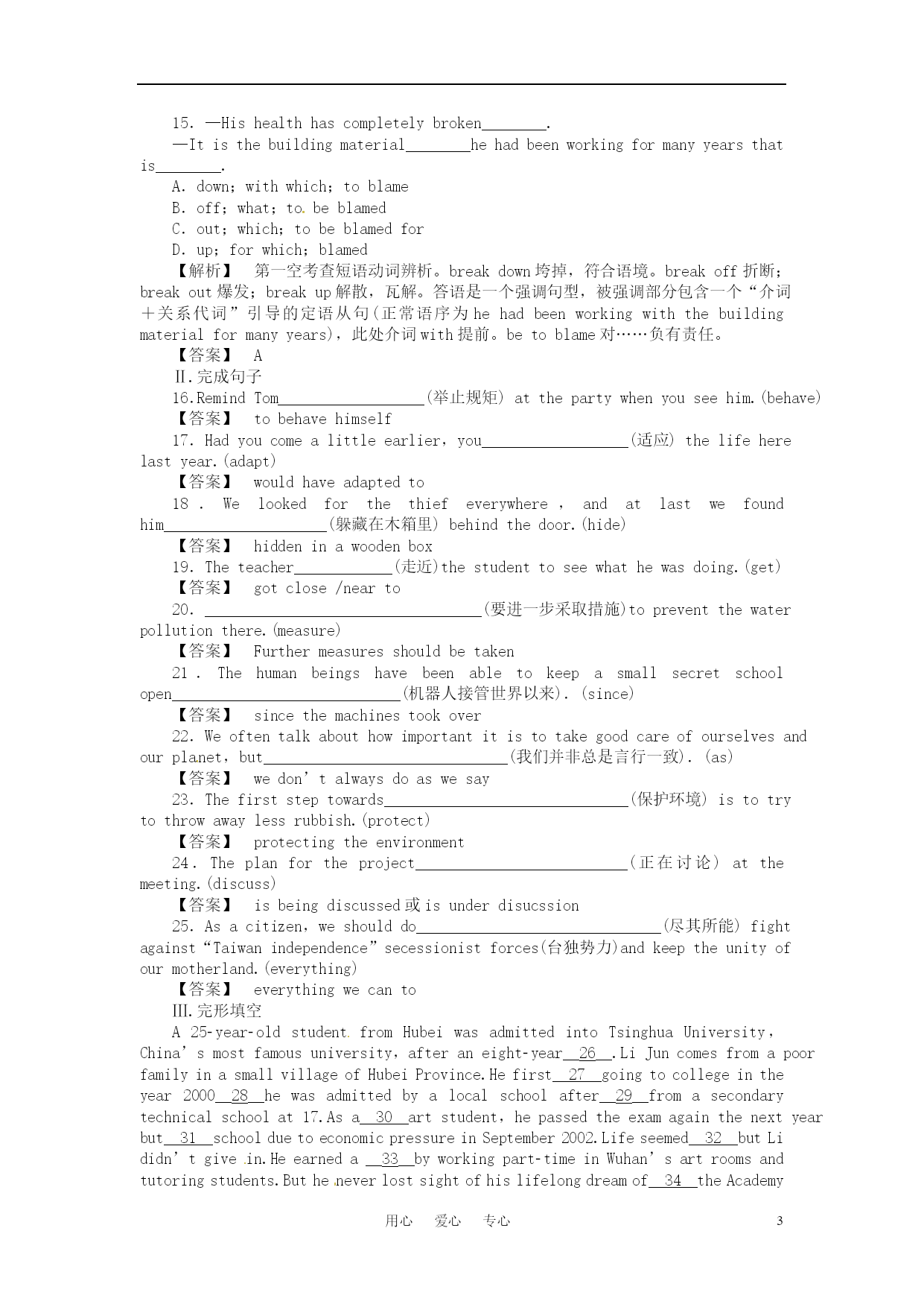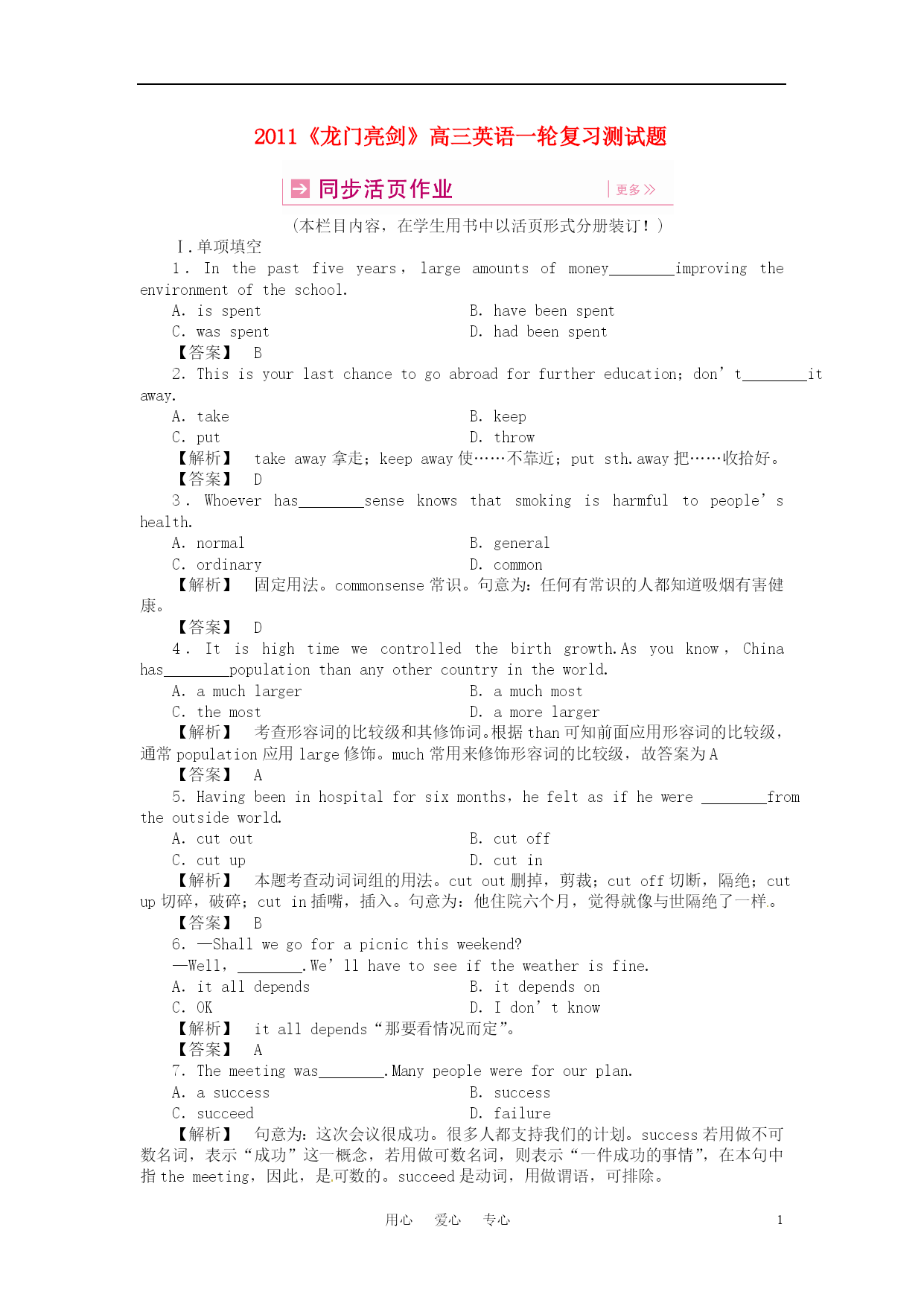 用心爱心专心 2011《龙门亮剑》高三英语一轮复习测试题 (本栏目内容,在学生用书中以活页形式分册装订!) Ⅰ.单项填空 1.Inthepastfiveyears,largeamountsofmoney________improvingtheenvironmentoftheschool. A.isspent B.havebeenspent C.wasspent D.hadbeenspent 【答案】B 2.Thisisyourlastchancetogoabroadforfurthereducation;don’t________itaway. A.take B.keep C.put D.throw 【解析】takeaway拿走;keepaway使……不靠近;putsth.away把……收拾好。 【答案】D 3.Whoeverhas________senseknowsthatsmokingisharmfultopeople’shealth. A.normal B.general C.ordinary D.common 【解析】固定用法。commonsense常识。句意为:任何有常识的人都知道吸烟有害健康。 【答案】D 4.Itishightimewecontrolledthebirthgrowth.Asyouknow,Chinahas________populationthananyothercountryintheworld. A.amuchlarger B.amuchmost C.themost D.amorelarger 【解析】考查形容词的比较级和其修饰词。根据than可知前面应用形容词的比较级,通常population应用large修饰。much常用来修饰形容词的比较级,故答案为A 【答案】A 5.Havingbeeninhospitalforsixmonths,hefeltasifhewere________fromtheoutsideworld. A.cutout B.cutoff C.cutup D.cutin 【解析】本题考查动词词组的用法。cutout删掉,剪裁;cutoff切断,隔绝;cutup切碎,破碎;cutin插嘴,插入。句意为:他住院六个月,觉得就像与世隔绝了一样。 【答案】B 6.—Shallwegoforapicnicthisweekend? —Well,________.We’llhavetoseeiftheweatherisfine. A.italldepends B.itdependson C.OK D.Idon’tknow 【解析】italldepends“那要看情况而定”。 【答案】A 7.Themeetingwas________.Manypeoplewereforourplan. A.asuccess B.success C.succeed D.failure 【解析】句意为:这次会议很成功。很多人都支持我们的计划。success若用做不可数名词,表示“成功”这一概念,若用做可数名词,则表示“一件成功的事情”,在本句中指themeeting,因此,是可数的。succeed是动词,用做谓语,可排除。 【答案】A 8.—I’vepassedthephysicstest. —________you’vebeenworkingsohardthesedays. A.Noproblem B.Nowonder C.Noquestion D.Nodoubt 【解析】句意为:“我已通过物理考试了。”“难怪你这些天学习那么努力。”noproblem没问题;nowonder难怪;nodoubt毫无疑问。 【答案】B 9.It’swrongtogive________thechildrenaskfor,whichwillnotmakethemrealizethehardshipoflife. A.what B.whichever C.nomatter D.whatever 【解析】考查宾语从句。A、C两项不能引导宾语从句,可以排除。whatever相当于anythingthat,而whichever不具有此功能。 【答案】D 10.—________itrainstomorrow? —We’llhavetostayhomedoingsomethingelse. A.Whatif B.Whatabout C.Howabout D.Whatfor 【解析】Whatif意为“如果……怎么样”? 【答案】A 11.—I’mafraidMrWoodcan’tseeyouuntil4o’clock. —Oh,________Iwon’twait. A.nodoubt B.afterall C.int