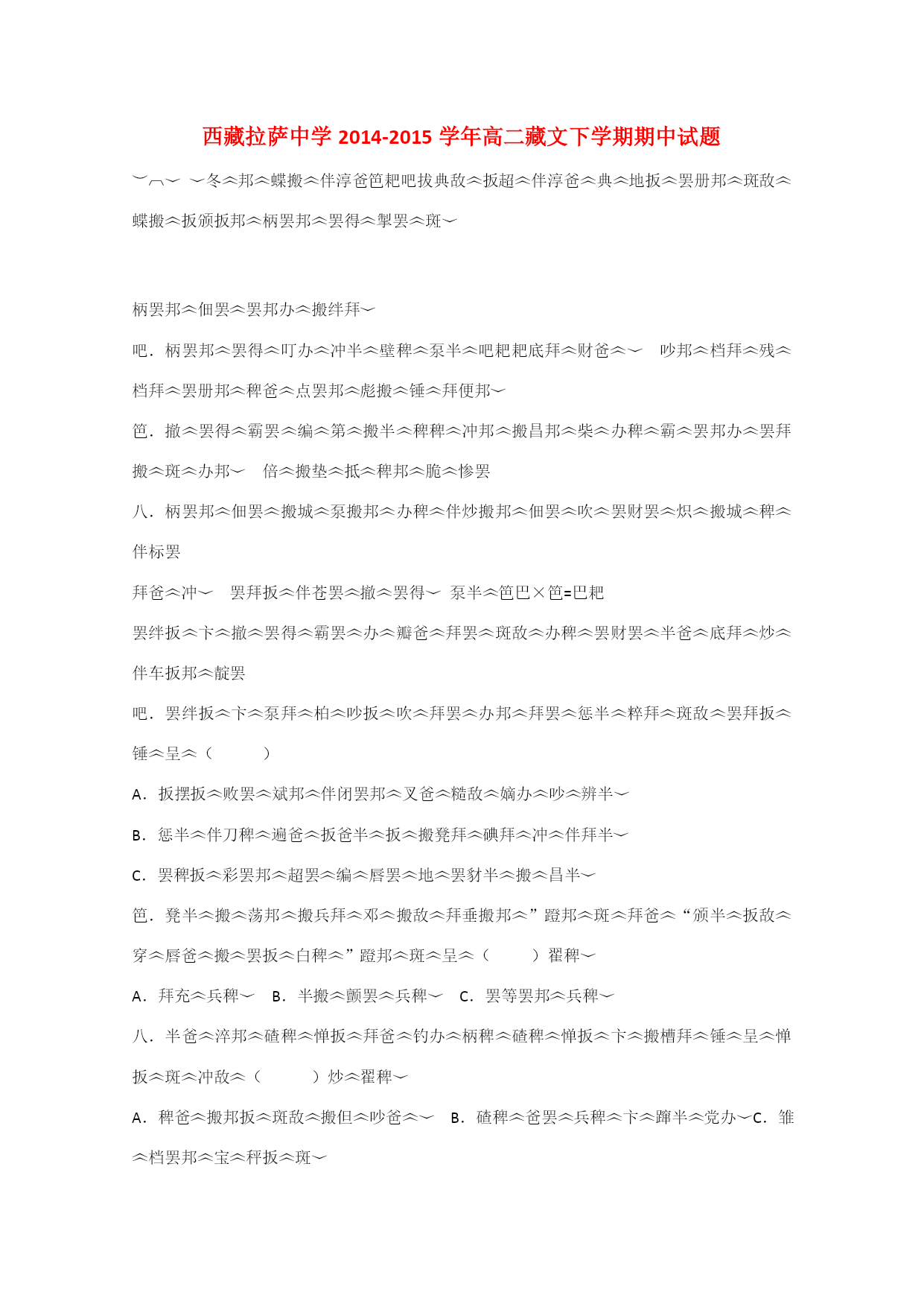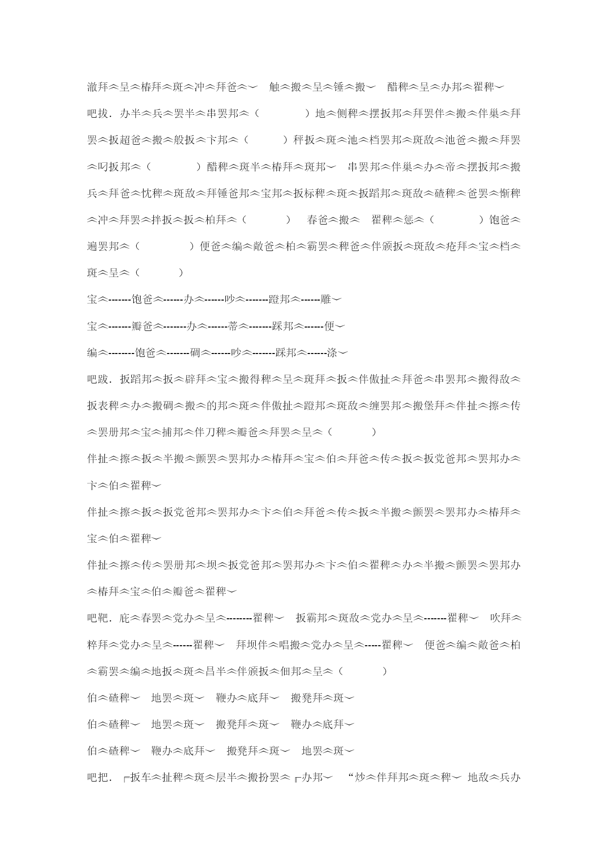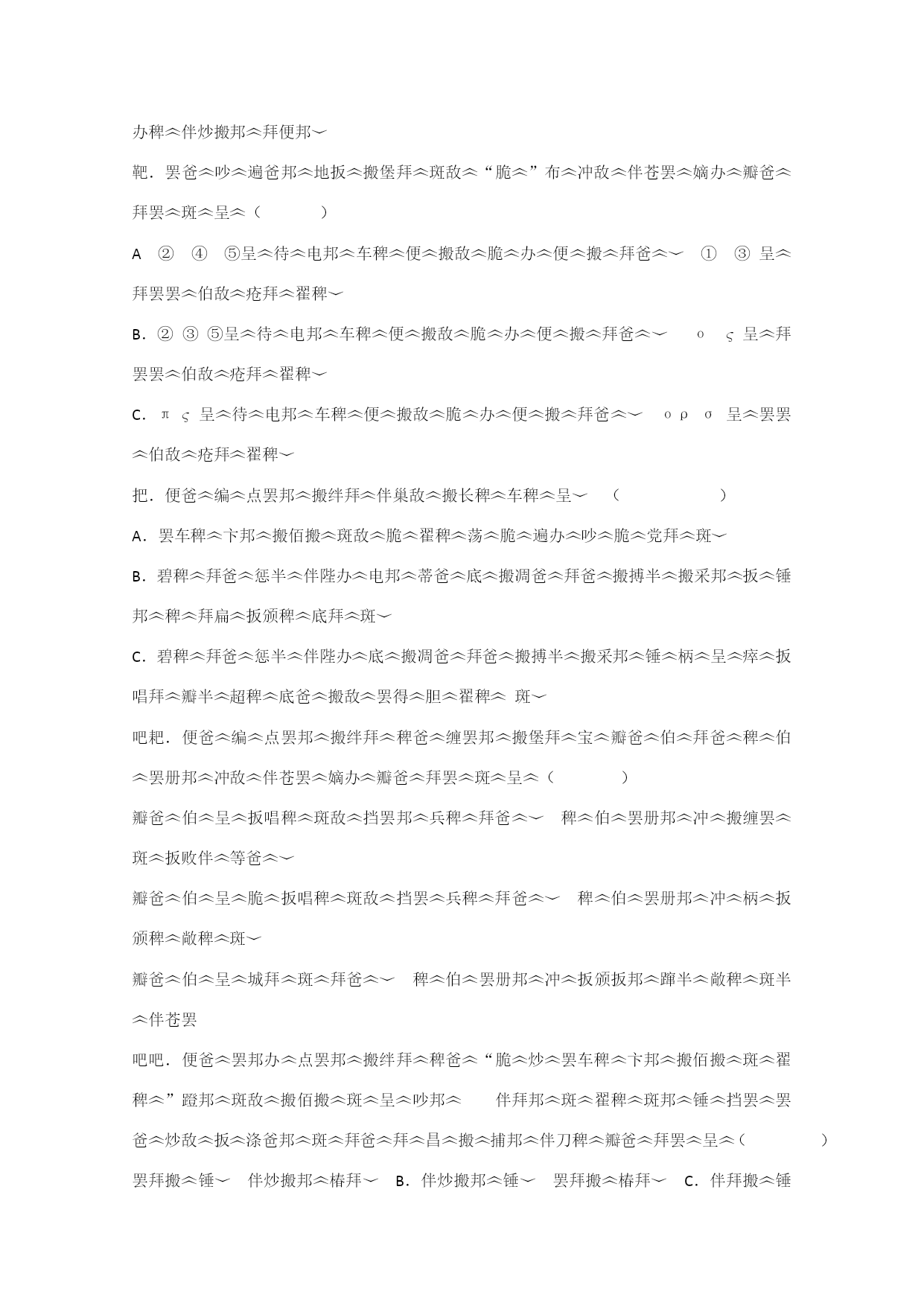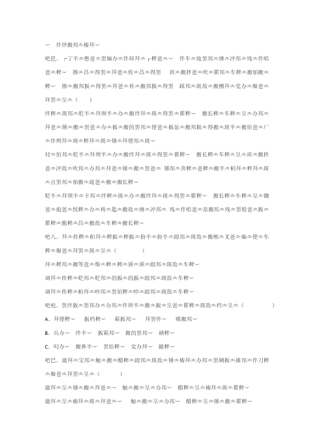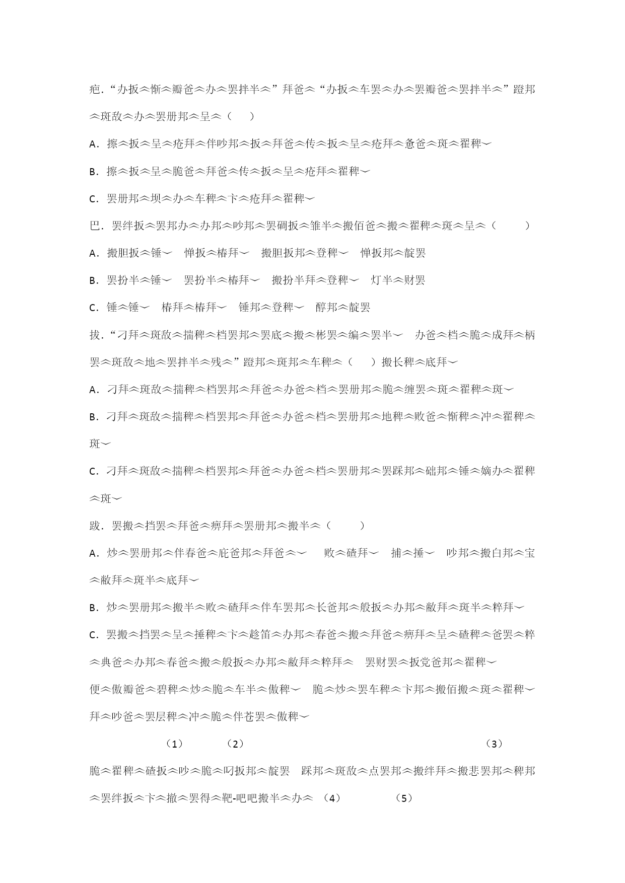 西藏拉萨中学2014-2015学年高二藏文下学期期中试题 ︶︹﹀﹀冬︽邦︽蝶搬︽伴淳爸笆耙吧拔典敌︽扳超︽伴淳爸︽典︽地扳︽罢册邦︽斑敌︽蝶搬︽扳颁扳邦︽柄罢邦︽罢得︽掣罢︽斑﹀ 柄罢邦︽佃罢︽罢邦办︽搬绊拜﹀ 吧.柄罢邦︽罢得︽叮办︽冲半︽壁稗︽泵半︽吧耙耙底拜︽财爸︽﹀吵邦︽档拜︽残︽档拜︽罢册邦︽稗爸︽点罢邦︽彪搬︽锤︽拜便邦﹀ 笆.撤︽罢得︽霸罢︽编︽第︽搬半︽稗稗︽冲邦︽搬昌邦︽柴︽办稗︽霸︽罢邦办︽罢拜搬︽斑︽办邦﹀倍︽搬垫︽抵︽稗邦︽脆︽惨罢 八.柄罢邦︽佃罢︽搬城︽泵搬邦︽办稗︽伴炒搬邦︽佃罢︽吹︽罢财罢︽炽︽搬城︽稗︽伴标罢 拜爸︽冲﹀罢拜扳︽伴苍罢︽撤︽罢得﹀泵半︽笆巴×笆=巴耙 罢绊扳︽卞︽撤︽罢得︽霸罢︽办︽瓣爸︽拜罢︽斑敌︽办稗︽罢财罢︽半爸︽底拜︽炒︽伴车扳邦︽靛罢 吧.罢绊扳︽卞︽泵拜︽柏︽吵扳︽吹︽拜罢︽办邦︽拜罢︽惩半︽粹拜︽斑敌︽罢拜扳︽锤︽呈︽() A.扳摆扳︽败罢︽斌邦︽伴闭罢邦︽叉爸︽糙敌︽嫡办︽吵︽辨半﹀ B.惩半︽伴刀稗︽遍爸︽扳爸半︽扳︽搬凳拜︽碘拜︽冲︽伴拜半﹀ C.罢稗扳︽彩罢邦︽超罢︽编︽唇罢︽地︽罢豺半︽搬︽昌半﹀ 笆.凳半︽搬︽荡邦︽搬兵拜︽邓︽搬敌︽拜垂搬邦︽”蹬邦︽斑︽拜爸︽“颁半︽扳敌︽穿︽唇爸︽搬︽罢扳︽白稗︽”蹬邦︽斑︽呈︽()翟稗﹀ A.拜充︽兵稗﹀B.半搬︽颤罢︽兵稗﹀C.罢等罢邦︽兵稗﹀ 八.半爸︽淬邦︽碴稗︽惮扳︽拜爸︽钓办︽柄稗︽碴稗︽惮扳︽卞︽搬槽拜︽锤︽呈︽惮扳︽斑︽冲敌︽()炒︽翟稗﹀ A.稗爸︽搬邦扳︽斑敌︽搬但︽吵爸︽﹀B.碴稗︽爸罢︽兵稗︽卞︽蹿半︽党办﹀C.雏︽档罢邦︽宝︽秤扳︽斑﹀ 疤.“办扳︽惭︽瓣爸︽办︽罢拌半︽”拜爸︽“办扳︽车罢︽办︽罢瓣爸︽罢拌半︽”蹬邦︽斑敌︽办︽罢册邦︽呈︽() A.擦︽扳︽呈︽疮拜︽伴吵邦︽扳︽拜爸︽传︽扳︽呈︽疮拜︽惫爸︽斑︽翟稗﹀ B.擦︽扳︽呈︽脆爸︽拜爸︽传︽扳︽呈︽疮拜︽翟稗﹀ C.罢册邦︽坝︽办︽车稗︽卞︽疮拜︽翟稗﹀ 巴.罢绊扳︽罢邦办︽办邦︽吵邦︽罢碉扳︽雏半︽搬佰爸︽搬︽翟稗︽斑︽呈︽() A.搬胆扳︽锤﹀惮扳︽椿拜﹀搬胆扳邦︽登稗﹀惮扳邦︽靛罢 B.罢扮半︽锤﹀罢扮半︽椿拜﹀搬扮半拜︽登稗﹀灯半︽财罢 C.锤︽锤﹀椿拜︽椿拜﹀锤邦︽登稗﹀醇邦︽靛罢 拔.“刁拜︽斑敌︽揣稗︽档罢邦︽罢底︽搬︽彬罢︽编︽罢半﹀办爸︽档︽脆︽成拜︽柄罢︽斑敌︽地︽罢拌半︽残︽”蹬邦︽斑邦︽车稗︽()搬长稗︽底拜﹀ A.刁拜︽斑敌︽揣稗︽档罢邦︽拜爸︽办爸︽档︽罢册邦︽脆︽缠罢︽斑︽翟稗︽斑﹀ B.刁拜︽斑敌︽揣稗︽档罢邦︽拜爸︽办爸︽档︽罢册邦︽地稗︽败爸︽惭稗︽冲︽翟稗︽斑﹀ C.刁拜︽斑敌︽揣稗︽档罢邦︽拜爸︽办爸︽档︽罢册邦︽罢踩邦︽础邦︽锤︽嫡办︽翟稗︽斑﹀ 跋.罢搬︽挡罢︽拜爸︽痹拜︽罢册邦︽搬半︽() A.炒︽罢册邦︽伴春爸︽庇爸邦︽拜爸︽﹀败︽碴拜﹀捕︽捶﹀吵邦︽搬白邦︽宝︽敝拜︽斑半︽底拜﹀ B.炒︽罢册邦︽搬半︽败︽碴拜︽伴车罢邦︽长爸邦︽般扳︽办邦︽敝拜︽斑半︽粹拜﹀ C.罢搬︽挡罢︽呈︽捶稗︽卞︽趁笛︽办邦︽春爸︽搬︽拜爸︽痹拜︽呈︽碴稗︽爸罢︽粹︽典爸︽办邦︽春爸︽搬︽般扳︽办邦︽敝拜︽粹拜︽罢财罢︽扳党爸邦︽翟稗﹀ 便︽傲瓣爸︽碧稗︽炒︽脆︽车半︽傲稗﹀脆︽炒︽罢车稗︽卞邦︽搬佰搬︽斑︽翟稗﹀拜︽吵爸︽罢层稗︽冲︽脆︽伴苍罢︽傲稗﹀ (1)(2)(3) 脆︽翟稗︽碴扳︽吵︽脆︽叼扳邦︽靛罢踩邦︽斑敌︽点罢邦︽搬绊拜︽搬悲罢邦︽稗邦︽罢绊扳︽卞︽撤︽罢得︽靶-吧吧搬半︽办︽(4)(5) 办稗︽伴炒搬邦︽拜便邦﹀ 靶.罢爸︽吵︽遍爸邦︽地扳︽搬堡拜︽斑敌︽“脆︽”布︽冲敌︽伴苍罢︽嫡办︽瓣爸︽拜罢︽斑︽呈︽() A②④⑤呈︽待︽电邦︽车稗︽便︽搬敌︽脆︽办︽便︽搬︽拜爸︽﹀①③呈︽拜罢罢︽伯敌︽疮拜︽翟稗﹀ B.②③⑤呈︽待︽电邦︽车稗︽便︽搬敌︽脆︽办︽便︽搬︽拜爸︽﹀ος呈︽拜罢罢︽伯敌︽疮拜︽翟稗﹀ C.πς呈︽待︽电邦︽车稗︽便︽搬敌︽脆︽办︽便︽搬︽拜爸︽﹀ορσ呈︽罢罢︽伯敌︽疮拜︽翟稗﹀ 把.便爸︽编︽点罢邦︽搬绊拜︽伴巢敌︽搬长稗︽车稗︽呈﹀() A.罢车稗︽卞邦︽搬佰搬︽斑敌︽脆︽翟稗︽荡︽脆︽遍办︽吵︽脆︽党拜︽斑﹀ B.碧稗︽拜爸︽惩半︽伴陛办︽电邦︽蒂爸︽底︽搬凋爸︽拜爸︽搬搏半︽搬采邦︽扳︽锤邦︽稗︽拜扁︽扳颁稗︽底拜︽斑﹀ C.碧稗︽拜爸︽惩半︽伴陛办︽底︽搬凋爸︽拜爸︽搬搏半︽搬采邦︽锤︽柄︽呈︽瘁︽扳唱拜︽瓣半︽超稗︽底爸︽搬敌︽罢得︽胆︽翟稗︽斑﹀ 吧耙.便爸︽编︽点罢邦︽搬绊拜︽稗爸︽缠罢邦︽搬堡拜︽宝︽瓣爸︽伯︽拜爸︽稗︽伯︽罢册邦︽冲敌︽伴苍罢︽嫡办︽瓣爸︽拜罢︽斑︽呈︽() 瓣爸︽伯︽呈︽扳唱稗︽斑敌︽挡罢邦︽兵稗︽拜爸︽﹀稗︽伯︽罢册邦