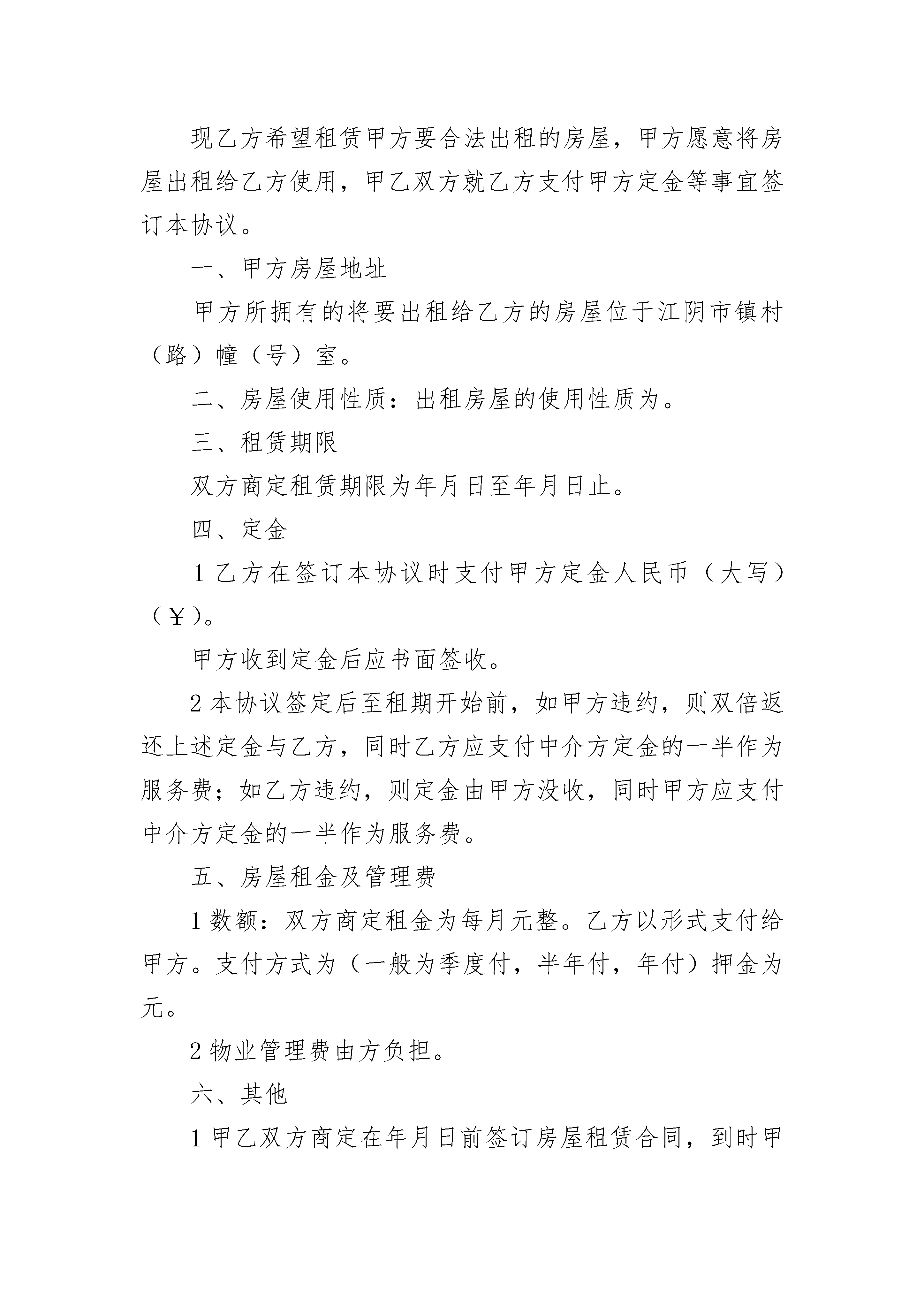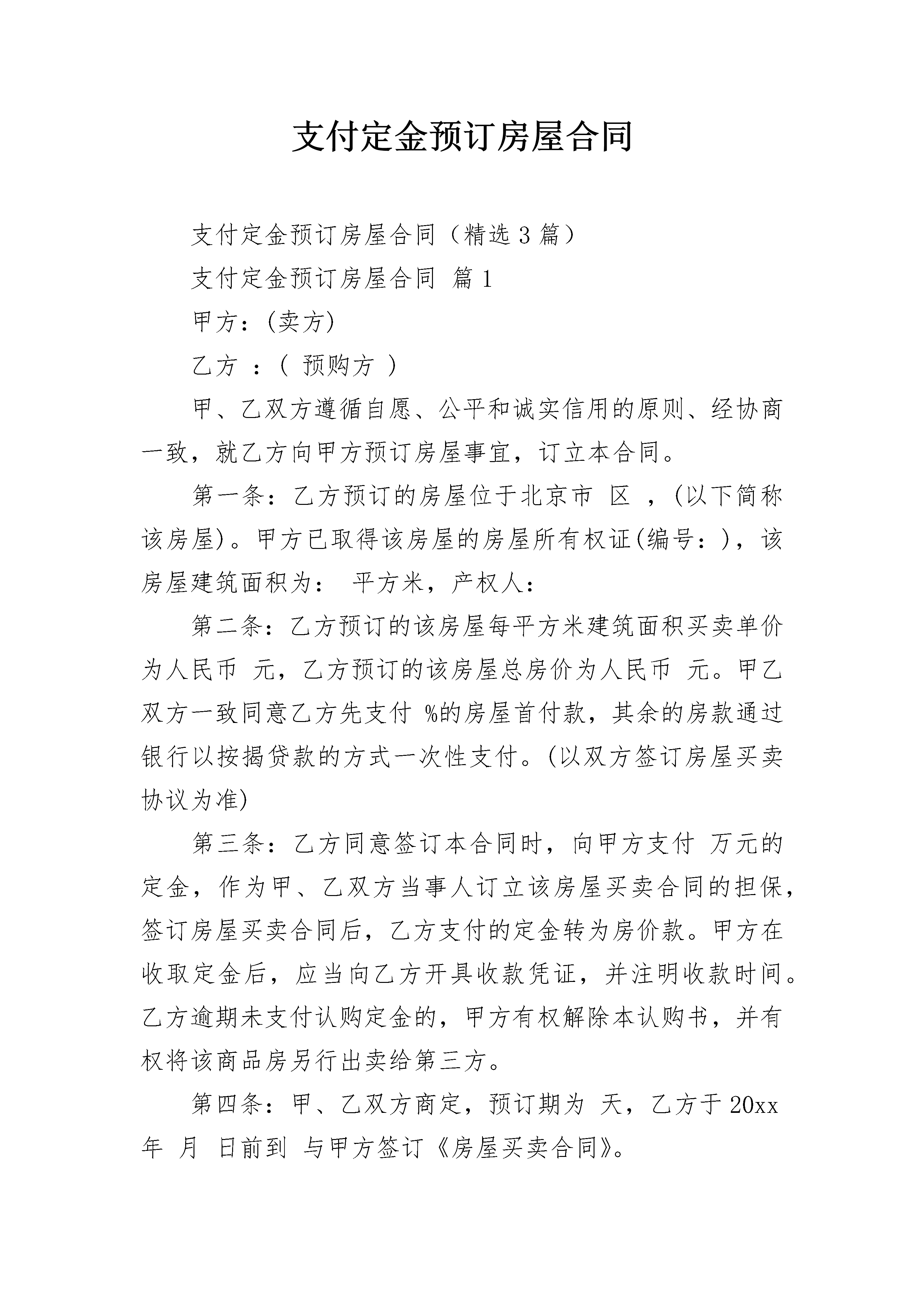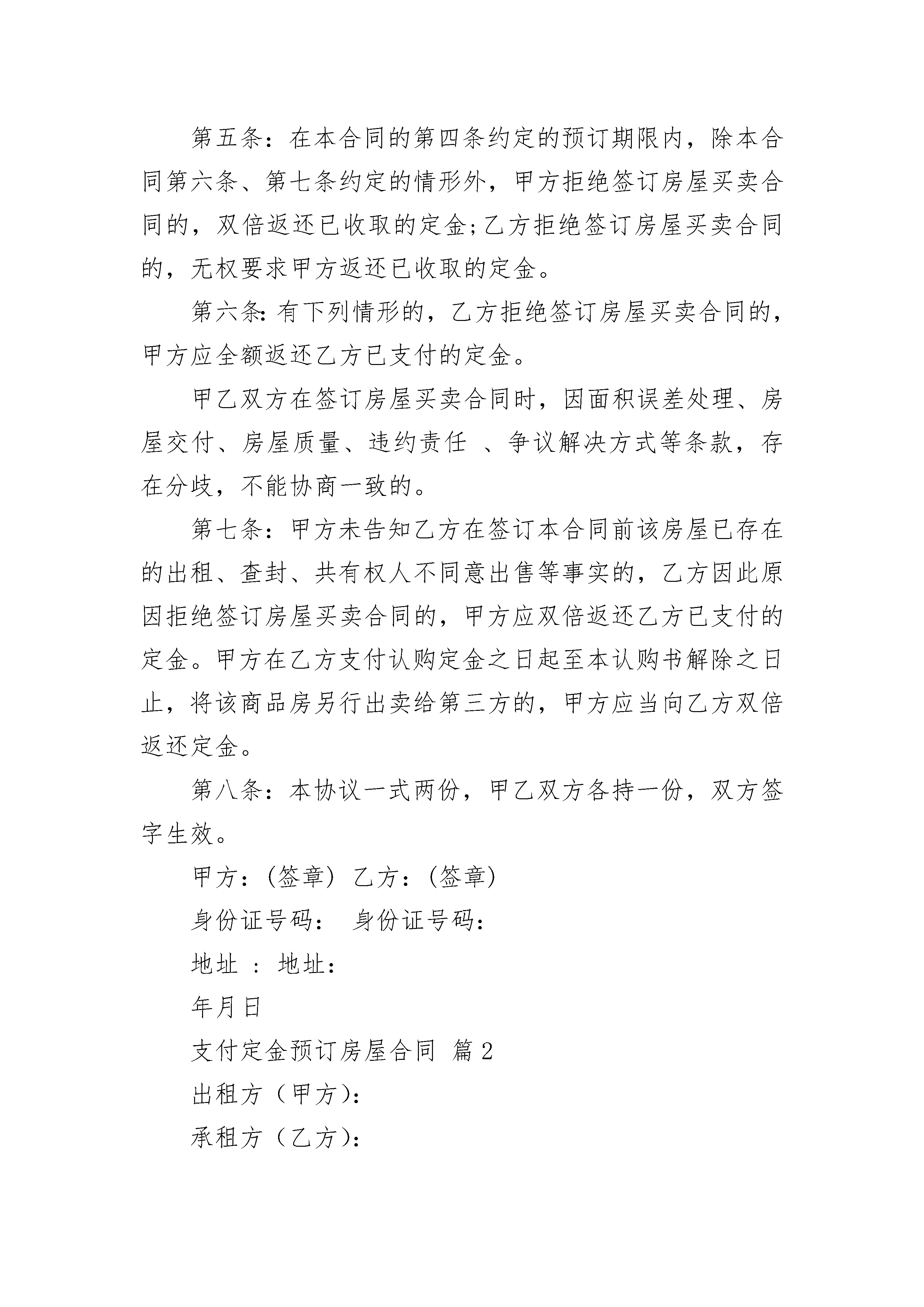 支付定金预订房屋合同支付定金预订房屋合同(精选3篇)支付定金预订房屋合同篇1甲方:(卖方)乙方:(预购方)甲、乙双方遵循自愿、公平和诚实信用的原则、经协商一致,就乙方向甲方预订房屋事宜,订立本合同。第一条:乙方预订的房屋位于北京市区,(以下简称该房屋)。甲方已取得该房屋的房屋所有权证(编号:),该房屋建筑面积为:平方米,产权人:第二条:乙方预订的该房屋每平方米建筑面积买卖单价为人民币元,乙方预订的该房屋总房价为人民币元。甲乙双方一致同意乙方先支付%的房屋首付款,其余的房款通过银行以按揭贷款的方式一次性支付。(以双方签订房屋买卖协议为准)第三条:乙方同意签订本合同时,向甲方支付万元的定金,作为甲、乙双方当事人订立该房屋买卖合同的担保,签订房屋买卖合同后,乙方支付的定金转为房价款。甲方在收取定金后,应当向乙方开具收款凭证,并注明收款时间。乙方逾期未支付认购定金的,甲方有权解除本认购书,并有权将该商品房另行出卖给第三方。第四条:甲、乙双方商定,预订期为天,乙方于20xx年月日前到与甲方签订《房屋买卖合同》。第五条:在本合同的第四条约定的预订期限内,除本合同第六条、第七条约定的情形外,甲方拒绝签订房屋买卖合同的,双倍返还已收取的定金;乙方拒绝签订房屋买卖合同的,无权要求甲方返还已收取的定金。第六条:有下列情形的,乙方拒绝签订房屋买卖合同的,甲方应全额返还乙方已支付的定金。甲乙双方在签订房屋买卖合同时,因面积误差处理、房屋交付、房屋质量、违约责任、争议解决方式等条款,存在分歧,不能协商一致的。第七条:甲方未告知乙方在签订本合同前该房屋已存在的出租、查封、共有权人不同意出售等事实的,乙方因此原因拒绝签订房屋买卖合同的,甲方应双倍返还乙方已支付的定金。甲方在乙方支付认购定金之日起至本认购书解除之日止,将该商品房另行出卖给第三方的,甲方应当向乙方双倍返还定金。第八条:本协议一式两份,甲乙双方各持一份,双方签字生效。甲方:(签章)乙方:(签章)身份证号码:身份证号码:地址:地址:年月日支付定金预订房屋合同篇2出租方(甲方):承租方(乙方):现乙方希望租赁甲方要合法出租的房屋,甲方愿意将房屋出租给乙方使用,甲乙双方就乙方支付甲方定金等事宜签订本协议。一、甲方房屋地址甲方所拥有的将要出租给乙方的房屋位于江阴市镇村(路)幢(号)室。二、房屋使用性质:出租房屋的使用性质为。三、租赁期限双方商定租赁期限为年月日至年月日止。四、定金1乙方在签订本协议时支付甲方定金人民币(大写)(¥)。甲方收到定金后应书面签收。2本协议签定后至租期开始前,如甲方违约,则双倍返还上述定金与乙方,同时乙方应支付中介方定金的一半作为服务费;如乙方违约,则定金由甲方没收,同时甲方应支付中介方定金的一半作为服务费。五、房屋租金及管理费1数额:双方商定租金为每月元整。乙方以形式支付给甲方。支付方式为(一般为季度付,半年付,年付)押金为元。2物业管理费由方负担。六、其他1甲乙双方商定在年月日前签订房屋租赁合同,到时甲方应带好房屋产权权利人的有效证件、房地产权证(若是代理人签约,应还带好代理人有效证件和产权权利人的委托书),乙方应带好本人有效证件(公司签约应带好公司有效证件)。甲乙双方任何一方不如期签约可视为违约。2甲乙双方商定好的租房附属设施:甲方:乙方:中介方:代理人:代理人:业务员:时间:时间:时间:支付定金预订房屋合同篇3工程编号:_________________合同编号:_________________发包人:_________________设计人:_________________________年________月________日发包人:_________________(以下简称甲方)地址:_________________邮码:_________________电话:_________________传真:_________________设计人:_________________(以下简称乙方)地址:_________________邮码:_________________电话:_________________传真:_________________根据《中华人民共和国民法典》以及国家和市政府的有关规定,甲乙双方经友好协商,就甲方委托乙方承担室内装饰设计的有关事宜达成一致,签订本协议书,并共同遵守。第一条合同签订依据:1.1《中华人民共和国民法典》、《中华人民共和国建筑法》和《建设工程勘察设计管理条例》。1.2国家及市有关建设工程勘察设计管理的其他法规和规范性文件。1.3国家及市有关建设工程装饰装修设计管理的其他法规和规范性文件。1.4城市规划管理部门有关批准文件。1.5其它有关建设工程的批准文件。1.6工程项目设计时有新的设计标准和规范的,适用最新的设计