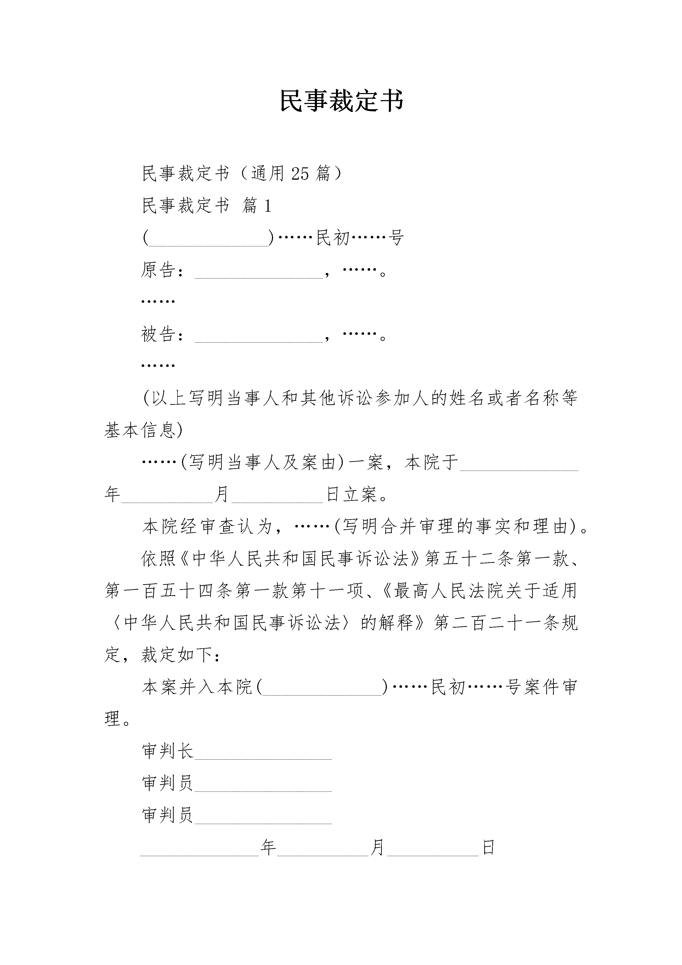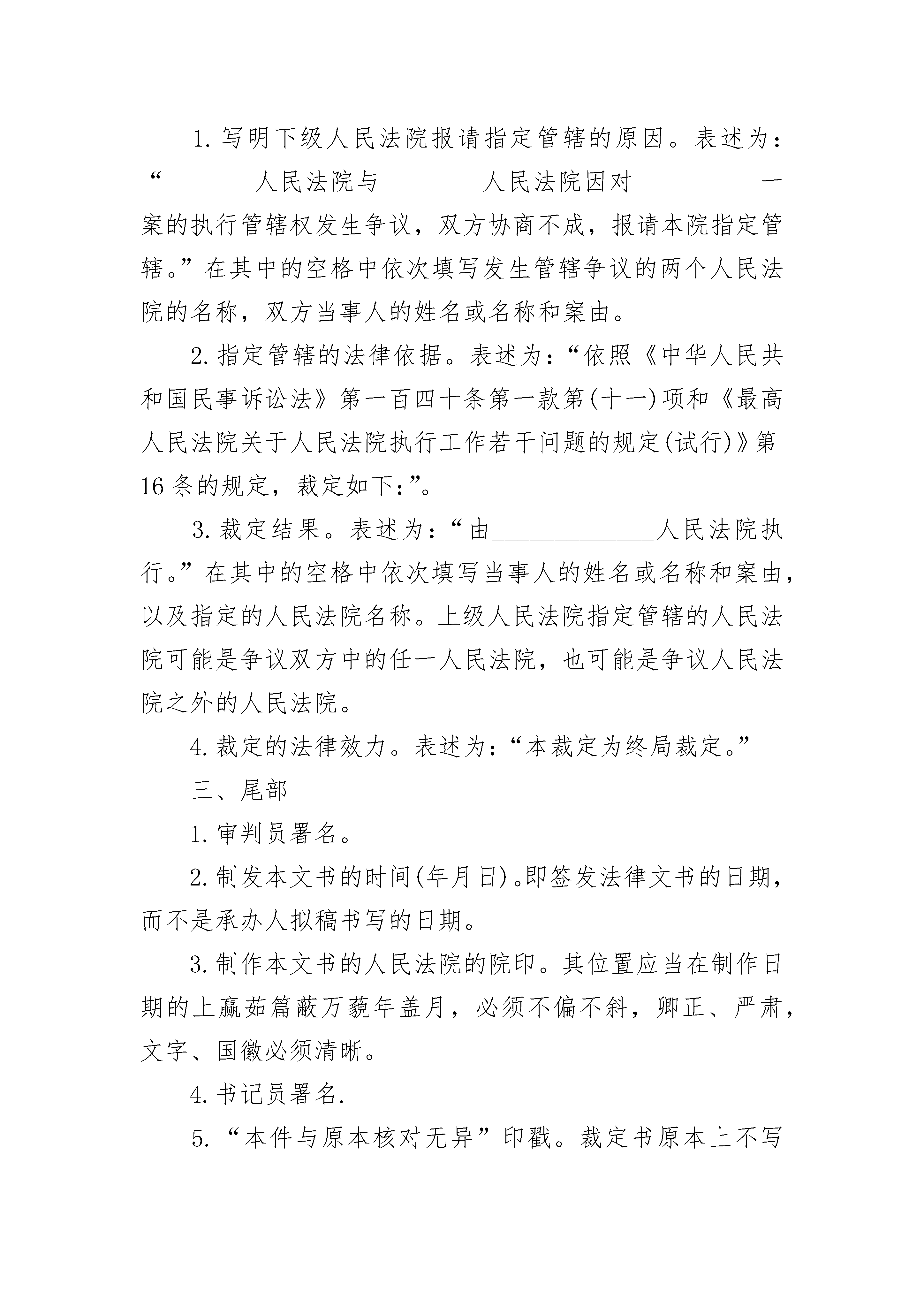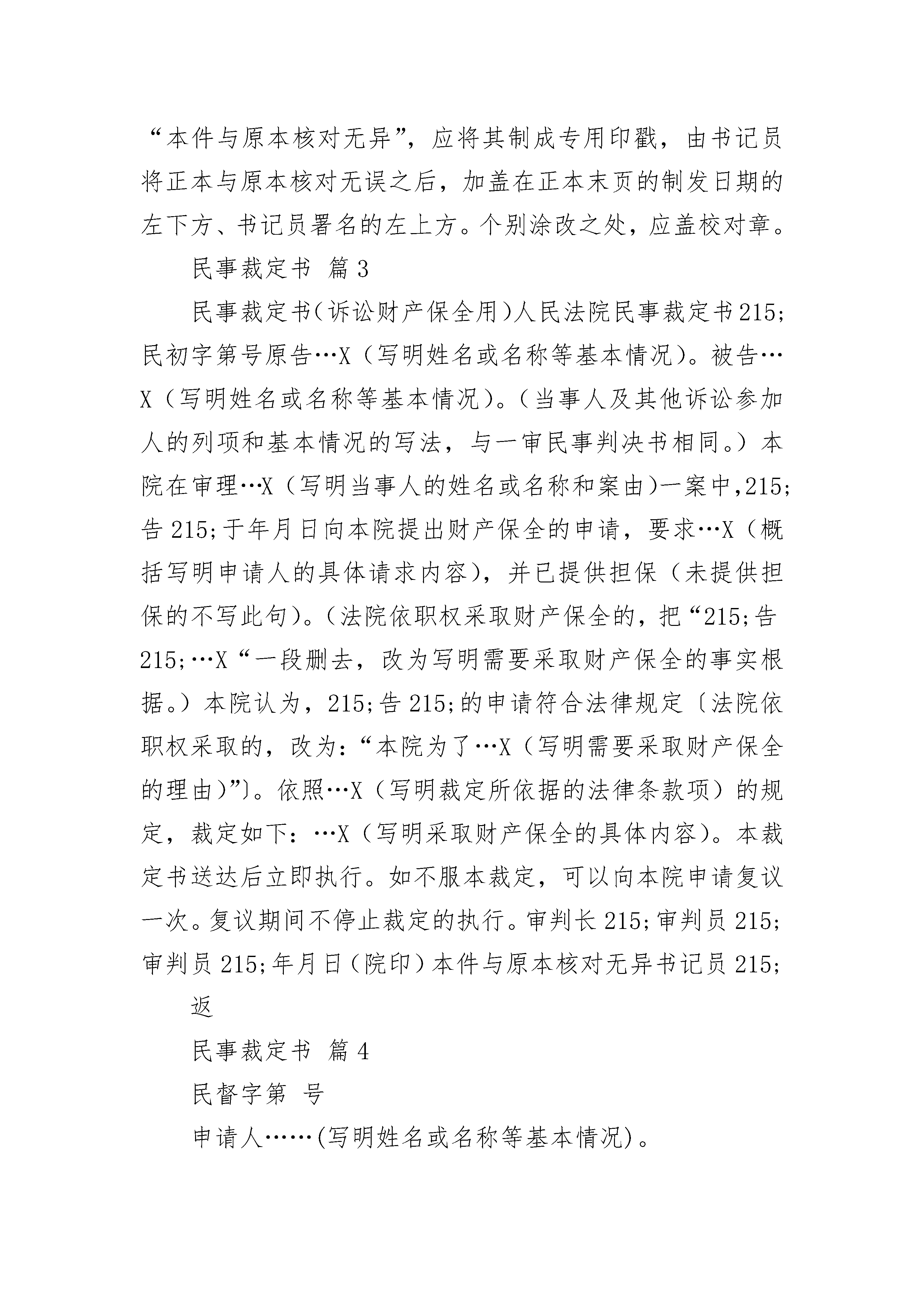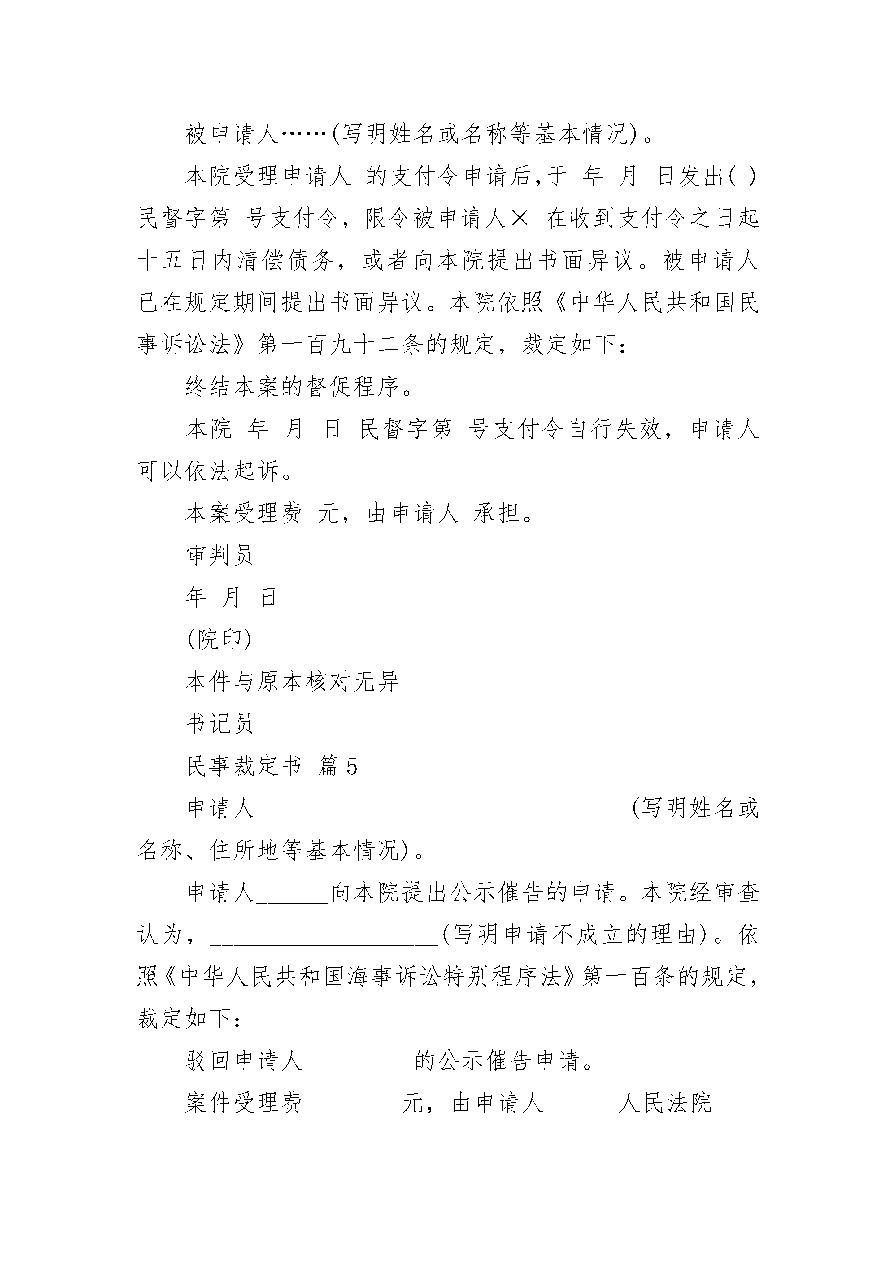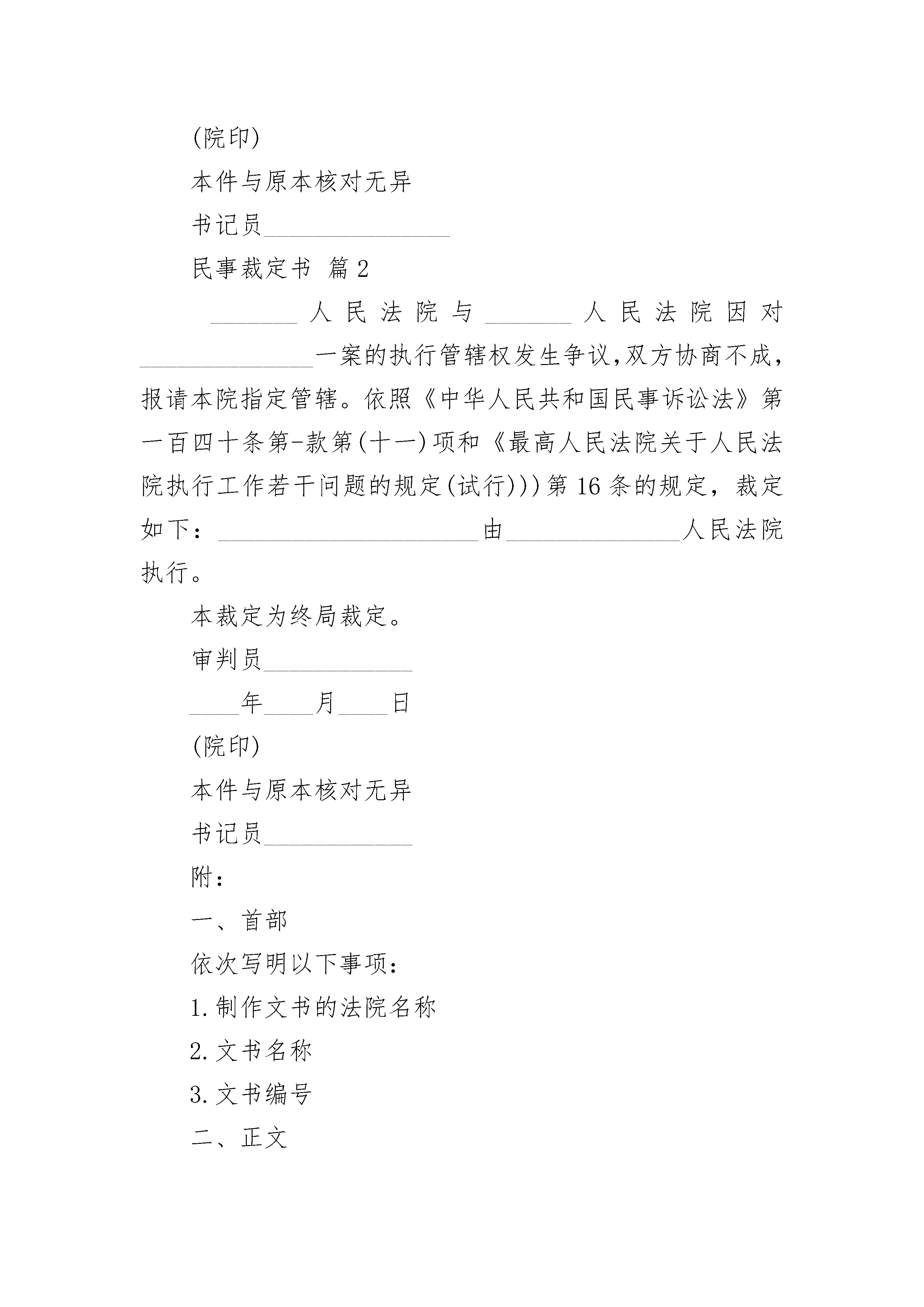 民事裁定书民事裁定书(通用25篇)民事裁定书篇1(_____________)……民初……号原告:______________,……。……被告:______________,……。……(以上写明当事人和其他诉讼参加人的姓名或者名称等基本信息)……(写明当事人及案由)一案,本院于_____________年__________月__________日立案。本院经审查认为,……(写明合并审理的事实和理由)。依照《中华人民共和国民事诉讼法》第五十二条第一款、第一百五十四条第一款第十一项、《最高人民法院关于适用〈中华人民共和国民事诉讼法〉的解释》第二百二十一条规定,裁定如下:本案并入本院(_____________)……民初……号案件审理。审判长_______________审判员_______________审判员____________________________年__________月__________日(院印)本件与原本核对无异书记员_______________民事裁定书篇2_______人民法院与_______人民法院因对______________一案的执行管辖权发生争议,双方协商不成,报请本院指定管辖。依照《中华人民共和国民事诉讼法》第一百四十条第-款第(十一)项和《最高人民法院关于人民法院执行工作若干问题的规定(试行)))第16条的规定,裁定如下:_____________________由______________人民法院执行。本裁定为终局裁定。审判员________________年____月____日(院印)本件与原本核对无异书记员____________附:一、首部依次写明以下事项:1.制作文书的法院名称2.文书名称3.文书编号二、正文1.写明下级人民法院报请指定管辖的原因。表述为:“_______人民法院与________人民法院因对__________一案的执行管辖权发生争议,双方协商不成,报请本院指定管辖。”在其中的空格中依次填写发生管辖争议的两个人民法院的名称,双方当事人的姓名或名称和案由。2.指定管辖的法律依据。表述为:“依照《中华人民共和国民事诉讼法》第一百四十条第一款第(十一)项和《最高人民法院关于人民法院执行工作若干问题的规定(试行)》第16条的规定,裁定如下:”。3.裁定结果。表述为:“由_____________人民法院执行。”在其中的空格中依次填写当事人的姓名或名称和案由,以及指定的人民法院名称。上级人民法院指定管辖的人民法院可能是争议双方中的任一人民法院,也可能是争议人民法院之外的人民法院。4.裁定的法律效力。表述为:“本裁定为终局裁定。”三、尾部1.审判员署名。2.制发本文书的时间(年月日)。即签发法律文书的日期,而不是承办人拟稿书写的日期。3.制作本文书的人民法院的院印。其位置应当在制作日期的上赢茹篇蔽万藐年盖月,必须不偏不斜,卿正、严肃,文字、国徽必须清晰。4.书记员署名.5.“本件与原本核对无异”印戳。裁定书原本上不写“本件与原本核对无异”,应将其制成专用印戳,由书记员将正本与原本核对无误之后,加盖在正本末页的制发日期的左下方、书记员署名的左上方。个别涂改之处,应盖校对章。民事裁定书篇3民事裁定书(诉讼财产保全用)人民法院民事裁定书215;民初字第号原告…X(写明姓名或名称等基本情况)。被告…X(写明姓名或名称等基本情况)。(当事人及其他诉讼参加人的列项和基本情况的写法,与一审民事判决书相同。)本院在审理…X(写明当事人的姓名或名称和案由)一案中,215;告215;于年月日向本院提出财产保全的申请,要求…X(概括写明申请人的具体请求内容),并已提供担保(未提供担保的不写此句)。(法院依职权采取财产保全的,把“215;告215;…X“一段删去,改为写明需要采取财产保全的事实根据。)本院认为,215;告215;的申请符合法律规定〔法院依职权采取的,改为:“本院为了…X(写明需要采取财产保全的理由)”〕。依照…X(写明裁定所依据的法律条款项)的规定,裁定如下:…X(写明采取财产保全的具体内容)。本裁定书送达后立即执行。如不服本裁定,可以向本院申请复议一次。复议期间不停止裁定的执行。审判长215;审判员215;审判员215;年月日(院印)本件与原本核对无异书记员215;返民事裁定书篇4民督字第号申请人……(写明姓名或名称等基本情况)。被申请人……(写明姓名或名称等基本情况)。本院受理申请人的支付令申请后,于年月日发出()民督字第号支付令,限令被申请人×在收到支付令之日起十五日内清偿债务,或者向本院提出书面异议。被申请人已在规定期间提出书面异议。本院依照《中华人民共和国民事诉讼法》第一百九十二条的规定,裁定如下:终结本案的督促程序。本院年月日民督字第号支付令自行失效,申请人可